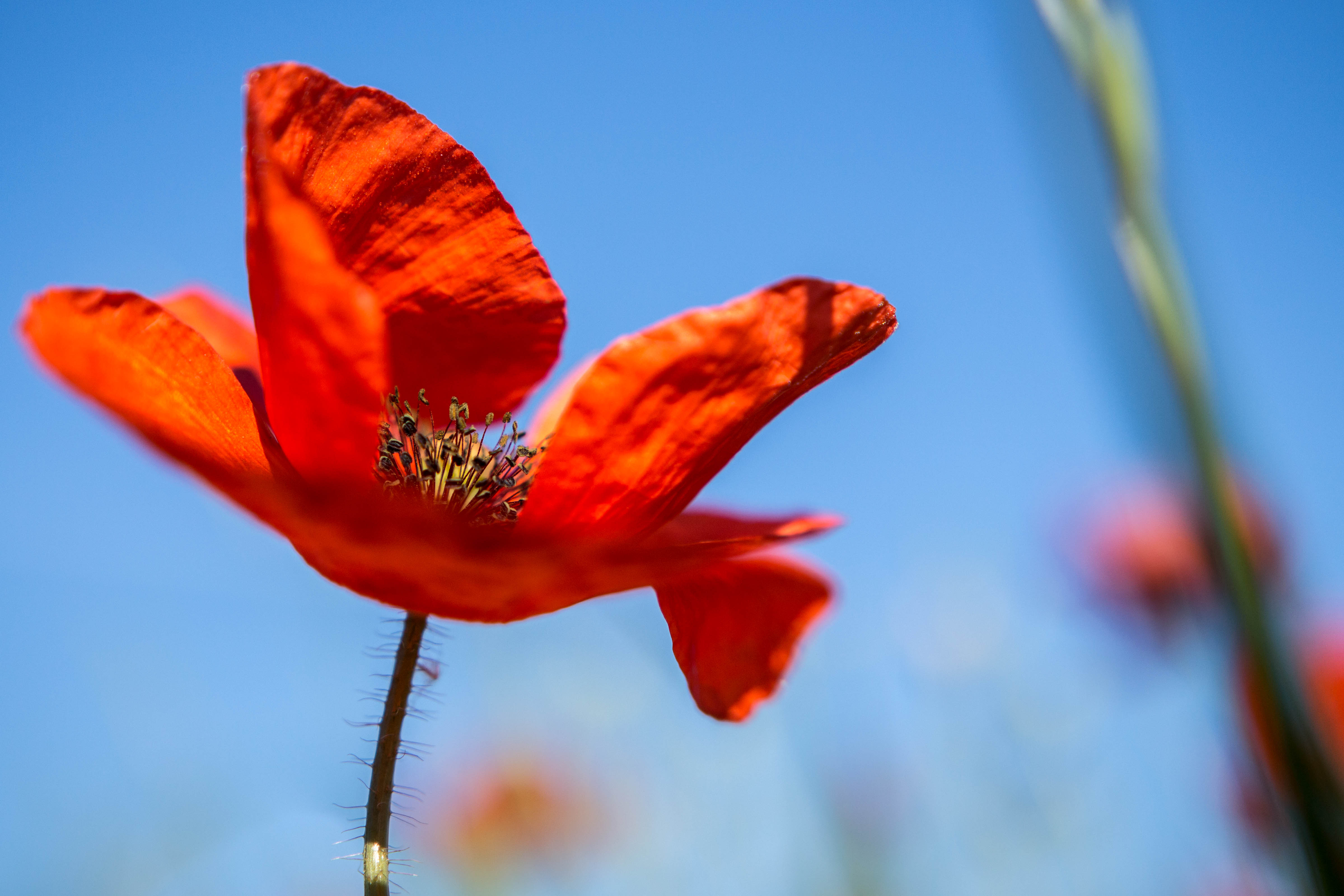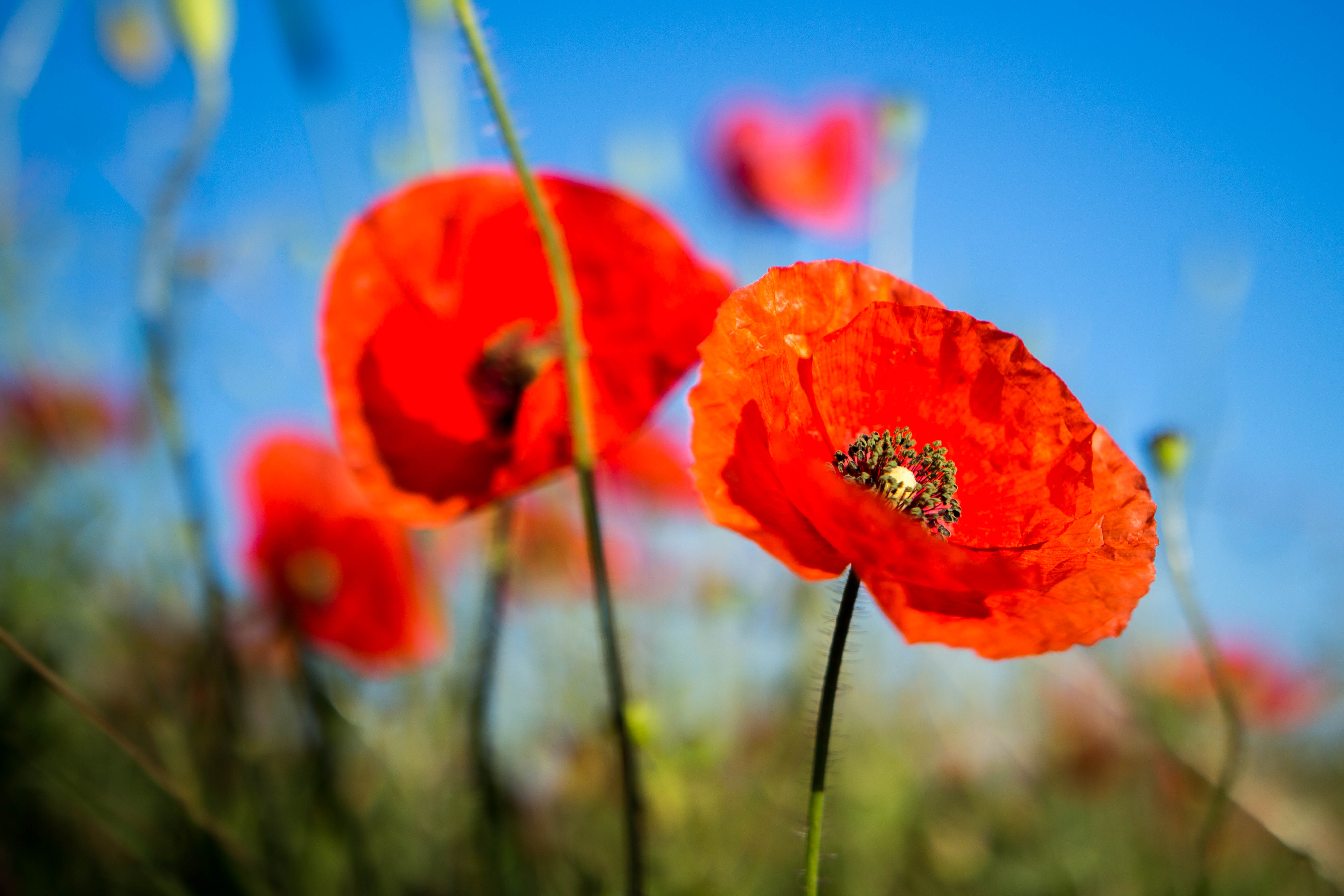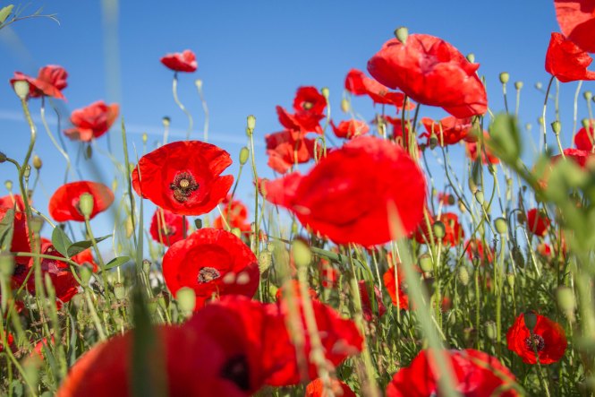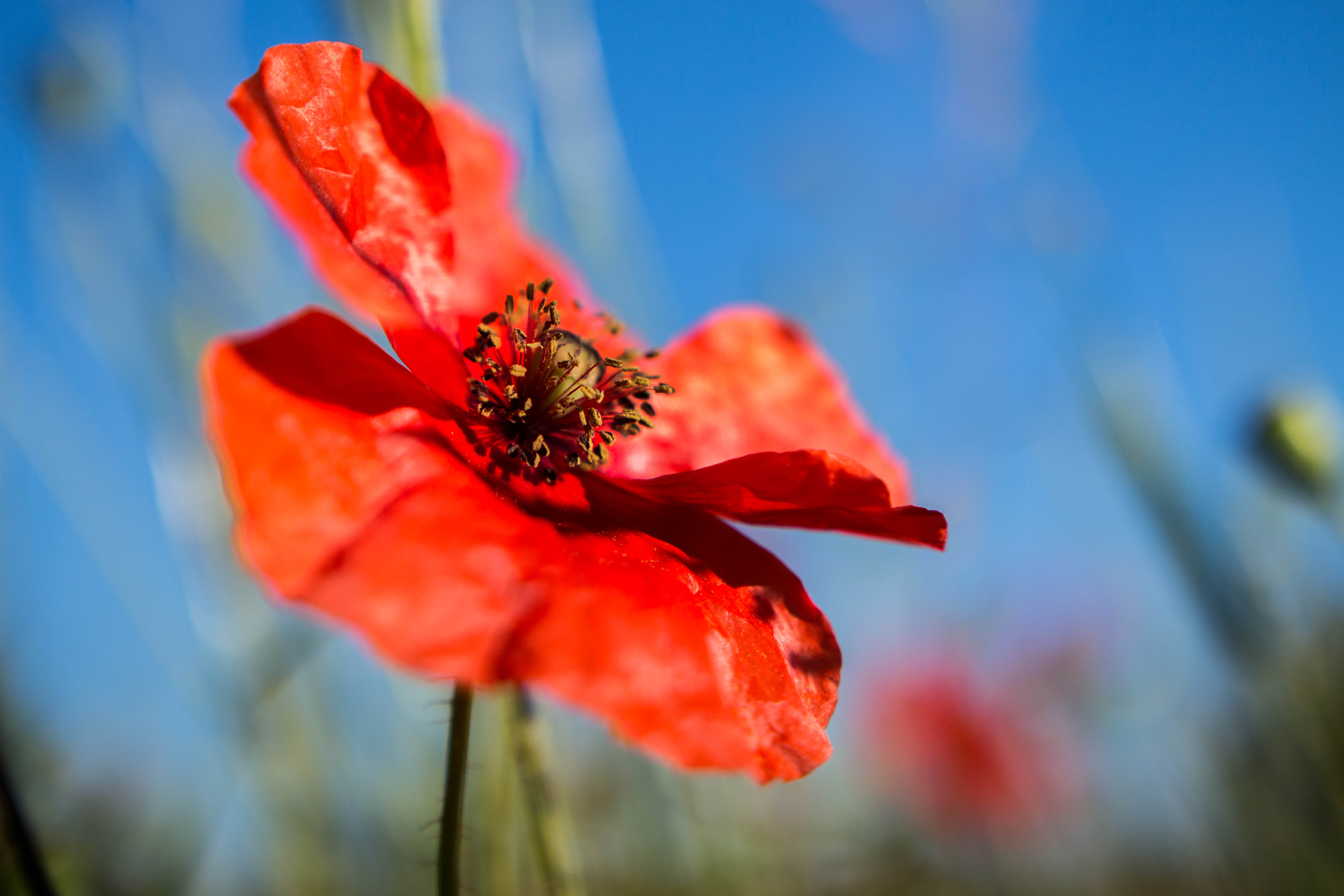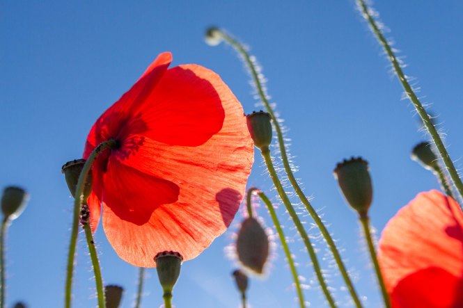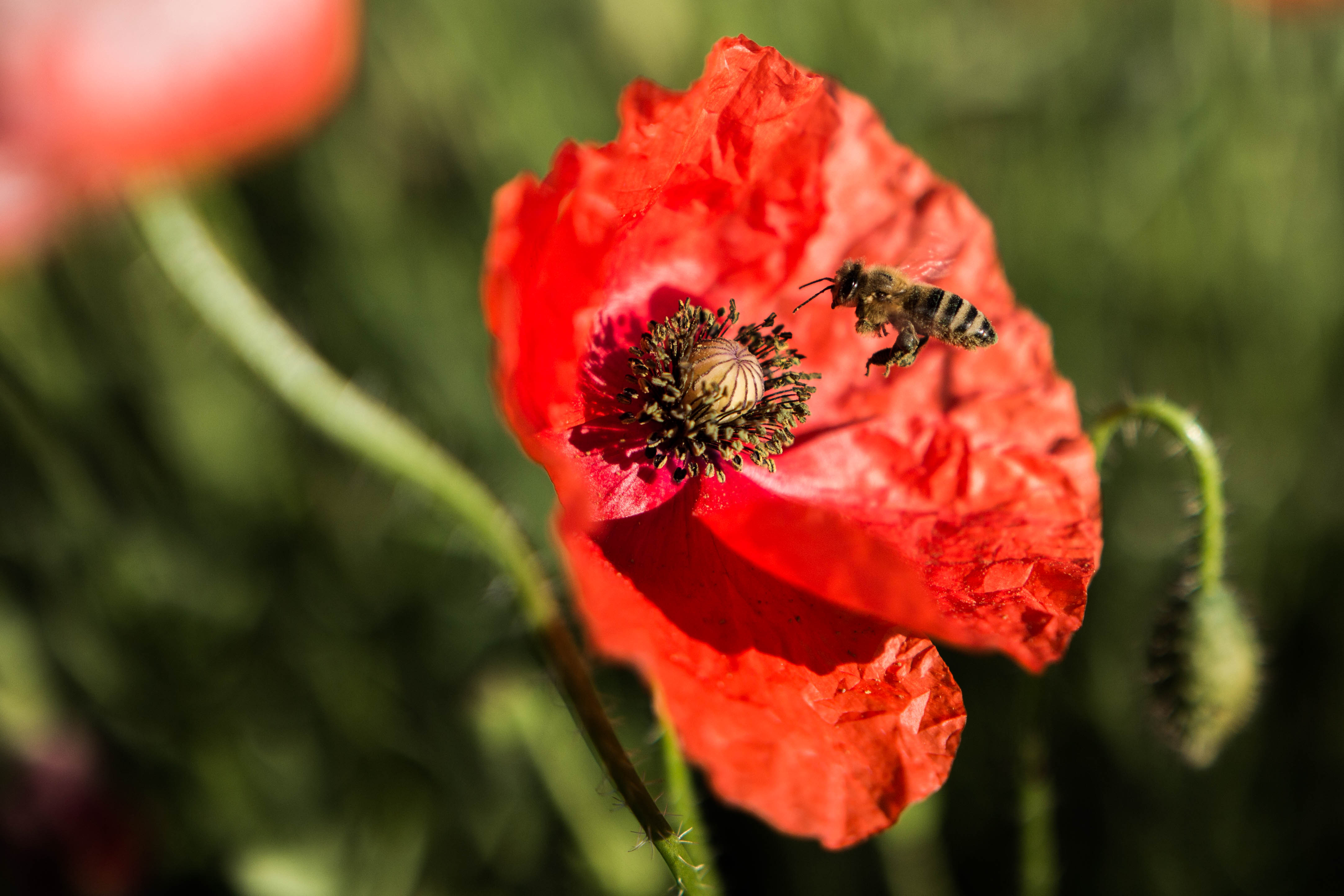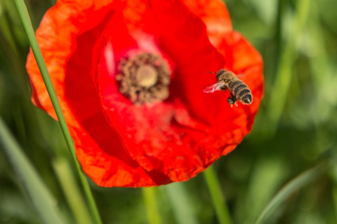 Am frühen Morgen bei der Fahrt zum Bäcker zieht mich ein Mohnfeld magisch an. Diese rot leuchtenden Blumen sind einfach faszinierend. Bienen sind auch schon brummend und fleißig Nektar suchend unterwegs. Der Mensch holt Semmeln, die Biene macht derweilen Honig.