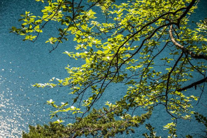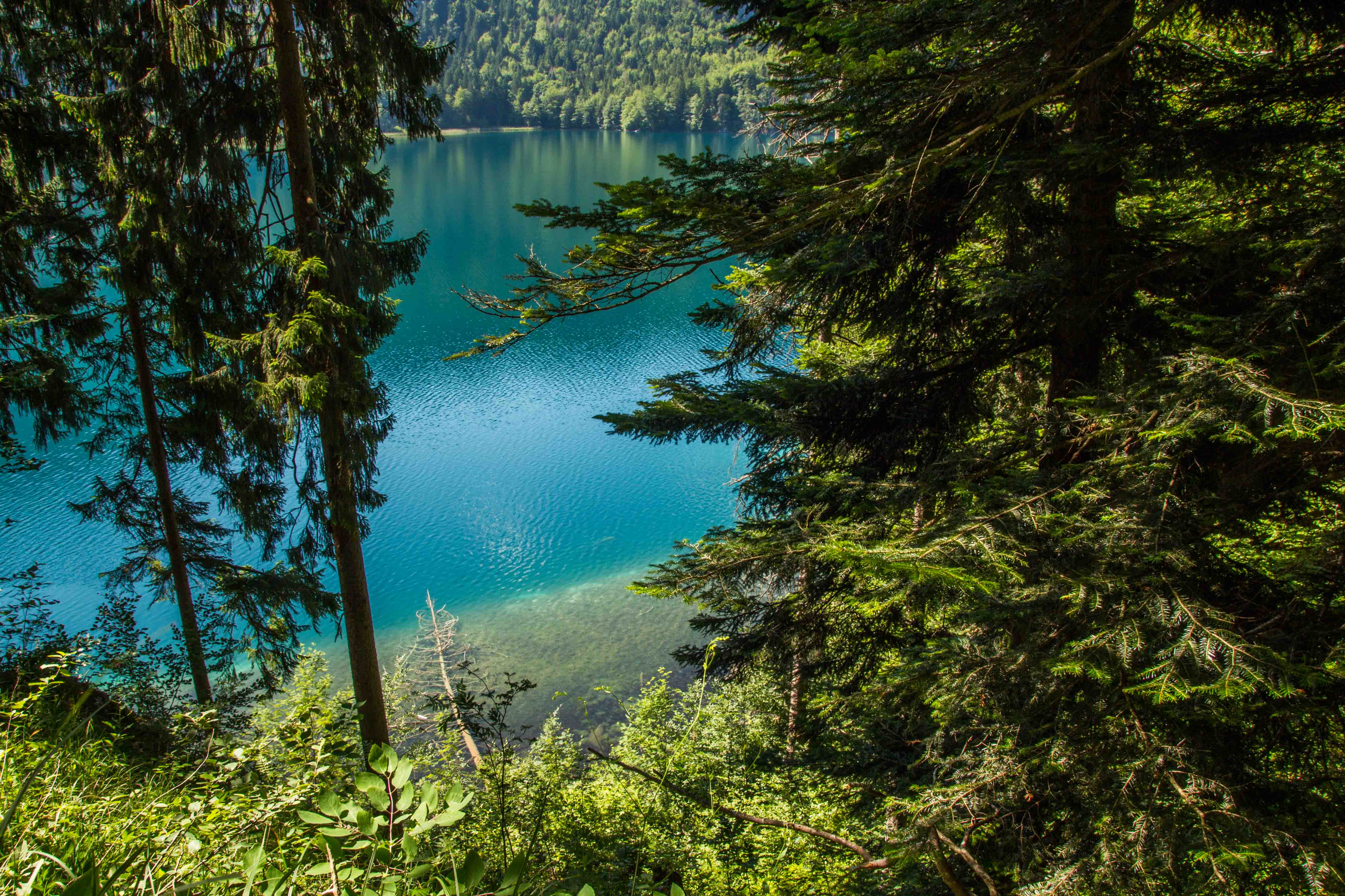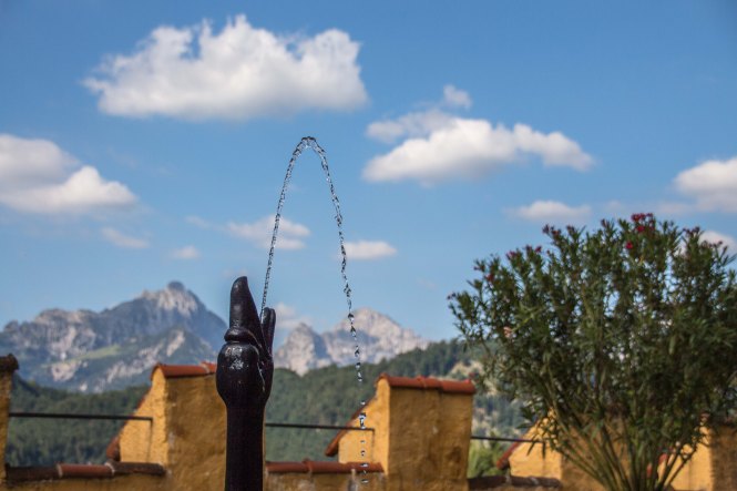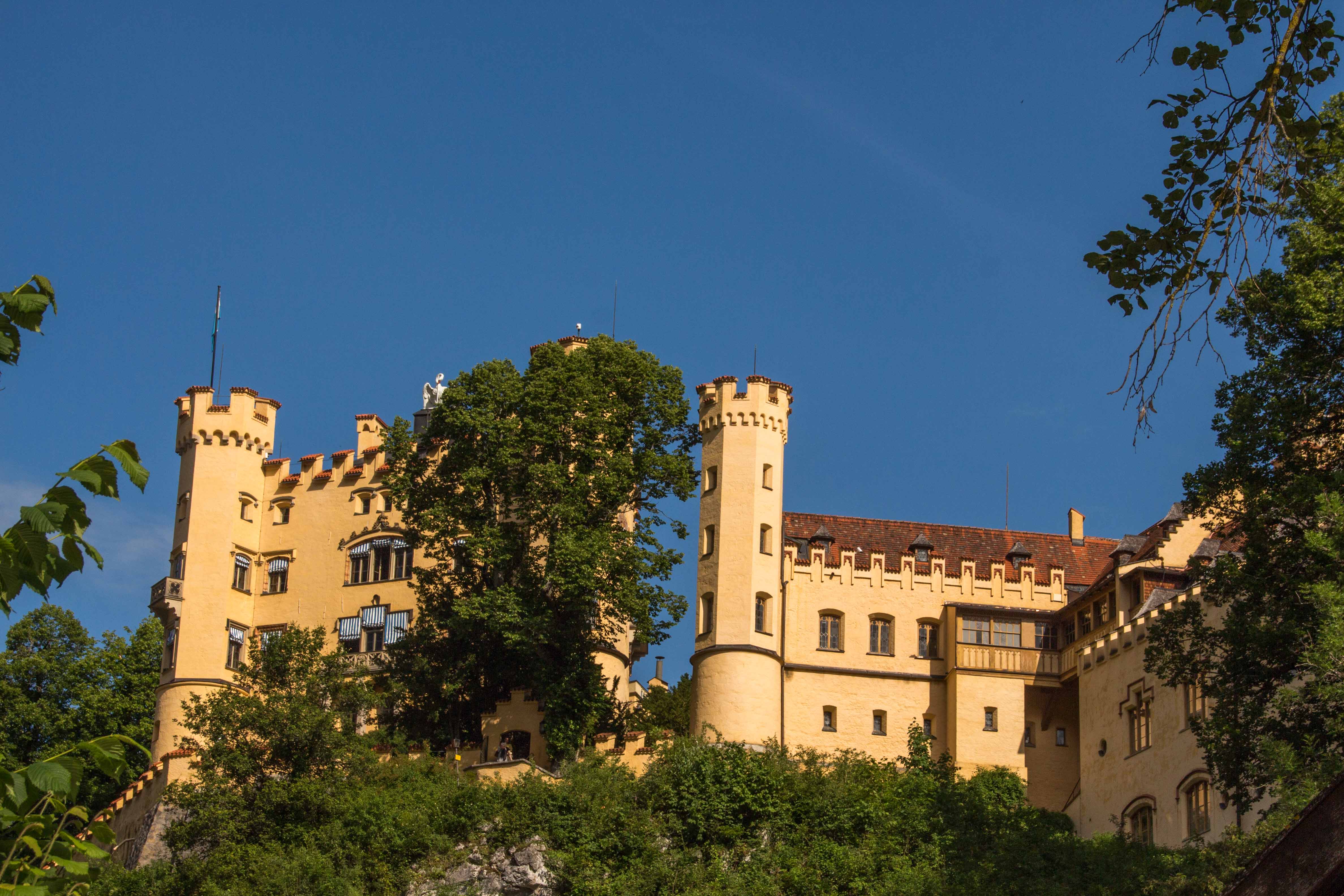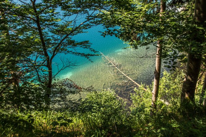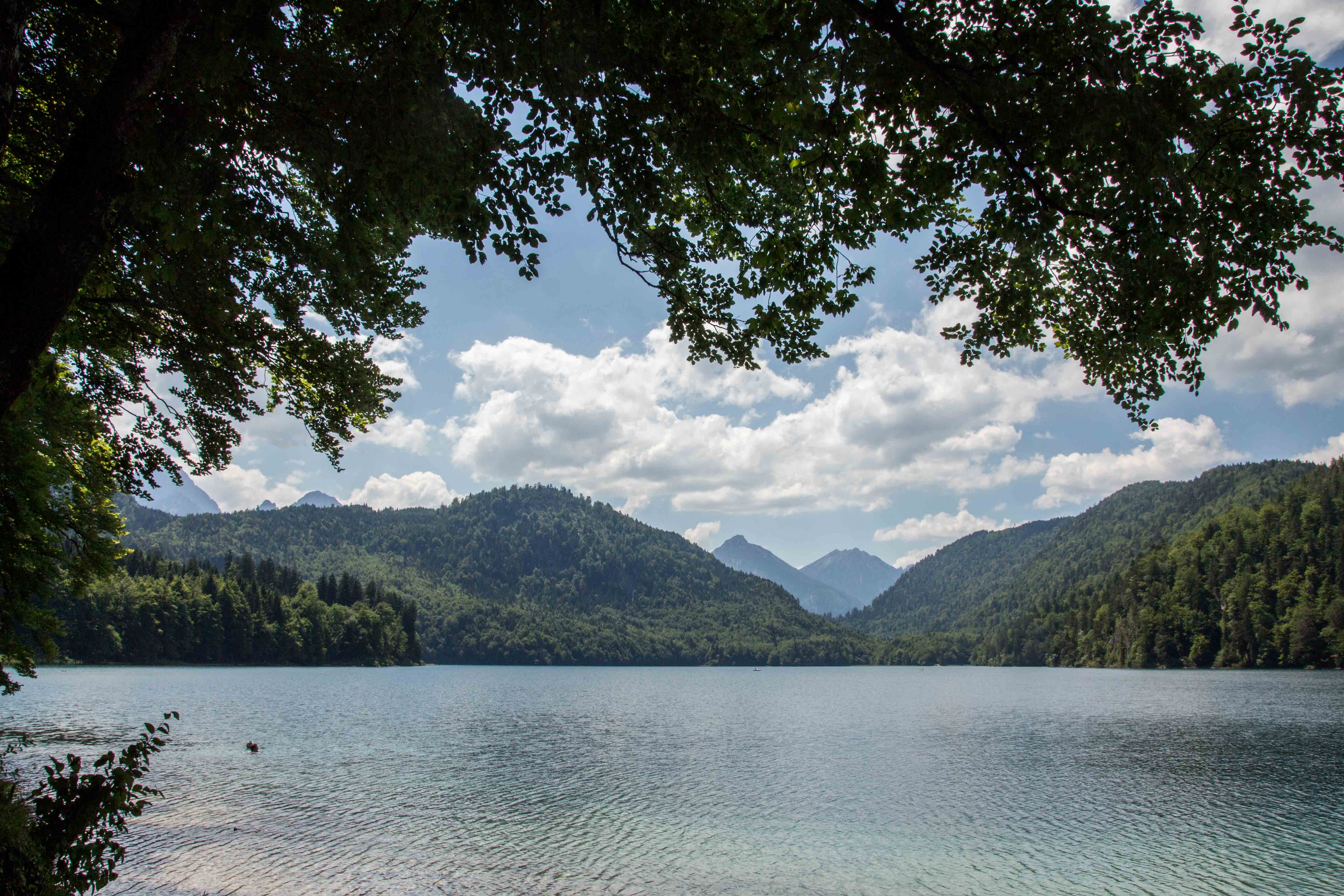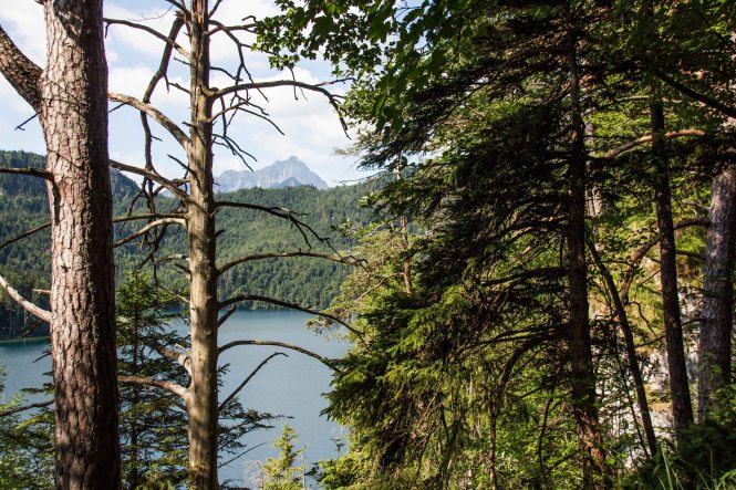 Nach dem gemütlichen Frühstück fahren wir mit dem Bus zu den Königsschlössern. Obwohl es noch früh am Tag ist, wuseln schön eine Menge Touristen herum, die meisten aus Asien. Wir laufen mit den Massen hinauf zum Schloss HOHENSCHWANGAU, indem Ludwig II. aufwuchs und es als zu dumpf und primitiv empfand. Daraufhin hat er sich das Märchenschloss NEUSCHWANSTEIN bauen lassen. Wir baden in der Menge und genießen es, kaum fünf Minuten später fast alleine hoch über dem blaugrün schimmernden ALPSEE zu spazieren. Wir können uns gar nicht erinnern, wie oft wir schon den malerischen See umrundet haben. Ein paar Dutzend Mal sind es bestimmt. Aber immer wieder eröffnen sich neue Perspektiven und der Blick für die kleinen Schönheiten der Natur wird geschärft. Nach der fußläufigen Umrundung chartern wir uns ein Ruderboot und schippern über den leicht gekräuselten See, der das sauberste Wasser in Deutschland haben soll. Mit derzeit 20 Grad Wassertemperatur ist es mir fast schon zu warm.