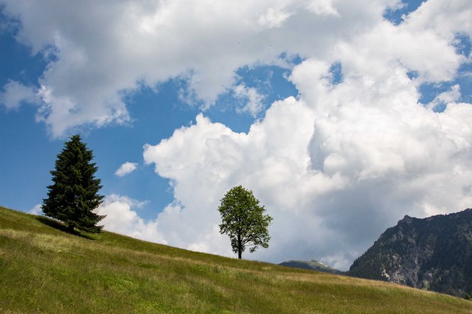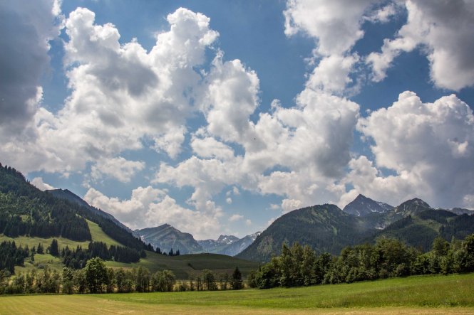 Sommertag. Schon am frühen Morgen bilden sich die ersten zerfranzten Wolken, lokale Gewitter sind vorhergesagt. Heute fahren wir ins TANNHEIMER TAL, laut Eigenwerbung das schönste Hochtal der Alpen. Oberhalb von GRÄN parken wir und folgen dem „Vater-unser-Weg“ hinunter in den Talgrund nach INNERGSCHWEND. Hier stärken wir uns im Wirtshaus Beim Öfner. Wir freuen uns, dass noch einige Wiesen nicht gemäht sind. Hoch stehen die vielen unterschiedlichen Gräser am Wegesrand, dazwischen leuchten die Sommerblumen. An einigen sumpfigen Stellen hält das Wollgras seine Fäden in den Wind, im Zinnkraut glitzern die letzten Tautropfen wie kleine Diamanten. Hoch reichen die Wolken, am Abend ist der Himmel jedoch wieder blank geputzt, das ersehnte Gewitter bleibt heute aus.