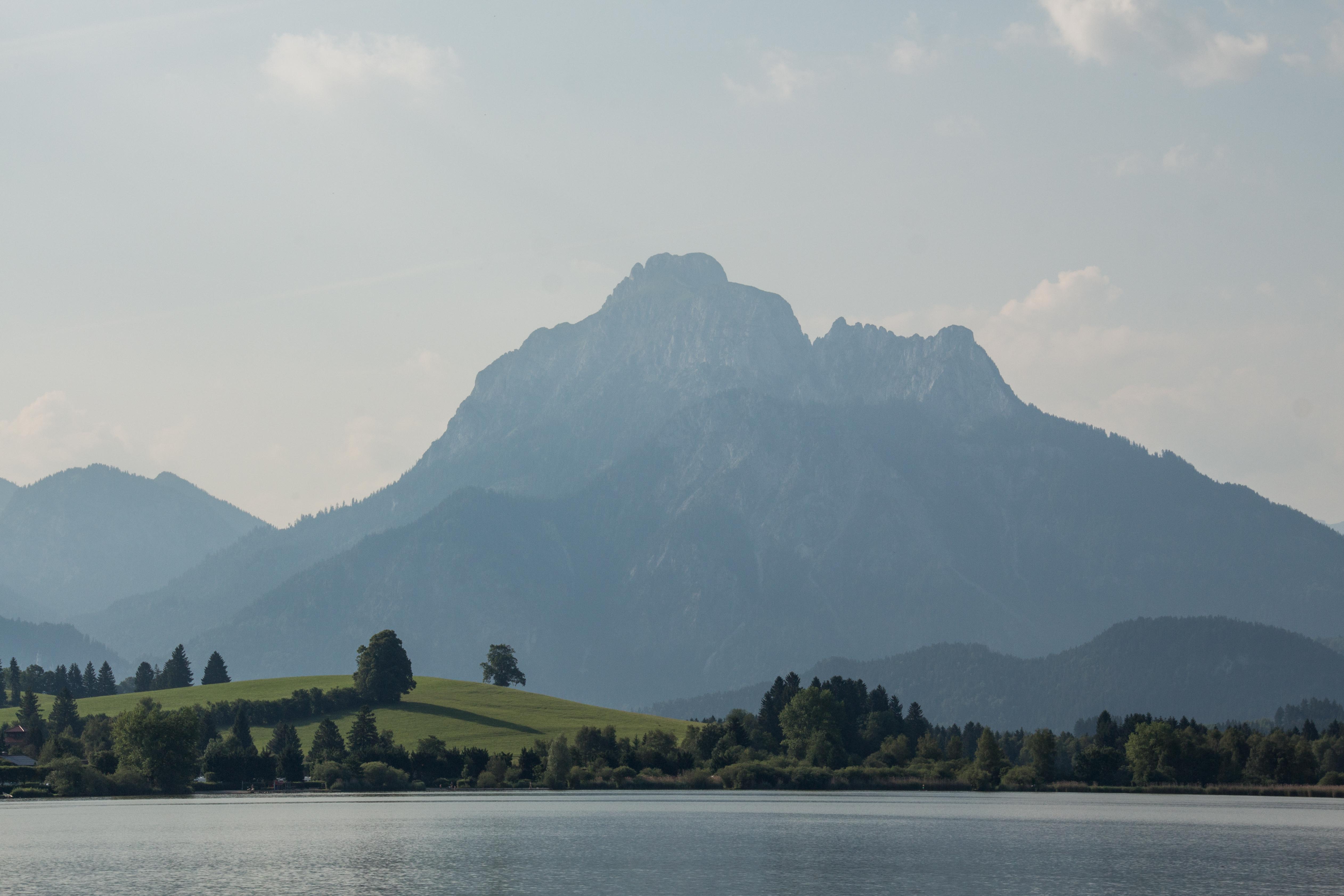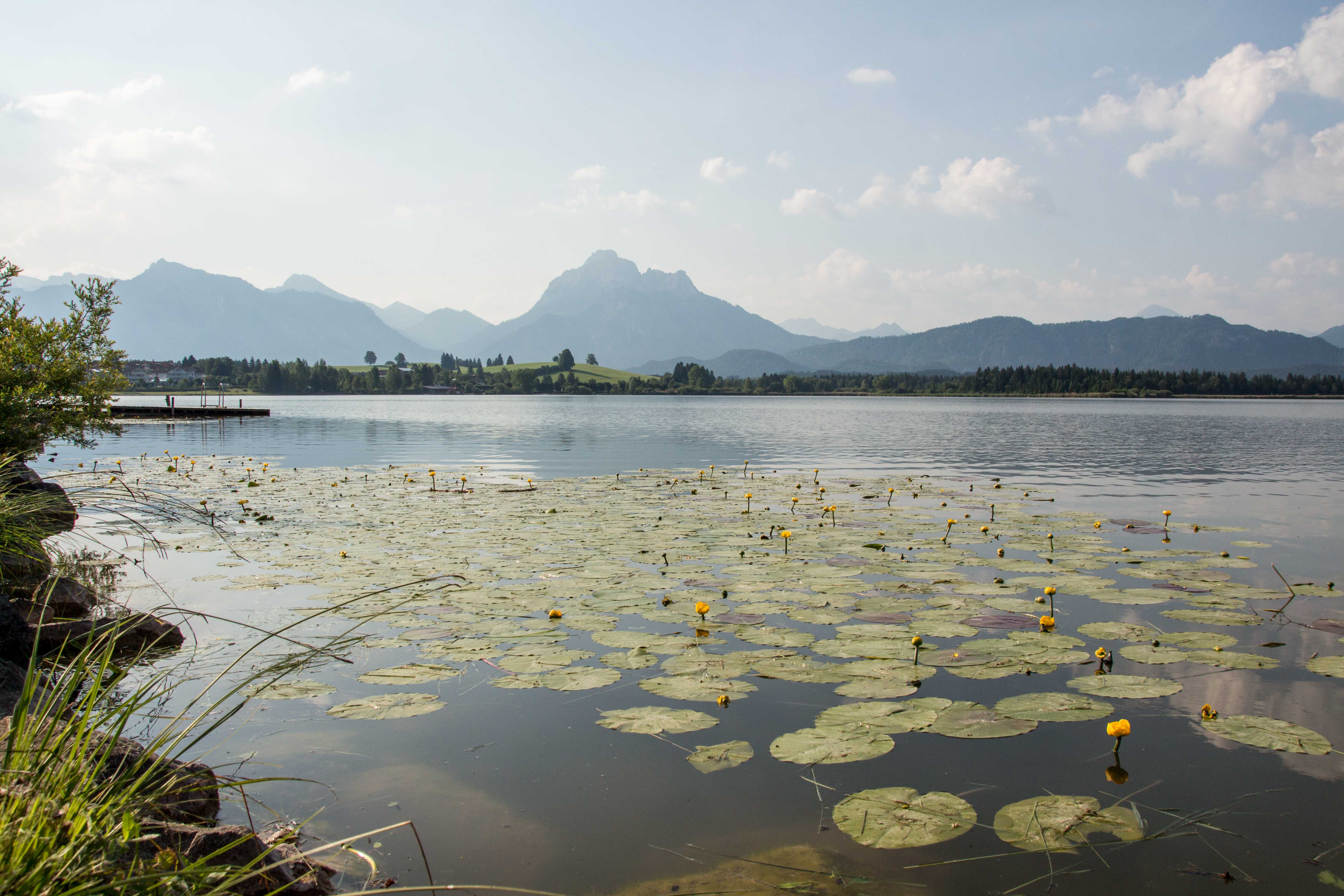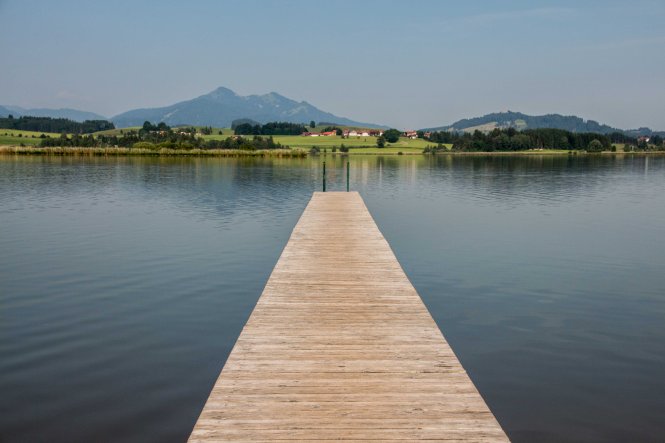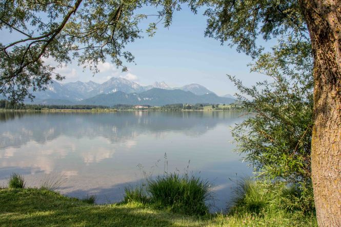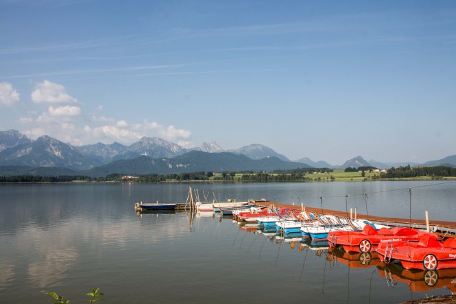 Die Hitze hält uns noch gefangen, die Berge und Schlösser versinken im Dunst der heißen Luft. Gerne sind wir in der relativen Kühle des Morgens unterwegs. In HOPFEN am HOPFENSEE sind die Cafés noch leer, die Touristen wohl noch in ihren Betten. So sind wir fast ganz alleine, als wir uns um die Umrundung des Sees mit dem eindrucksvollen Bergpanorama machen.