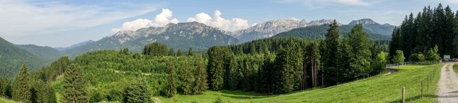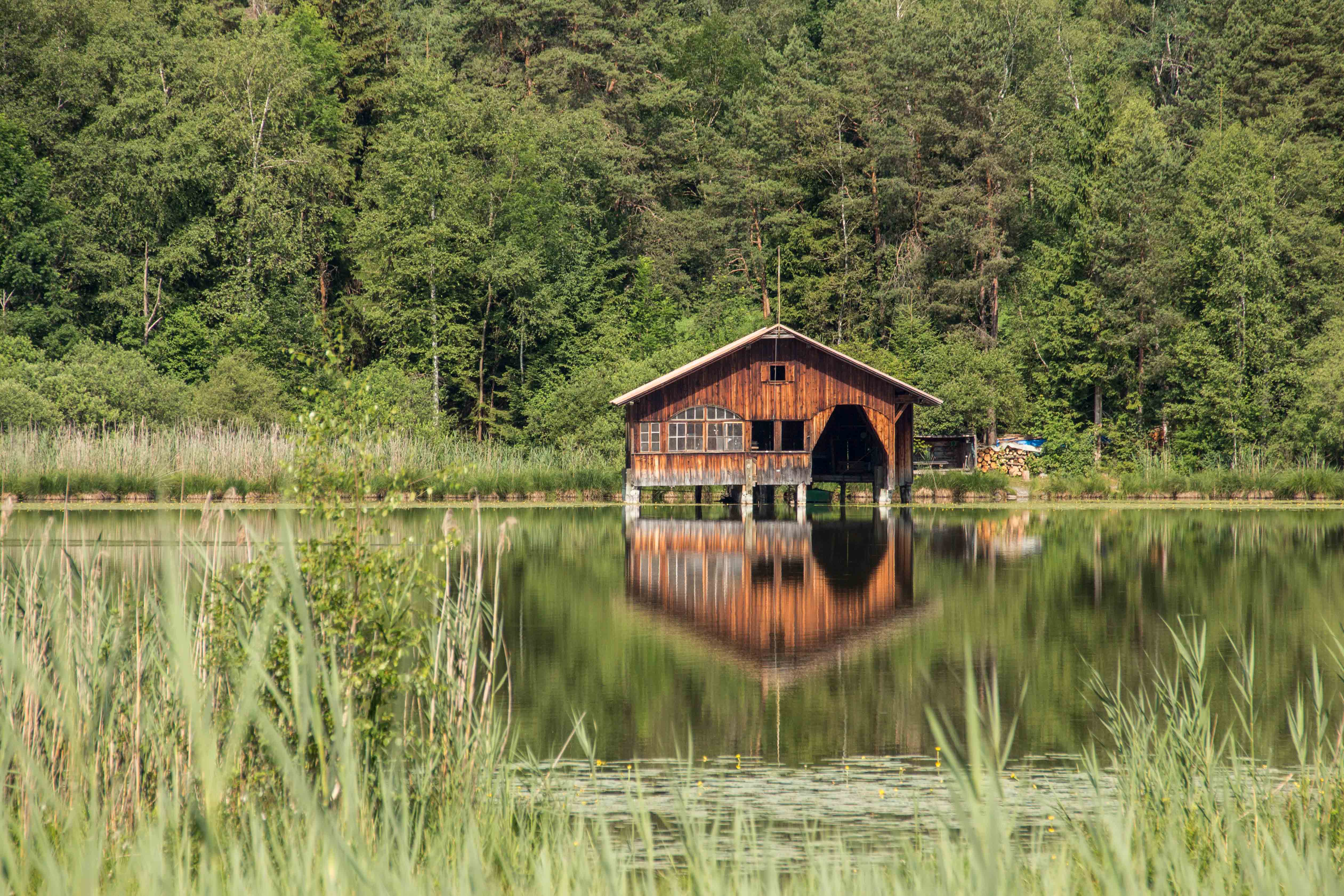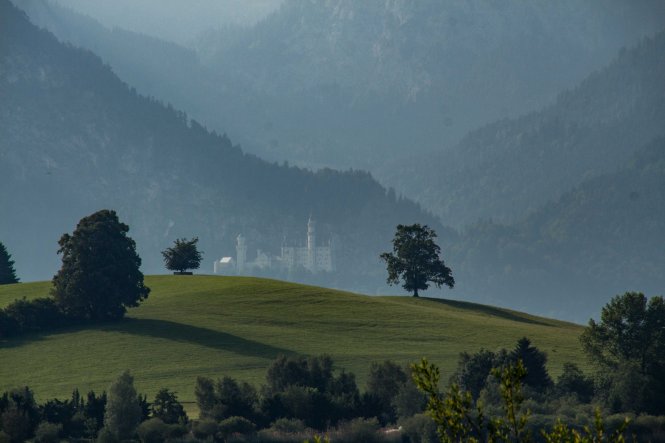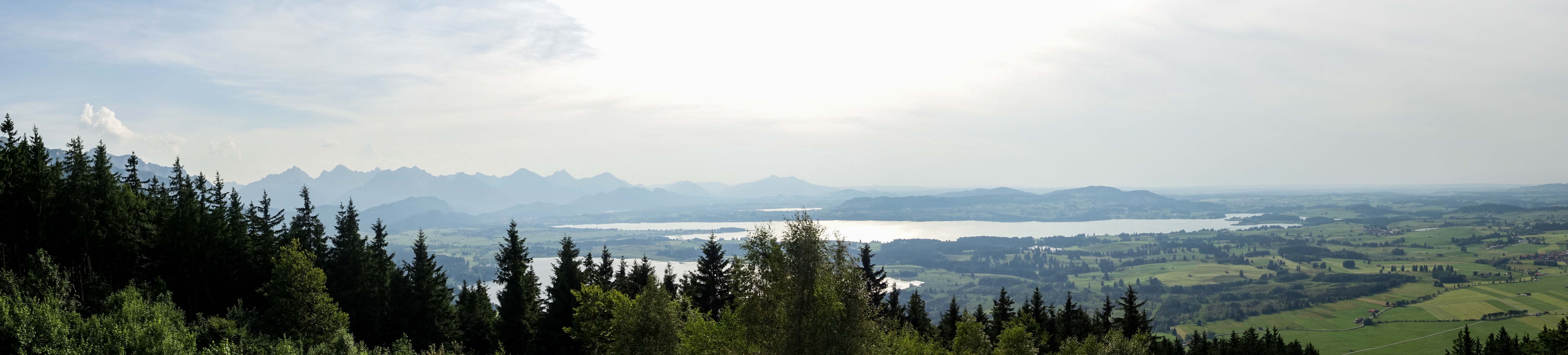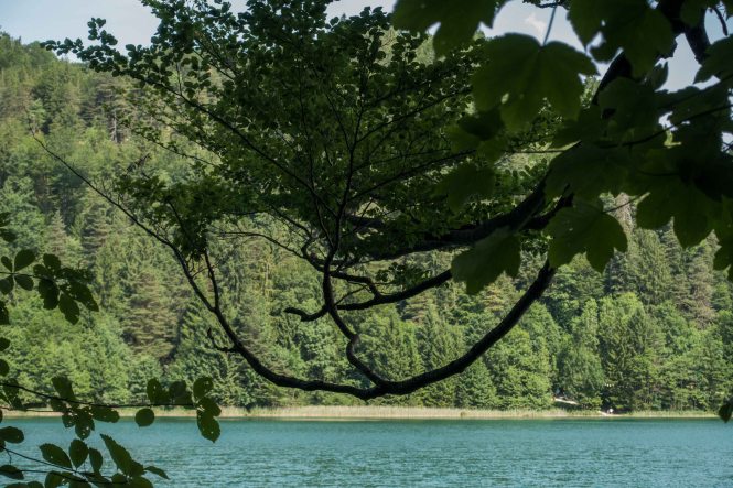 Die Hitze hält uns noch gefangen, die Berge und Schlösser versinken im Dunst der heißen Luft. Gerne sind wir in der relativen Kühle des Morgens unterwegs. In HOPFEN am HOPFENSEE sind die Cafés noch leer, die Touristen wohl noch in ihren Betten. So sind wir fast ganz alleine, als wir uns um die Umrundung des Sees mit dem eindrucksvollen Bergpanorama machen.