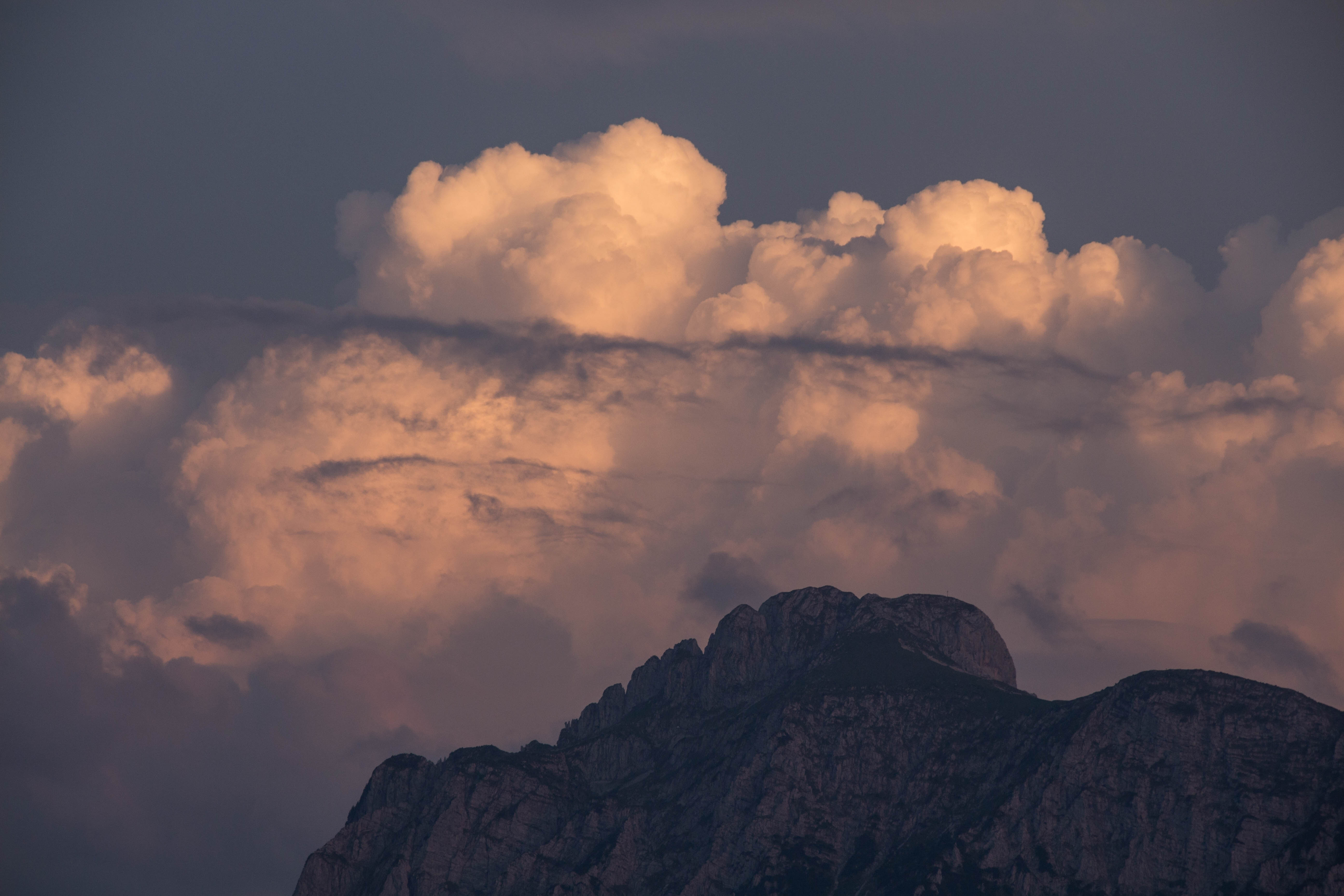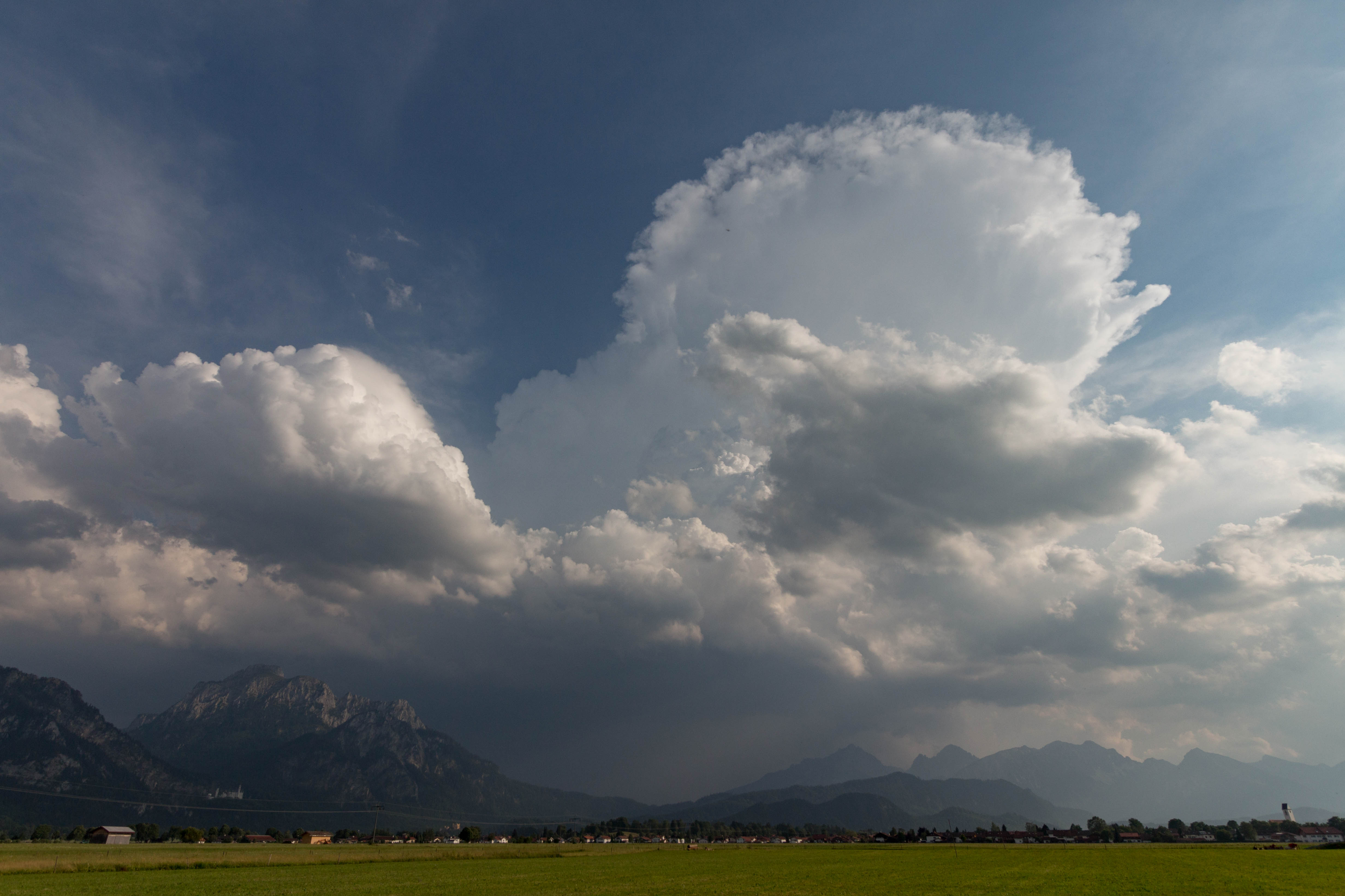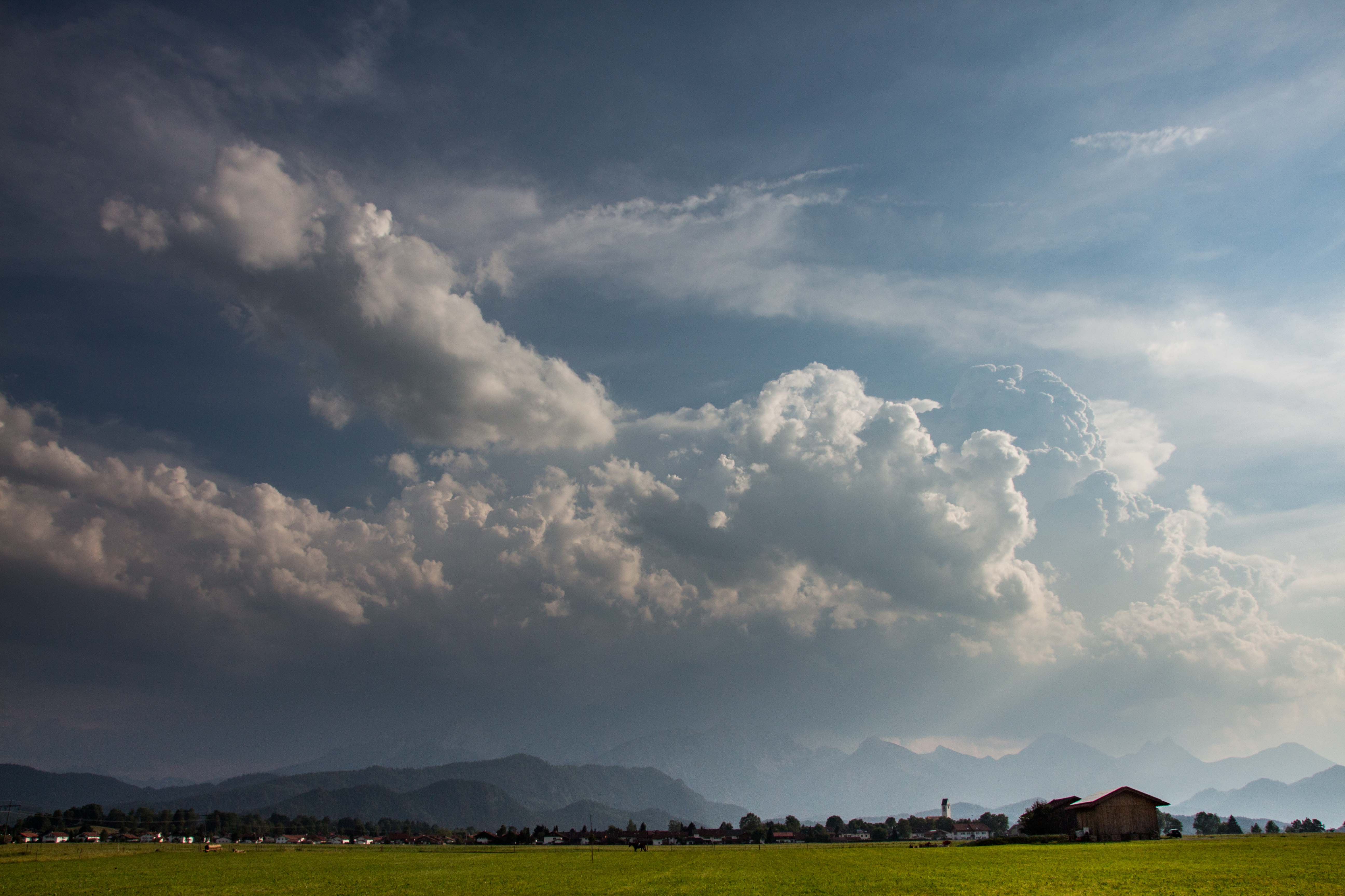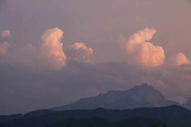 Am Abend ziehen, wie fast an jedem Tag der Woche, mächtige Wolken von Westen heran. Hoch türmen sie sich auf, wenn die Berge ihnen im Weg stehen. Fasziniert sitzen wir Stunde um Stunde im Garten und bewundern dieses Schauspiel. Doch auch beute bleibt es bei zwei Donnerschlägen, die aus dem Lechtal heraus tönen. In der untergehenden Sonne schimmern die kleinen Wolkenfetzen im zarten Rose.