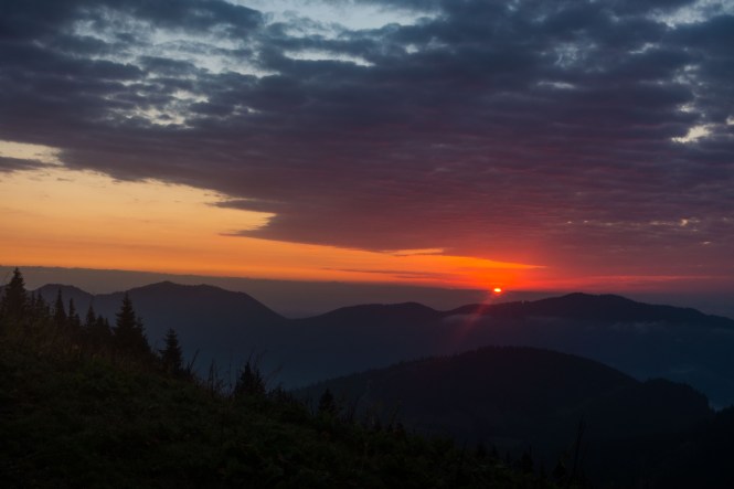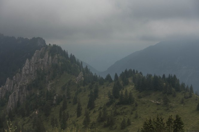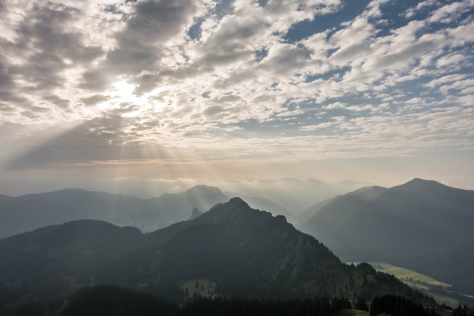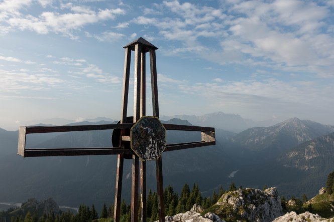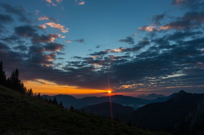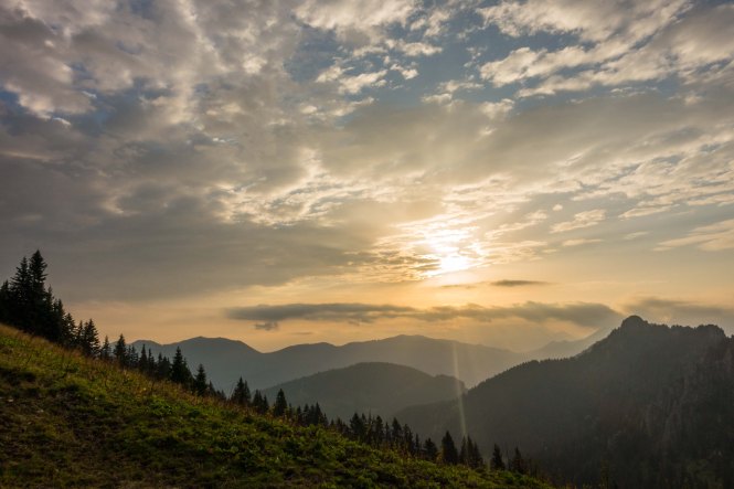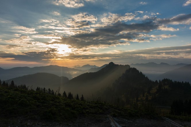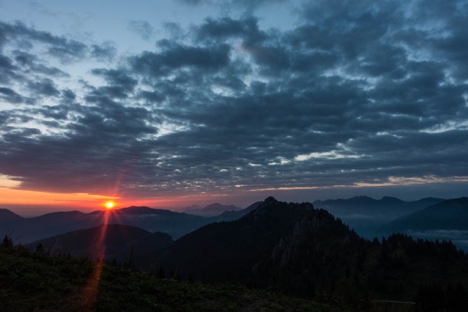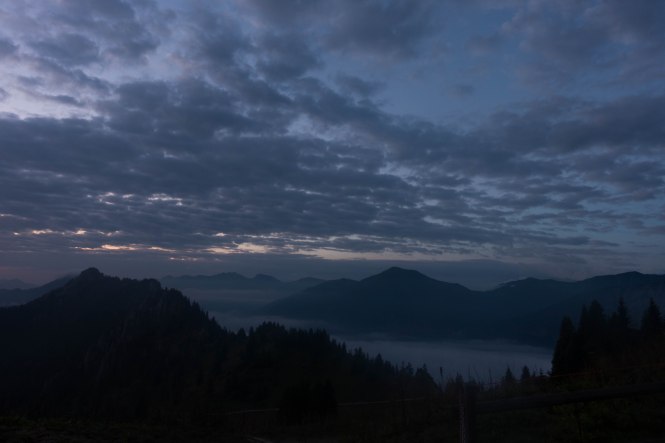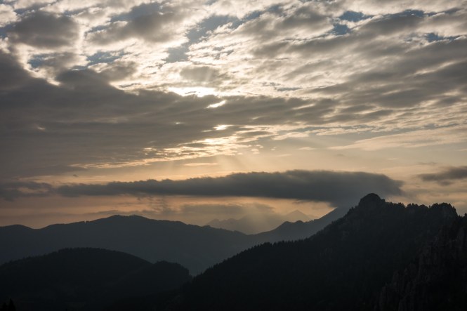 Weil es gar so schön hier ist, bleiben wir einen Tag am PÜRSCHLINGHAUS, nicht nur wegen dem ofenfrischen Leberkäse, aber auch. Da wir im Freien schlafen, weckt uns die Sonne mit ihren ersten Strahlen. Der Himmel ist schon früh stark bewölkt. Es sind heftige Gewitter vorhergesagt, doch Petrus folgt dem Wetterbericht nicht, es bleibt meist trocken. Noch vor dem ersten Kaffee auf der Hütte bezwingen wir ohne Rucksack beschwingt den TEUFELSTÄTTKOPF. Dies ist wieder einer der vielen allgäuer Aussichtsberge, der uns einen Rundumblick schenkt. Zurück auf der Hütte, hat der Wirt schon den Kaffee gebraut, dessen verführerischer Duft uns entgegen weht. So können alle Tage beginnen. Dies ist ein Tag ohne Handy (der Akku ist fast leer), ohne Buch und Fernseher. Auf der Terrasse von Ludwigs Jagdhütte sitzend, er kannte die magischen Orte seines Königreiches und wusste sie zu genießen, und einfach in die Berge schauend, scheint die Zeit langsamer als sonst zu vergehen. Atempause.