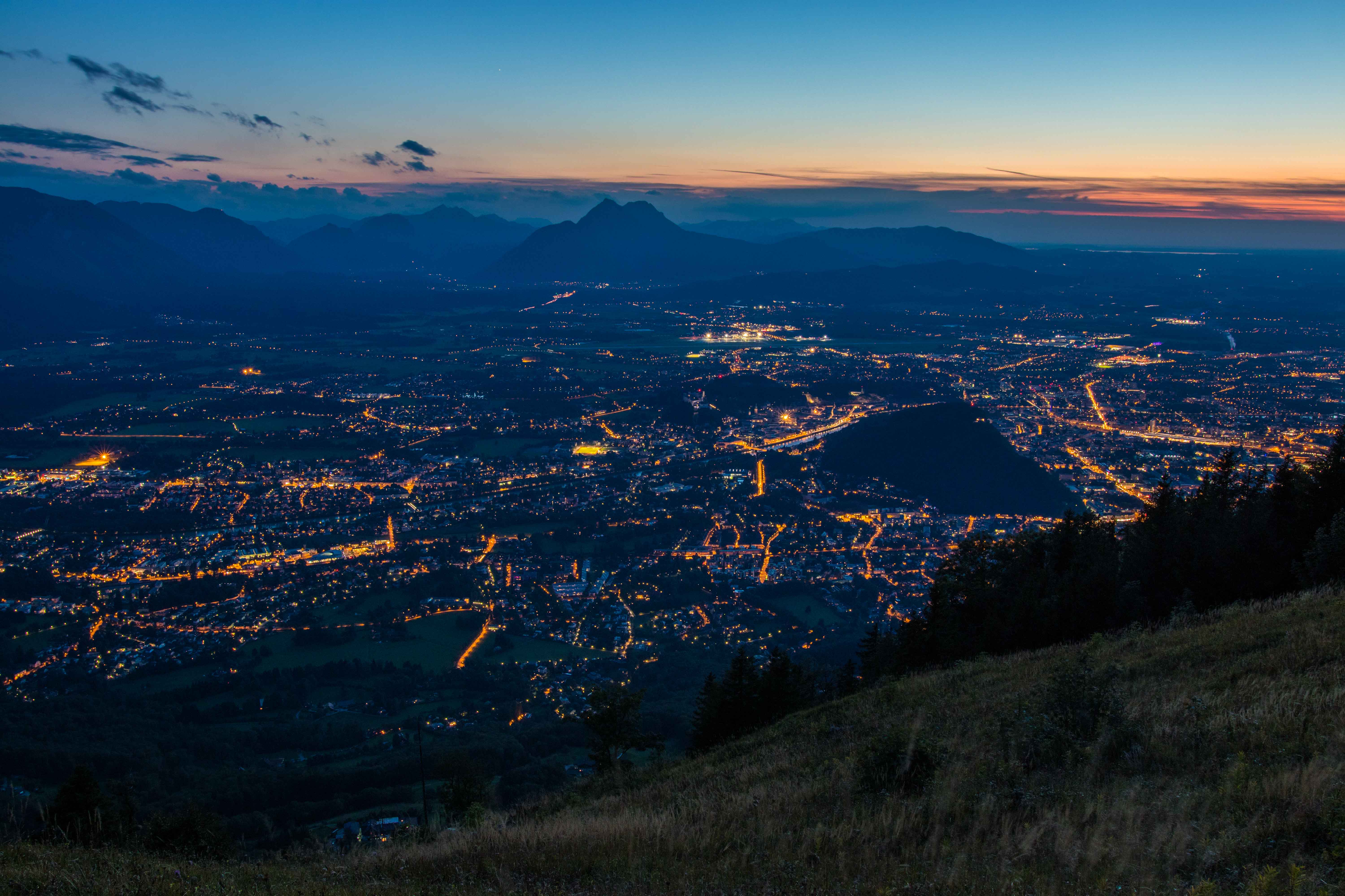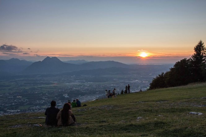Die erste Station auf unseren Weg in den Südosten Europas ist SALZBURG. Da wir die Stadt erst am Mittag erreichen und sich die Touristenströme durch die Straßen schieben, flüchten wir erst einmal auf den 1 265 m hohen GAISBERG. Radfahrer, Wanderer, Gleitschirmflieger und weniger sportliche Ausflügler belagern den Aussichtsberg und die Biergärten der beiden Wirtschaften. Die schneeweiße Pyramide des WATZMANN steht majestätisch am Horizont, im Süden grüßen die imposanten und ebenfalls leuchtend weißen Felsspitzen des DACHSTEINGEBIRGES und irgendwo spitzt der GROSSGLOCKNER über die Bergkette. Sanfte herbstliche Thermik schiebt die Flieger in die Luft. Ich bleibe am Boden und schaue etwas neidisch zu. Aber es werden sich schon noch weitere Flugmöglichkeiten ergeben. Pärchen packen Wein und Picknick aus und genießen die romantische Stimmung der untergehenden Sonne, zur Vollendung der glücklichen Stunden steht auch noch der fast volle Mond am silberblauen Himmel. Ein guter Start unserer Reise.
