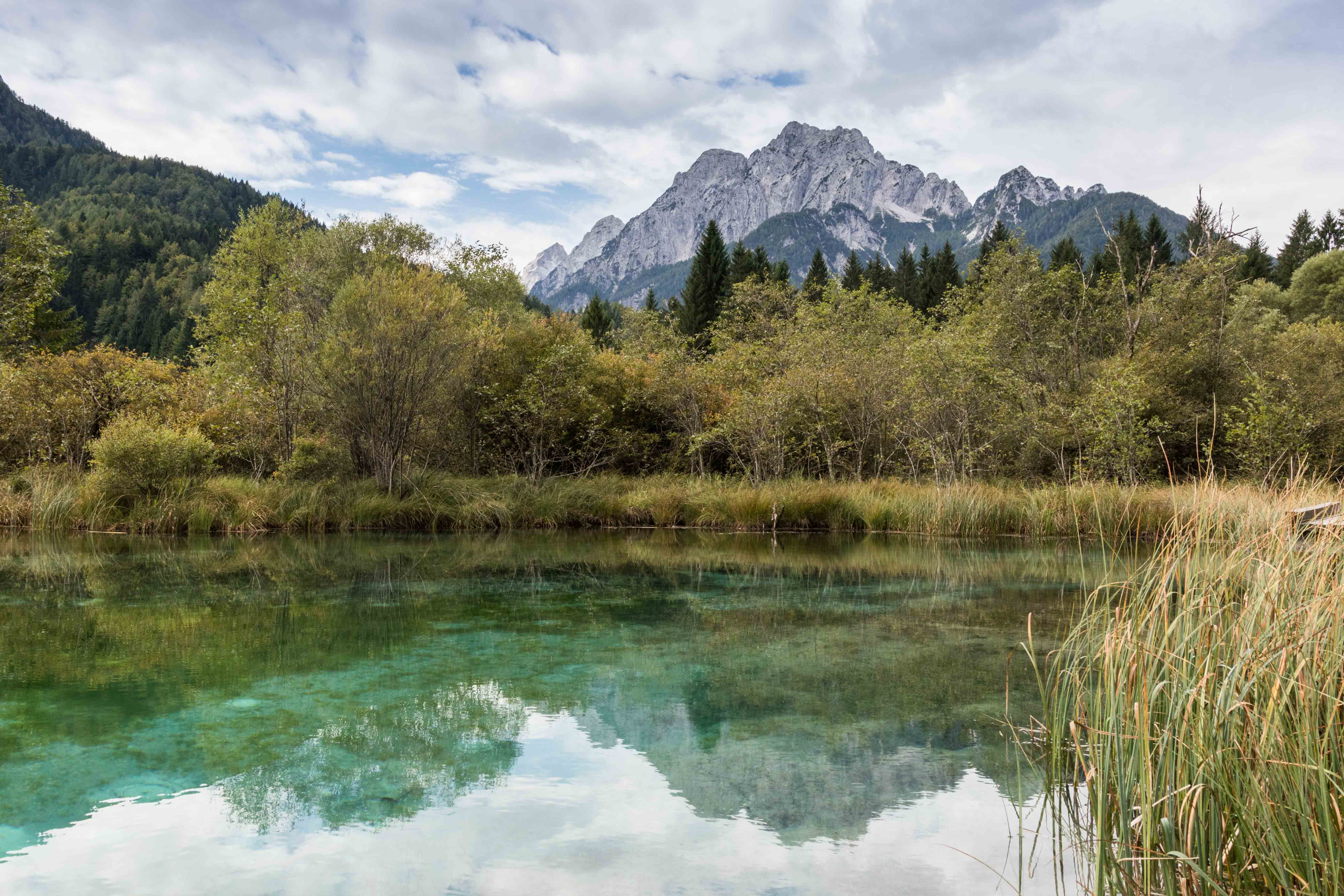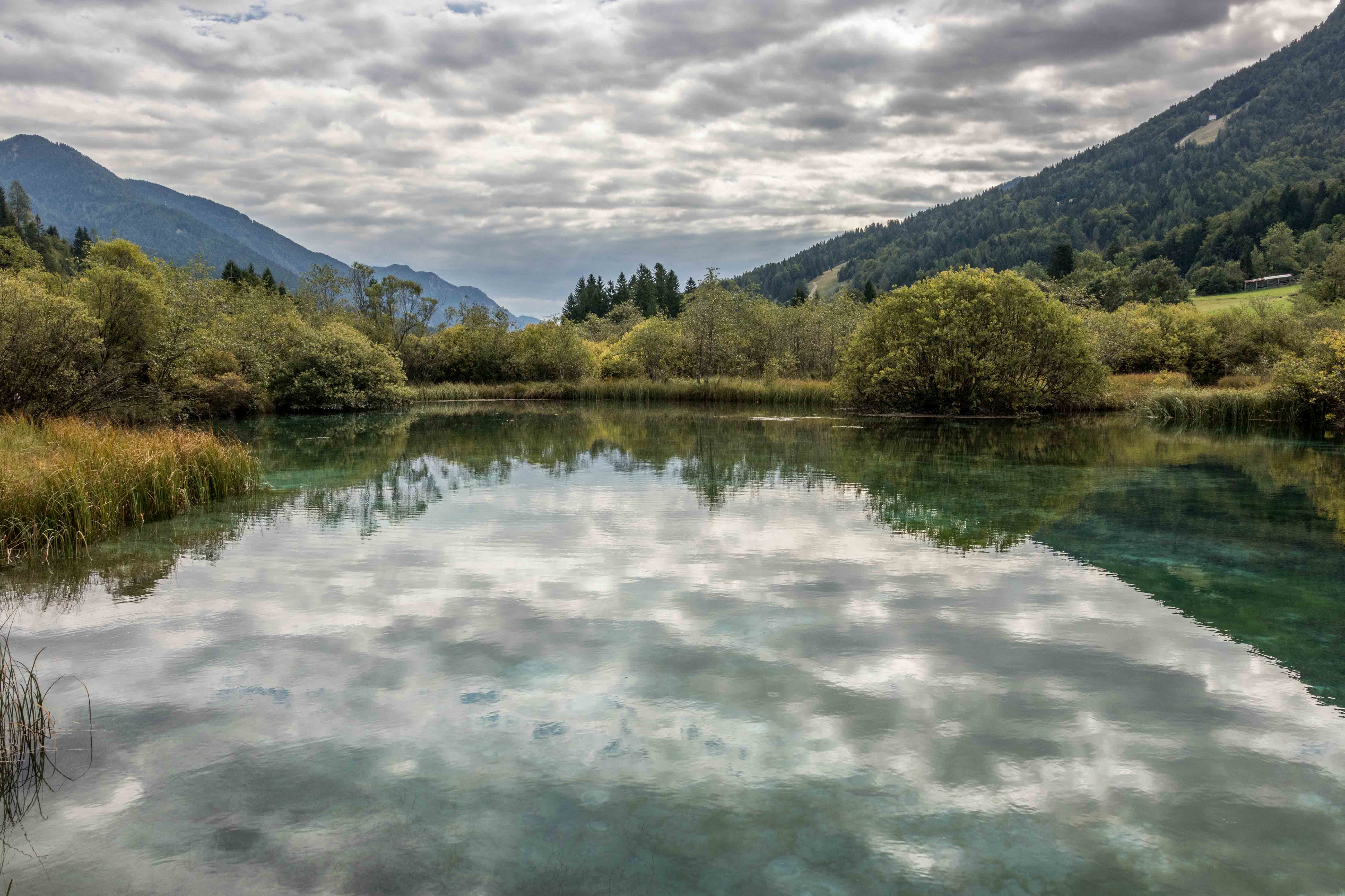 Bei PODKOREN machen wir einen kurzen Abstecher zum Quelltopf des ZELENCI. In dem glasklaren blaugrünen Wasser spiegeln sich die umliegenden Berge.