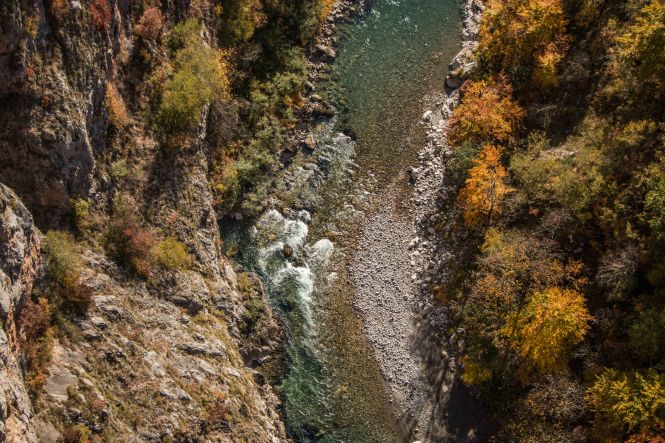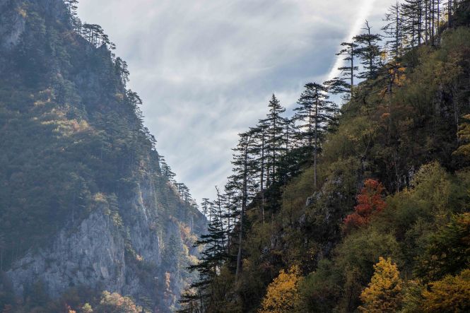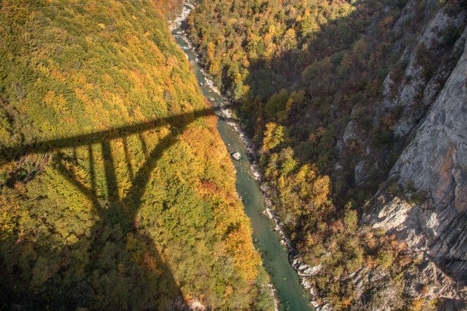 Wir fahren noch ein Stück der weiten Hochfläche entlang, bevor wir zur zweit längsten Schlucht der Welt und der längsten Europas kommen. Die TARA hat sich auf viele Kilometer in die Landschaft gegraben. Bei BUDEČEVICA überspannt eine elegante Brücke den tiefen Graben. Flussabwärts geht es nur mit dem Schlauchboot weiter, wir nehmen die breite Straße flussaufwärts. Laubbäume in ihrem herbstlichen Kleid und bizarre Nadelbäume wachsen an den steilen Hängen entlang des Naturschauspiels. Gemütlich schleichen wir die wenig befahrene Straße bis MOJKOVAC. Hier weitet sich das Tal und wir finden fast unmittelbar an der TARA einen aussichtsreichen Platz.