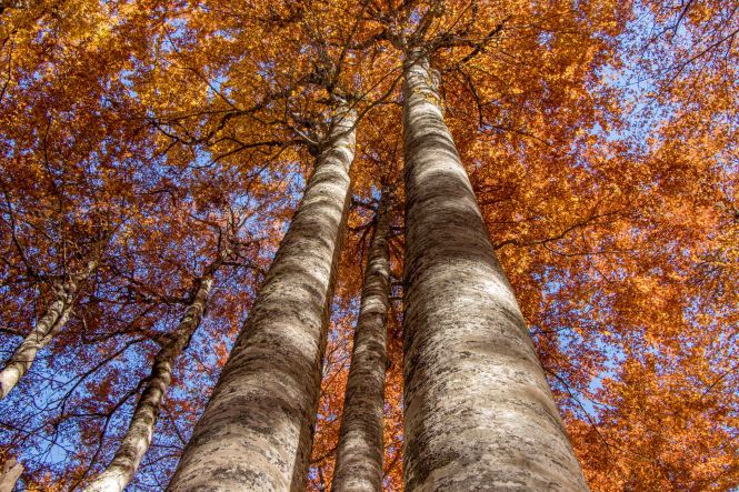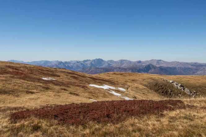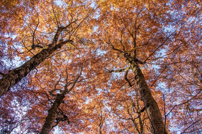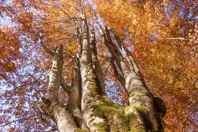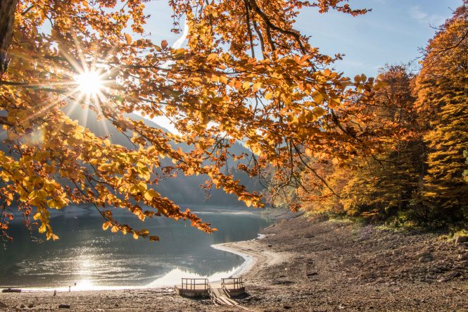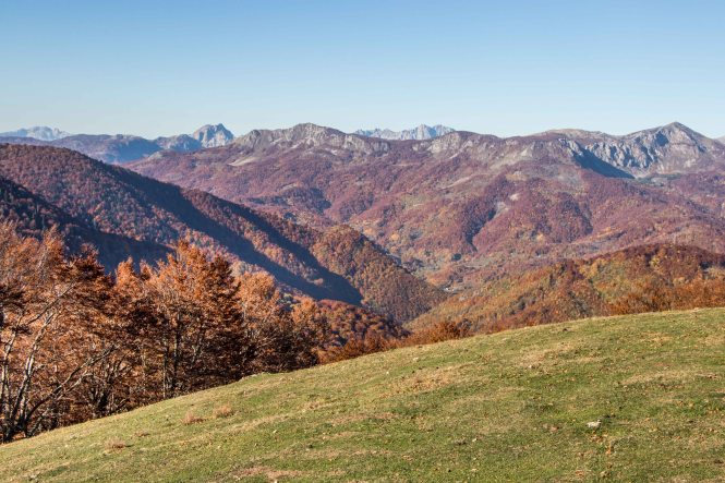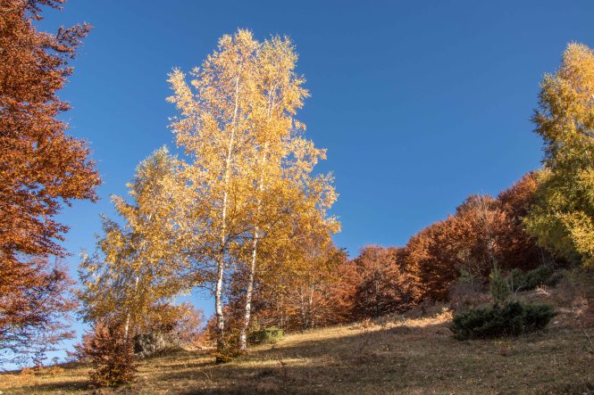 Schon kurz nach 8 Uhr sind wir am BIOGADSKO JEZERO, im gleichnamigen Nationalpark. Bereits 1872 stellt Fürst Nikola das BJELASICA-GEBIRGE unter seinen persönlichen Schutz. Es ist dadurch, nach dem Yellowstone-Nationalpark, das zweit älteste Naturschutzgebiet der Welt. Nachdem wir fünf tschechischen Mädels einen Kaffee gekocht haben macht Peter sich auf den Weg. Das Laub der Bäume glüht in den herbstlichen Farben, Peters Waden beim fast senkrechten Aufstieg über die kahlen Kuppen. Nach gut drei Stunden ist der 2033 m hohe RAZVRŜE erreicht, der Rundumblick zu den kosovarischen, albanischen und montenegrinischen Bergen einfach fantastisch. Sogar der runde Gipfel des BOBOTOV KUK, Vorgestern noch das Ziel, ist gut zu sehen. Auf dem Rückweg taucht der Weg wieder in den farbenprächtigen Laubwald ein. Manch einen der Giganten hat der Sturm oder das Alter gefällt. Dabei haben sie eine Bresche geschlagen, die Licht schafft und neues Leben ermöglicht. Ein leichter Wind lässt die bunten Blätter fallen, bald wird die bunte Pracht verschwunden sein. Was haben wir für ein Wetterglück, Peters Namenspatron sei Dank.