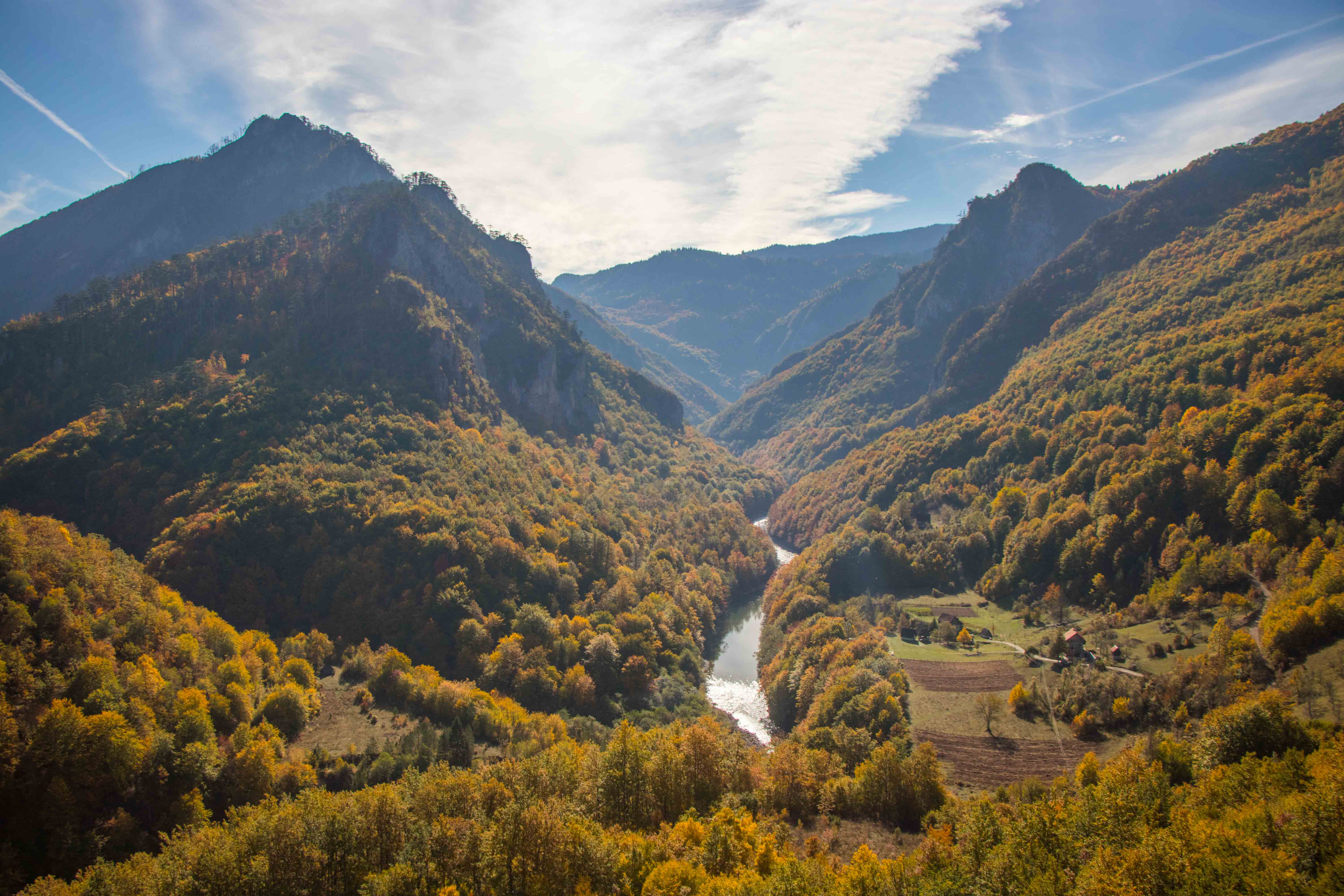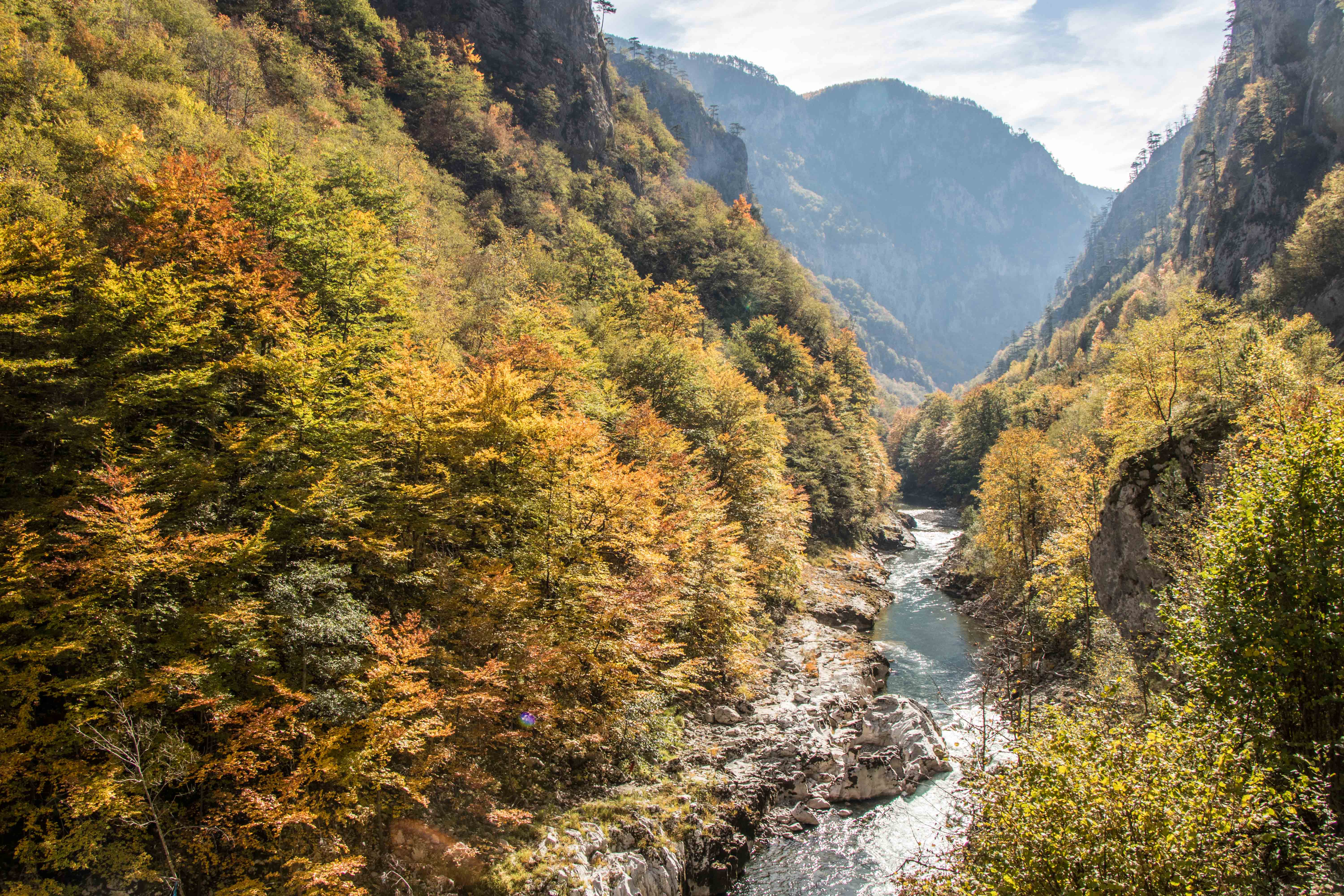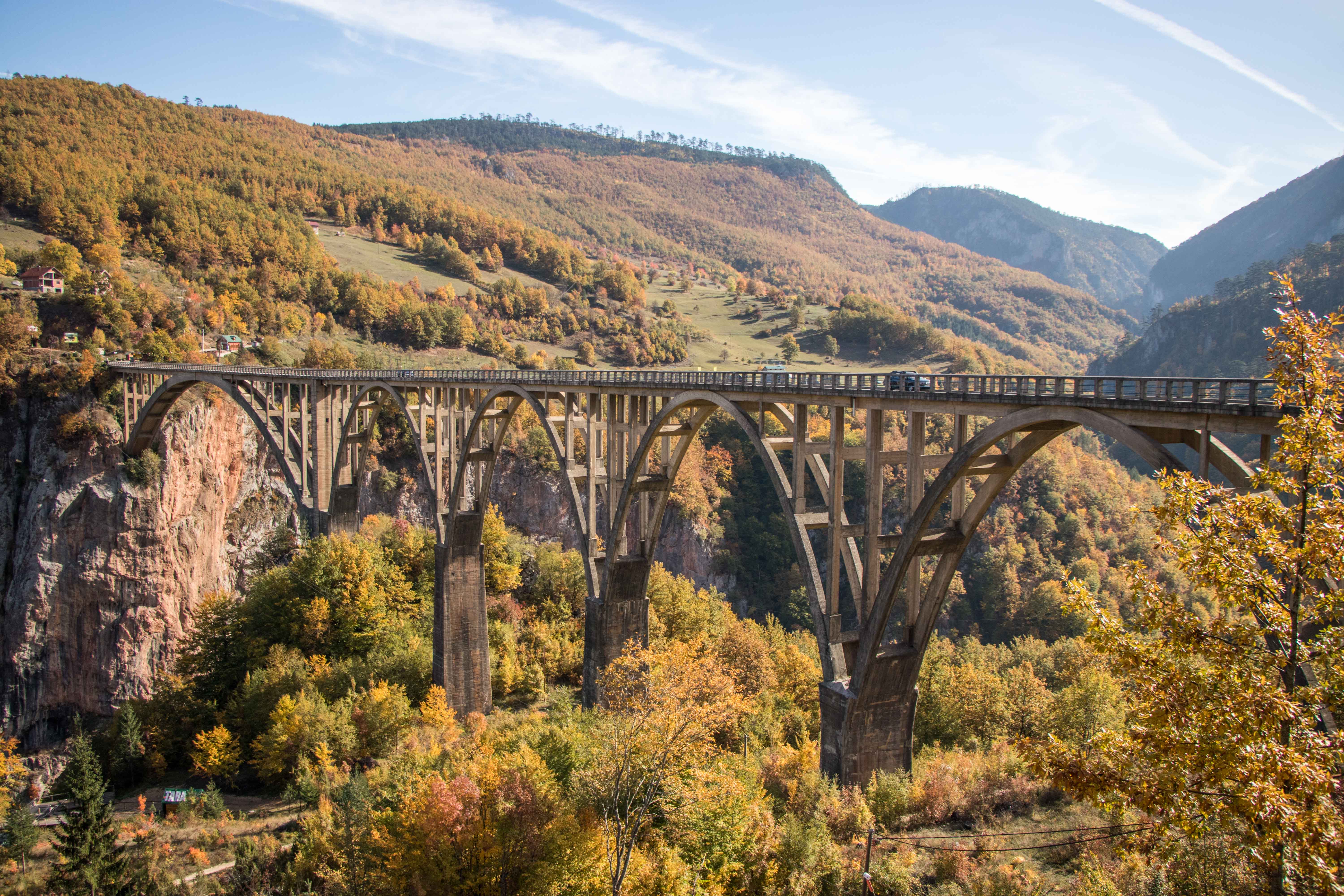 Wir fahren noch ein Stück der weiten Hochfläche entlang, bevor wir zur zweit längsten Schlucht der Welt und der längsten Europas kommen. Die TARA hat sich auf viele Kilometer in die Landschaft gegraben. Bei BUDEČEVICA überspannt eine elegante Brücke den tiefen Graben. Flussabwärts geht es nur mit dem Schlauchboot weiter, wir nehmen die breite Straße flussaufwärts. Laubbäume in ihrem herbstlichen Kleid und bizarre Nadelbäume wachsen an den steilen Hängen entlang des Naturschauspiels. Gemütlich schleichen wir die wenig befahrene Straße bis MOJKOVAC. Hier weitet sich das Tal und wir finden fast unmittelbar an der TARA einen aussichtsreichen Platz.
