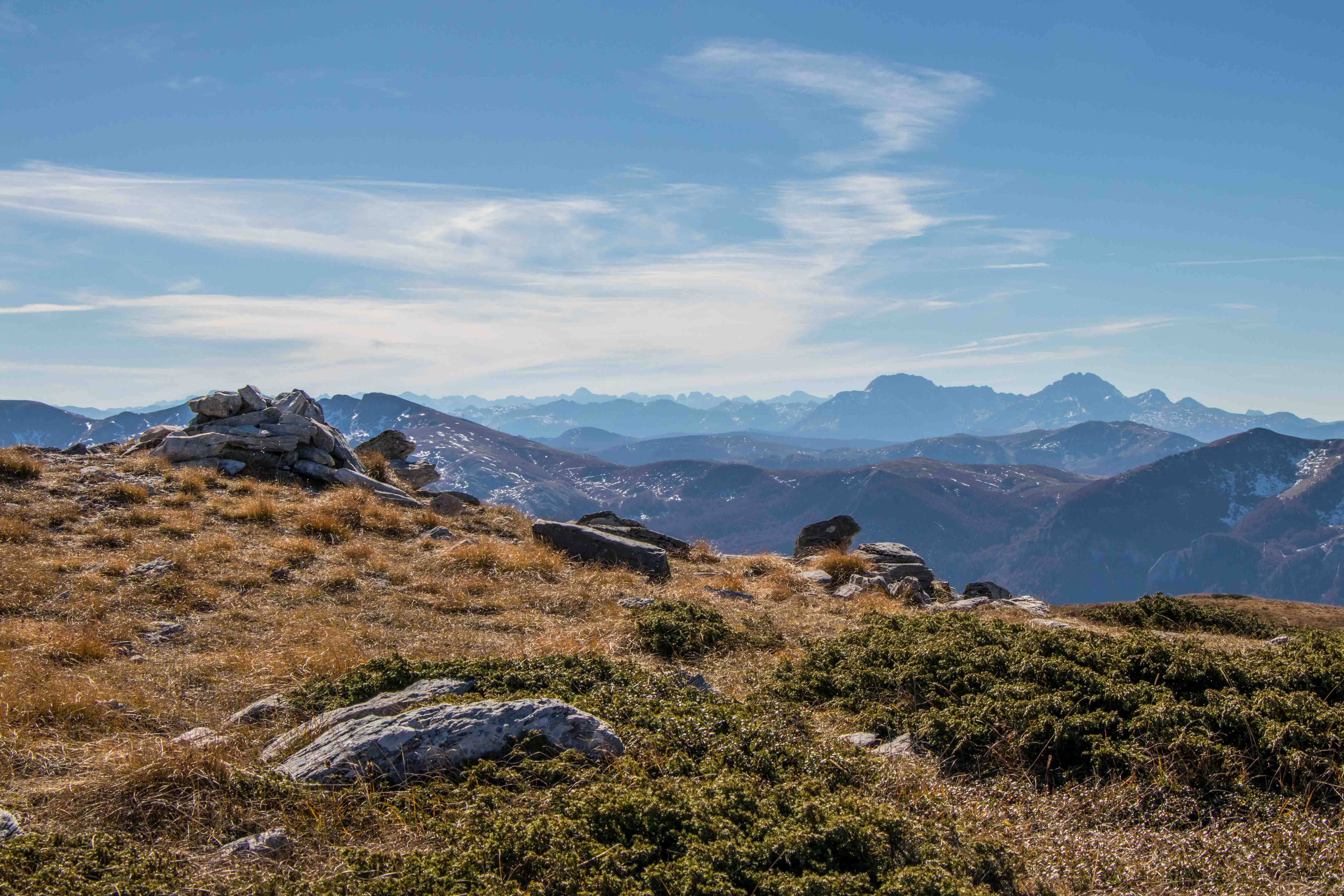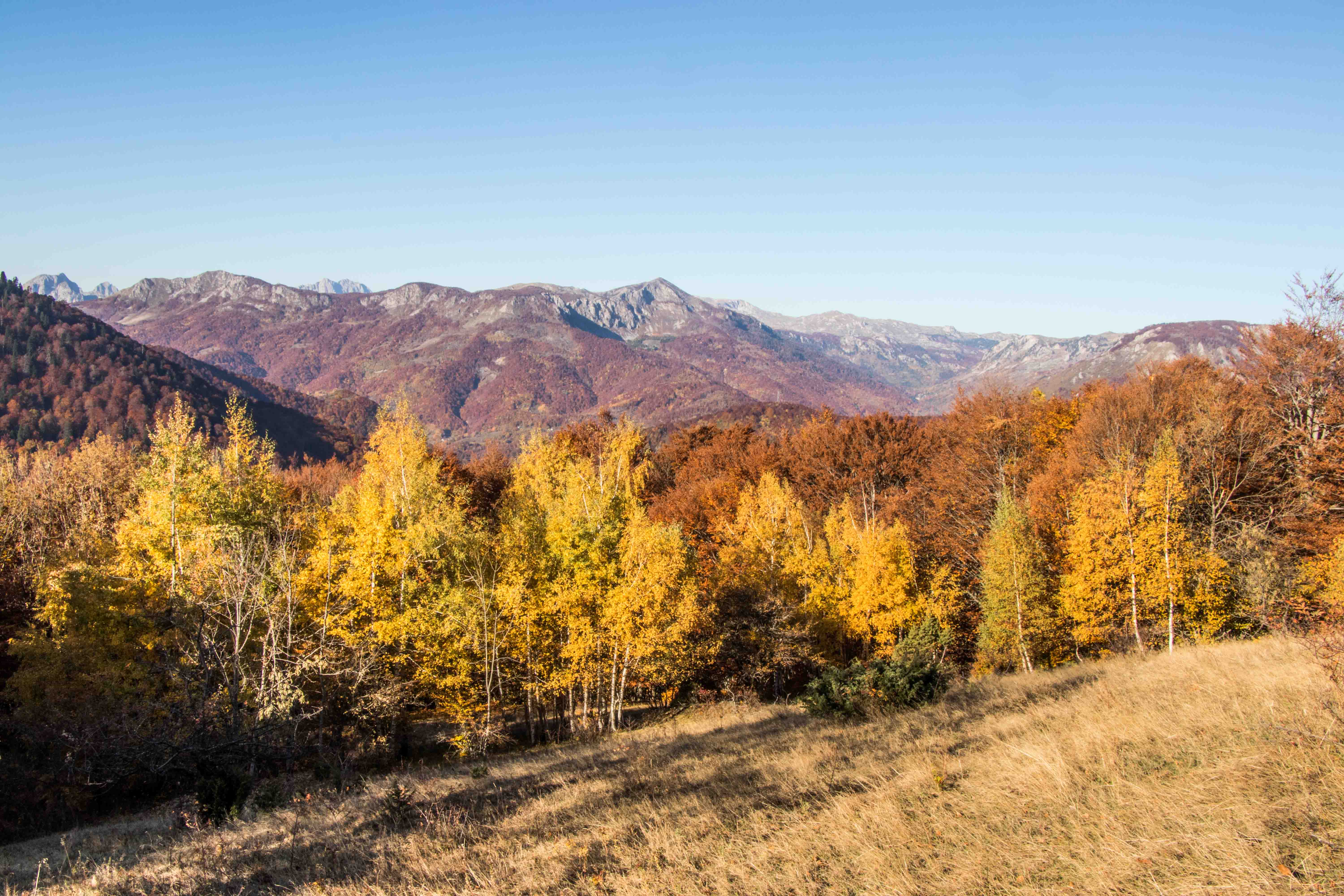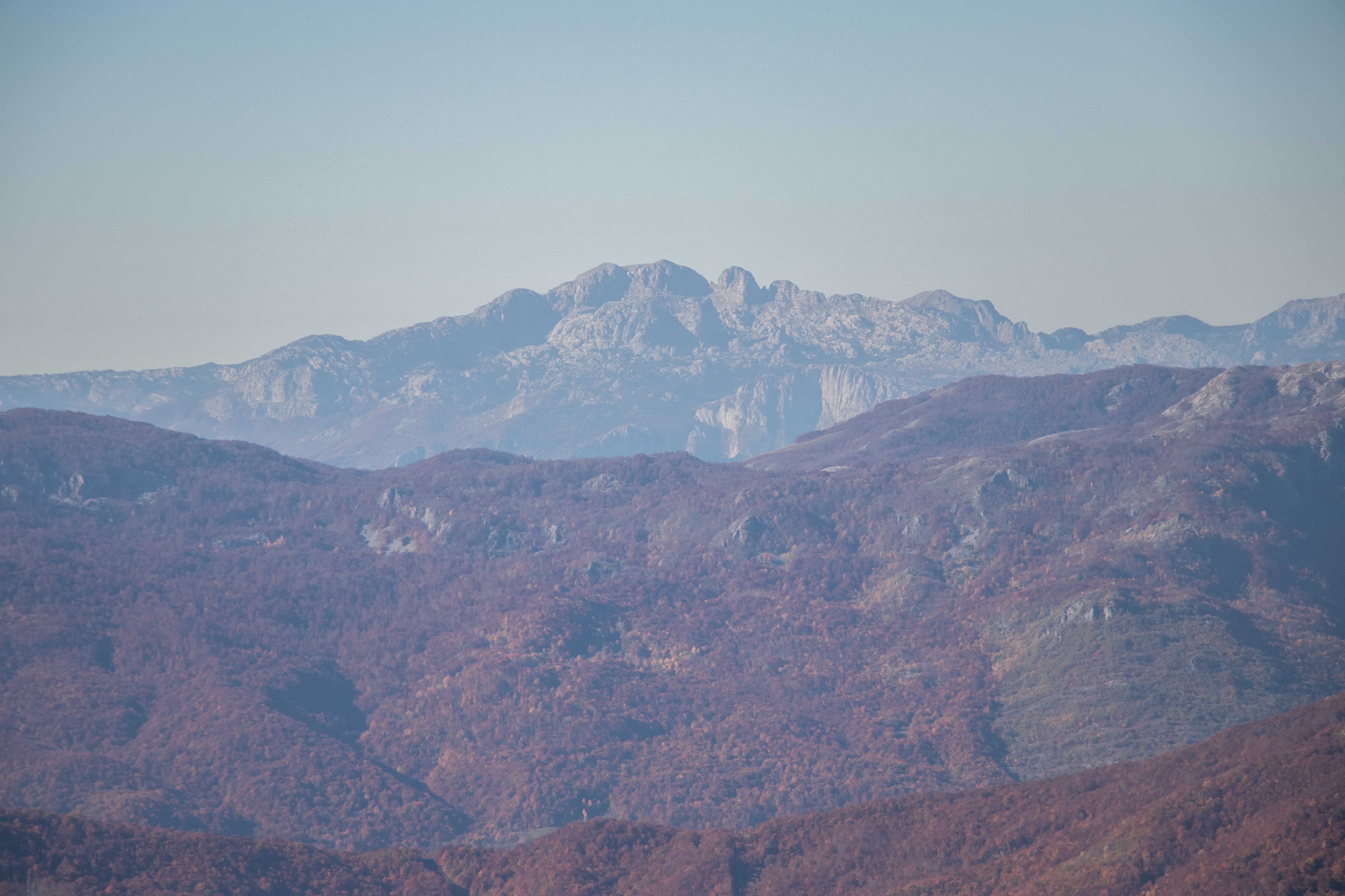Schon kurz nach 8 Uhr sind wir am BIOGADSKO JEZERO, im gleichnamigen Nationalpark. Bereits 1872 stellt Fürst Nikola das BJELASICA-GEBIRGE unter seinen persönlichen Schutz. Es ist dadurch, nach dem Yellowstone-Nationalpark, das zweit älteste Naturschutzgebiet der Welt. Nachdem wir fünf tschechischen Mädels einen Kaffee gekocht haben macht Peter sich auf den Weg. Das Laub der Bäume glüht in den herbstlichen Farben, Peters Waden beim fast senkrechten Aufstieg über die kahlen Kuppen. Nach gut drei Stunden ist der 2033 m hohe RAZVRŜE erreicht, der Rundumblick zu den kosovarischen, albanischen und montenegrinischen Bergen einfach fantastisch. Sogar der runde Gipfel des BOBOTOV KUK, Vorgestern noch das Ziel, ist gut zu sehen. Auf dem Rückweg taucht der Weg wieder in den farbenprächtigen Laubwald ein. Manch einen der Giganten hat der Sturm oder das Alter gefällt. Dabei haben sie eine Bresche geschlagen, die Licht schafft und neues Leben ermöglicht. Ein leichter Wind lässt die bunten Blätter fallen, bald wird die bunte Pracht verschwunden sein. Was haben wir für ein Wetterglück, Peters Namenspatron sei Dank.