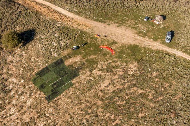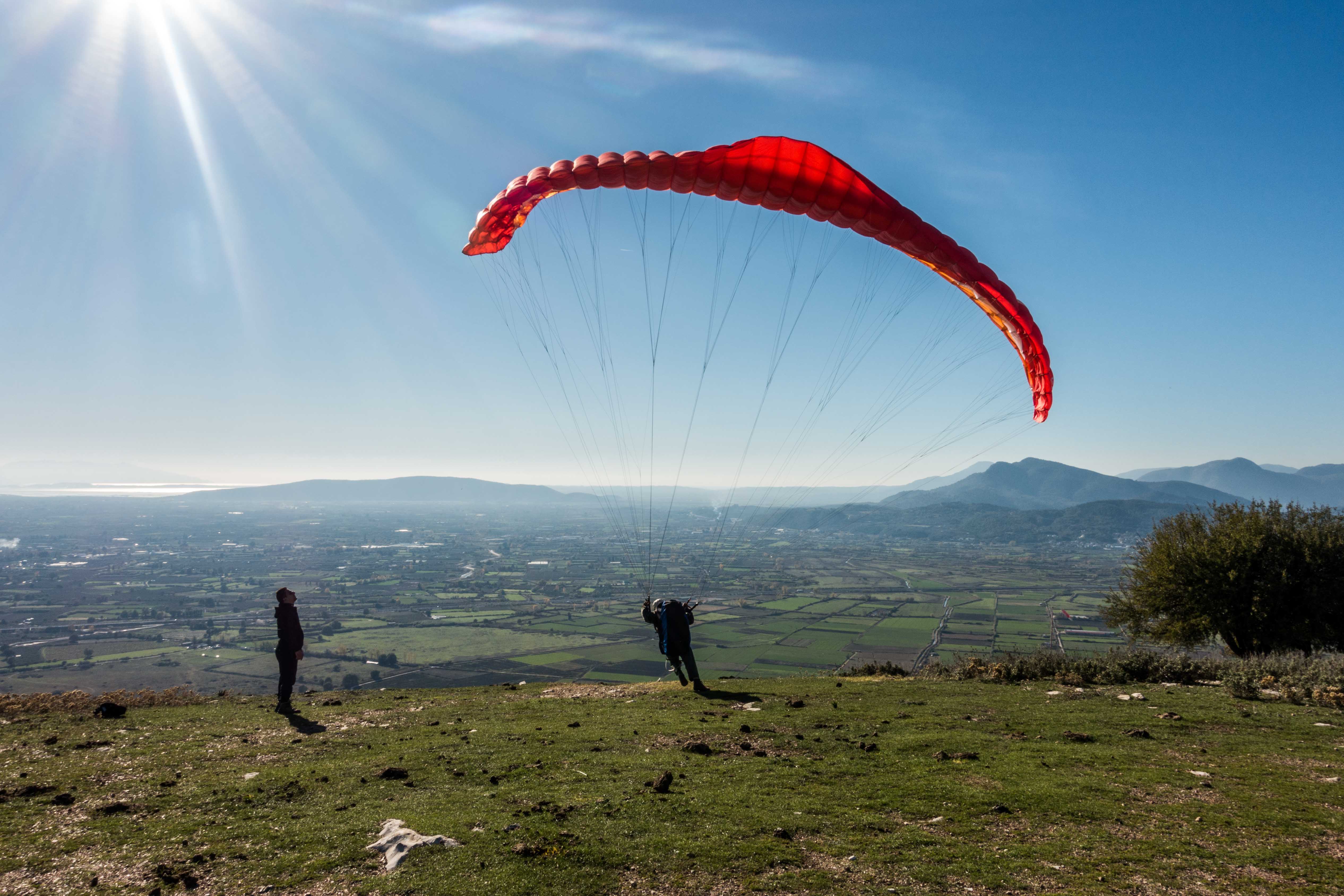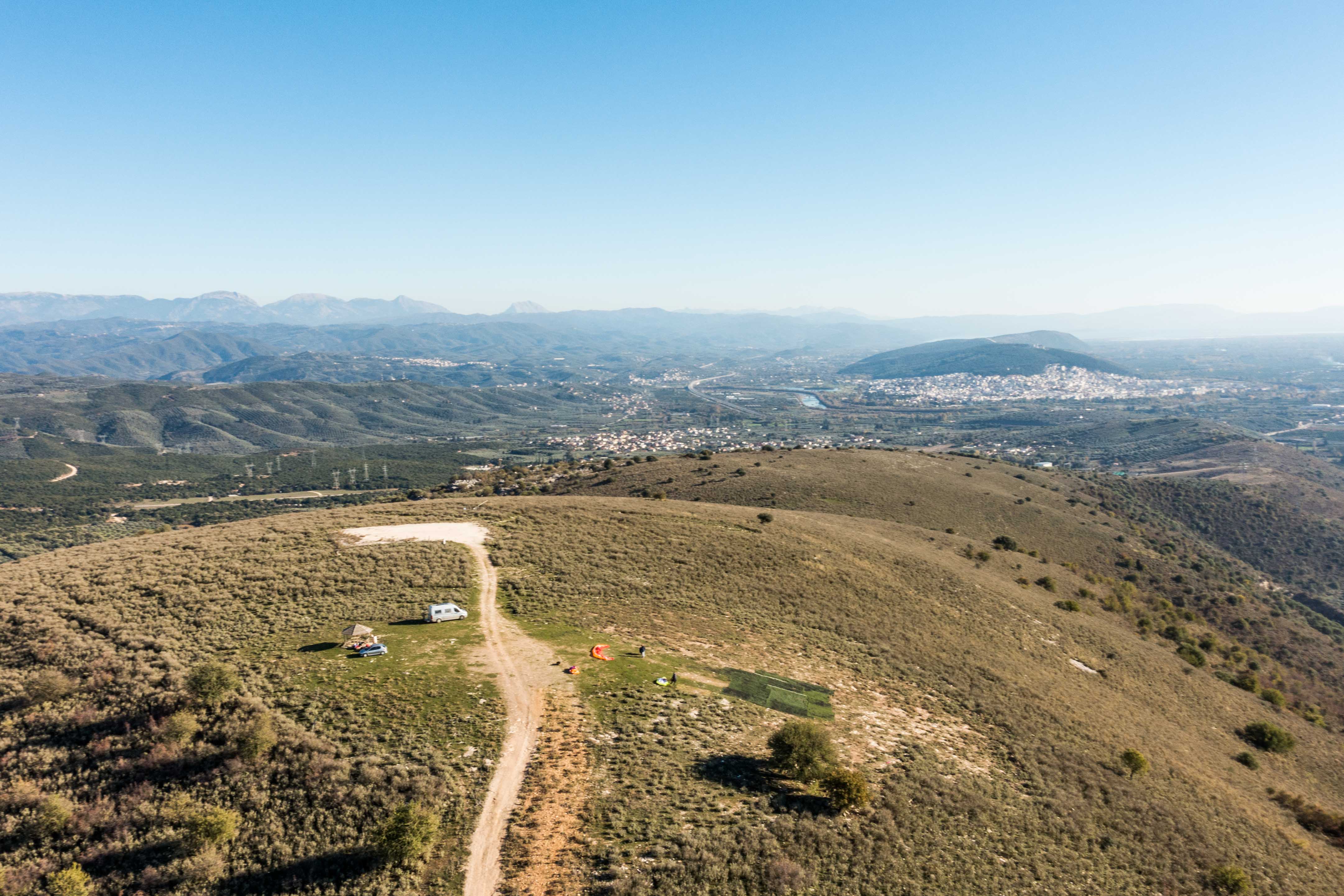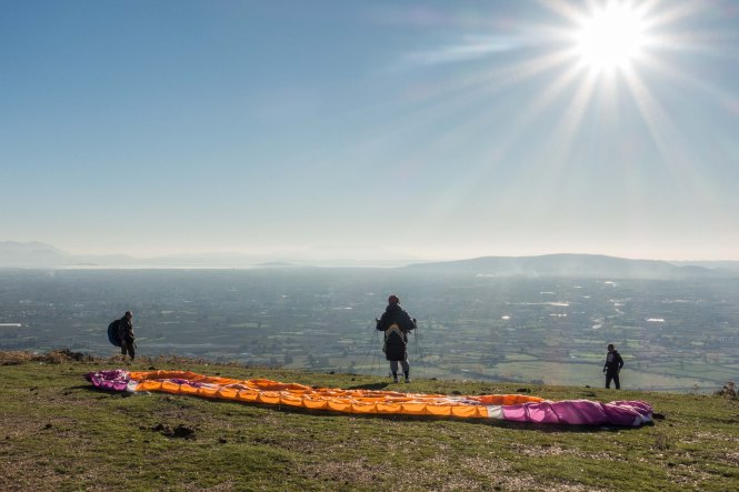 Am Strand von KANALI gibt es einen kleine Hügel, der sich wunderbar zum Spielen mit dem Gleitschirm eignet. Der Seewind steht perfekt an, so dass sogar ein paar Hüpfer mit kleinen Kurven gelingen. Kostas, ein griechischer Gleitschirmlehrer, kommt mit einigen Schülern zum Üben vorbei. Er gibt uns den Tipp, die nächsten Tage nach CHANOPOULO zu fahren, der Wind würde perfekt passen und wir könnten am Startplatz mit unserem Dicken übernachten. Nachdem das Starten, trotz langer Pause, immer noch gut gelingt, fahren wir das Stück ins Landesinnere. Sofort gefällt uns der Platz. Wir stehen auf 333 m Höhe mit fantastischem Rundumblick. Kurz nach Mittag setzt sich der Seewind durch und schafft wunderbar angenehme Flugbedingungen. Kostas kommt wieder mit ein paar Schülern und braucht Jemanden zur Hilfe am Start, er muss am Landeplatz stehen. Ob ich nicht helfen könnte? Die Verantwortung zu Übernehmen ist aufregender als selbst zu Fliegen. Am Vortag schaffte es der eine Schüler trotz Fluglehrer nach ungezählten Startversuche nicht in die Luft zu kommen. Nun soll ich das schaffen. Aber, siehe da, bereits der zweite Start gelingt und er ist in der Luft. Was für eine Erleichterung. Aus Angst, zum Hilfsfluglehrer ernannt zu werden, fliege ich los und lande erst, als alle wieder in der Luft sind. Und auch sonst ist es hier oben einfach traumhaft, vom stimmungsvollen Sonnenaufgang bis zum farbenprächtigen Sonnenuntergang. Doch die Wolken zeigen die Wetterveränderung bereits an, ab morgen soll es wieder regnen. Wir werden wieder ein Stück weiter fahren.