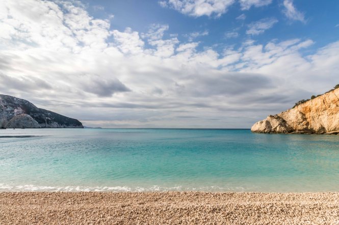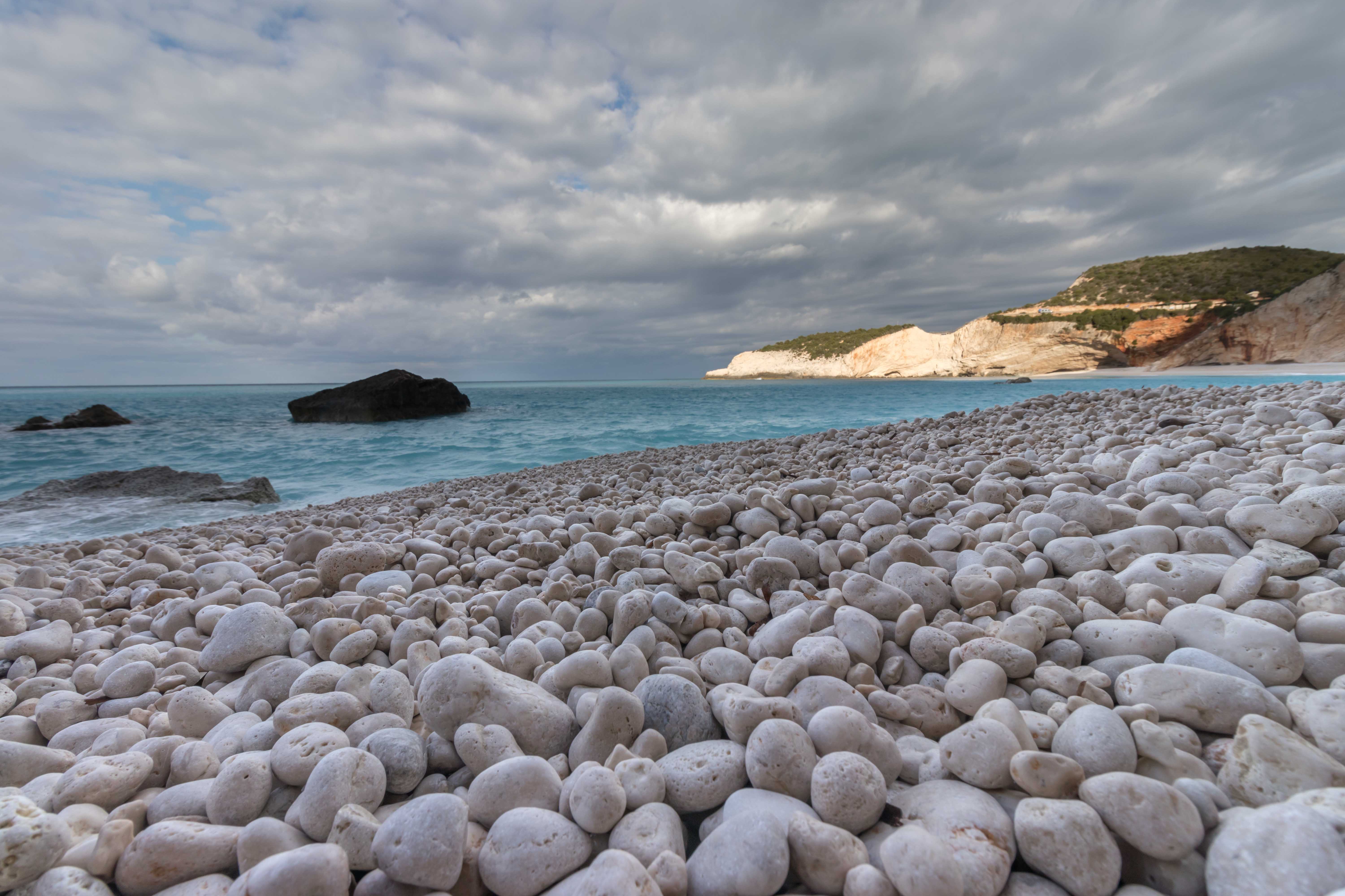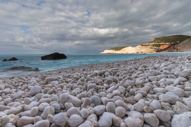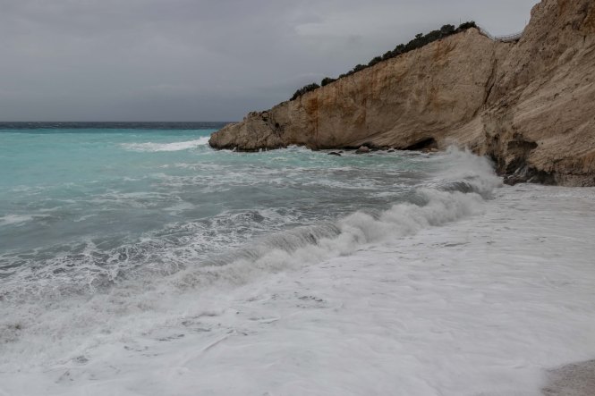 Eine kurvenreiche Straße führt hinunter zum PORTO KATSIKI. Wenn wir es nicht mit eigenen Augen sehen könnten, wir würden es nicht glauben. Es ist einer der schönsten Strände die wir bisher sahen. Unter überhängenden Felsen leuchten weiße Kieselsteine, an die das hell- bis türkisblaue Wasser in kleinen Wellen plätschert. Trotz des frischen Windes können wir nicht widerstehen und hüpfen ins Meer. Unbeschreiblich, und wir sind ganz alleine. Die großen Parkplätze lassen vermuten, welcher Trubel hier im Sommer herrscht. Wir nutzen einen Wasserhahn und unsere frisch erworbene Tonne zum Wäsche waschen. Peter betätigt sich als Trommelrüttler. Die erste Portion wird im starken Wind und der Sonne sogar trocken, auch wenn das ein oder andere Teil aus den Büschen gerettet werden muss. Am Abend, es ist schon finster, beginnt wieder einmal der Regen.