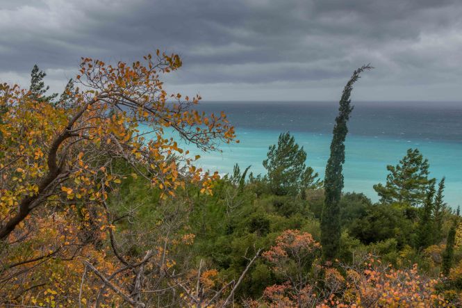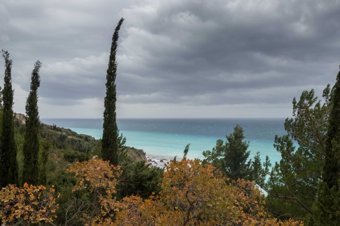 Wir kurven die breite Straße wieder hinauf, lassen die ein oder andere Bucht aus und sparen sie für einen nächsten Besuch früher im Jahr auf. In KALAMITISI probieren wir dann doch die Abfahrt. Viele Kurven ziehen sich, mit Steinen übersät, hinunter. Die bunten Blätter und die frei wachsenden Zypressen (ganz anders in der Toskana, wo sie in Reih und Glied stehen müssen) geben einen tollen Kontrast zum blauen Wasser und dem grauen Himmel. Die Bucht ist kilometerlang, kein weiterer Besucher ist hier, sonst gibt es nur ein paar verlassene Imbisshütten. Wieder ein traumhafter Ort zum Verweilen. Doch der Südwind hebt uns fast von den Beinen, unser Kopf fühlt sich wie beim bekannten bayerischen Föhn an. In KATHISMA finden wir einen etwas ruhigeren Platz am Strand, der zwar etwas zugebaut und verschandelt ist, doch breit genug, damit uns die Wellen nicht erreichen. Gegen Abend suchen wir den Windschatten einer Taverne auf. Die Wellen schlagen weiter mit Macht und Getöse auf den Strand, ans Baden denkt nicht einmal der Peter.