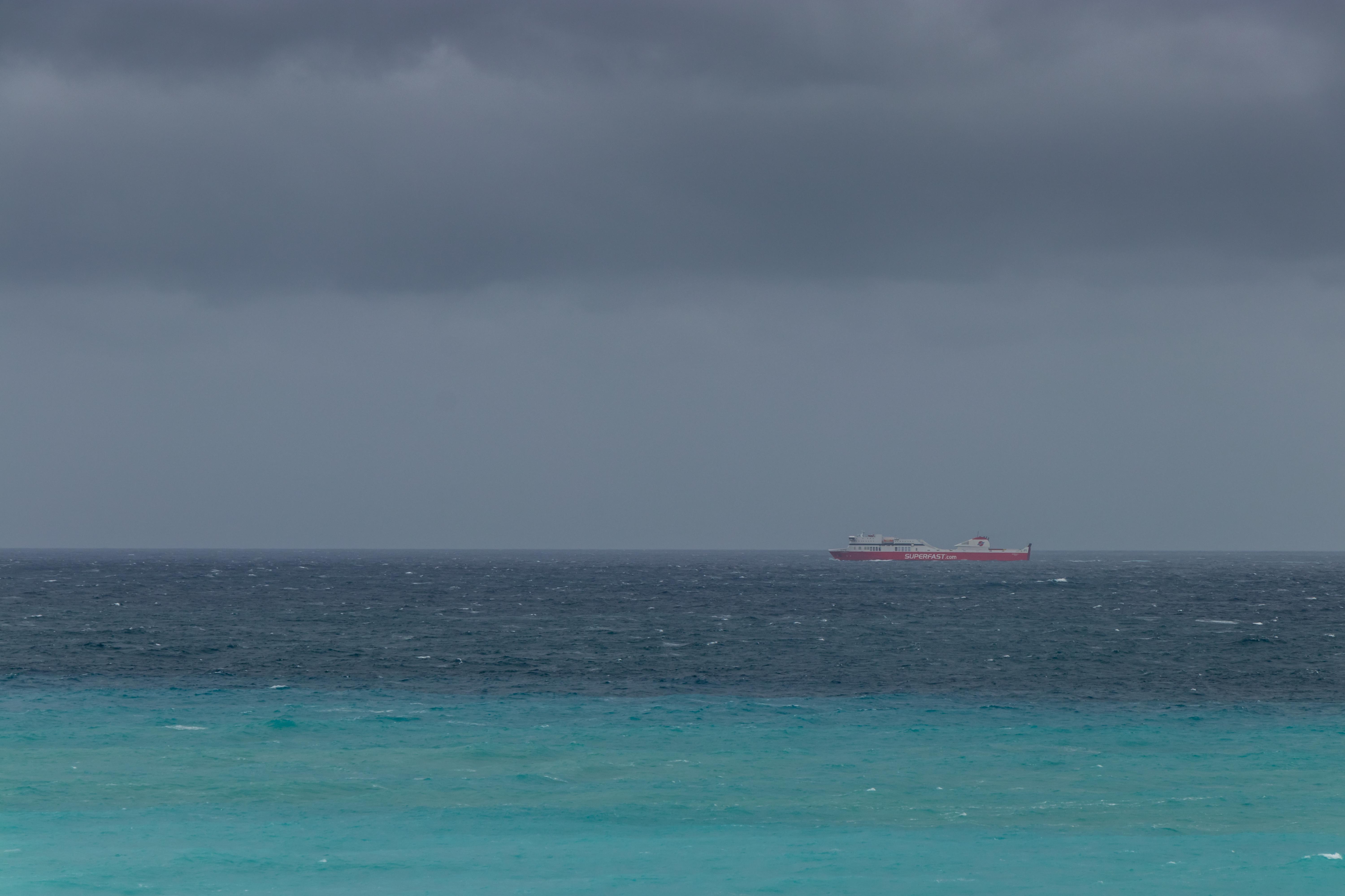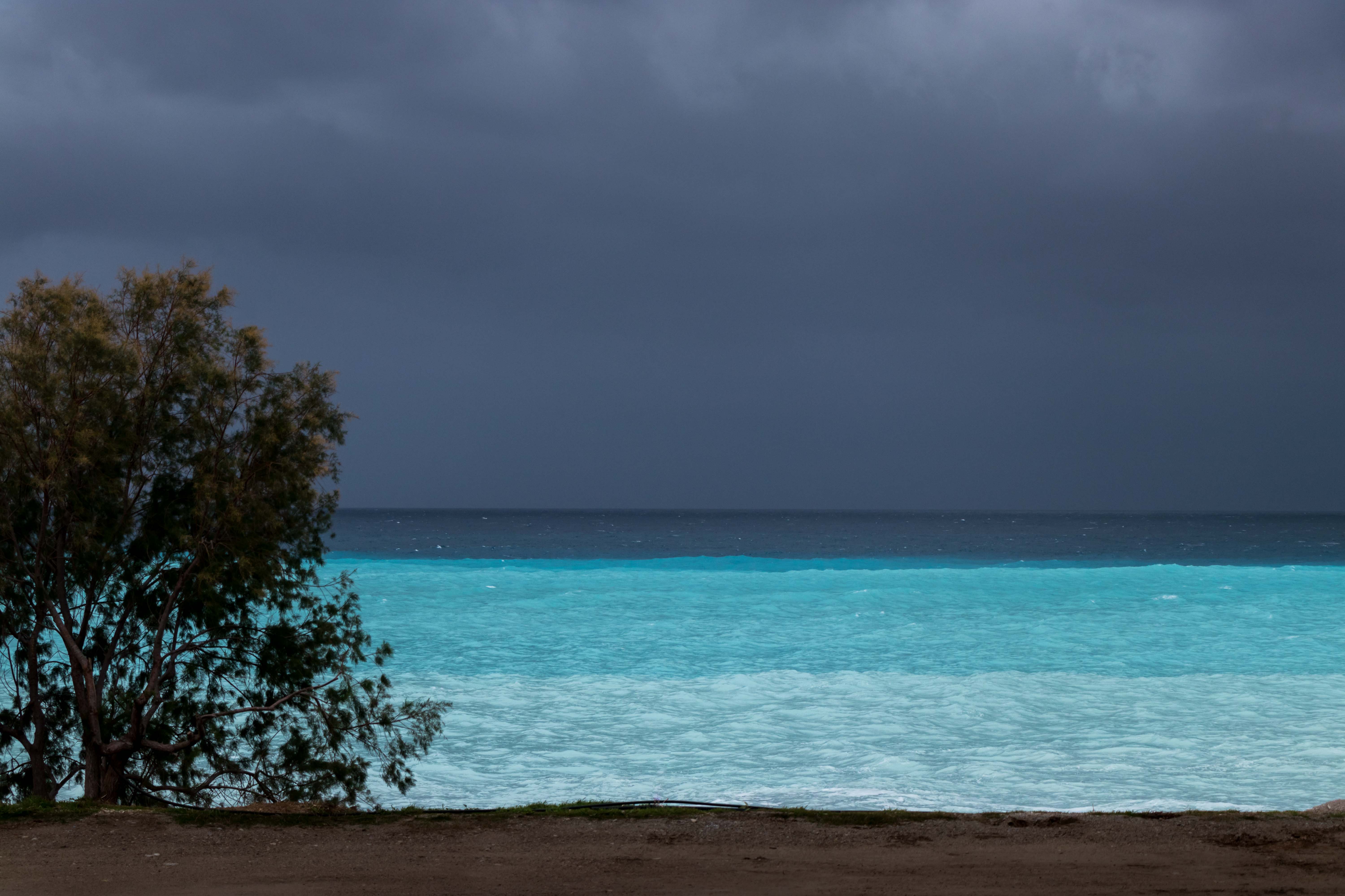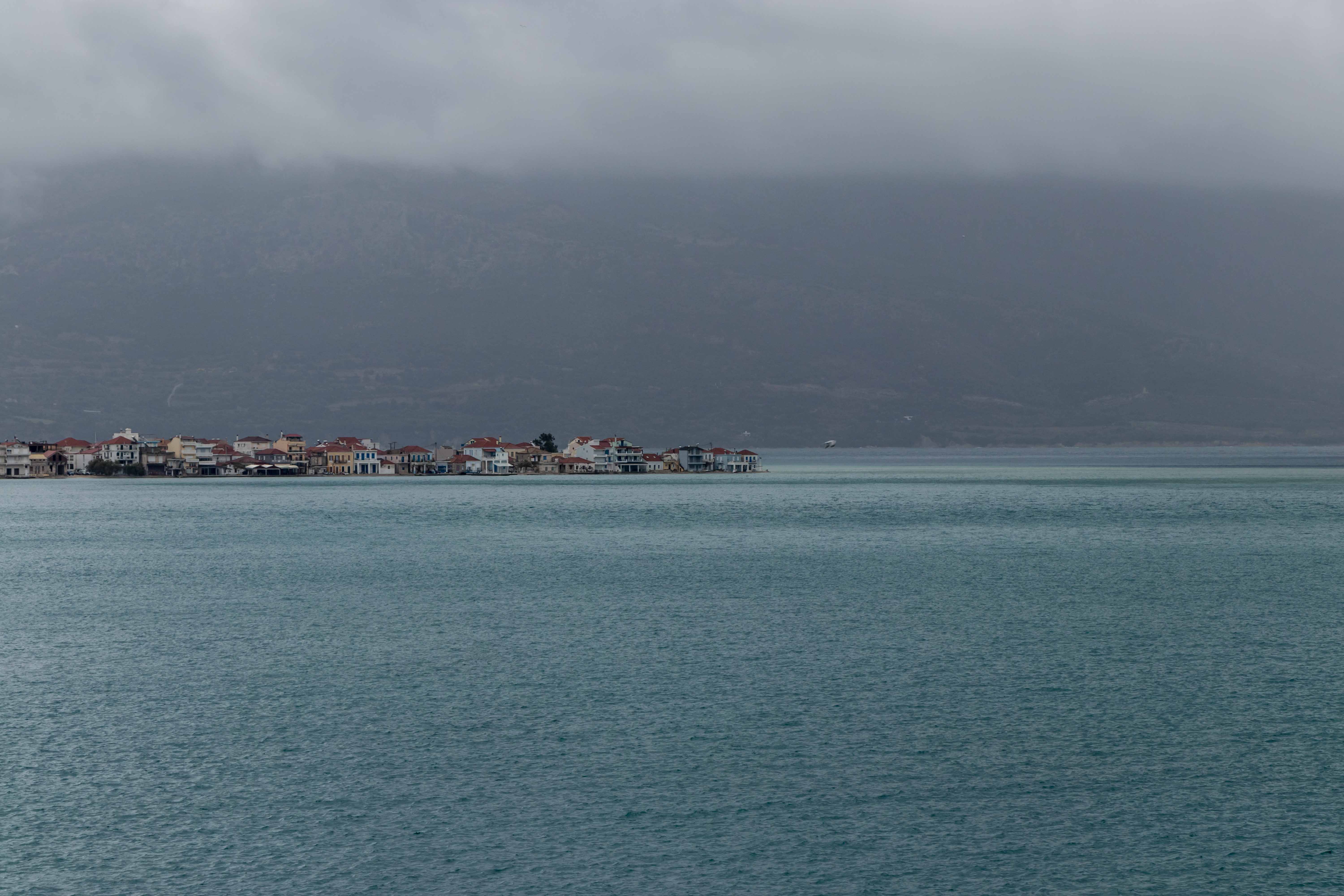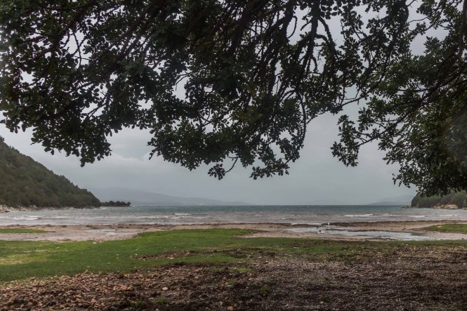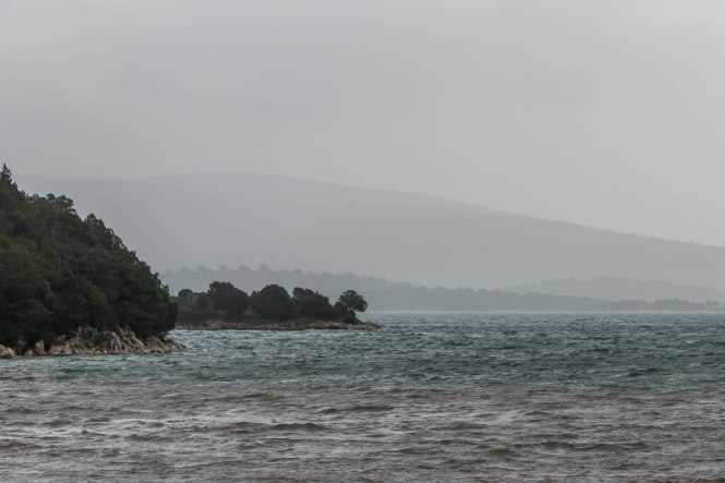 Obwohl der Himmel schwarzgrau ist, leuchtet das Wasser am nächsten Morgen immer noch in unterschiedlichen Blautönen. Da für die nächsten Tage weiterhin Regen und viel Wind vorhergesagt ist, ziehen wir wieder ein Stück weiter.