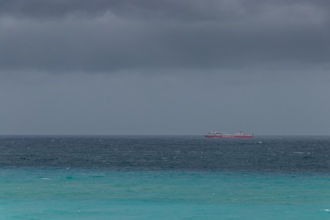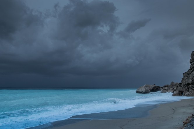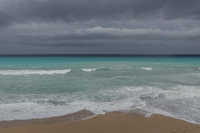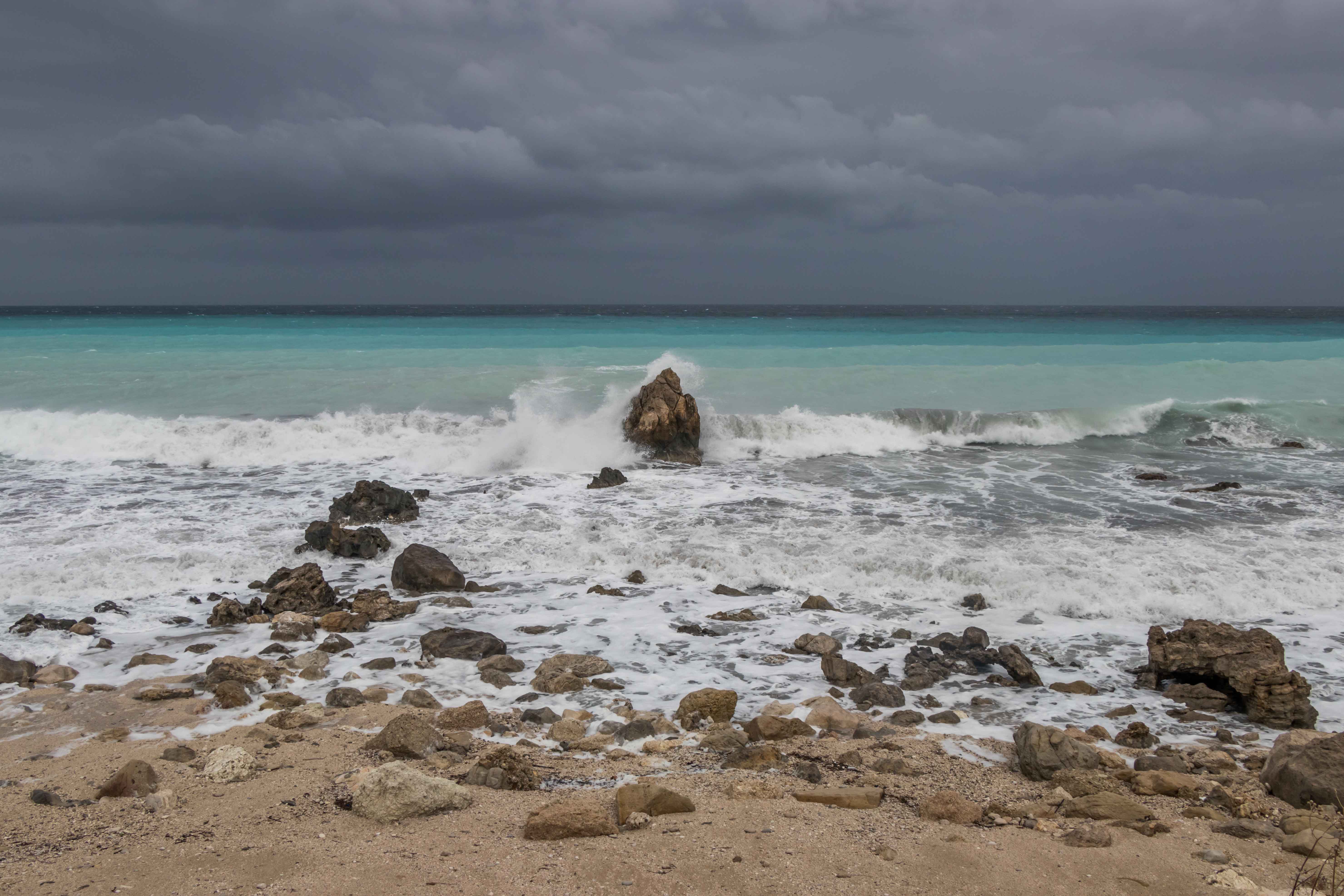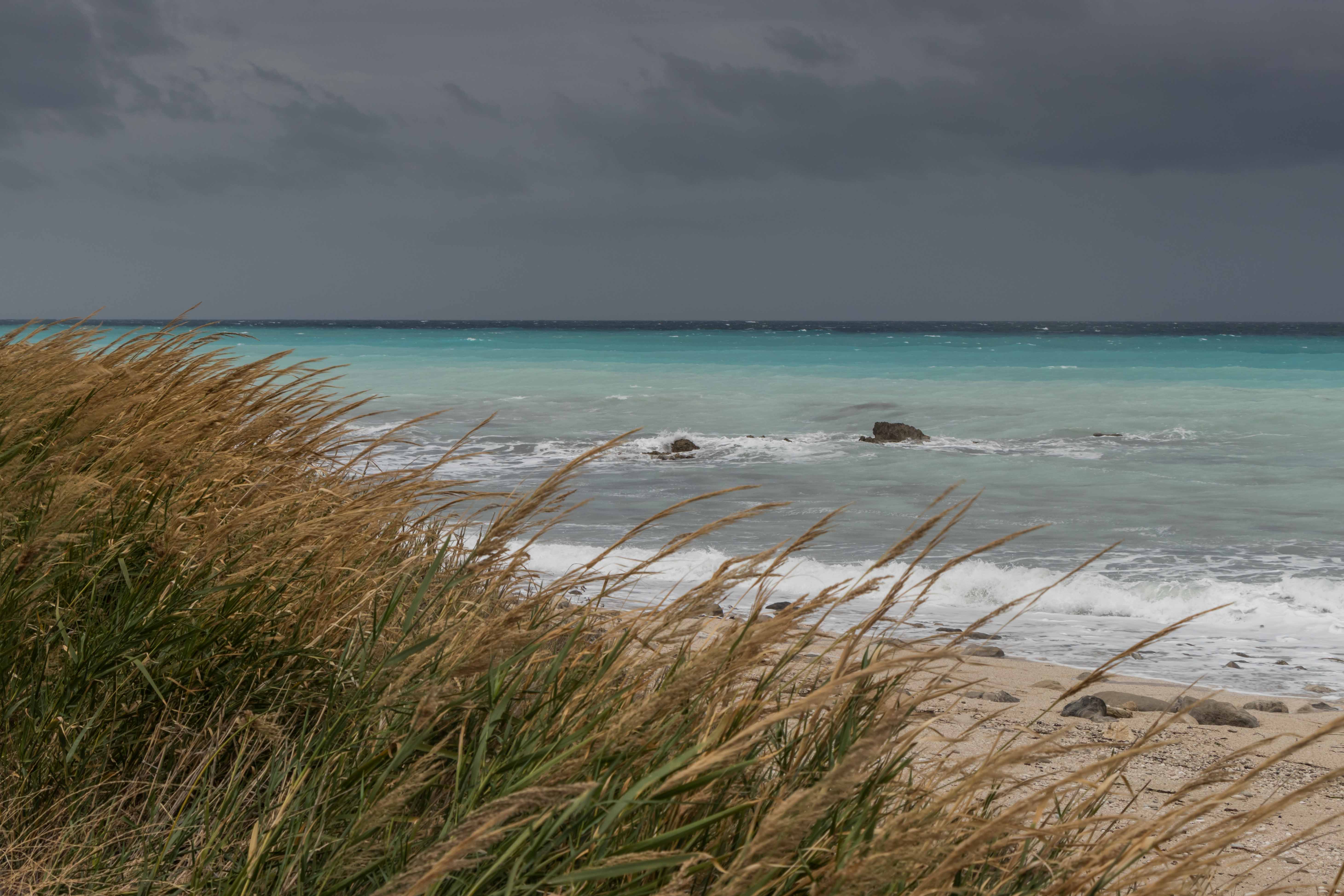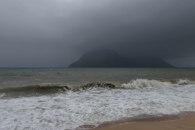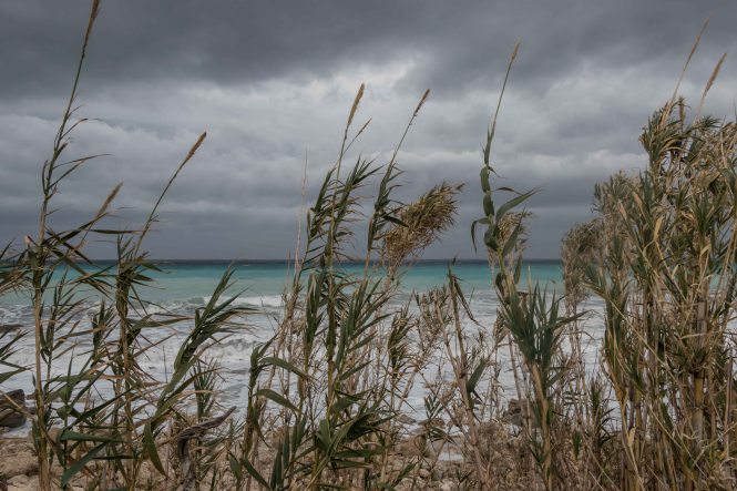 In der Nacht haben wir hinter einem kleinen Haus Zuflucht vor dem auffrischenden Südwind gesucht. Als wir im ersten Licht aufwachen ist bereits 17 Grad warm, später steigt das Thermometer auf 22 Grad. Der Himmel zeigt sich im dunklen Grau, das Meer ist aufgewühlt und der Strand von den hohen Wellen fast überspült. Gut, dass wir gestern in dem fantastischen Wasser noch schwimmen waren. Wir hätten etwas versäumt.