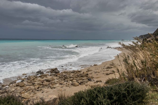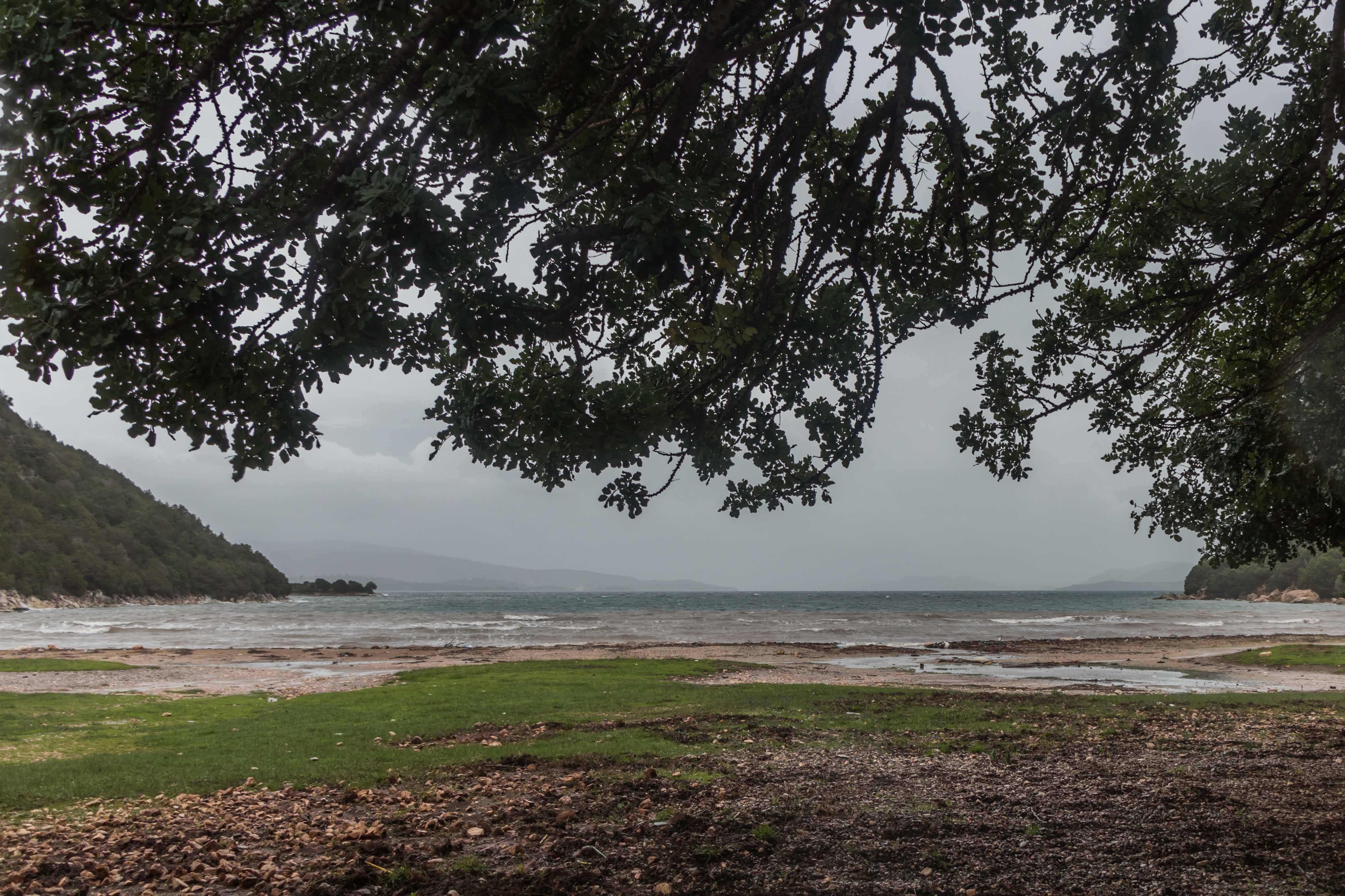 Dann erreichen wir MITIKAS, an dessen Strand sich Peter vor 29 Jahren mit Freunden traf. Da wir zu unterschiedlichen Zeiten von zu Hause los fuhren, mussten wir uns irgendwie verständigen. Es gab zu dieser Zeit keine Handys (unvorstellbar). Also wie macht man das? Ich rufe um 11:55 Uhr einen Freund in Nürnberg an und gebe unsere Position durch. Mein mich suchender Freund machte fünf Minuten später einen Vorschlag für einen Treffpunkt und weitere fünf Minuten später wusste ich nach einem weiteren Telefonat den Ort. Wir schmunzeln heute noch darüber. Nachdem in MIDIKAS der schmale Strand von hohen Wellen überspült ist und uns der Südwind die Gischt um die Ohren weht, ziehen wir ein Stück weiter. Kurz von ATAKOS führt eine breite Teerstraße zu einer schönen Bucht mit einzelnen mächtigen Bäumen, bei Sonne ein bestimmt idyllischer Badeplatz.