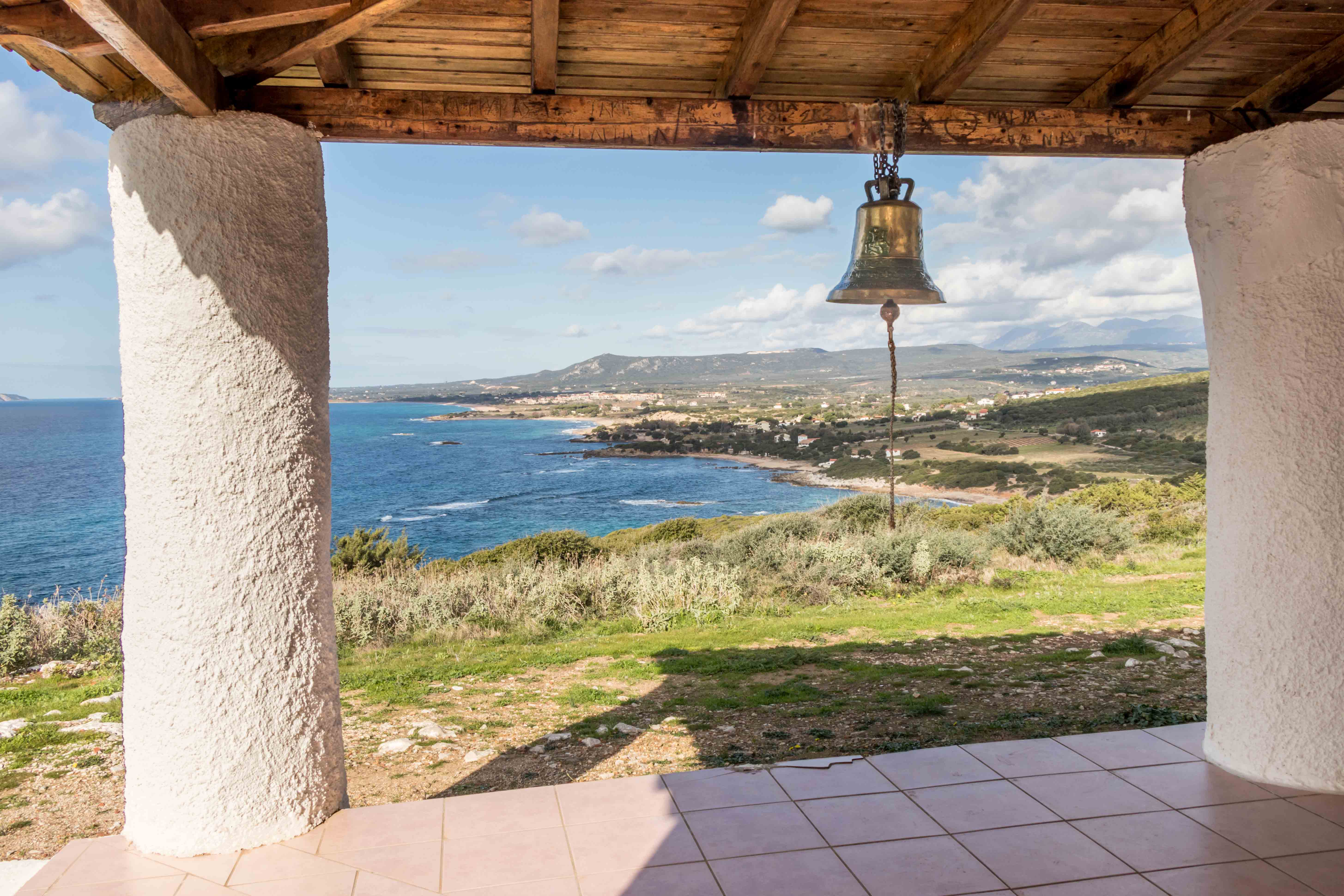 Eine einsame und wunderschöne Bucht reiht sich wieder einmal an die andere. Wir entscheiden uns für den weiten Strand in der Nähe von ROMANOS. Peter will sich wieder einmal auslaufen und wandert den weiten Buchten entlang nach Süden. Lange geht es barfuß durch die auslaufenden Wellen, bis eine Piste zu dem kleinen Kirchlein des Propheten Elias hinauf führt. Neben dem Weg liegt das aussichtsreiche Grab des Thrasymedes, einem Sohn des Nestors, der versteckt im Trojanischen Pferd die Tore Trojas öffnete. Heute ist sein Grab leer, seine Knochen von Grabräubern oder Archäologen irgendwohin gebracht. Oben angekommen, präsentiert sich die kreisrunde malerische OCHSENBAUCHBUCHT und die geschichtsträchtige BUCHT VON NAVARINO. Hier fand am 20. Oktober 1827 die letzte große Seeschlacht ausschließlich mit Segelschiffen statt. Eine alliierte englische, französische und russische Flotte stand einer türkischen, ägyptischen und tunesischen Flotte gegenüber. Die Alliierten hatten zwar weniger Schiffe, aber die besseren Kanonen und versenkten drei Viertel der türkischen und ägyptischen Schiffe. Diese Niederlage leitete das Ende der türkischen Vorherrschaft auf dem Balkan und die Entstehung des griechischen Staates ein. Der spätere griechische König Otto aus Bayern ließ später die bronzenen Geschütze bergen und geschäftstüchtig auch in seine Heimat verkaufen. So entstand in MÜNCHEN die Bavaria und der Obelisk am Karolinenplatz, wo Peter lange Zeit sein Büro hatte, aus der Kriegsbeute.