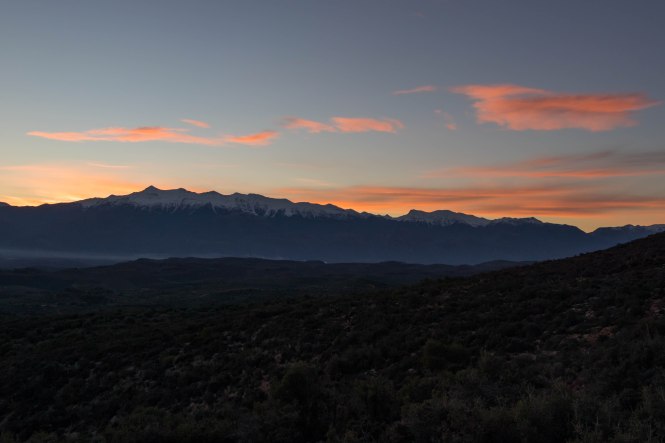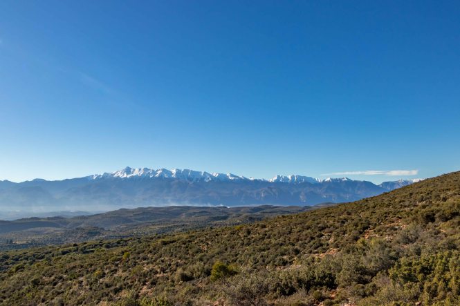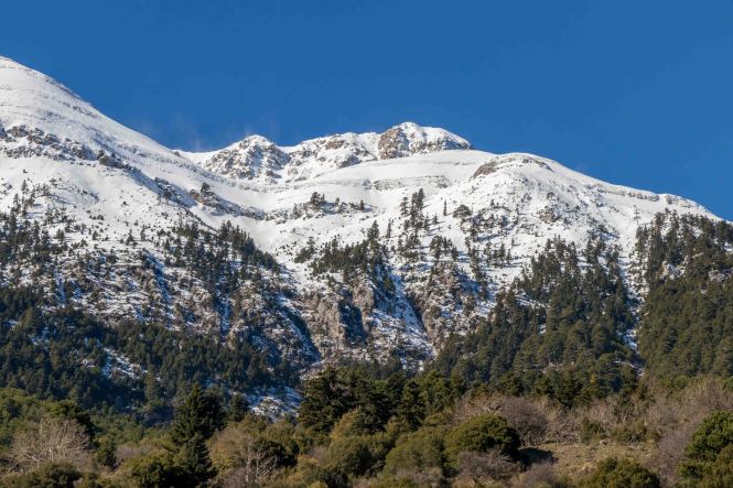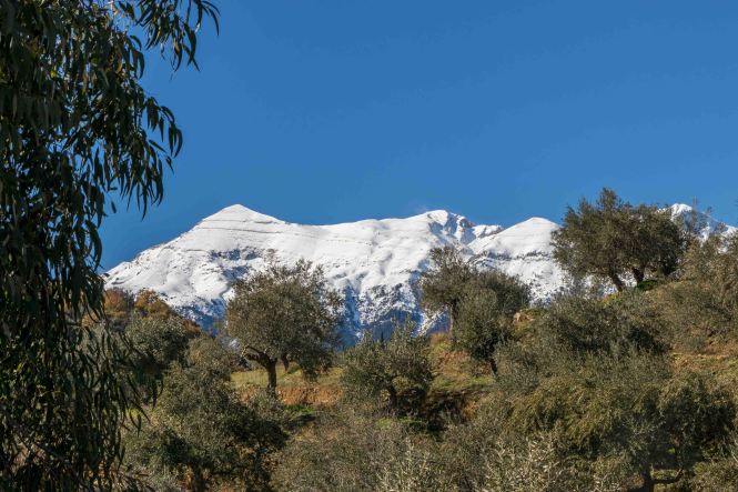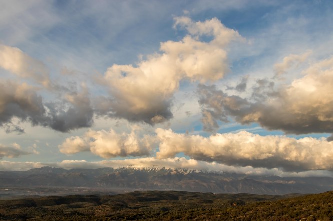 Das warme Wetter nutzend fahren wir ein Stück ins Landesinnere, dem EURATES entlang in Richtung SPARTA. Die vom frischen Schnee bedeckte Bergkette des TAÝGETOS rückt immer näher. Durch kleine Ortschaften und unendlichen Olivenhainen windet sich die gut ausgebaute Straße auf 1000 m hinauf, dem Ausgangspunkt einer Tour zum höchsten Berg des PELOPONNES, dem 2405 m hohen PROFITIS ILIAS. Der Wanderparkplatz ist wunderbar angelegt, eine Brunnen sprudelt munter, ein riesiger Grill wartet auf Fleisch. Hier ist es im Sommer im Schatten der großen Bäume bestimmt wunderbar kühl. Doch heute verschwindet die Sonne bereits mittags hinter dem riesigen Berg. So suchen wir die gegenüberliegende Hügelkette auf und sitzen noch lange in der frühlingshaften Wärme, bis der Vollmond die Sonne am Himmel ablöst. Auch an den nächsten Tagen suchen wir die sonnigen Westhänge auf und genießen die Wärme und das fantastische Panorama. Nachts erleuchtet der Vollmond die weißen Berge.