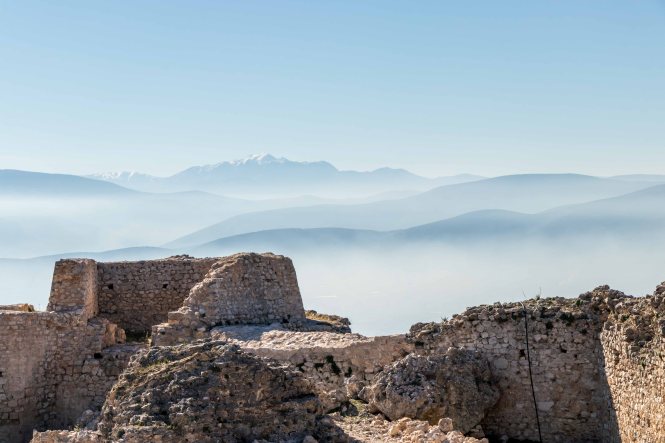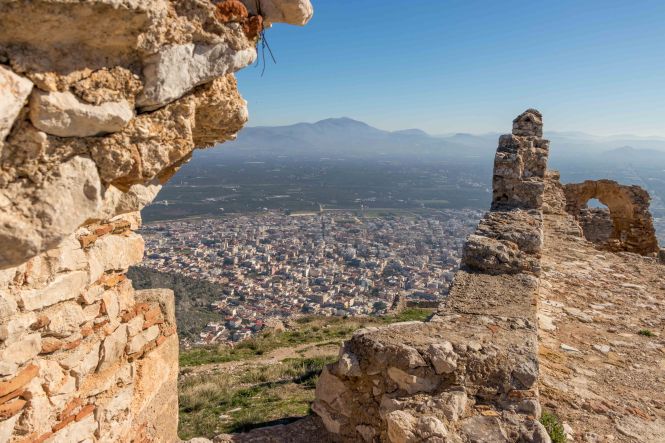 Um nicht wieder im Nebel aufzuwachen, fahren wir knappe 300 Höhenmeter hinauf zur Festung Lárissa. Die in letzter Zeit mit 1 Mio. € renovierte Burg, auch EU-Mittel sind dabei, ist wieder zugänglich. Auf antiken Fundamenten erbauten Byzantiner im 10. Jh. die Burg in der heute noch erhalten Form. Da der Blick von hier auf den ARGOLISCHEN GOLF und in die schneebedeckten Berge so grandios ist, richten wir uns gleich für den restlichen Tag ein.