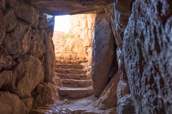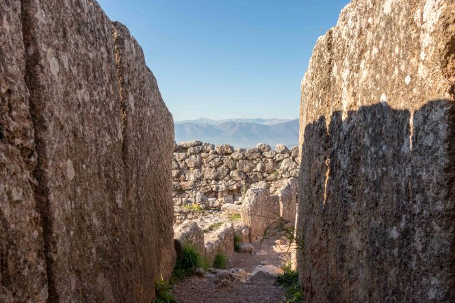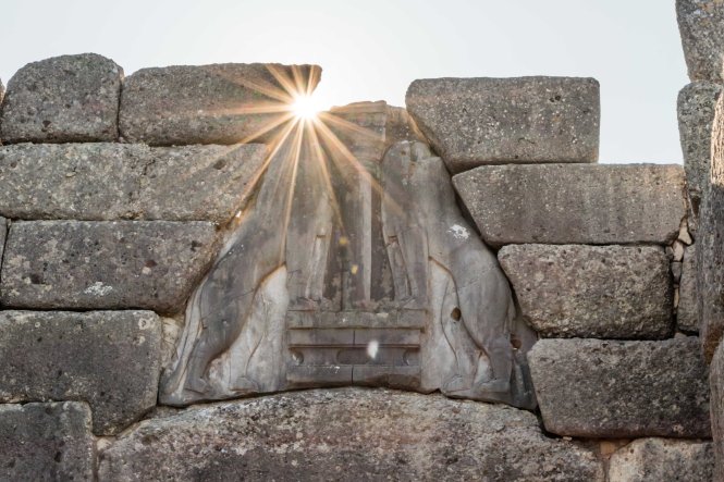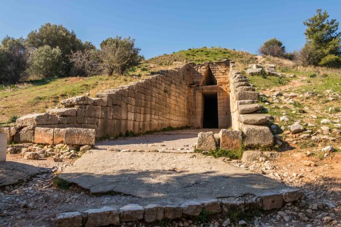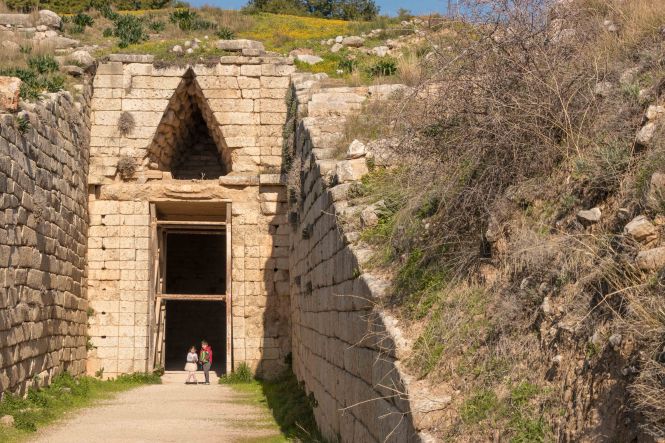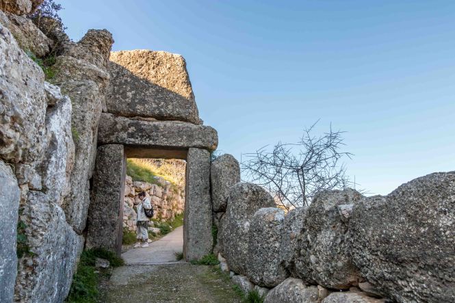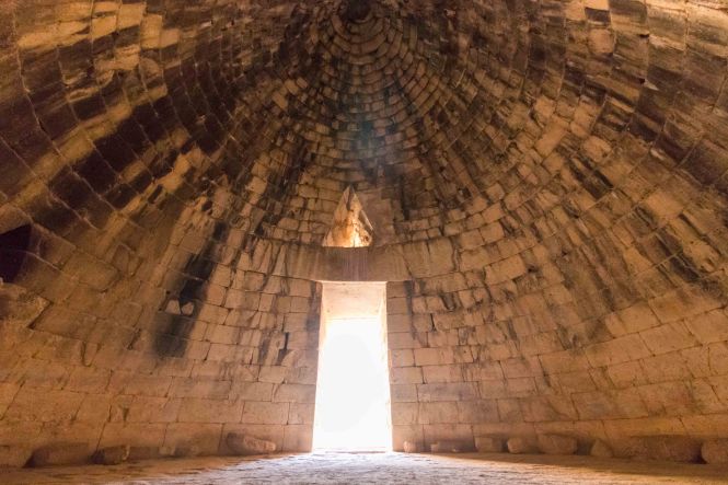 Dann kommen wir nach MYKÉNE, der Heimat des „Völkerfürsten Agamemnon und des Atreus‘ Sohn“. So betitelt ihn Homer in der Ilias. Wie immer sind wir früh an der monumentalen Festung und lange Zeit die einzigen Besucher. Entlang der Zyklopenmauer kommen wir zum berühmten Löwentor, der ältesten Monumentalskulptur Europas. Es ist uns immer wieder schleierhaft, wie die Menschen diese 20 t schweren Steine nur mit ihrer Muskelkraft nahtlos zusammenfügen konnten. Laut Reisebeschreibung des griechischen Autors Pausanias aus dem Jahre 170 n. Chr. sind die Mauern ein Werk der Kyklopen. Dann ist das ja auch geklärt. Wir schlendern durch die Häuserreste und dem Palast, der bereits 1200 v. Chr. durch einen Brand zerstört wurde. Am Nordostende liegt eine 12 m tiefe Zisterne, die von der Perseia-Quelle gespeist wird. Agamemnon selbst hatte wenig von seinem traumhaft gelegenen Wohnsitz. Auf Drängen seiner Mannschaft opferte er seine Tochter Iphigenia, um Artemis, die vorher von ihm verärgerte Göttin der Jagd, freundlich zu stimmen. Nach der langen Schlacht um Troja wieder nach Hause zurückgekehrt, ermordeten ihn seine Frau Klytämnestra und deren Geliebter Ägisth in der Badewanne, die wir jedoch vergeblich suchen. Die über 3000 Jahre alten Grabstätten, Schatzhäuser genannt, der beiden Mörder und des Atreus, sind noch gut erhalten. Fast 14 Meter wölbt sich die mit Erde bedeckte Kuppel in 33 Steinringen über uns.