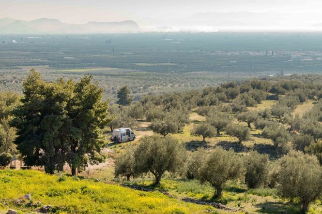 Aber zuerst freuen wir uns über das schon lang anhaltende sonnige Wetter. Blutrot steigt die Sonne aus dem Meer. Doch eines Morgens trauen wir unseren Augen nicht. In der Nacht hat es gefroren, die Wiesen sind voller Raureif und die Griechen kratzen die Autoscheiben frei. Wir fliehen vor dem Nebel und der Kälte auf einen kleinen Hügel und bestaunen die fast winterliche Stimmung.