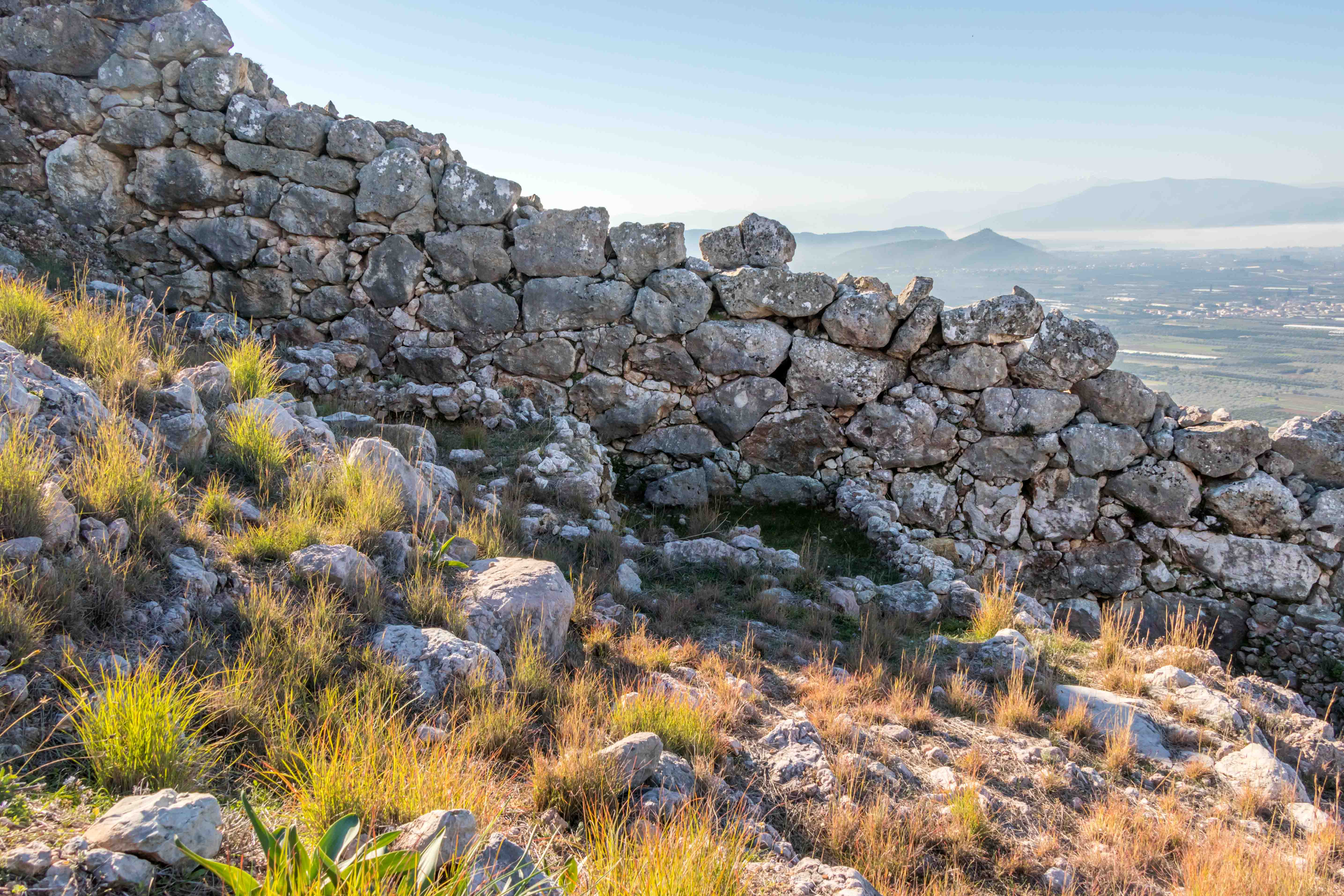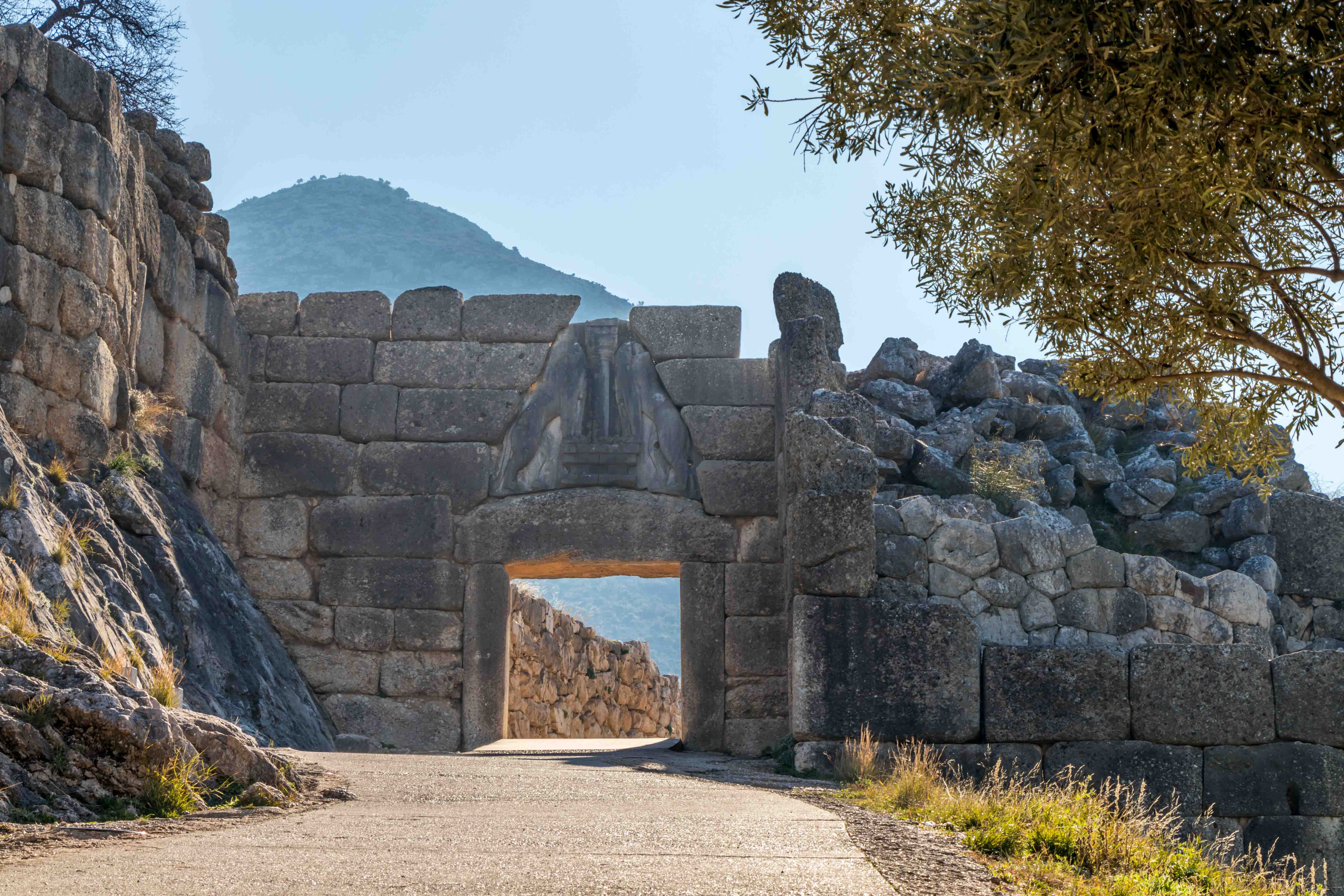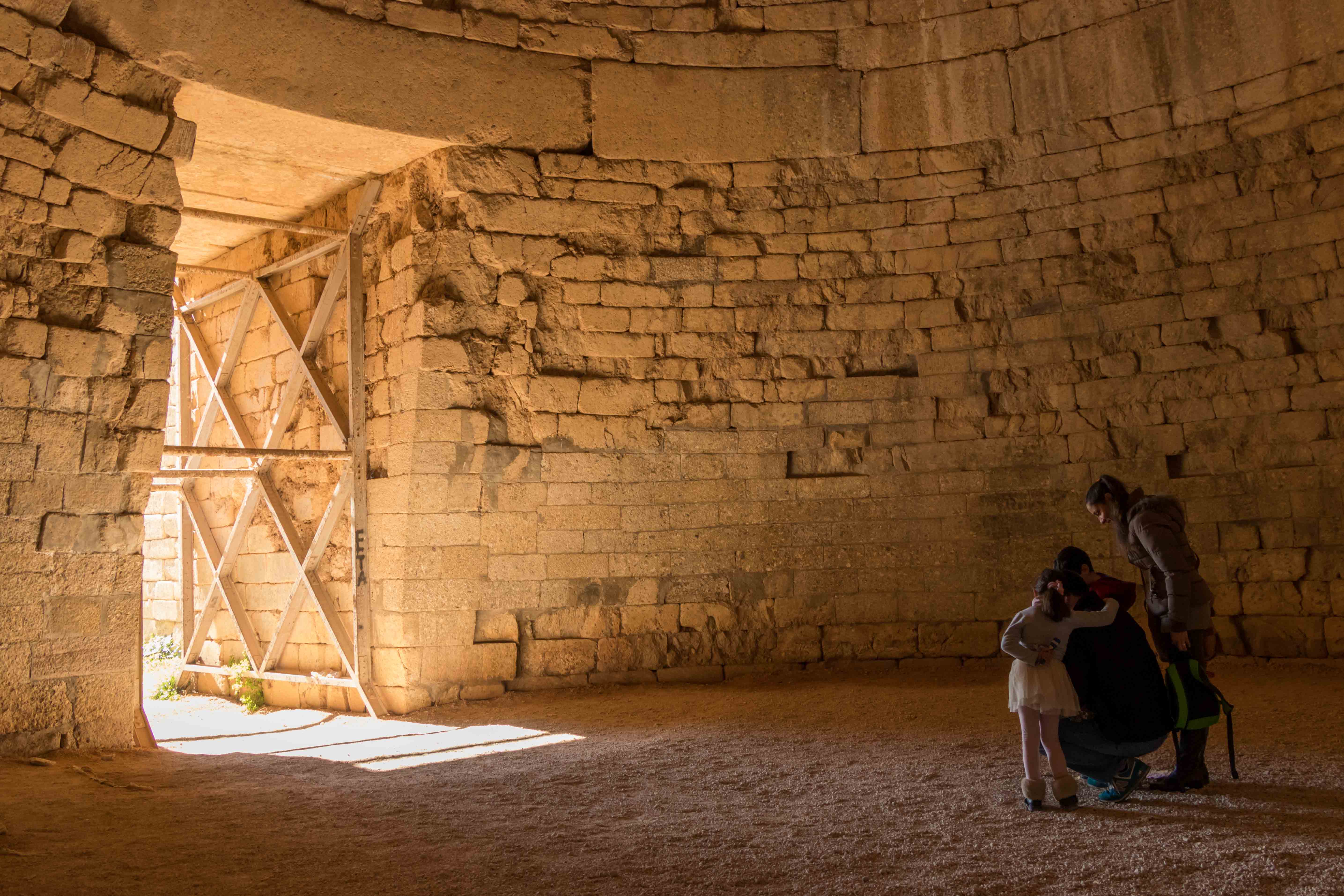 Dann kommen wir nach MYKÉNE, der Heimat des „Völkerfürsten Agamemnon und des Atreus‘ Sohn“. So betitelt ihn Homer in der Ilias. Wie immer sind wir früh an der monumentalen Festung und lange Zeit die einzigen Besucher. Entlang der Zyklopenmauer kommen wir zum berühmten Löwentor, der ältesten Monumentalskulptur Europas. Es ist uns immer wieder schleierhaft, wie die Menschen diese 20 t schweren Steine nur mit ihrer Muskelkraft nahtlos zusammenfügen konnten. Laut Reisebeschreibung des griechischen Autors Pausanias aus dem Jahre 170 n. Chr. sind die Mauern ein Werk der Kyklopen. Dann ist das ja auch geklärt. Wir schlendern durch die Häuserreste und dem Palast, der bereits 1200 v. Chr. durch einen Brand zerstört wurde. Am Nordostende liegt eine 12 m tiefe Zisterne, die von der Perseia-Quelle gespeist wird. Agamemnon selbst hatte wenig von seinem traumhaft gelegenen Wohnsitz. Auf Drängen seiner Mannschaft opferte er seine Tochter Iphigenia, um Artemis, die vorher von ihm verärgerte Göttin der Jagd, freundlich zu stimmen. Nach der langen Schlacht um Troja wieder nach Hause zurückgekehrt, ermordeten ihn seine Frau Klytämnestra und deren Geliebter Ägisth in der Badewanne, die wir jedoch vergeblich suchen. Die über 3000 Jahre alten Grabstätten, Schatzhäuser genannt, der beiden Mörder und des Atreus, sind noch gut erhalten. Fast 14 Meter wölbt sich die mit Erde bedeckte Kuppel in 33 Steinringen über uns.