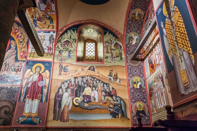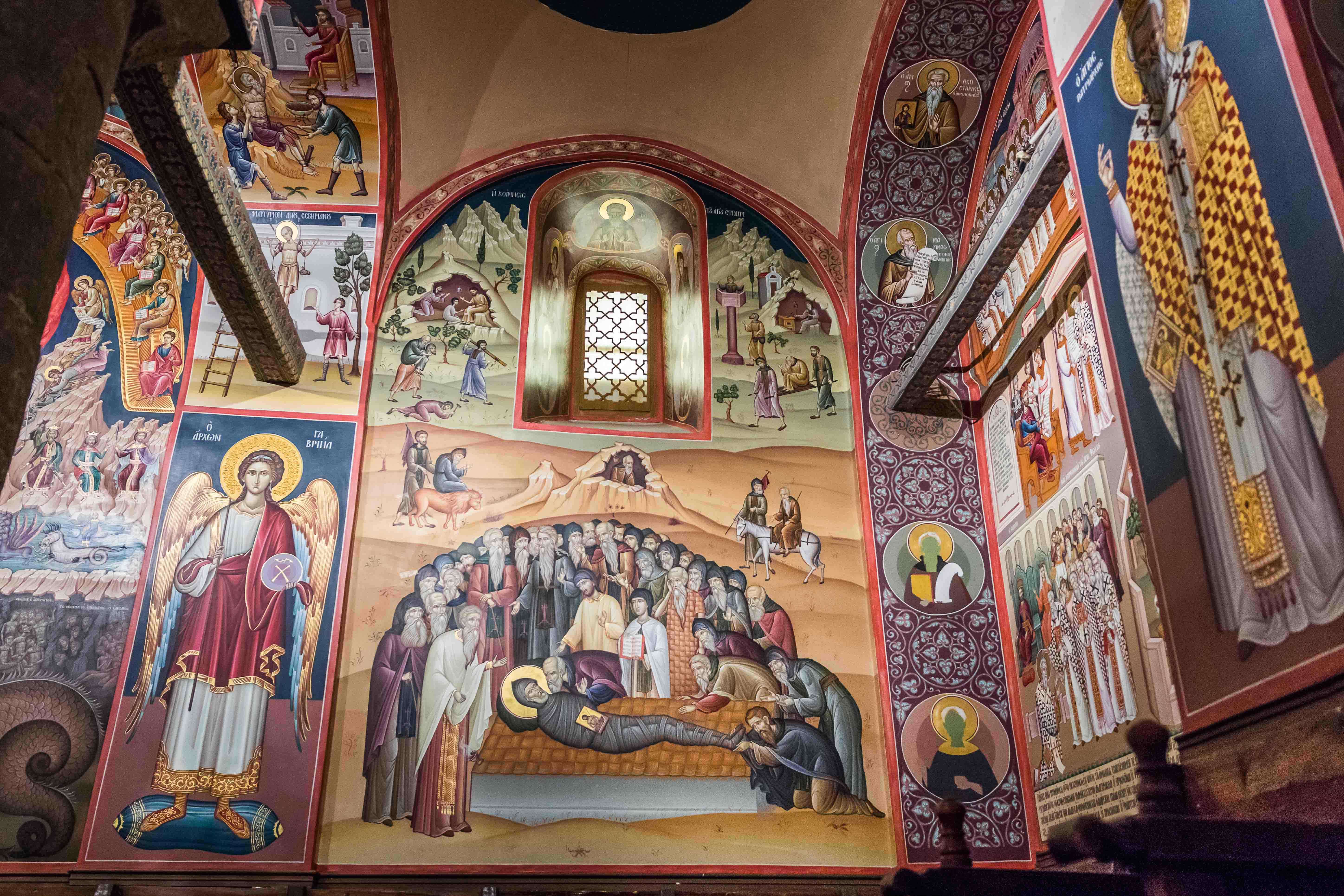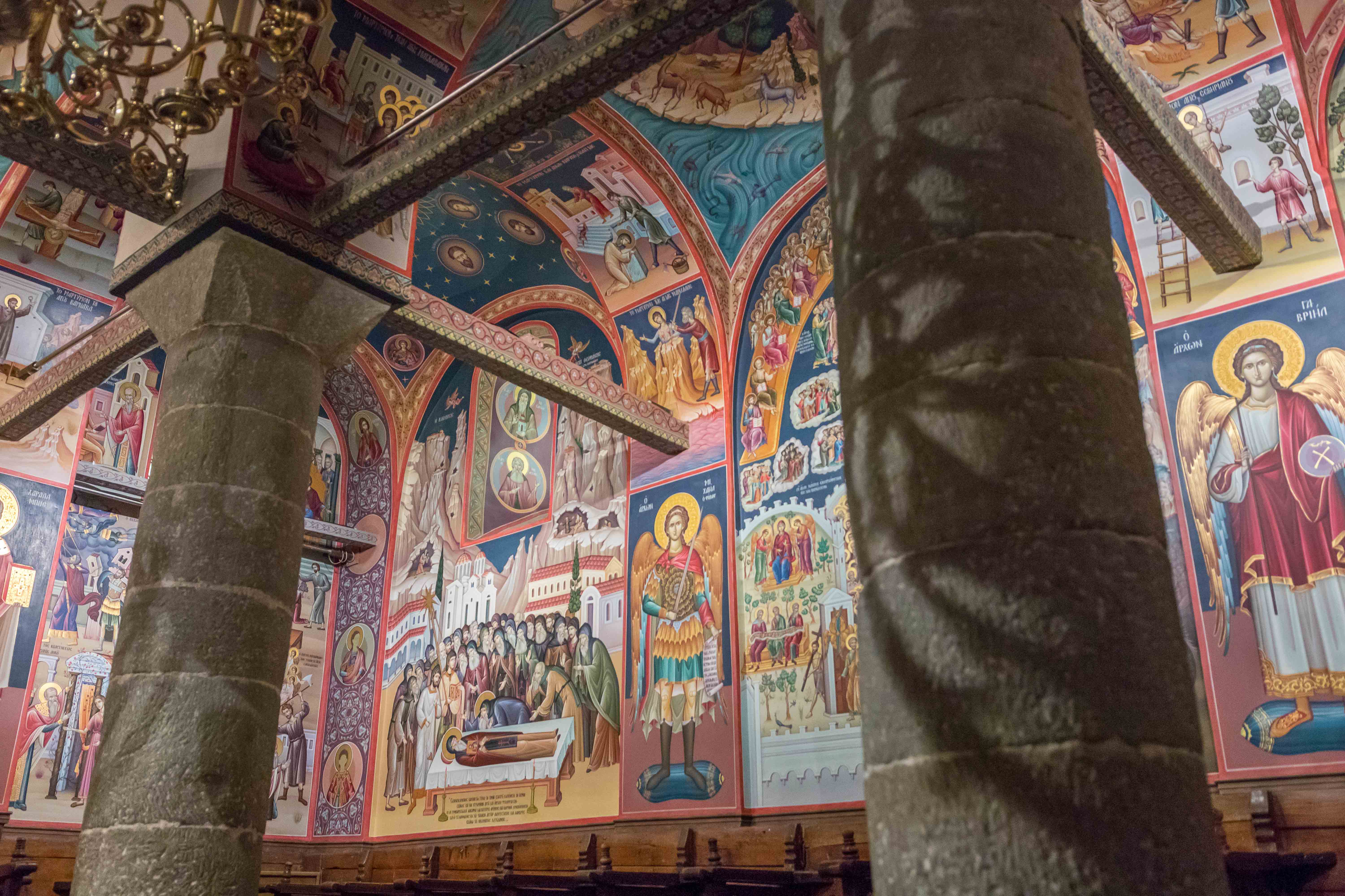 Am nächsten Tag besuchen wir das Kloster ÁGIOS STÉFANOS, ganz am Rande des Steinwaldes mit fantastischen Blick in die THESSALISCHE EBENE gelegen. Susanne wickelt sich schnell noch ein Strandtuch um, damit sie mit langem Rock entsprechend gekleidet ist. Obwohl wir die ersten Besucher sind, strömen bereits zwei Busladungen von Besuchern, eine davon aus dem fränkischen Ansbach, mit uns in das Kloster. So wird es in der überreich und bunt ausgemalten Kirche recht eng. Zwei Restauratoren sind an der Arbeit und malen einem Heiligen seinen Heiligenschein. Der Zirkel wird dem gottesfürchtigen Mann dabei in die Nase gestochen. Dann können wir unseren Augen kaum trauen, ist doch zwischen zwei der Felsnadeln in luftiger Höhe ein Seil gespannt, auf dem gerade ein Mann balanciert und gelegentlich kopfüber daran hängt.