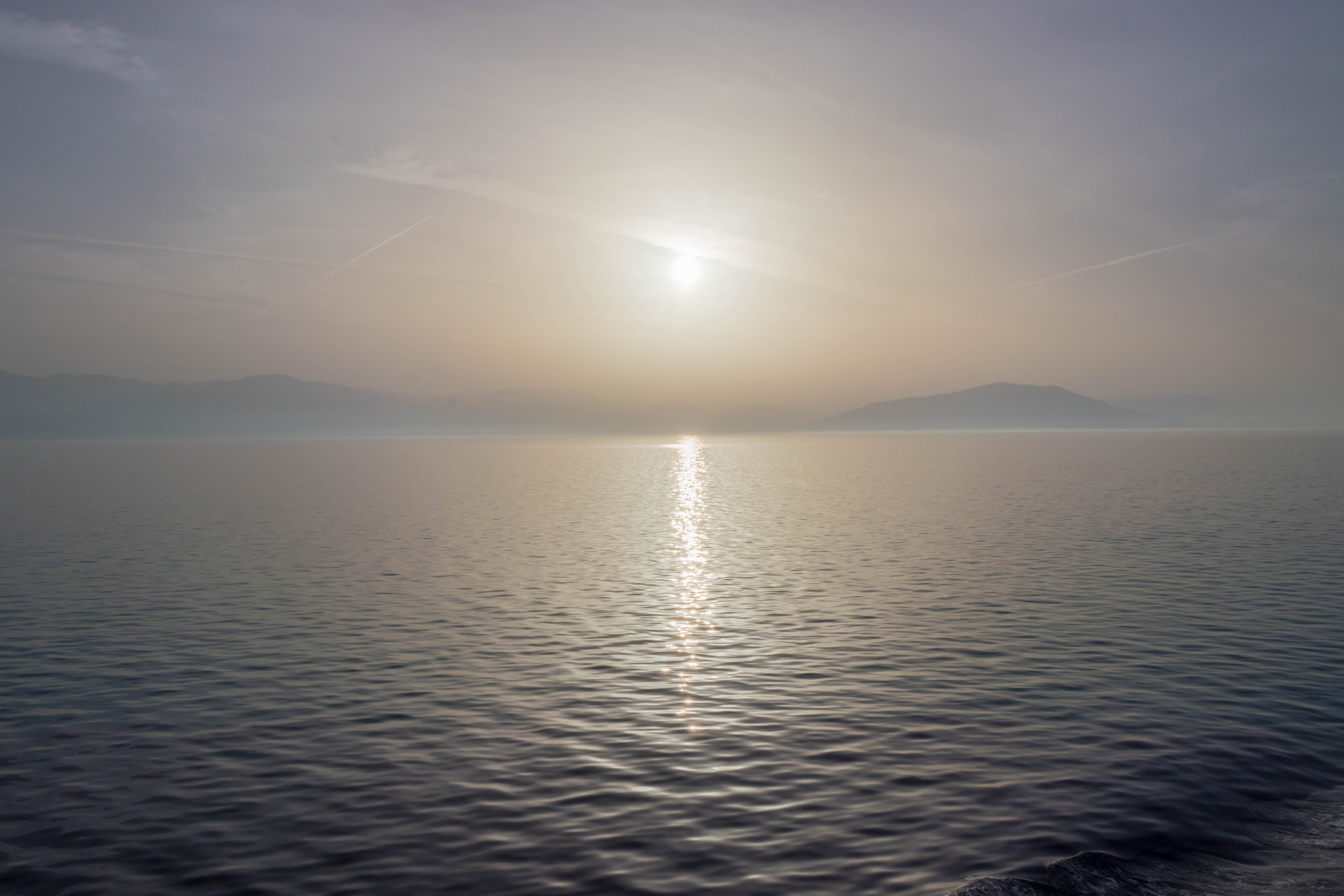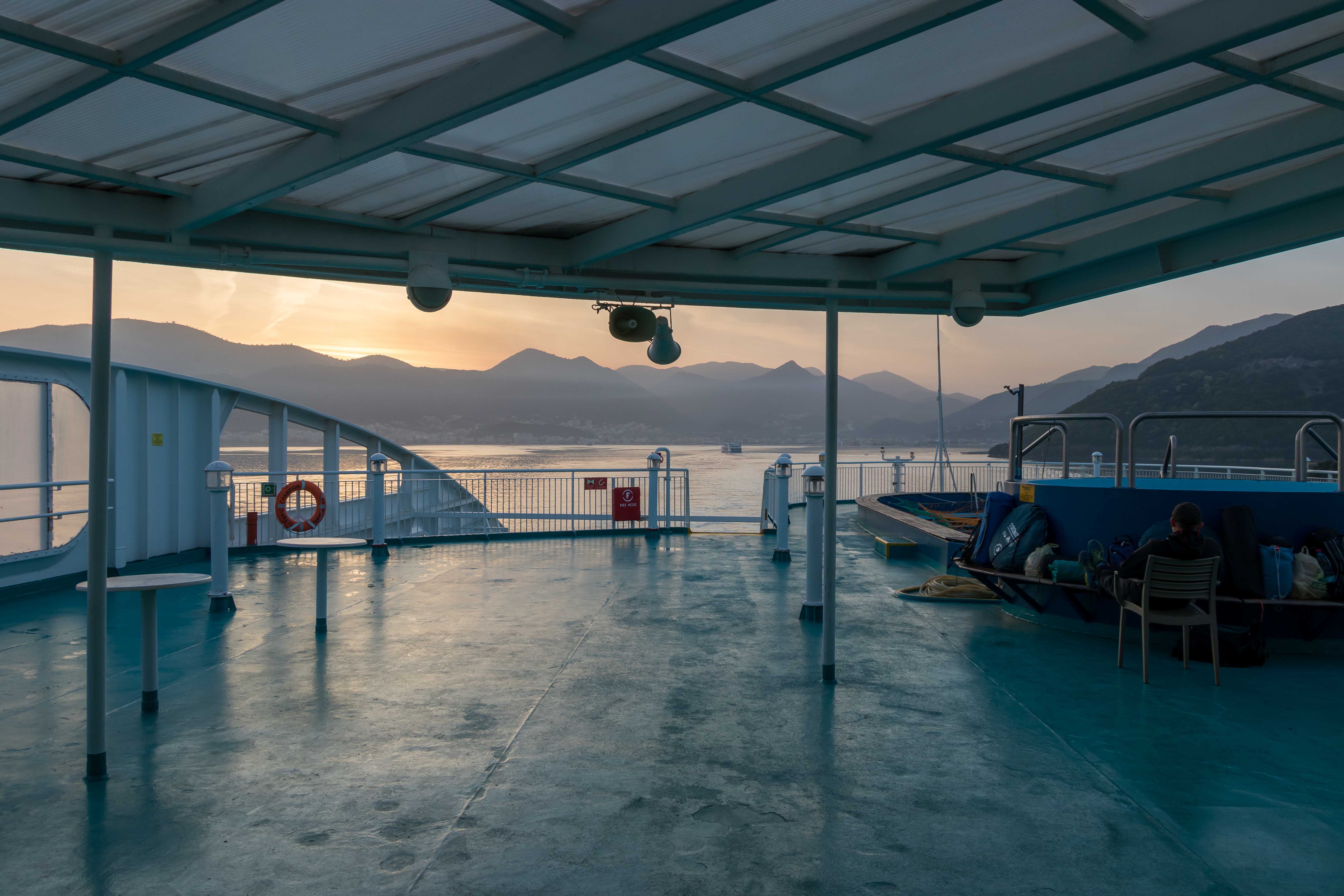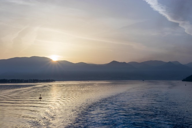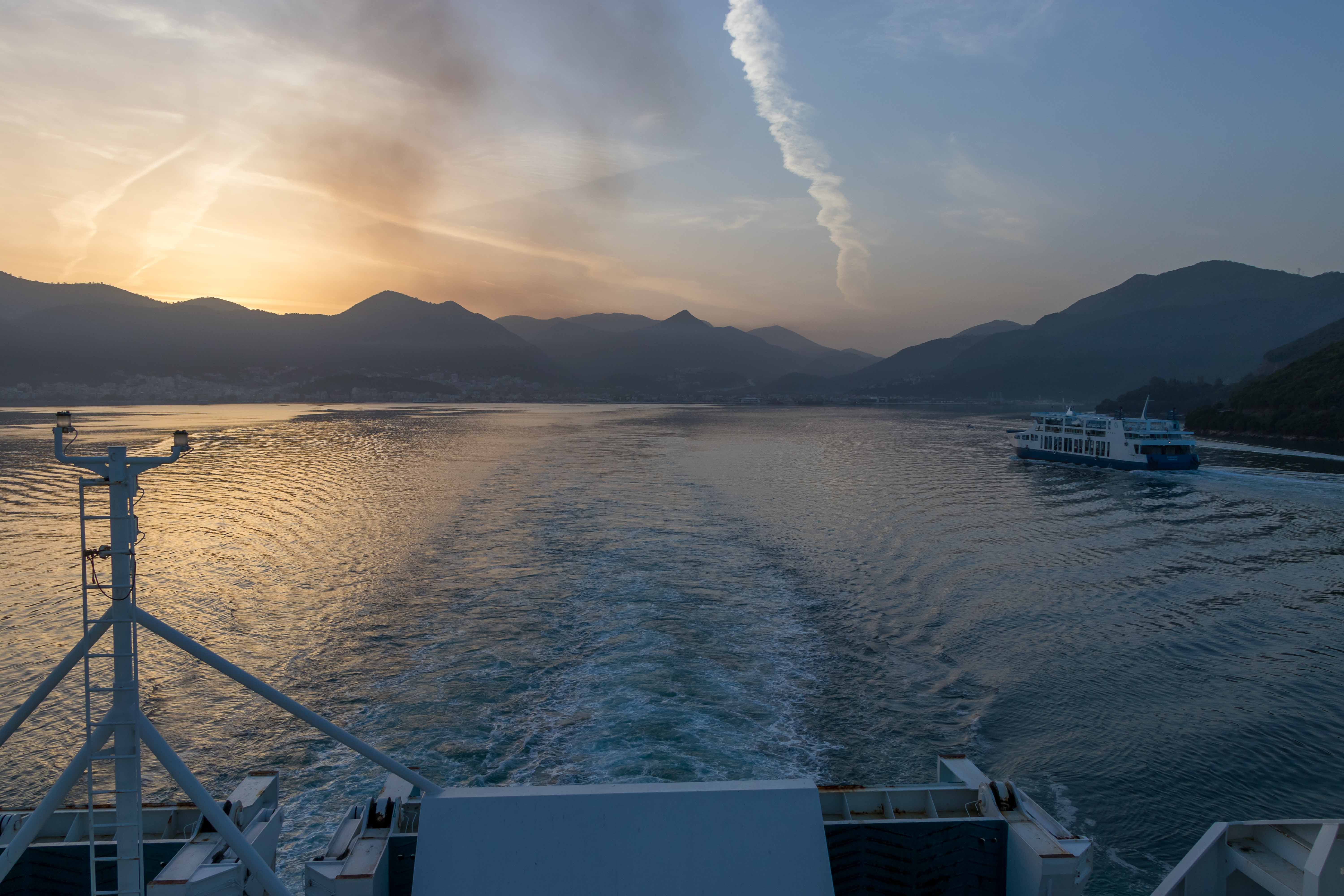 Dann legt auch unser Schiff an, überaus pünktlich, Wir fahren über eine Rampe auf ein halb offenes Deck. Die Einweiser sind hektisch wie immer und zwängen uns zwischen riesigen LKW in die zweite Reihe. Vom Deck aus schauen wir wehmütig zurück in die aufgehende Sonne und Griechenland, das uns gut gefällt und wir vielleicht im Herbst bereits wiederkommen.