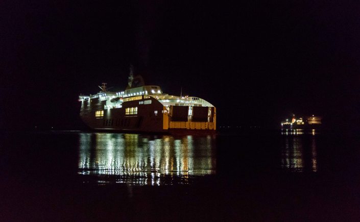 Am 13. Februar, nach 222 Tagen im westlichen Balkan, sind wir in IGOUMENITSA, holen die Tickets im Reisebüro ab und lernen ein wenig die Bürokratie in Griechenland kennen. Nein, in den Hafen können wir noch nicht fahren, da müssen wir morgen um 5 Uhr wieder kommen. Aber einchecken können wir. Die Tickets werden in gleich aussehende andere Tickets umgetauscht und wir bekommen Aufkleber für „OPEN DECK“ und „VENICE“. Am nächsten Morgen schellt um 4:45 Uhr der Wecker, was für ungewohnter Ton. Es ist noch finster als wir losfahren. Susanne muss aussteigen und das Gate für Passagiere nehmen, Peter fährt derweilen mit dem Dicken durch die Grenzkontrolle. Gottseidank finden wir uns wieder. Es sind nur ein paar Wohnmobile und viele LKW hier und warten wie wir auf die Fähre Olympic Champion der Reederei ANEK. Wir kommen ins Gespräch mit einem weitgereisten Ehepaar aus Zürich, das von einer Reise aus den Oman zurückkommt.