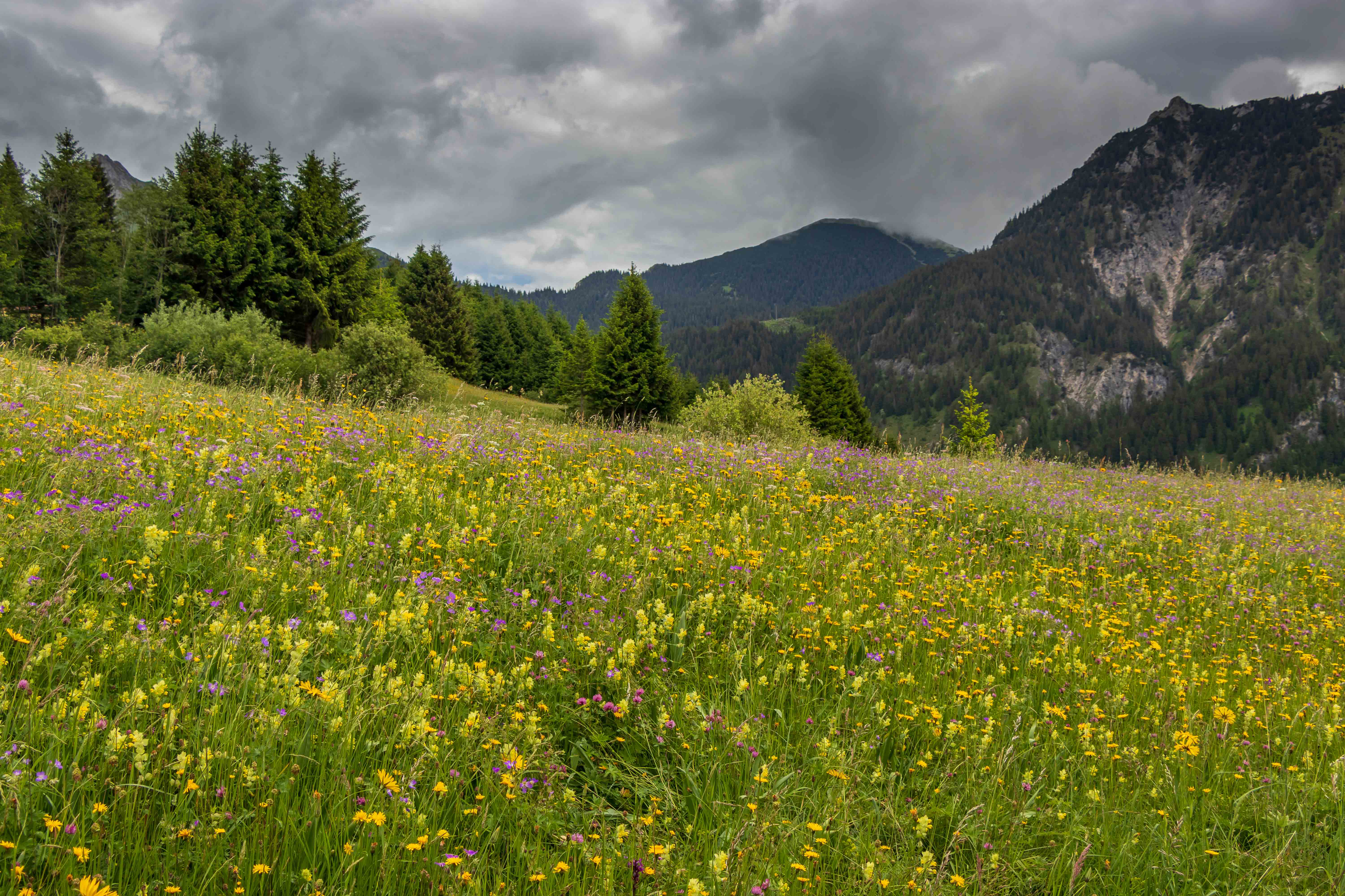 Es ist nun schon wieder einige Zeit her, Ende Mai war es, als wir das TANNHEIMER TAL besuchten. Das Wetter die Tage davor war recht durchwachsen, schwere graue Wolken brachten über den Tag Gewitter und Regen. So hofften wir, dass die Bauern die farbenprächtigen Wiesen noch nicht zu Winterfutter verarbeitet hatten. Und wir hatten Glück, überall im Hochtal, laut Eigenwerbung, das schönste in Europa, leuchteten noch die Wiesenblumen. Gelb, lila, rosa, weiß, dazwischen eine Vielzahl filigraner Gräser; die Natur hat vielfältige Arrangements zusammengestellt.