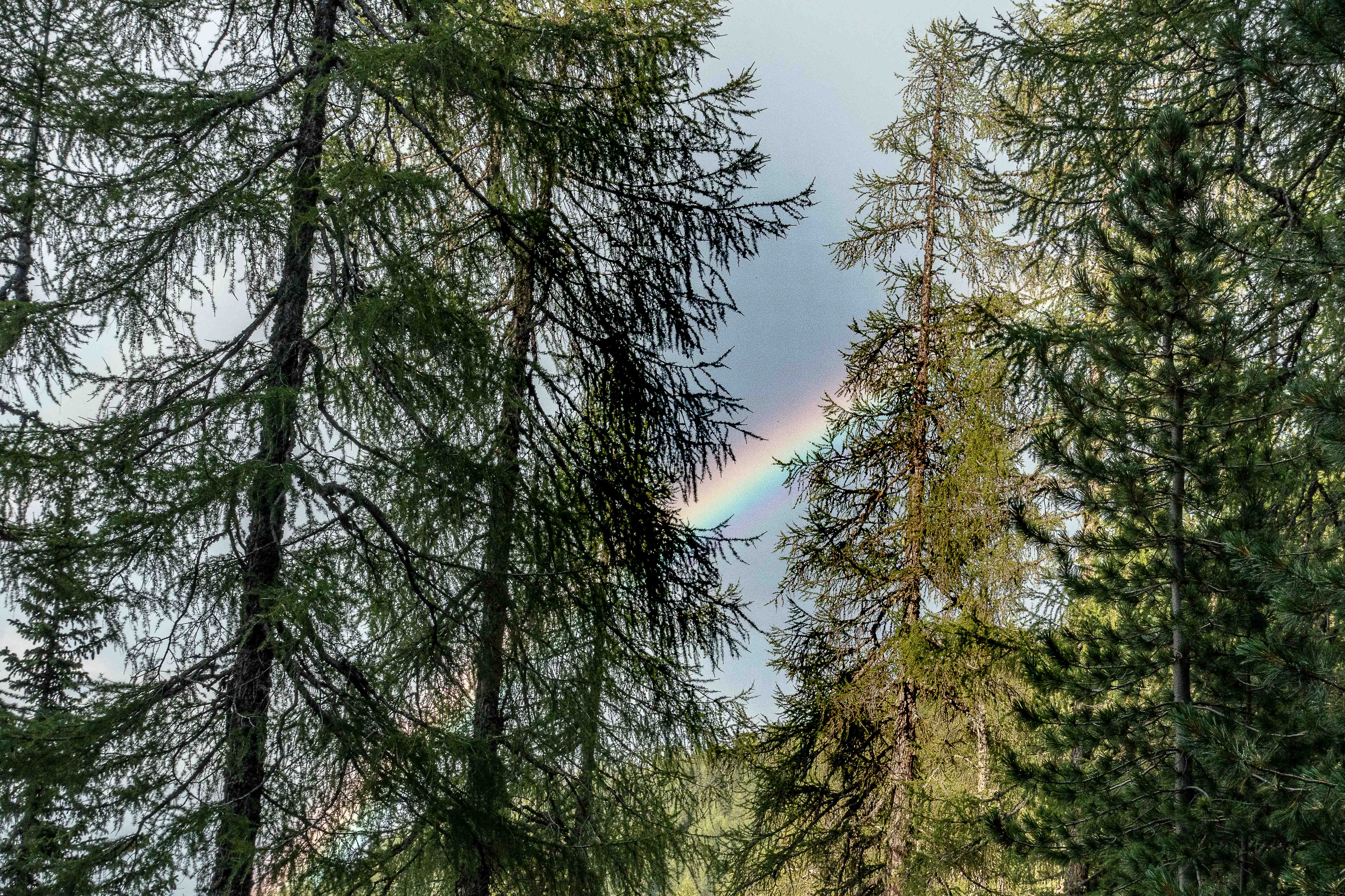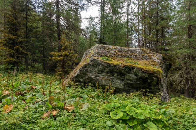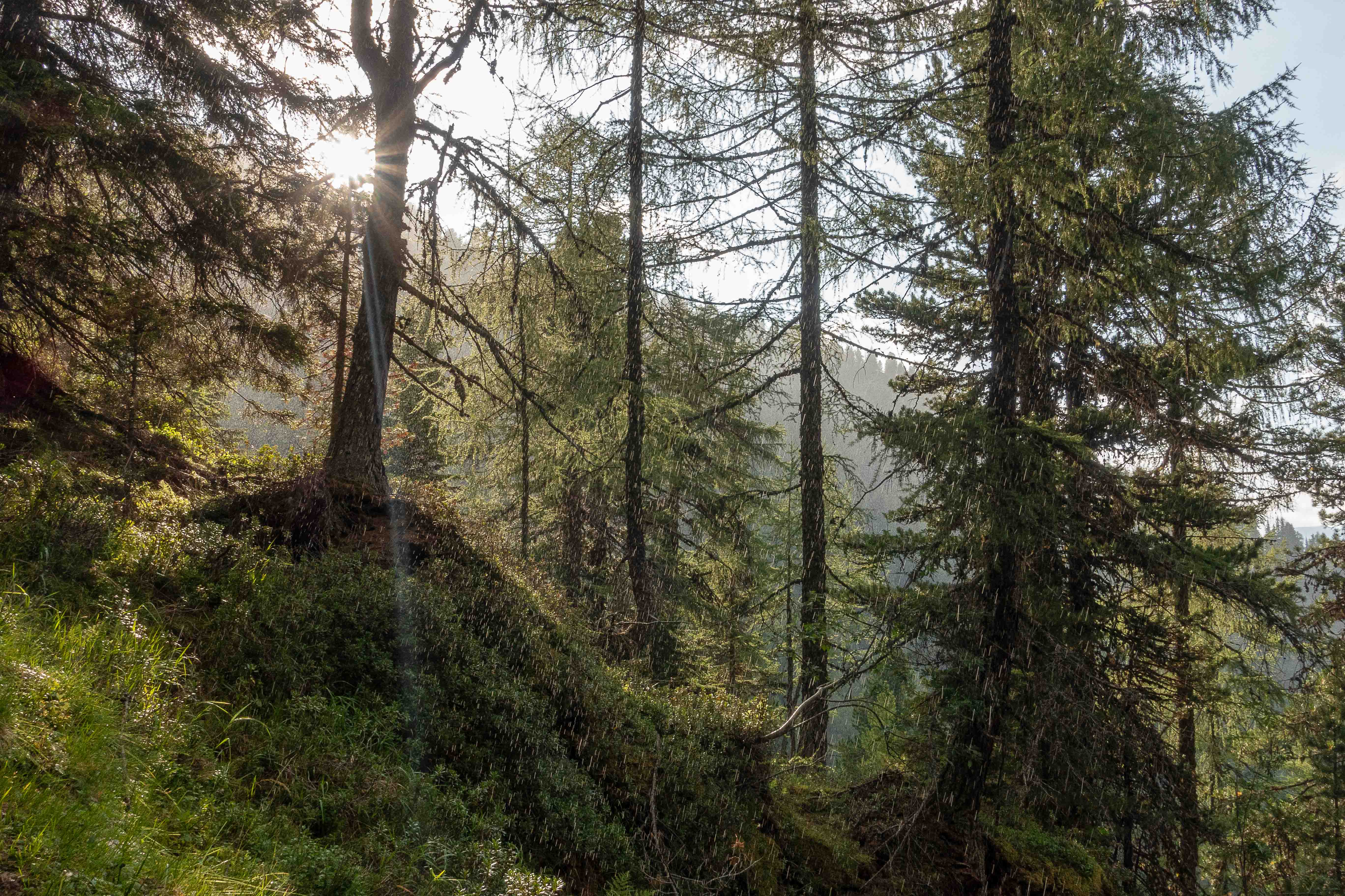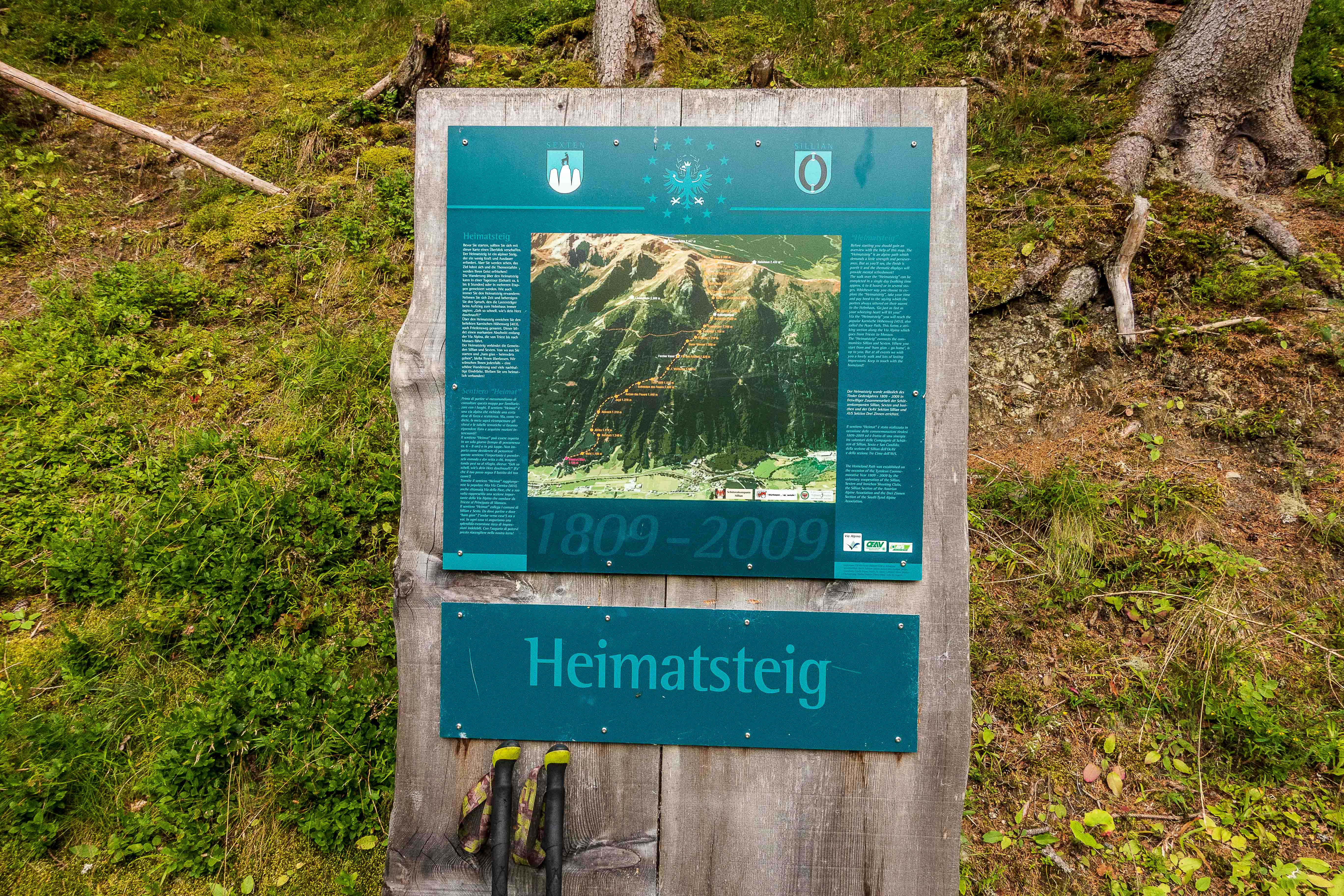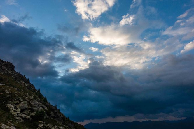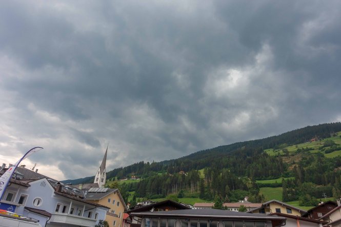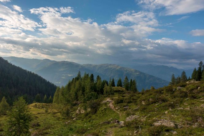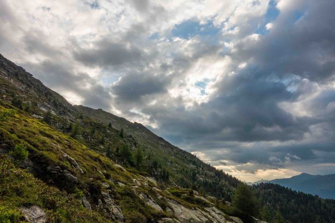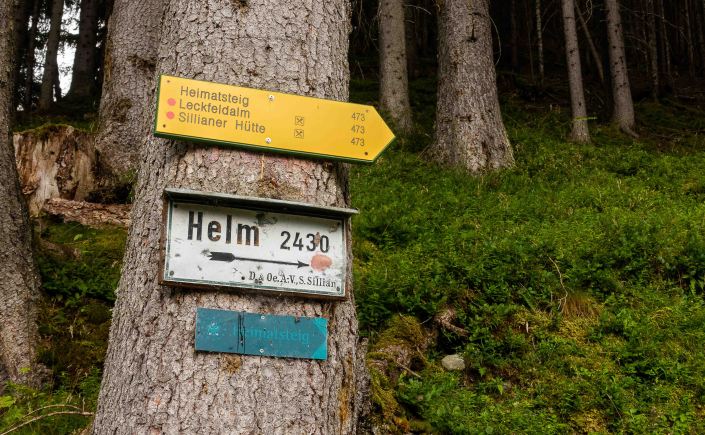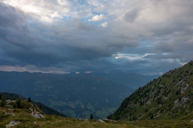 Nachdem ich noch einige Tage auf die Genesung unseres Dicken warten musste, fahre ich über die FELBERTAUERNSTRASSE nach SILLIAN. Heute ist einer der heißesten Tage in dem ehe schon lang währenden heißen Sommer. Auch im PUSTERTAL hat es auf immerhin 1100 m ü. A. (wird in Österreich verwendet und bedeutet: Meter über Adria) 32 Grad C. Als sich die bedrohlichen dunklen Wolken verziehen, starte ich am frühen Nachmittag meine Tour, es ist ja noch lange hell und ich habe viel Zeit, meine ich. Mein erstes Tagesziel ist der HELM, am westlichen Rand der KARNISCHEN ALPEN gelegen und ein wunderbarer Aussichtsberg. Es muss toll sein, dort oben die Nacht alleine und ohne die Touristenmassen zu verbringen. Hinauf führt der alte HELMWEG, der nun HEIMATWEG heißt und die einst durch die Staatsgrenze getrennten Orte SILLIAN und SEXTEN verbindet. Die mächtigen Bäume spenden zwar Schatten, aber der Weg ist steil und es ist schwül, es regnet ein paar Tropfen und die Sonne zaubert einen Regenbogen, der Schweiß rinnt in Strömen. Die reifen Brombeeren schmecken wunderbar süß, ein sprudelnder Bach verhilft zur kurzzeitigen Erfrischung. Anfangs geht das Laufen gut, auch wenn der Rucksack mit Zelt, Matte, Schlafsack und vielen Müsliriegeln schwer auf den Schultern liegt. Dann werden die Schritte kürzer, die Pausen immer mehr und länger. Gegen 20 Uhr stehe ich oberhalb der Baumgrenze, aber immer noch 200 m unter dem Gipfel des HELMS, ich kann nicht mehr. Gut, dass ich meine eigene Hütte dabei habe. Schnell ist das Zelt aufgestellt, in diesem Jahr sogar ausreichend mit Heringen befestigt, und ich liege schon flach. Von Nordosten ziehen schwarze Wolken heran, doch bis auf ein paar Tropfen bleibt es trocken. Endlich wird es etwas kühler. Als ich nachts kurz aufwache, staune ich über den gigantischen Sternenhimmel.