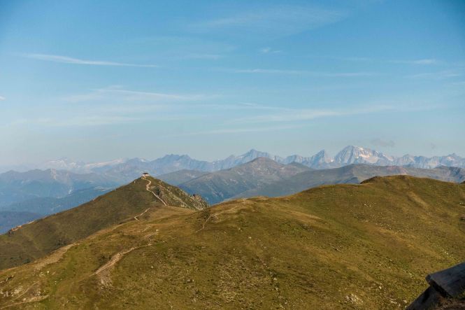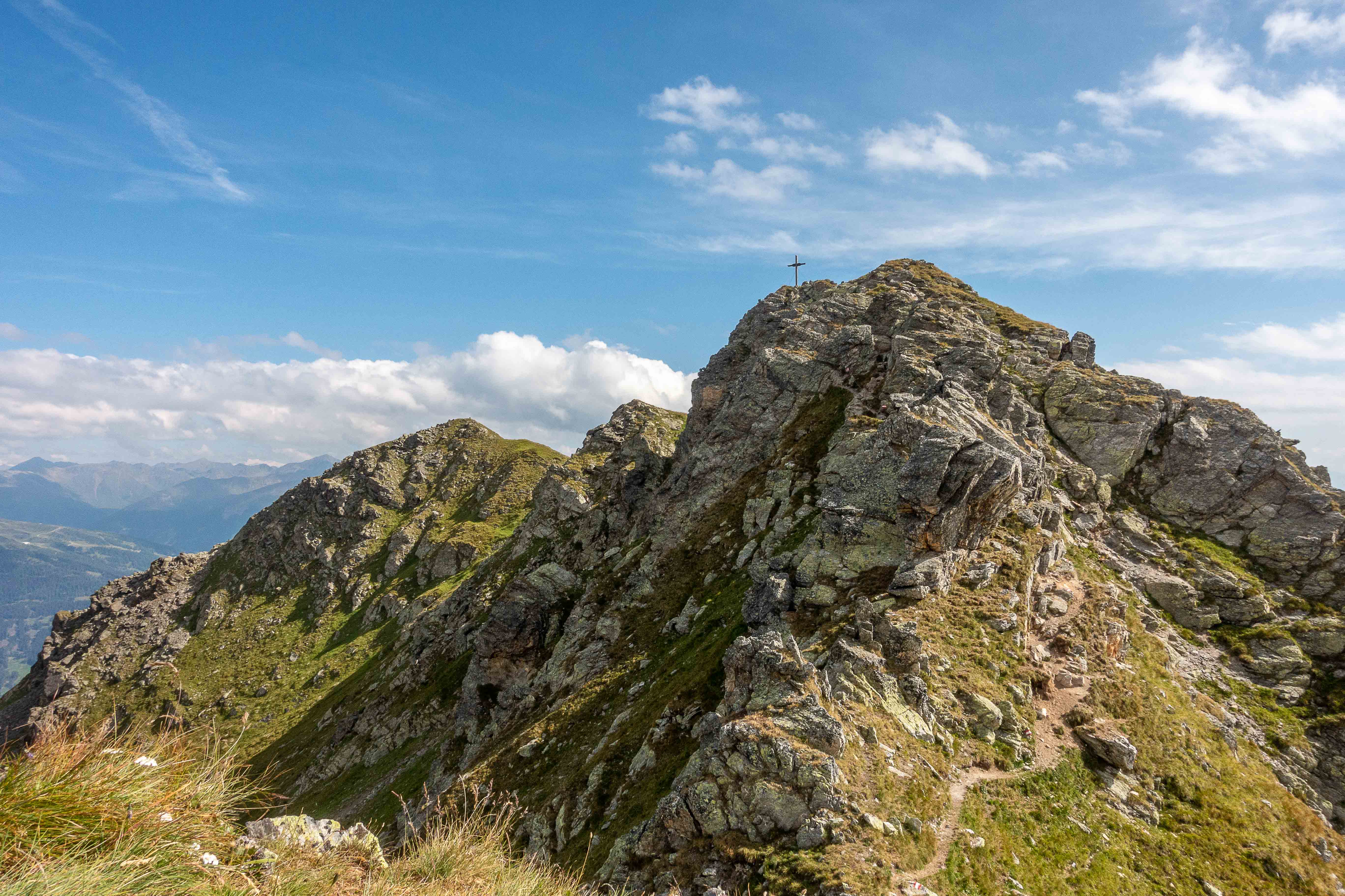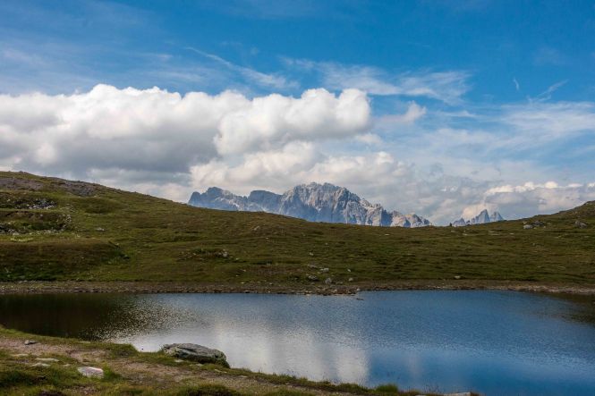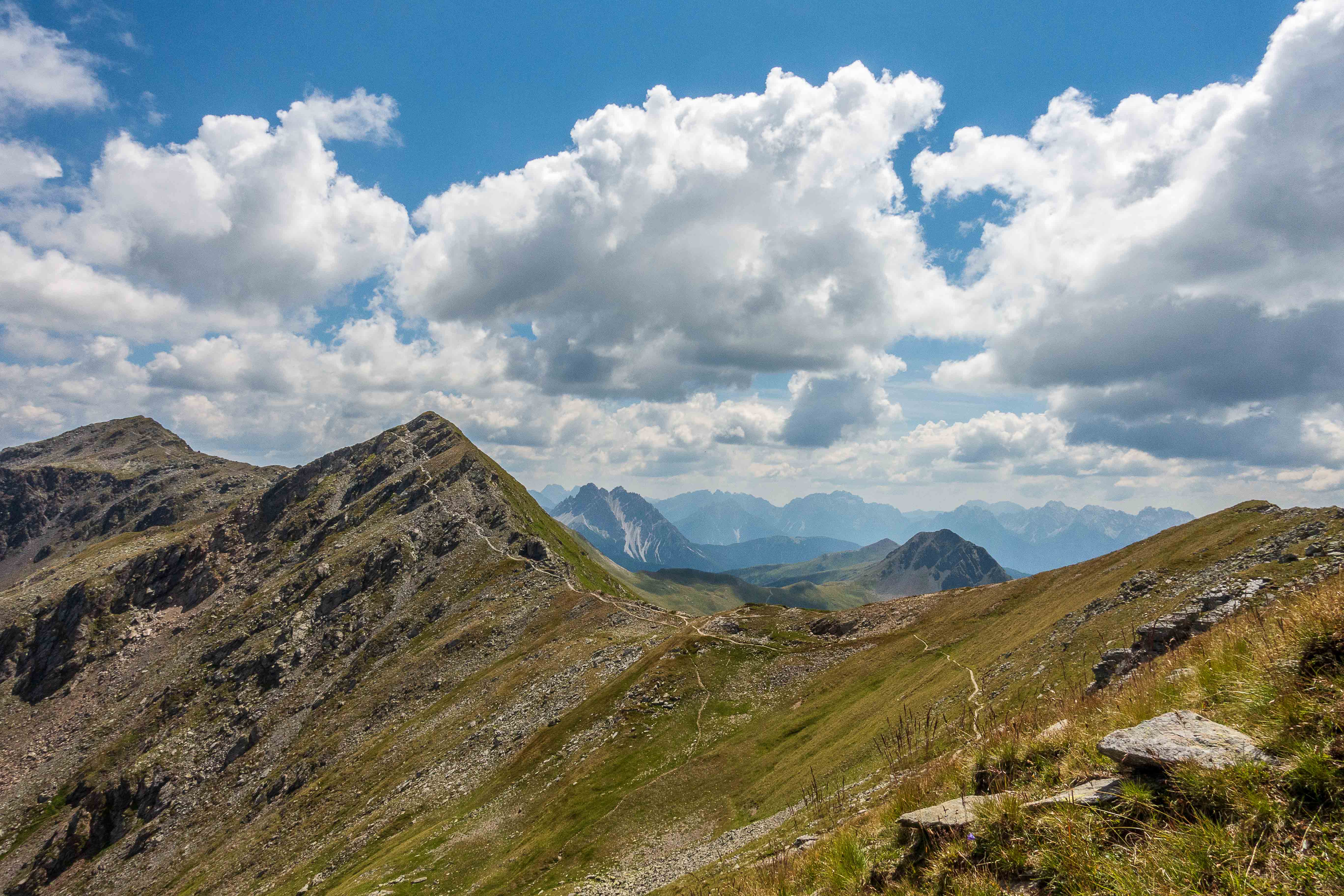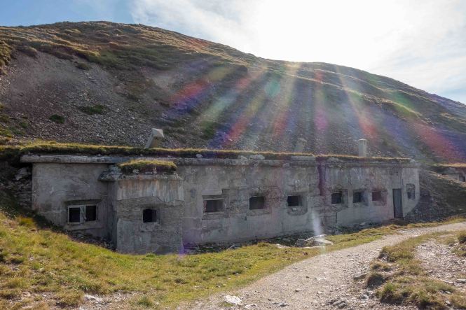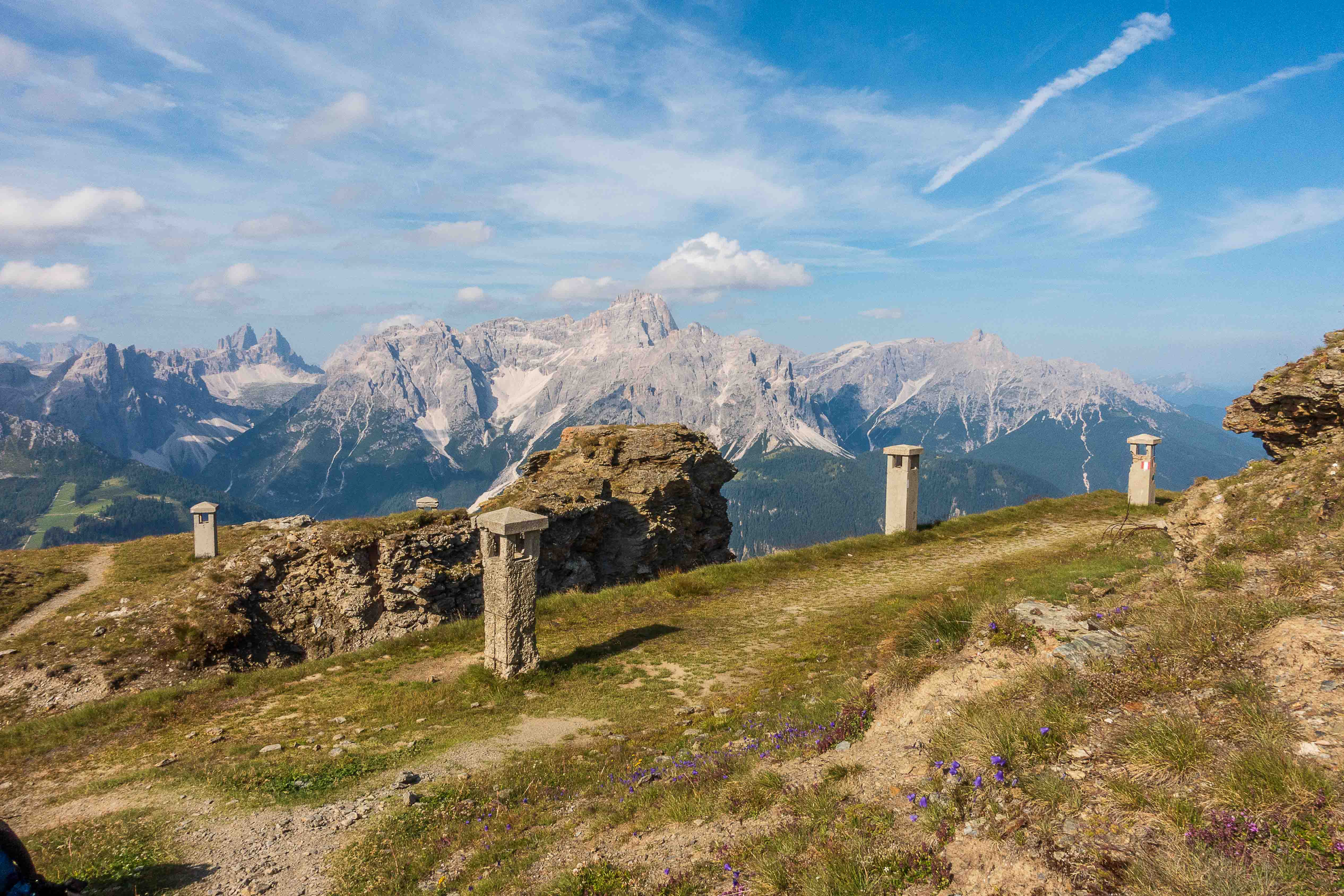 Der weitere Weg führt über Wiesenhänge rauf und runter. Immer wieder muss ich Pause machen und stehen bleiben um diesen Rundumblick einzufangen (oder sind es die gestrigen Höhenmeter, die mir immer noch in den Knochen stecken?). Der erste Hügel, der im Wege steht, ist das HORNISCHEG, immerhin 2550 m hoch. Unterhalb des runden Gipfels stehen die Ruinen der österreichischen Stellungen. Auch auf dem weiteren Weg sind fast überall die Reste der Schützengräben zu sehen. Ich machen einen kleinen Abstecher zur HOLLBRUCKER SPITZE, spare mir aber die Kraxelei über die letzten Meter. Mit der hochsteigenden Sonne frischt der Wind sogar etwas auf, ein paar Wolken spenden ab und zu Schatten. So ist die Temperatur fast angenehm frisch.