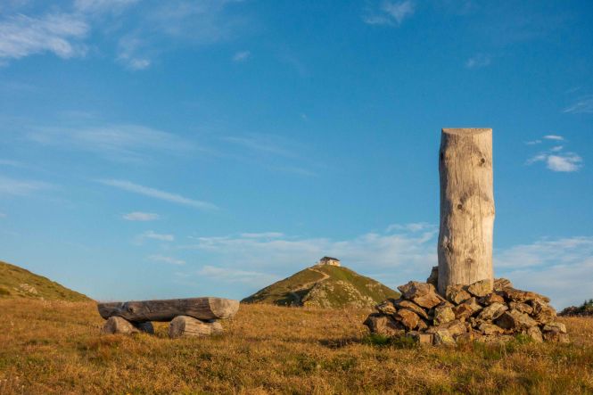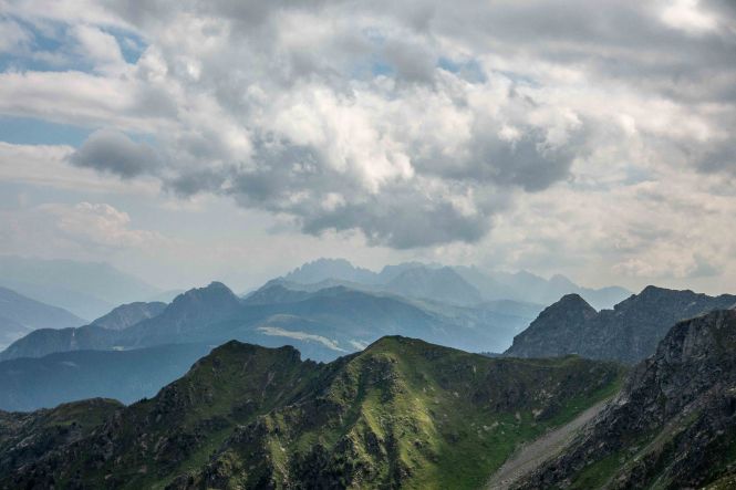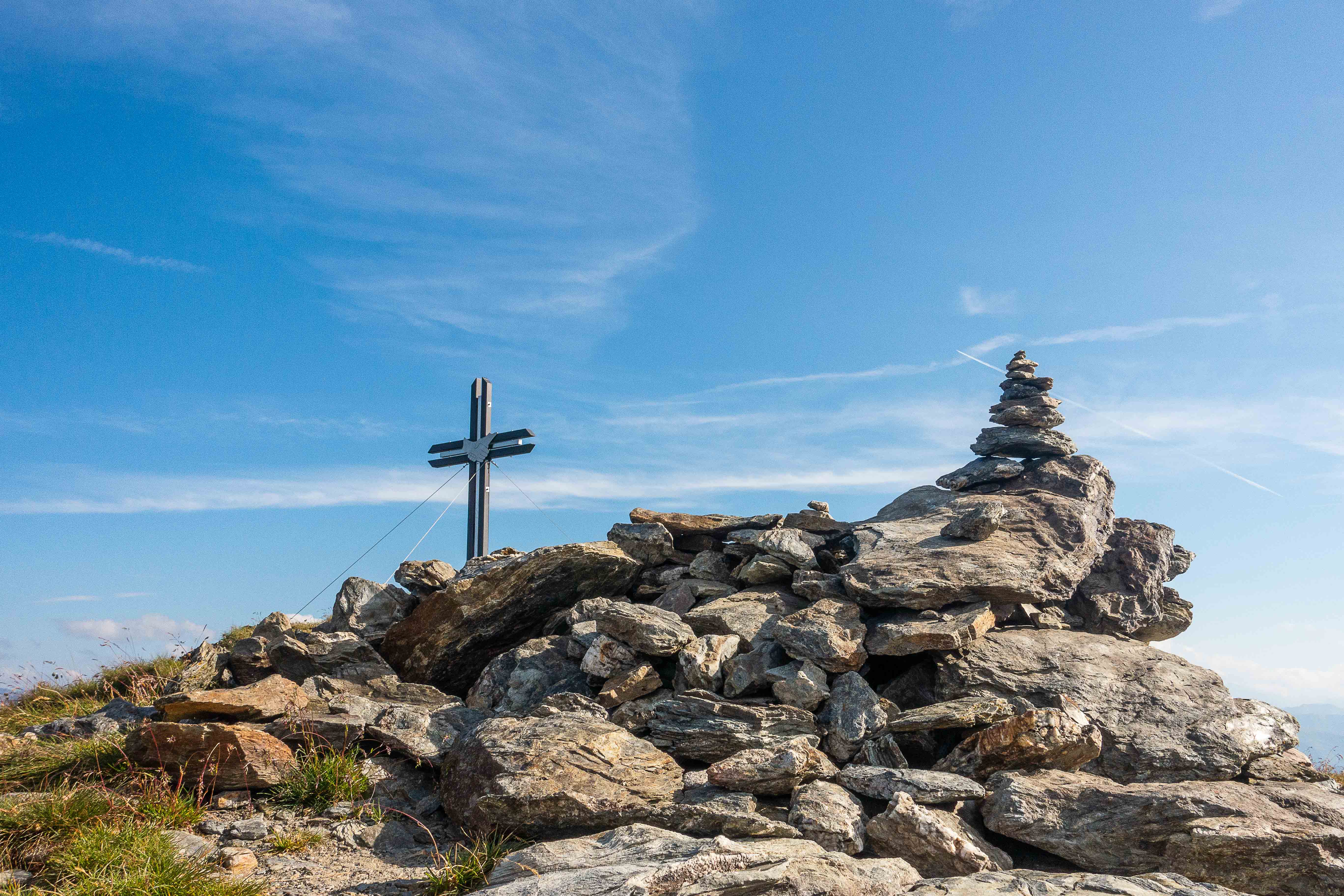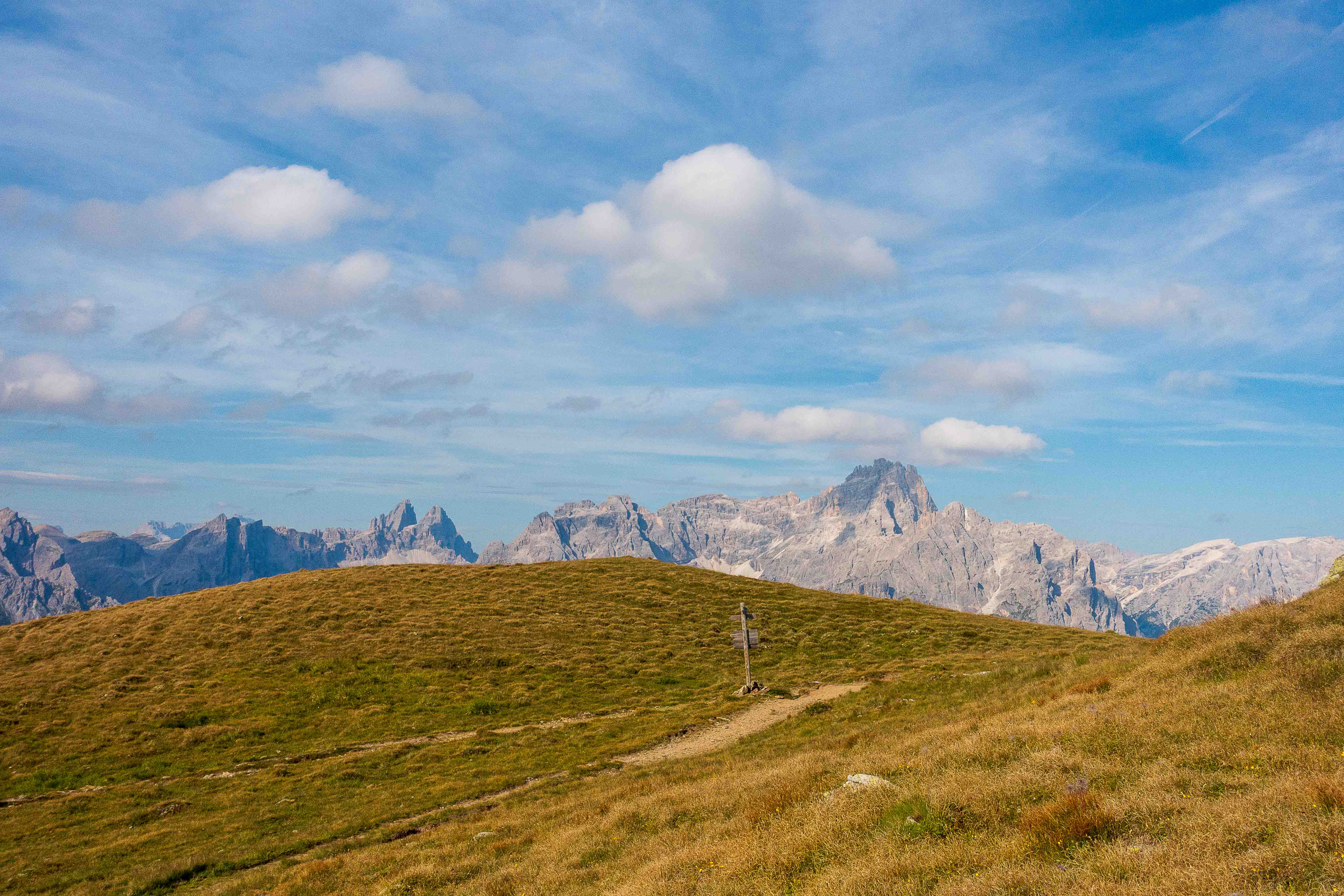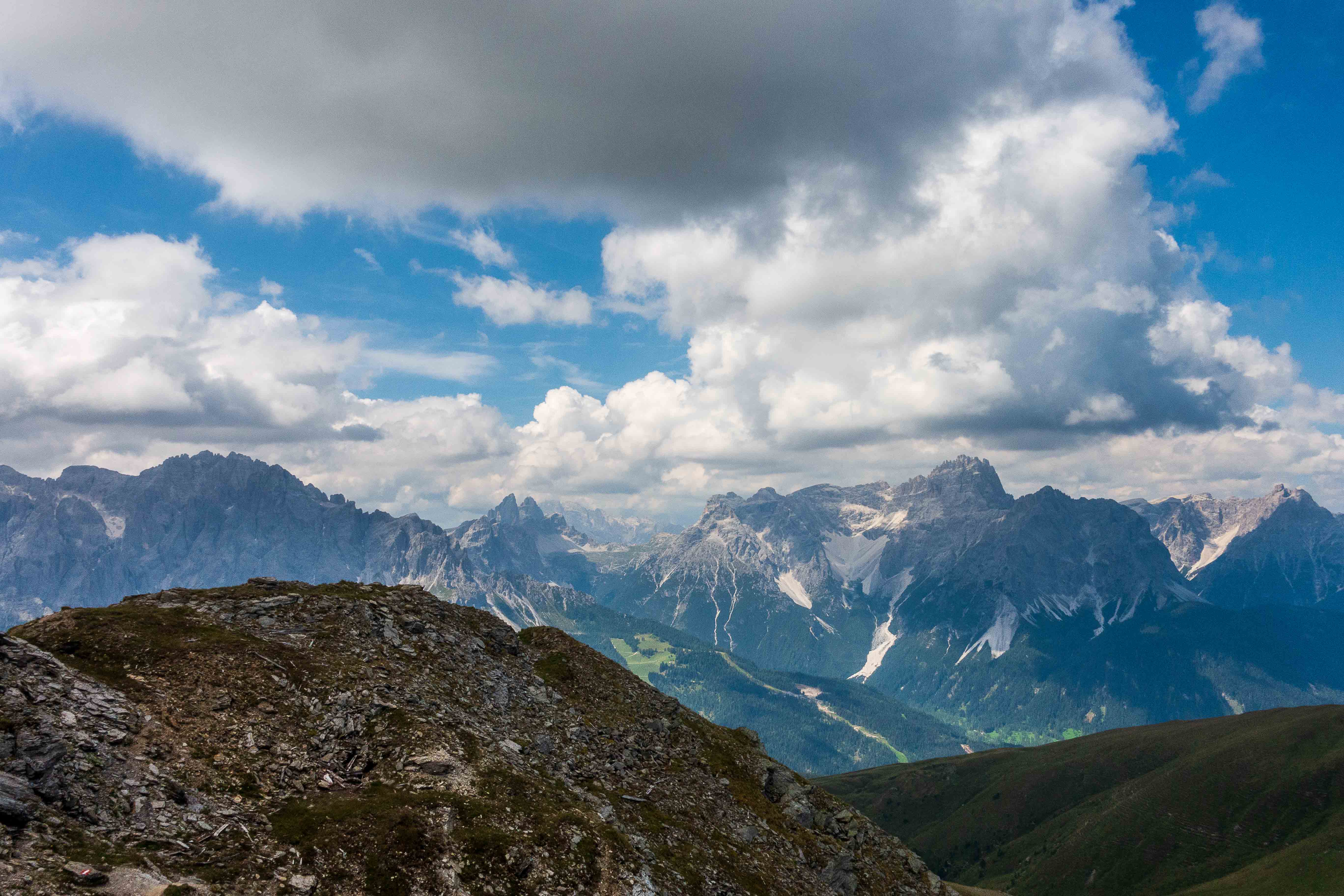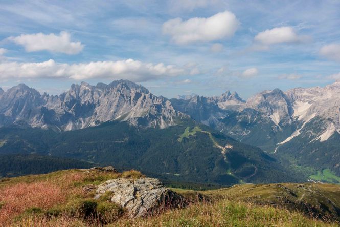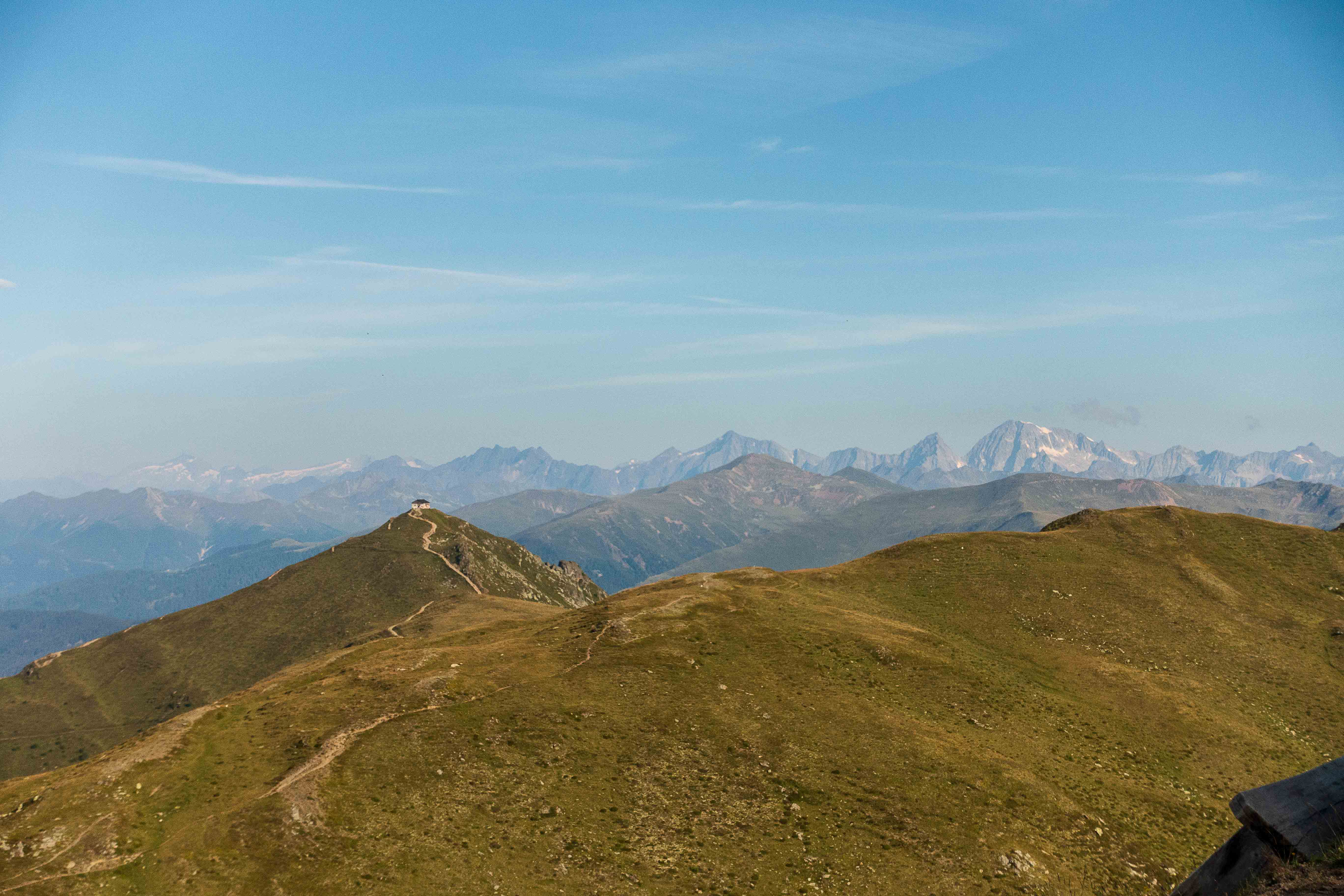 Der weitere Weg führt über Wiesenhänge rauf und runter. Immer wieder muss ich Pause machen und stehen bleiben um diesen Rundumblick einzufangen (oder sind es die gestrigen Höhenmeter, die mir immer noch in den Knochen stecken?). Der erste Hügel, der im Wege steht, ist das HORNISCHEG, immerhin 2550 m hoch. Unterhalb des runden Gipfels stehen die Ruinen der österreichischen Stellungen. Auch auf dem weiteren Weg sind fast überall die Reste der Schützengräben zu sehen. Ich machen einen kleinen Abstecher zur HOLLBRUCKER SPITZE, spare mir aber die Kraxelei über die letzten Meter. Mit der hochsteigenden Sonne frischt der Wind sogar etwas auf, ein paar Wolken spenden ab und zu Schatten. So ist die Temperatur fast angenehm frisch.