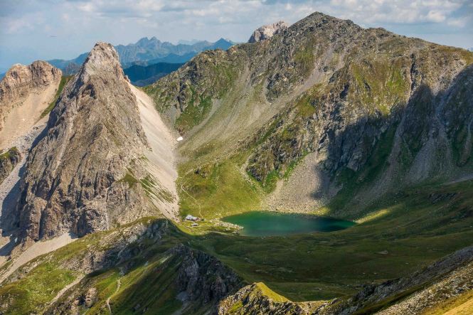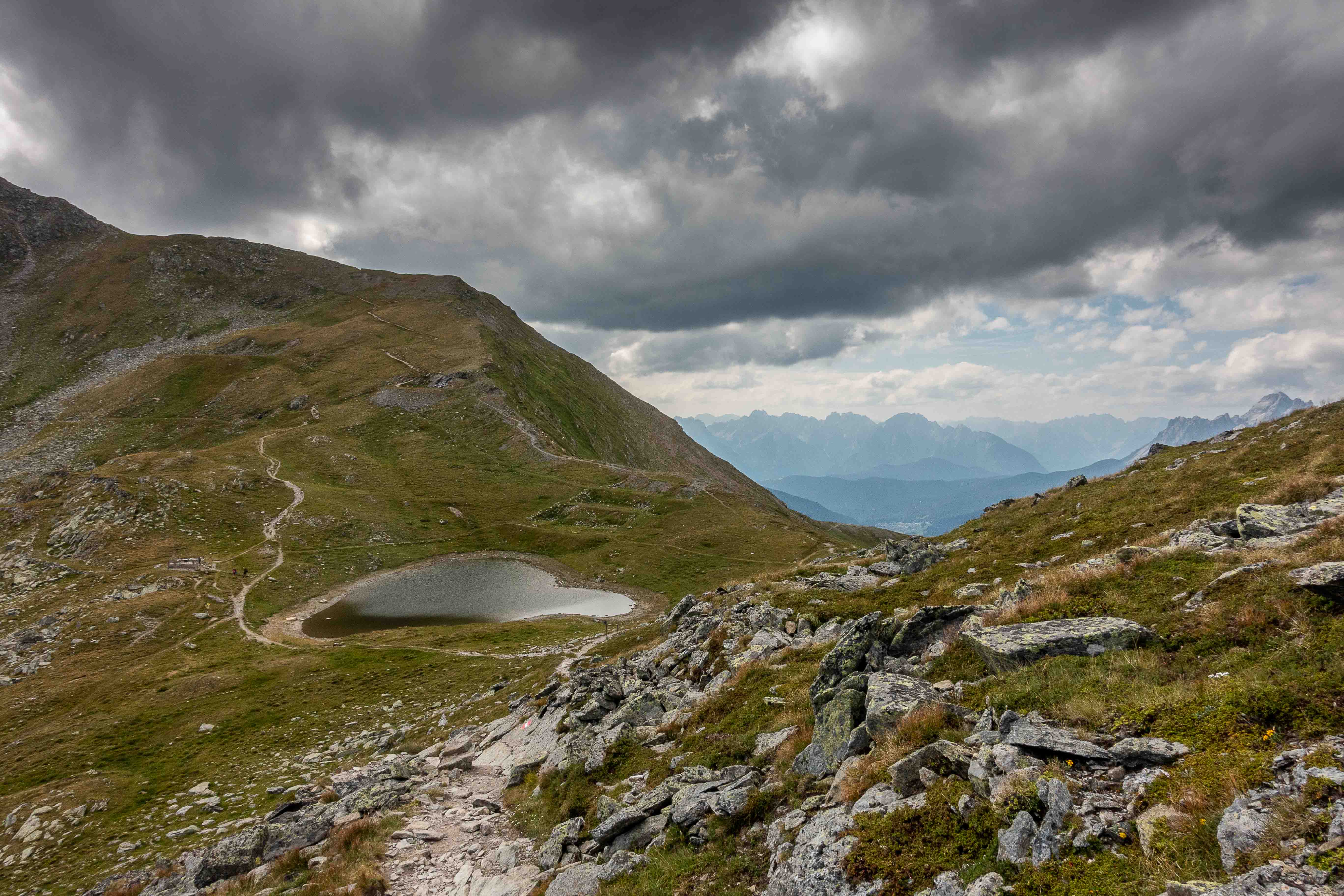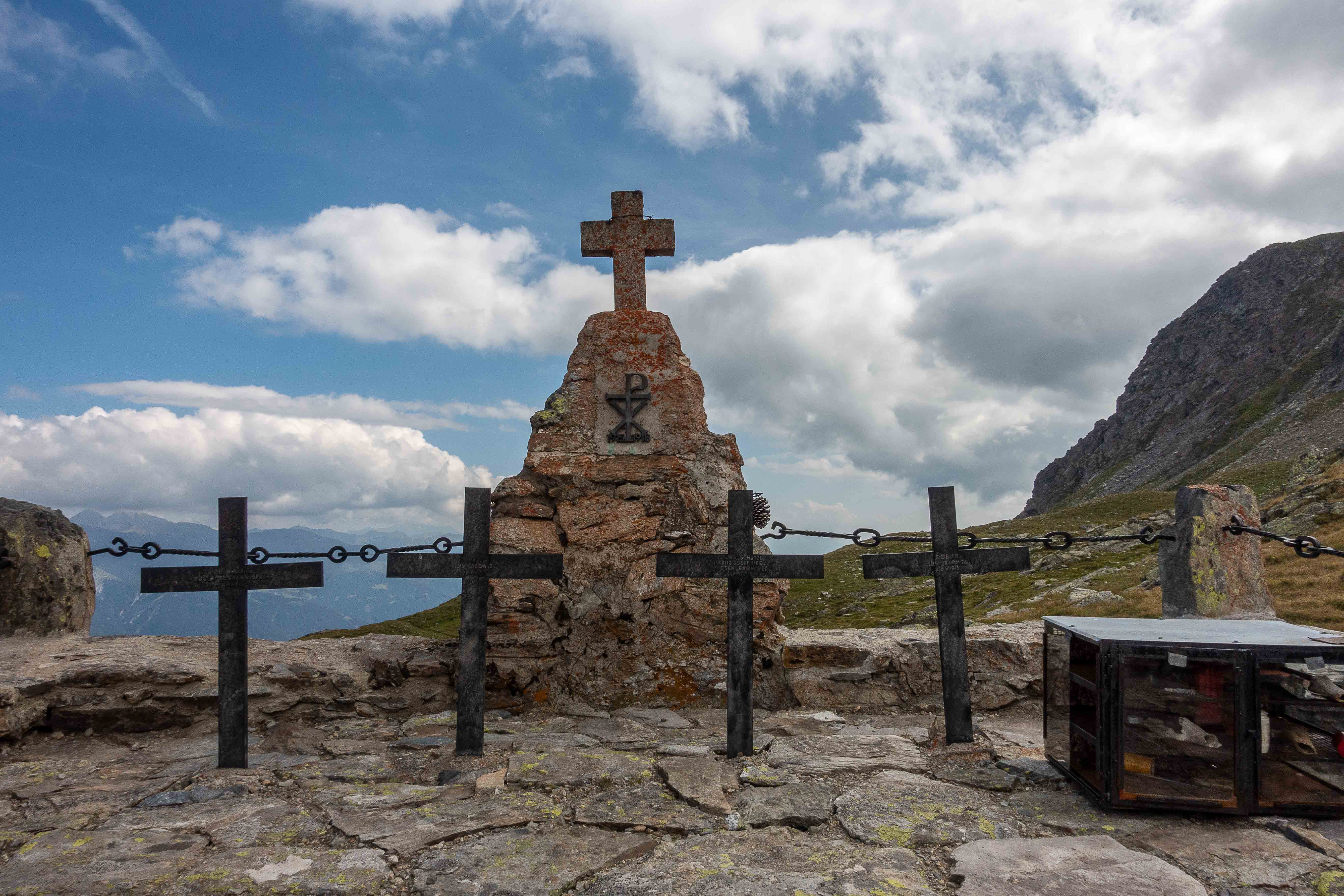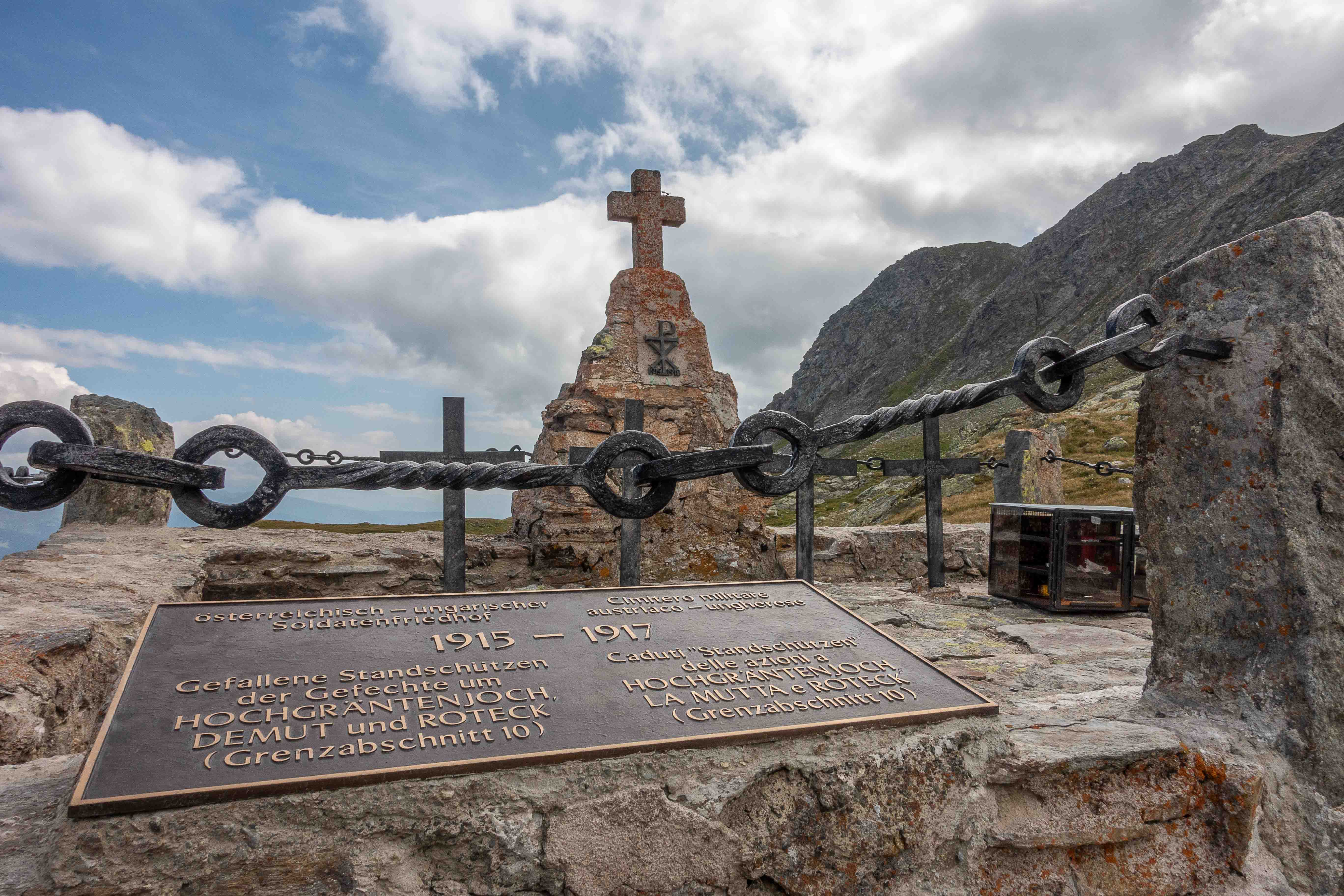 Ein paar Meter tiefer liegt der herzförmige HOCHGRÄNTENSEE. Hier am Joch befand sich eine Stellung der österreichisch-ungarischen Soldaten. Im Sommer 1915 griffen die Italiener an. Vier Standschützen (Mitglieder einer seit dem 15. Jahrhundert bestehende Schützengilde, die sie sich früher freiwillig für den militärischen Schutz Tirols verpflichteten) fanden hier, im höchstgelegenen Kriegerfriedhof Mitteleuropas, ihre letzte Ruhestätte.