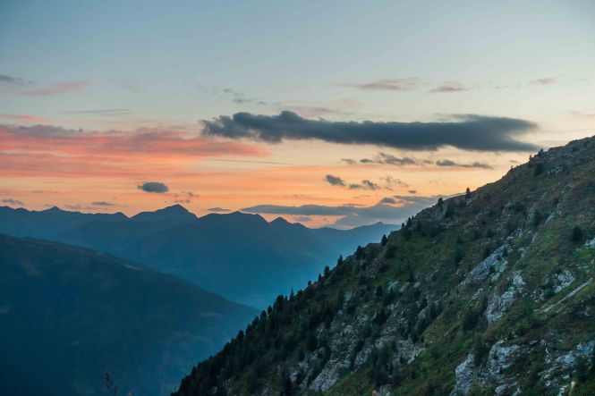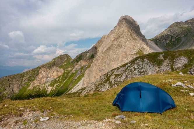 Ich schleiche über den DEMUT, was meiner Verfassung entspricht, bis unter den Gipfel des EISENREICH. Und dann ist endlich die OBSTANSERSEEHÜTTE zu sehen. Sie liegt malerisch an dem grün leuchtenden See, darüber türmt sich hoch die PFANNSPITZE auf. Die 350 Höhenmeter hinunter lassen sich wieder etwas zügiger laufen. Ich nehme einen großen Schluck frischen Wassers aus dem Bach, lege mich in die Wiese und schlafe genüsslich ein. Für das Zelt finde ich etwas oberhalb der Hütte einen weichen und ruhigen Wiesenplatz. Ein paar Regentropfen fallen, der Himmel überzieht sich mit grauen Wolken, das angekündigte Gewitter bleibt Gott sein dank aus.