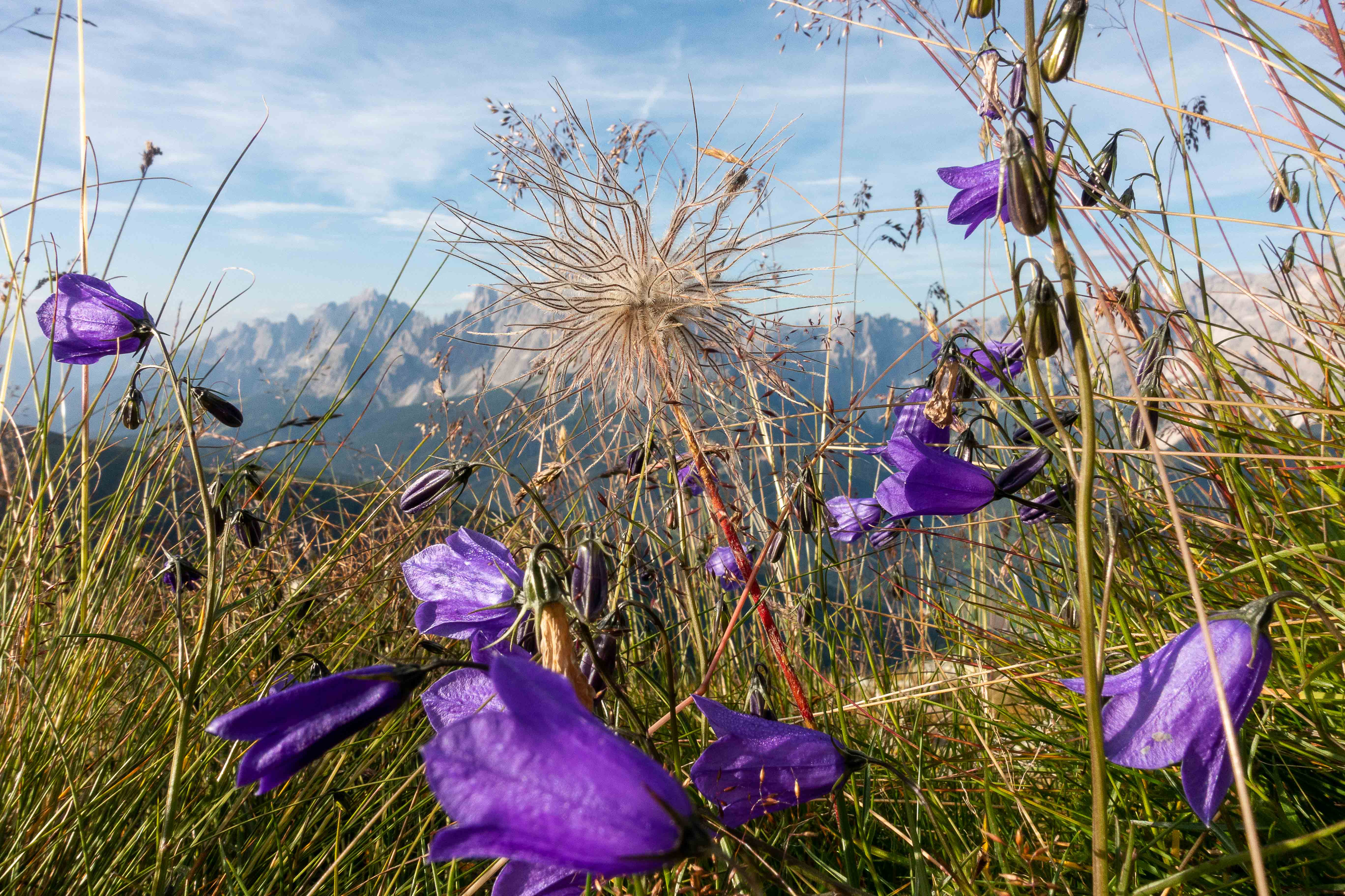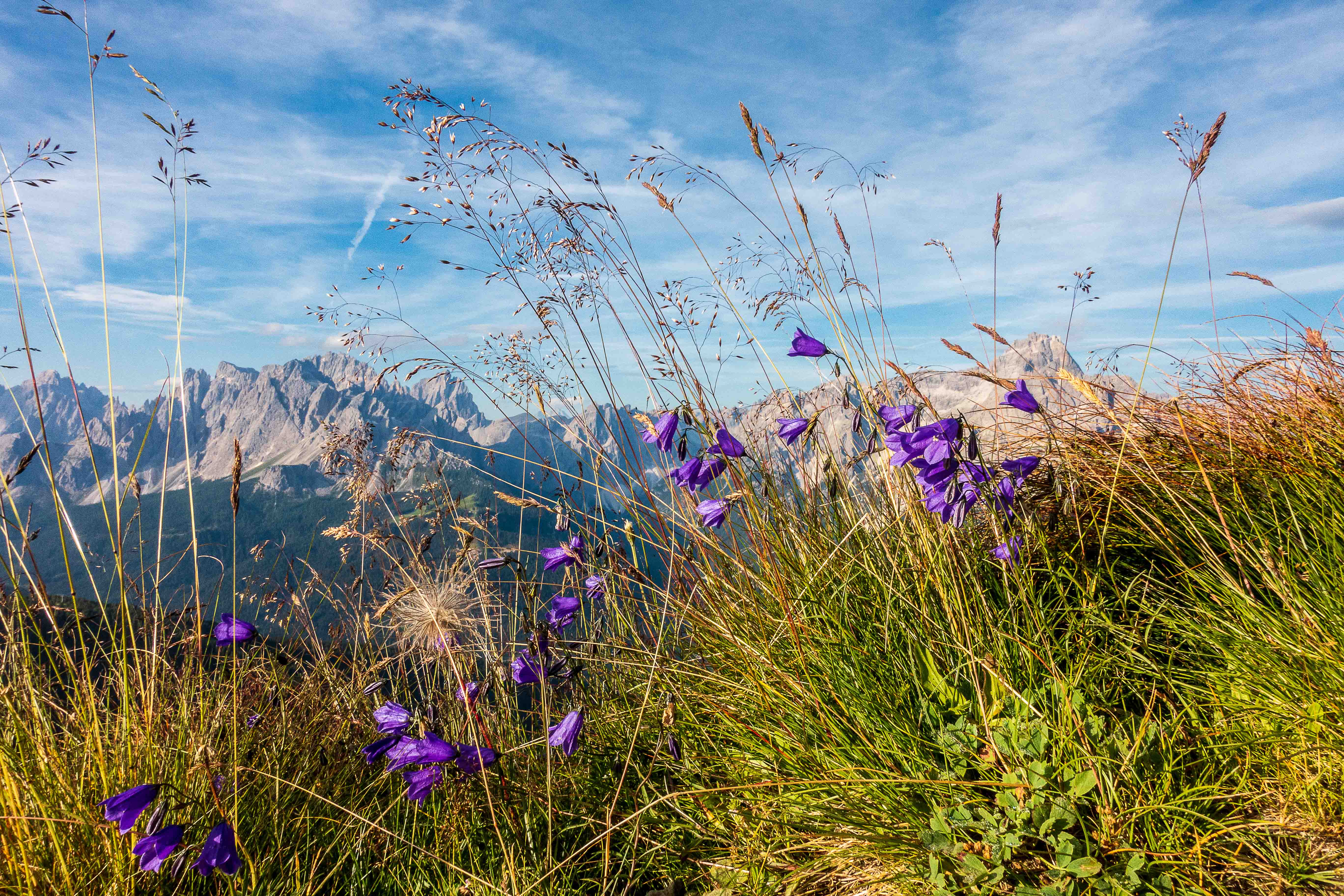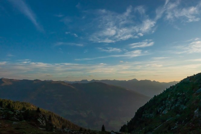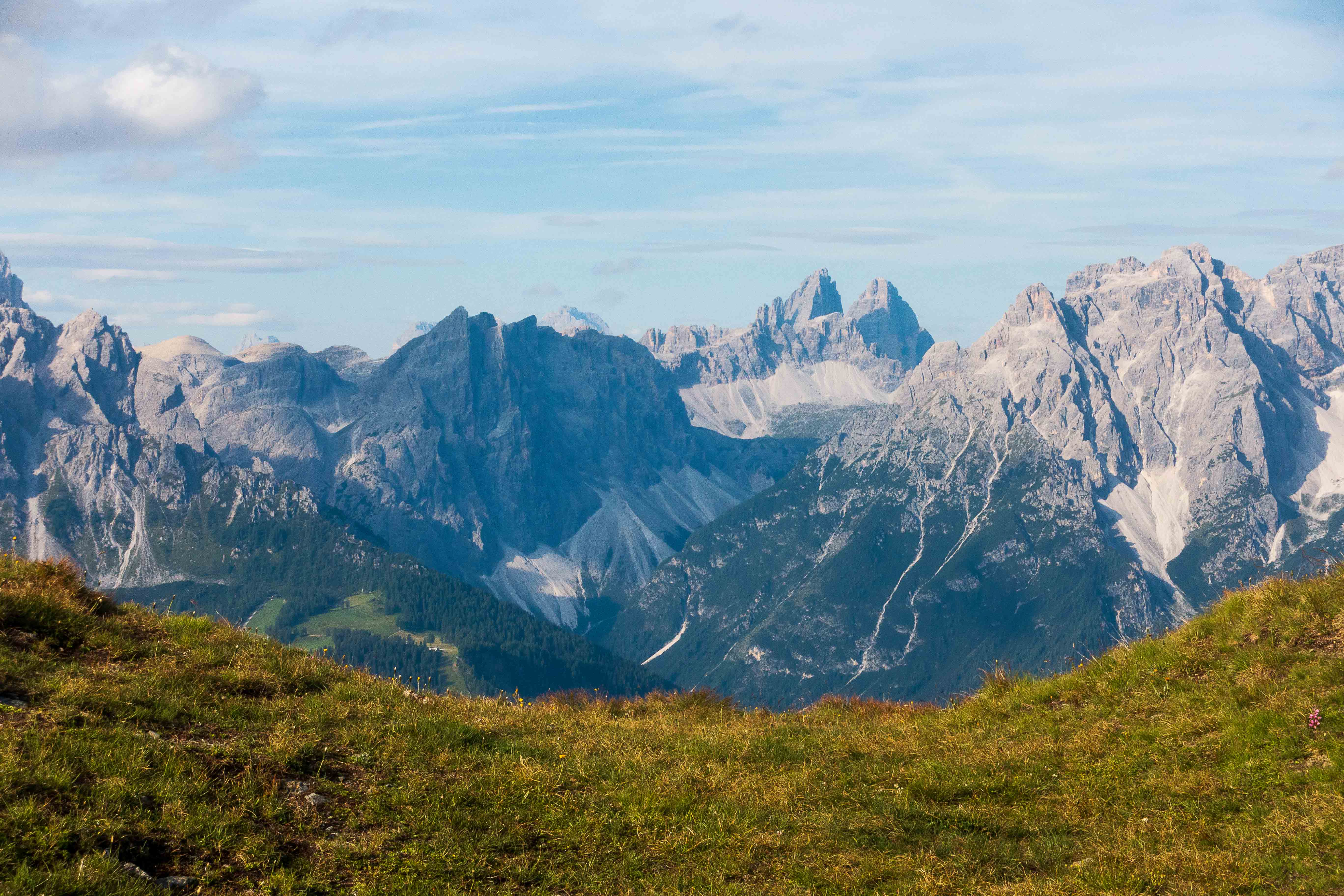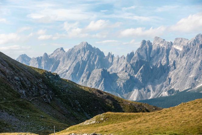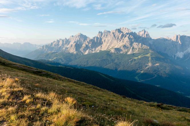 Gegen 5 Uhr wird es langsam hell, gegen 6:30 Uhr laufe ich los, immer noch mit ziemlich schweren Beinen. Doch kaum eine halbe Stunde später stehe ich auf der Kammhöhe. Von hier ist der Blick in die SEXTENER DOLOMITEN grandios, alle Müdigkeit ist auf einmal verschwunden. Den ganzen Tag über genieße ich die einmaligen Sicht in diese pittoreske Bergwelt, bizarr recken sich die Felsnadeln und Türme dieses Gebirges in den Himmel. Von hier sind es nur noch ein paar Schritte zum HELM, dem westlichsten Gipfel der KARNISCHEN ALPEN, und dem leider verfallenen HELMHAUS. 1889 von der Alpenvereinssektion Sillian als Schutzhütte erbaut, ging es nach dem Ersten Weltkrieg in italienischen Besitz über. Erst wurde es militärisch genutzt, dann diente es bis 1980 den Zöllnern. Seitdem steht es leer und verfällt zusehends. Es bestehen zwar Pläne für einen Neubau, aber leider findet sich kein Finanzier.