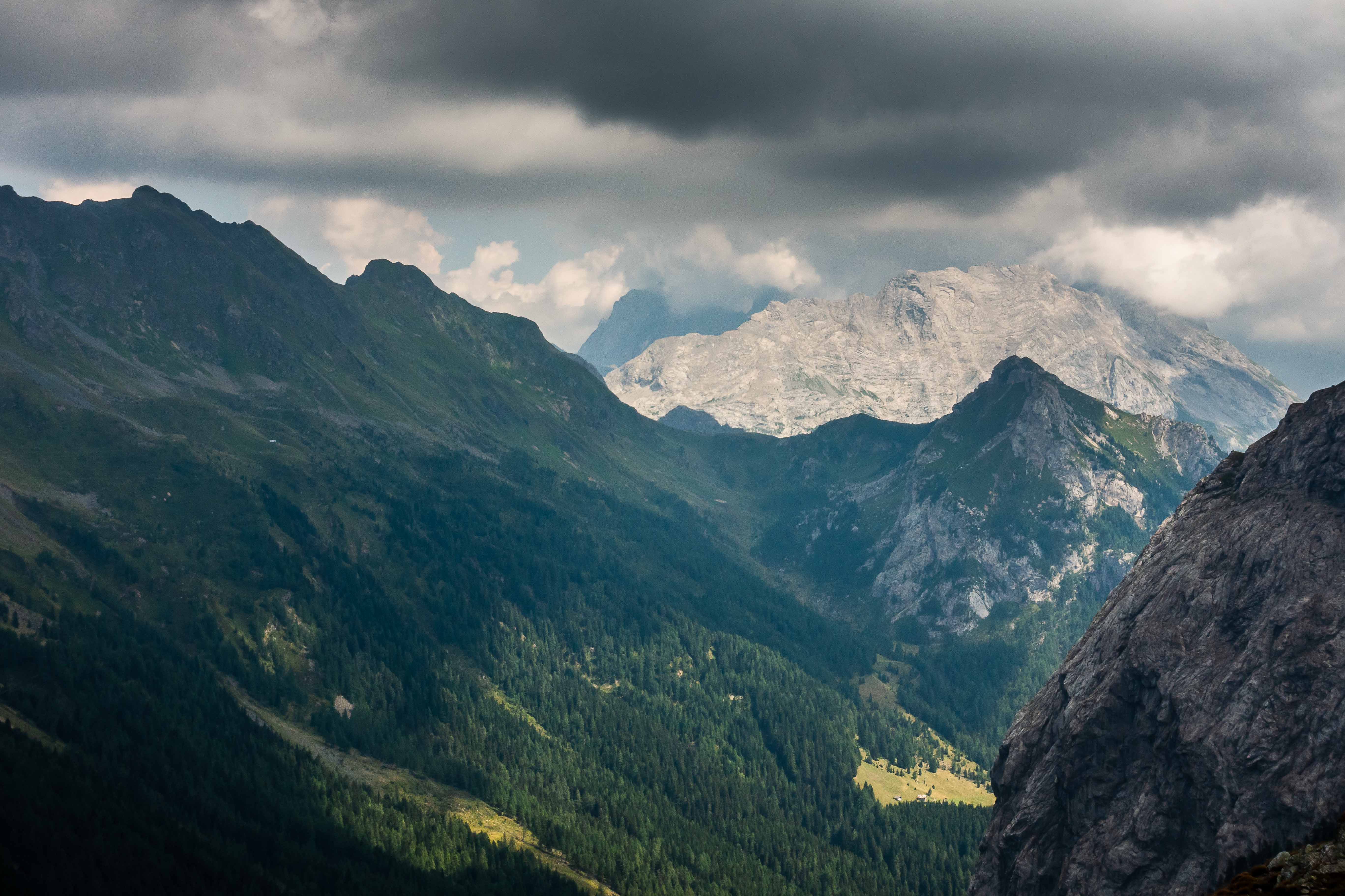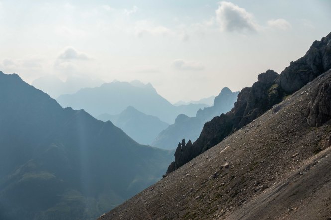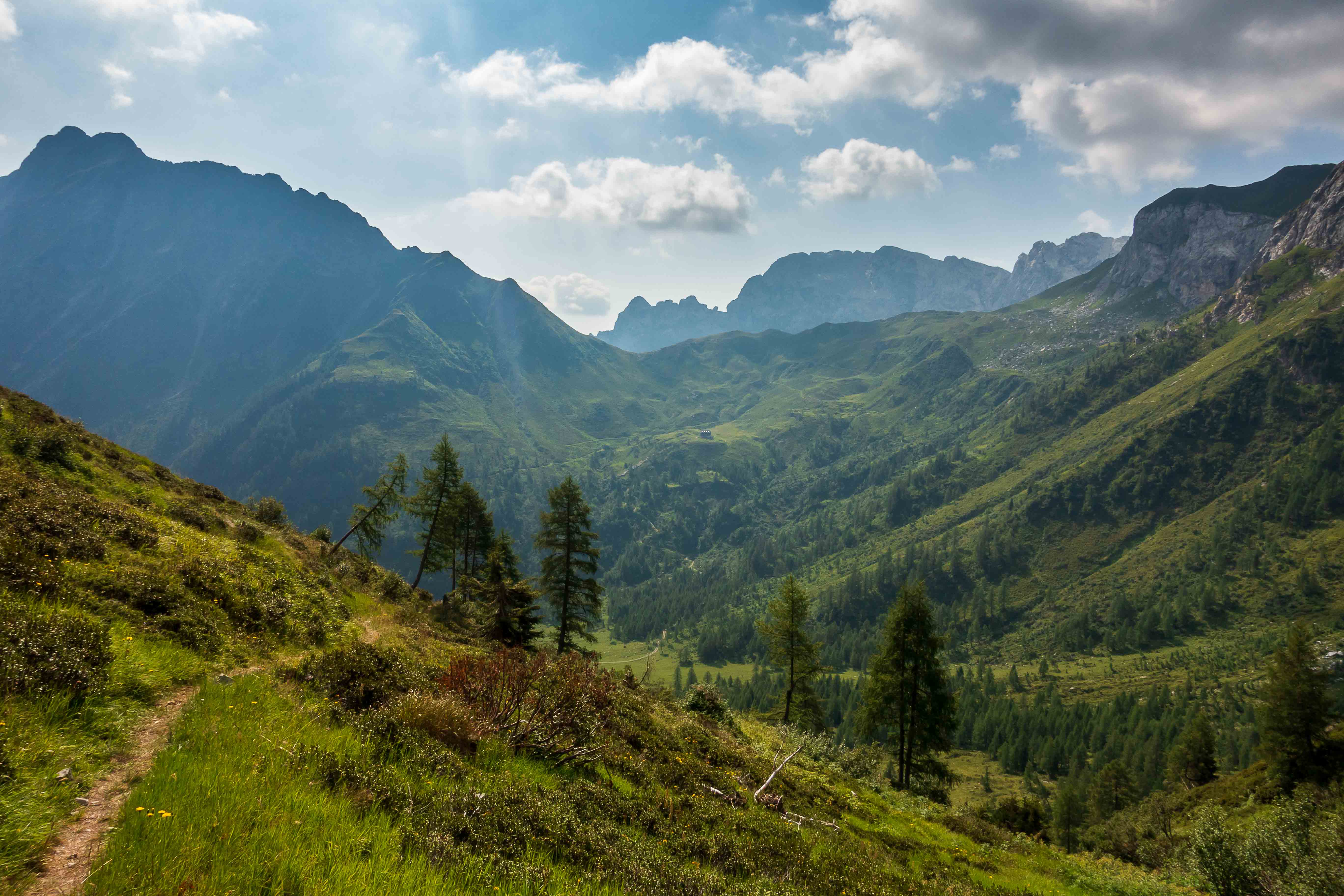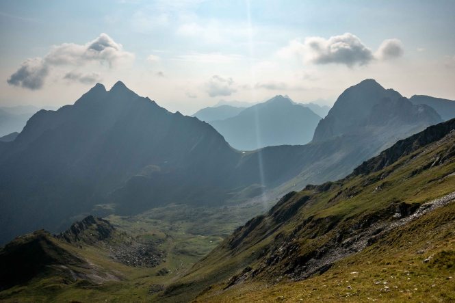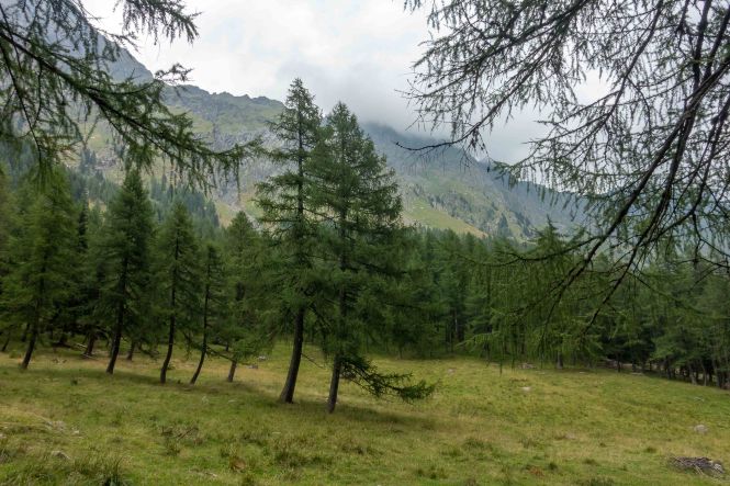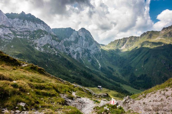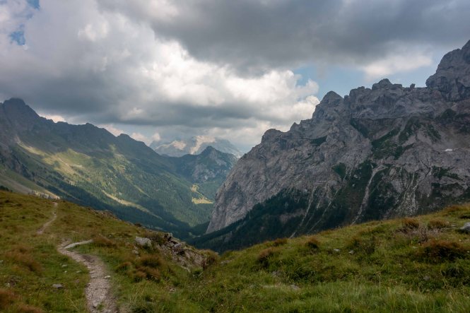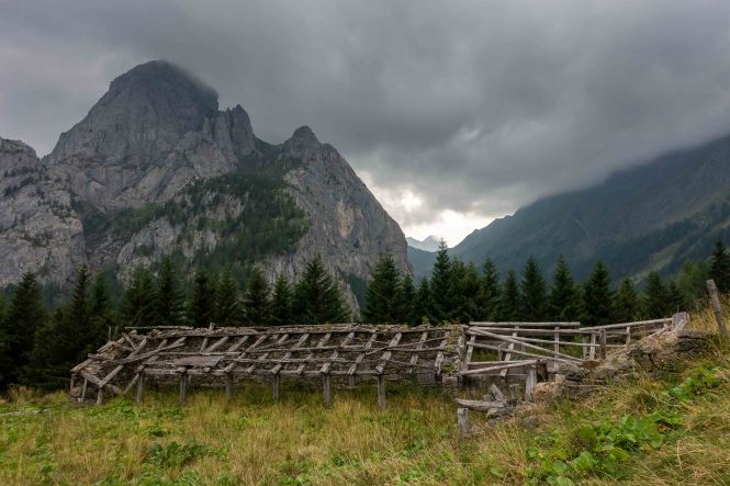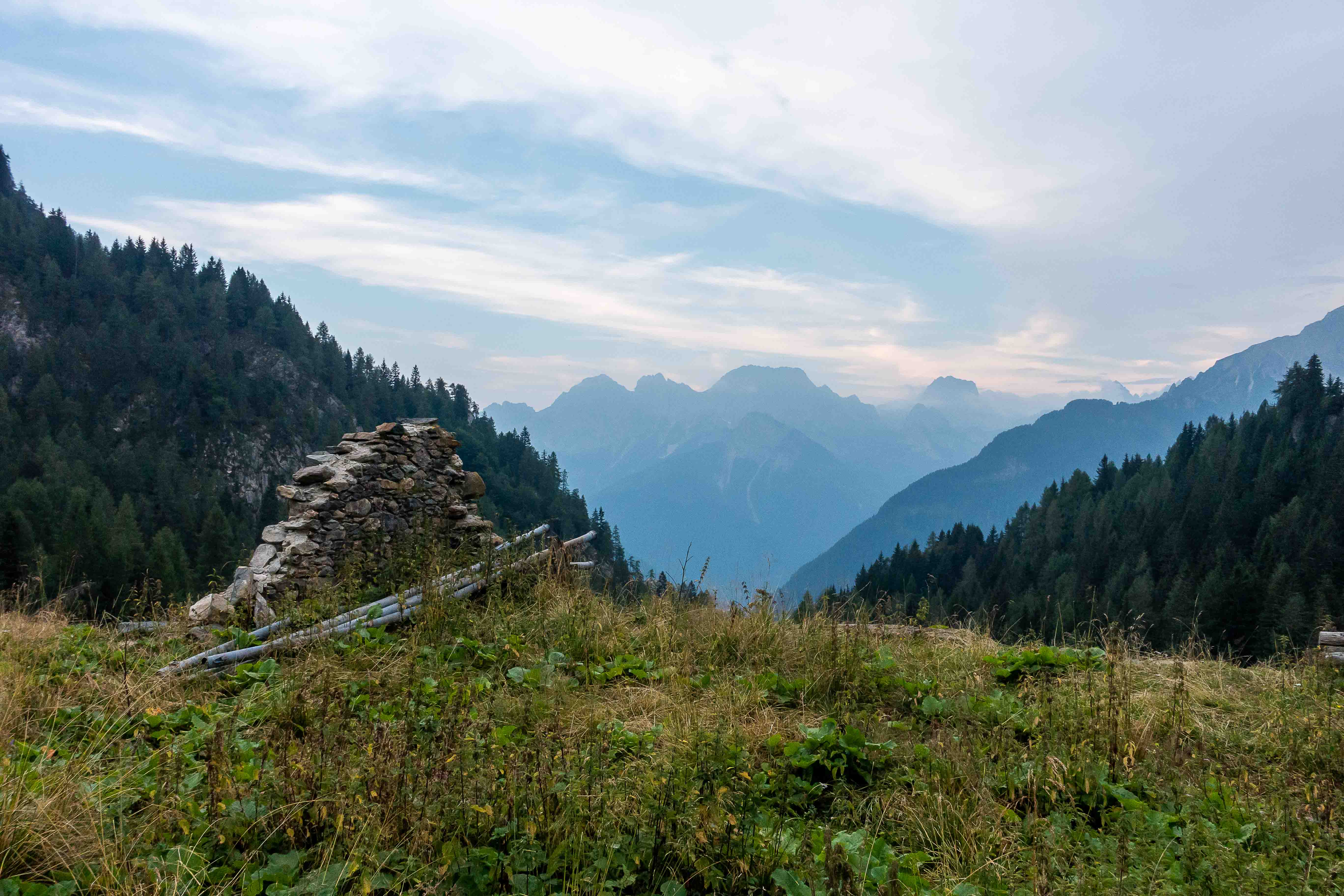 Nun liegen sie vor mir, die schwierigsten Stellen des Karnischen Höhenwegs. Doch der Wanderführer hat den kurzen Aufstieg zur Kammhöhe unterhalb des HOCHSPITZ etwas dramatisiert. Der Steig ist trocken und mit fixen Stahlsteilen gut gesichert, alleine der Schweiß rinnt mir bereits in der frühen Stunde schon wieder in Strömen herunter. Trotzdem tut es gut, oben auf dem Sattel eine erste Rast zu machen und die grandiose Landschaft rundherum zu genießen. Der weitere Weg über die Wiesenhänge zum LUGGAUER TÖRL ist leicht und gemütlich und führt das letzte Stück leicht fallend über alte, gut erhaltene Militärwege. Die ersten Wanderer kommen mir vom HOCHWEISSSTEINHAUS entgegen, meinem Ziel für die Mittagspause. Im morgendlichen Dunst ist die Hütte bereits auf der gegenüberliegenden Talseite zu erahnen. Der obere Weg ist noch gesperrt, auf einem Altschneerest ist die Gefahr derzeit zu groß einzubrechen. Nun heißt es viele Höhenmeter ins FROHNTAL abzusteigen. Es ist schon wieder heiß, die Oberschenkel brennen und meine drei Liter Wasser sind auch schon getrunken. Da plätschert ein kleiner Bach unverhofft durch das Grün, das frische Wasser tut gut. Im Talboden grasen Pferde und Kühe. Das letzte Stück hinauf zum HOCHWEISSSTEINHAUS ist steil und mühsam. Endlich da. Wieder bedienen freundliche junge Menschen auf der Hütte. Was für ein Unterschied zu den früheren Jahren, als der grantige Hüttenwirt einen schon mal die Schuhe hinterher warf. Das erste Bier steht schnell auf dem Tisch, dann gibt es Gemüsesuppe und Leberkäse mit Kartoffeln. Vielleicht noch einen Nachtisch? Es ist ein wunderbarer Apfelstrudel. Immer mehr Übernachtungsgäste kommen, es wird Zeit wieder aufzubrechen. Gleich hinter der Hütte schlängelt sich eine kohlrabenschwarze fingerdicke Schlange durch die Gräser. Angriffslustig attackiert sie den Wanderstock (die Bilder sind leider unscharf). Gemütlich führt der Steig hinauf zum ÖFNER JOCH. Wieder tut sich ein anderer neuer Blick auf: ein langes Tal, ausgefüllt mit einem märchenhaften Lärchenwald. Doch es sind noch viele Höhenmeter hinunter ins VAL FLEONS, aber ich habe ja genügend Energie getankt. Kaum komme ich im Wald an, bellen Hunde, Glöckchen bimmeln und ein Mann gibt lautstark Anweisungen. Ein italienischer Hirte mit seinen zwei Hunden treibt 800 Schafe hinauf zur Alpe. Leider habe ich keine Zigaretten für ihn dabei. Nun fast immer auf gleicher Höhe bleibend erreiche ich meinen heutigen Übernachtungsplatz: die verfallen CESERA SISSANIS DI SOTTO. Vor dem imposanten Haus stelle ich das Zelt auf, von den umliegenden Ställen stehen nur noch die Mauern, die Dächer sind zusammengefallen. Nebenan spritzt ein Wasserhahn. Herrlich, der Schweiß kann mit dem frischen Wasser abgewaschen werden. So schläft es sich gleich viel besser. Kaum bin ich im Zelt, fallen die ersten Regentropfen. So bleibt es auch die Nacht über angenehm kühl.