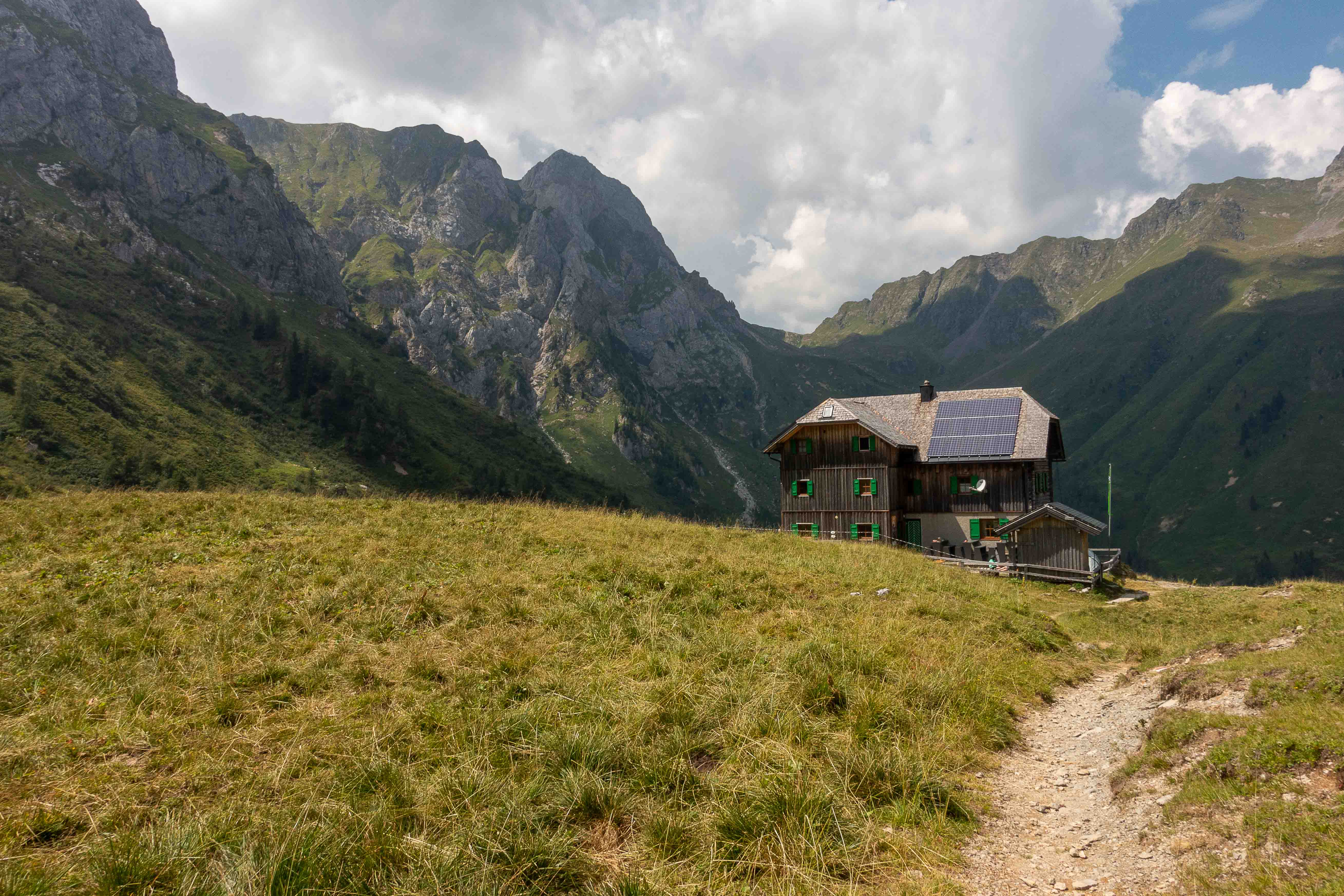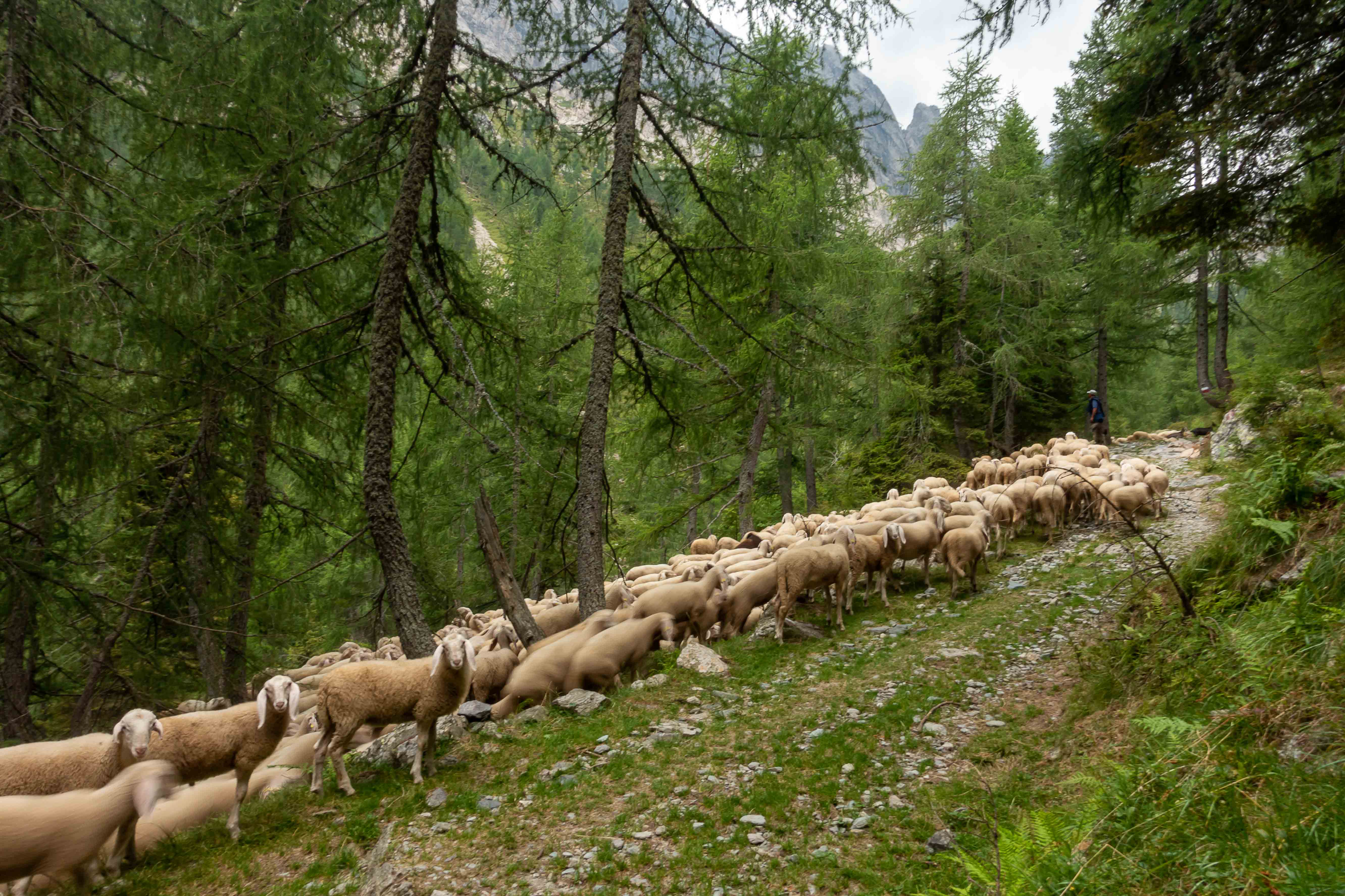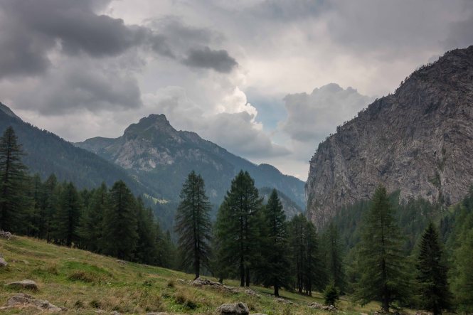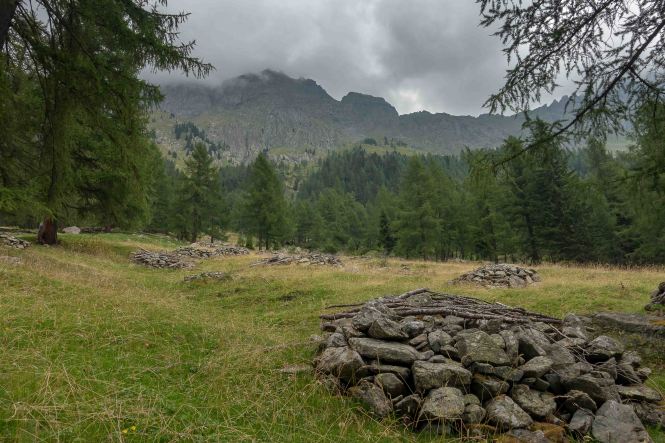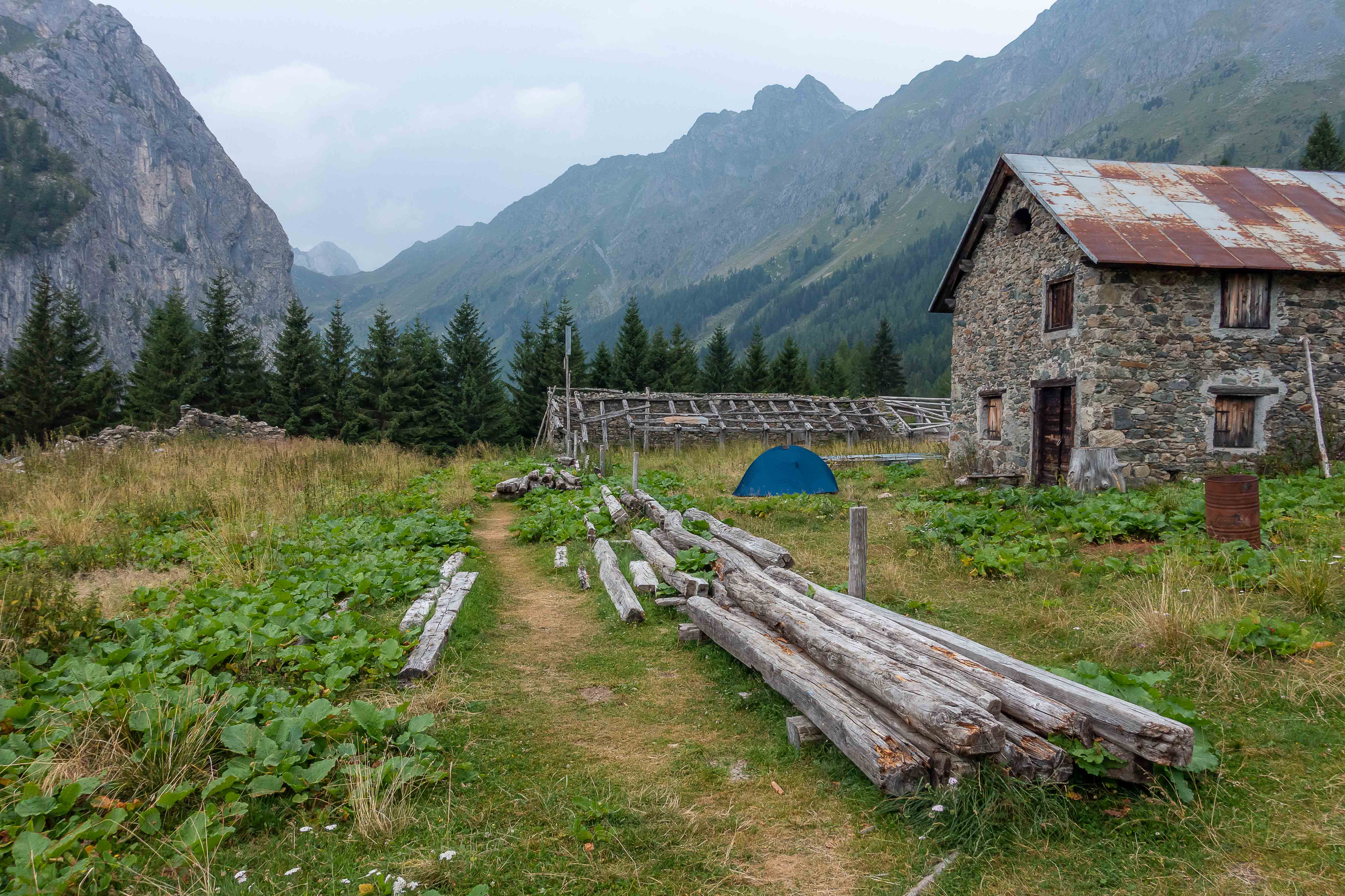 Nun liegen sie vor mir, die schwierigsten Stellen des Karnischen Höhenwegs. Doch der Wanderführer hat den kurzen Aufstieg zur Kammhöhe unterhalb des HOCHSPITZ etwas dramatisiert. Der Steig ist trocken und mit fixen Stahlsteilen gut gesichert, alleine der Schweiß rinnt mir bereits in der frühen Stunde schon wieder in Strömen herunter. Trotzdem tut es gut, oben auf dem Sattel eine erste Rast zu machen und die grandiose Landschaft rundherum zu genießen. Der weitere Weg über die Wiesenhänge zum LUGGAUER TÖRL ist leicht und gemütlich und führt das letzte Stück leicht fallend über alte, gut erhaltene Militärwege. Die ersten Wanderer kommen mir vom HOCHWEISSSTEINHAUS entgegen, meinem Ziel für die Mittagspause. Im morgendlichen Dunst ist die Hütte bereits auf der gegenüberliegenden Talseite zu erahnen. Der obere Weg ist noch gesperrt, auf einem Altschneerest ist die Gefahr derzeit zu groß einzubrechen. Nun heißt es viele Höhenmeter ins FROHNTAL abzusteigen. Es ist schon wieder heiß, die Oberschenkel brennen und meine drei Liter Wasser sind auch schon getrunken. Da plätschert ein kleiner Bach unverhofft durch das Grün, das frische Wasser tut gut. Im Talboden grasen Pferde und Kühe. Das letzte Stück hinauf zum HOCHWEISSSTEINHAUS ist steil und mühsam. Endlich da. Wieder bedienen freundliche junge Menschen auf der Hütte. Was für ein Unterschied zu den früheren Jahren, als der grantige Hüttenwirt einen schon mal die Schuhe hinterher warf. Das erste Bier steht schnell auf dem Tisch, dann gibt es Gemüsesuppe und Leberkäse mit Kartoffeln. Vielleicht noch einen Nachtisch? Es ist ein wunderbarer Apfelstrudel. Immer mehr Übernachtungsgäste kommen, es wird Zeit wieder aufzubrechen. Gleich hinter der Hütte schlängelt sich eine kohlrabenschwarze fingerdicke Schlange durch die Gräser. Angriffslustig attackiert sie den Wanderstock (die Bilder sind leider unscharf). Gemütlich führt der Steig hinauf zum ÖFNER JOCH. Wieder tut sich ein anderer neuer Blick auf: ein langes Tal, ausgefüllt mit einem märchenhaften Lärchenwald. Doch es sind noch viele Höhenmeter hinunter ins VAL FLEONS, aber ich habe ja genügend Energie getankt. Kaum komme ich im Wald an, bellen Hunde, Glöckchen bimmeln und ein Mann gibt lautstark Anweisungen. Ein italienischer Hirte mit seinen zwei Hunden treibt 800 Schafe hinauf zur Alpe. Leider habe ich keine Zigaretten für ihn dabei. Nun fast immer auf gleicher Höhe bleibend erreiche ich meinen heutigen Übernachtungsplatz: die verfallen CESERA SISSANIS DI SOTTO. Vor dem imposanten Haus stelle ich das Zelt auf, von den umliegenden Ställen stehen nur noch die Mauern, die Dächer sind zusammengefallen. Nebenan spritzt ein Wasserhahn. Herrlich, der Schweiß kann mit dem frischen Wasser abgewaschen werden. So schläft es sich gleich viel besser. Kaum bin ich im Zelt, fallen die ersten Regentropfen. So bleibt es auch die Nacht über angenehm kühl.