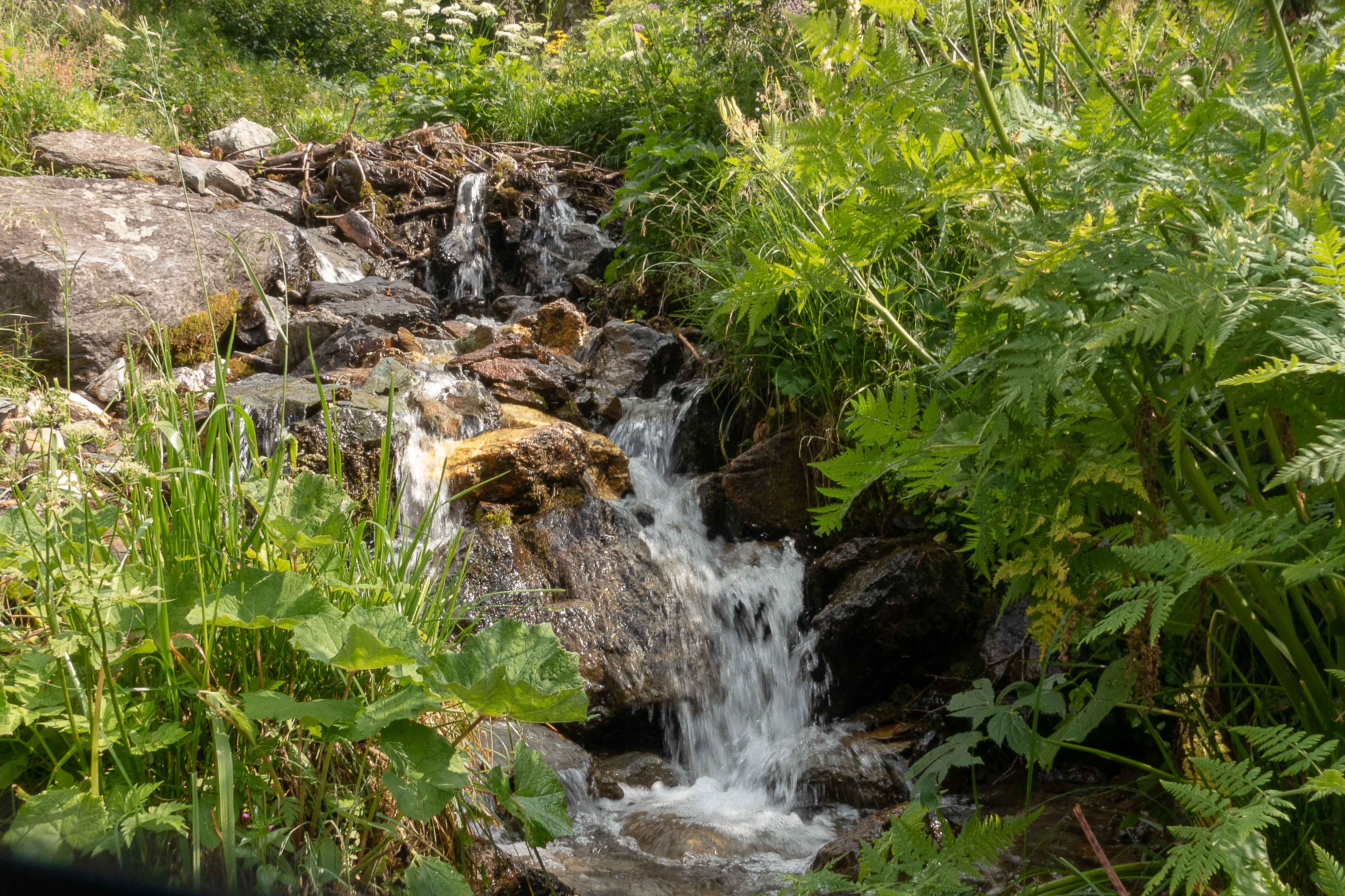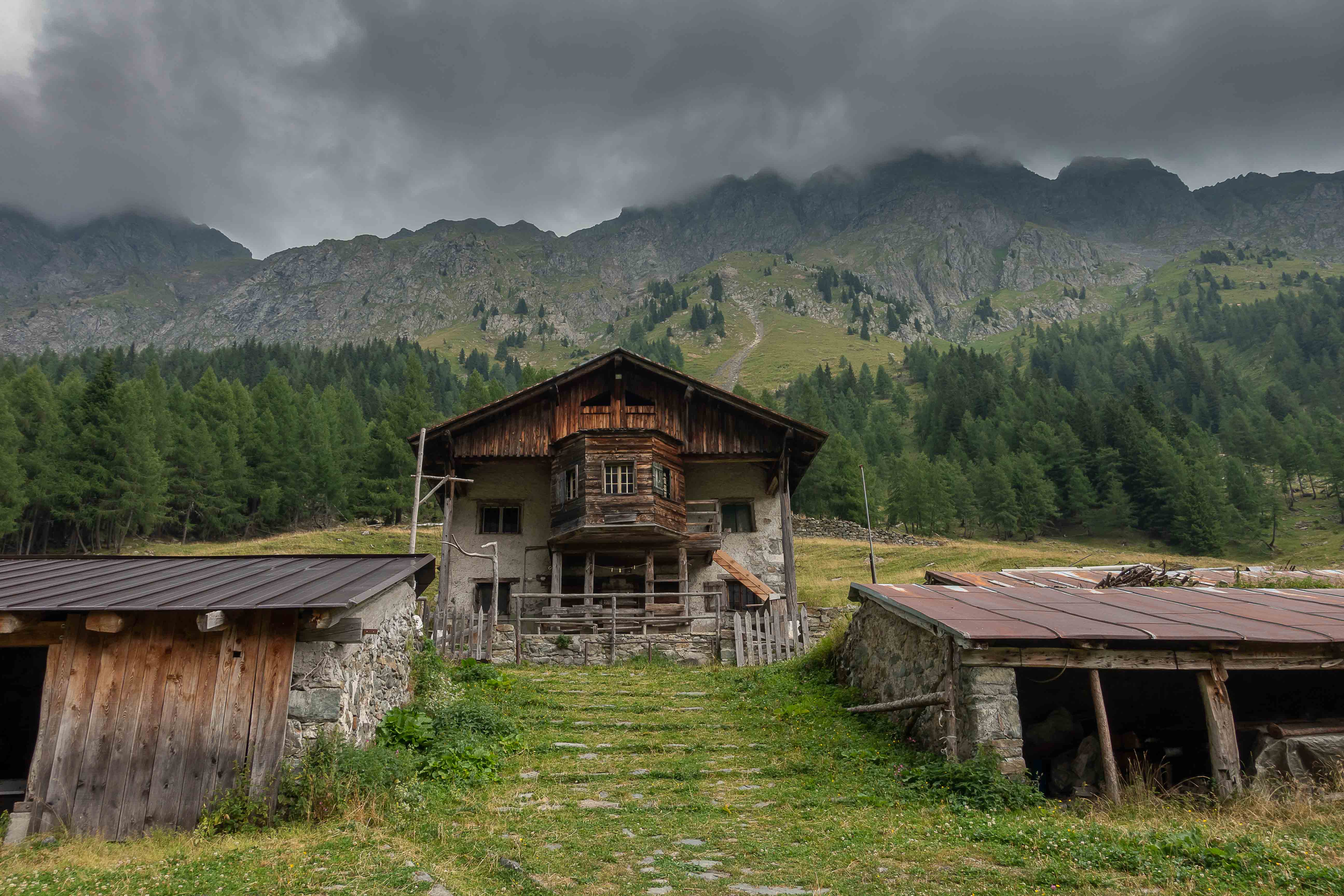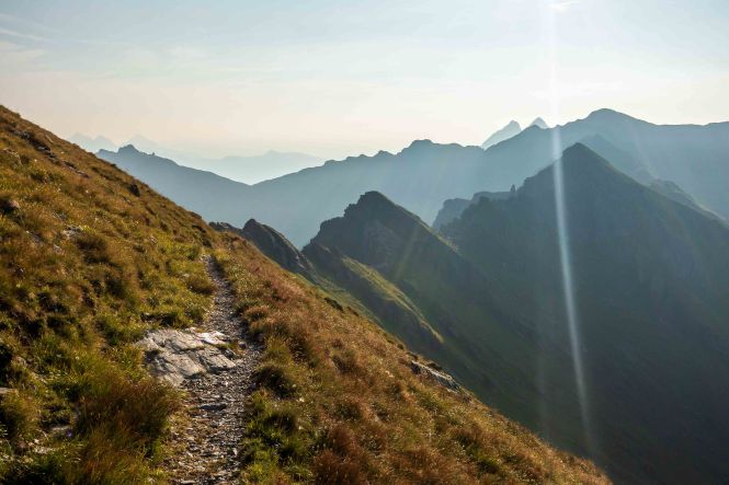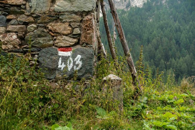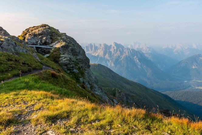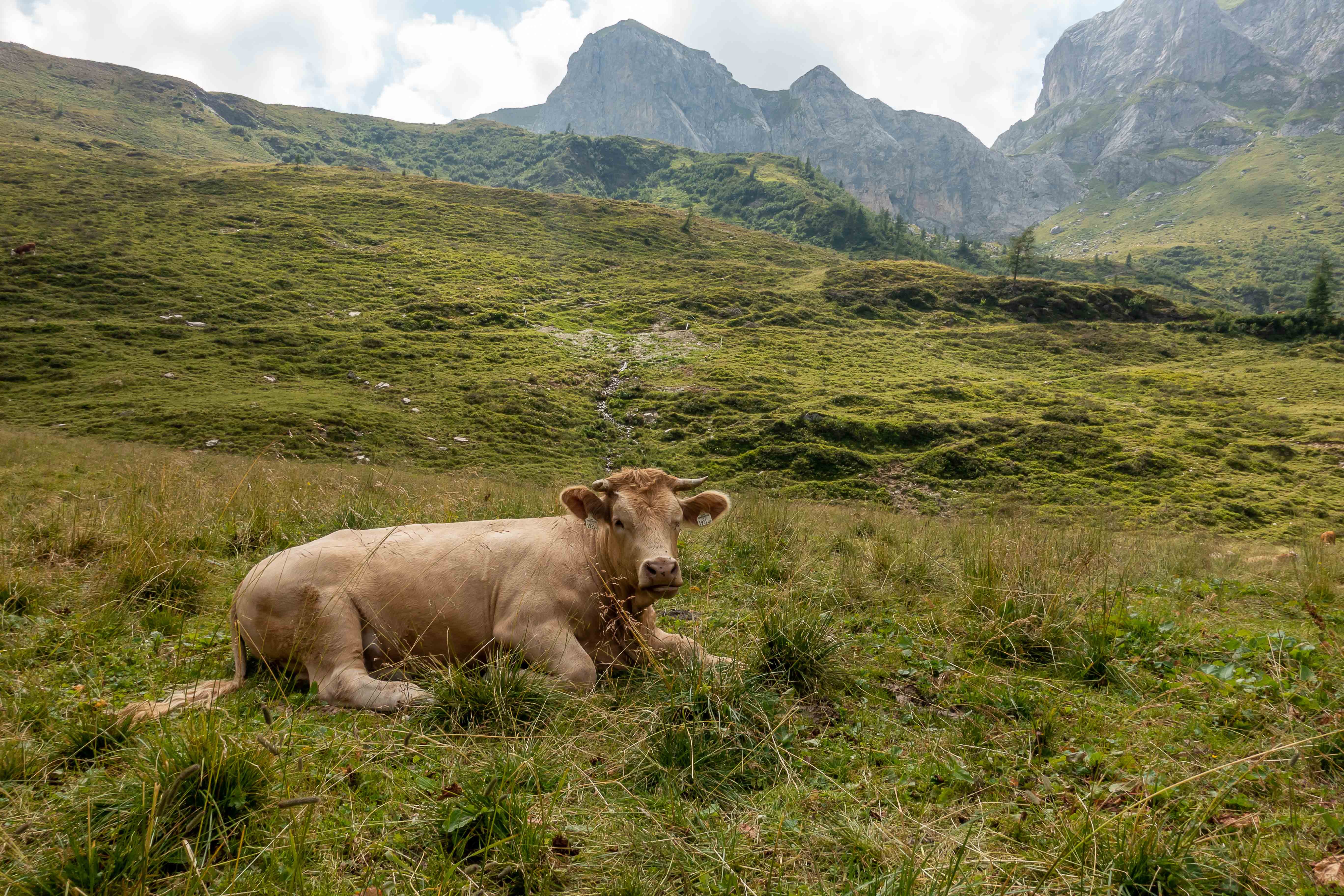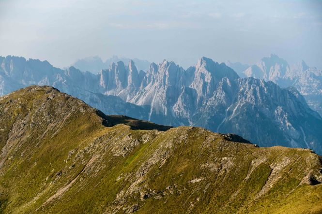 Nun liegen sie vor mir, die schwierigsten Stellen des Karnischen Höhenwegs. Doch der Wanderführer hat den kurzen Aufstieg zur Kammhöhe unterhalb des HOCHSPITZ etwas dramatisiert. Der Steig ist trocken und mit fixen Stahlsteilen gut gesichert, alleine der Schweiß rinnt mir bereits in der frühen Stunde schon wieder in Strömen herunter. Trotzdem tut es gut, oben auf dem Sattel eine erste Rast zu machen und die grandiose Landschaft rundherum zu genießen. Der weitere Weg über die Wiesenhänge zum LUGGAUER TÖRL ist leicht und gemütlich und führt das letzte Stück leicht fallend über alte, gut erhaltene Militärwege. Die ersten Wanderer kommen mir vom HOCHWEISSSTEINHAUS entgegen, meinem Ziel für die Mittagspause. Im morgendlichen Dunst ist die Hütte bereits auf der gegenüberliegenden Talseite zu erahnen. Der obere Weg ist noch gesperrt, auf einem Altschneerest ist die Gefahr derzeit zu groß einzubrechen. Nun heißt es viele Höhenmeter ins FROHNTAL abzusteigen. Es ist schon wieder heiß, die Oberschenkel brennen und meine drei Liter Wasser sind auch schon getrunken. Da plätschert ein kleiner Bach unverhofft durch das Grün, das frische Wasser tut gut. Im Talboden grasen Pferde und Kühe. Das letzte Stück hinauf zum HOCHWEISSSTEINHAUS ist steil und mühsam. Endlich da. Wieder bedienen freundliche junge Menschen auf der Hütte. Was für ein Unterschied zu den früheren Jahren, als der grantige Hüttenwirt einen schon mal die Schuhe hinterher warf. Das erste Bier steht schnell auf dem Tisch, dann gibt es Gemüsesuppe und Leberkäse mit Kartoffeln. Vielleicht noch einen Nachtisch? Es ist ein wunderbarer Apfelstrudel. Immer mehr Übernachtungsgäste kommen, es wird Zeit wieder aufzubrechen. Gleich hinter der Hütte schlängelt sich eine kohlrabenschwarze fingerdicke Schlange durch die Gräser. Angriffslustig attackiert sie den Wanderstock (die Bilder sind leider unscharf). Gemütlich führt der Steig hinauf zum ÖFNER JOCH. Wieder tut sich ein anderer neuer Blick auf: ein langes Tal, ausgefüllt mit einem märchenhaften Lärchenwald. Doch es sind noch viele Höhenmeter hinunter ins VAL FLEONS, aber ich habe ja genügend Energie getankt. Kaum komme ich im Wald an, bellen Hunde, Glöckchen bimmeln und ein Mann gibt lautstark Anweisungen. Ein italienischer Hirte mit seinen zwei Hunden treibt 800 Schafe hinauf zur Alpe. Leider habe ich keine Zigaretten für ihn dabei. Nun fast immer auf gleicher Höhe bleibend erreiche ich meinen heutigen Übernachtungsplatz: die verfallen CESERA SISSANIS DI SOTTO. Vor dem imposanten Haus stelle ich das Zelt auf, von den umliegenden Ställen stehen nur noch die Mauern, die Dächer sind zusammengefallen. Nebenan spritzt ein Wasserhahn. Herrlich, der Schweiß kann mit dem frischen Wasser abgewaschen werden. So schläft es sich gleich viel besser. Kaum bin ich im Zelt, fallen die ersten Regentropfen. So bleibt es auch die Nacht über angenehm kühl.