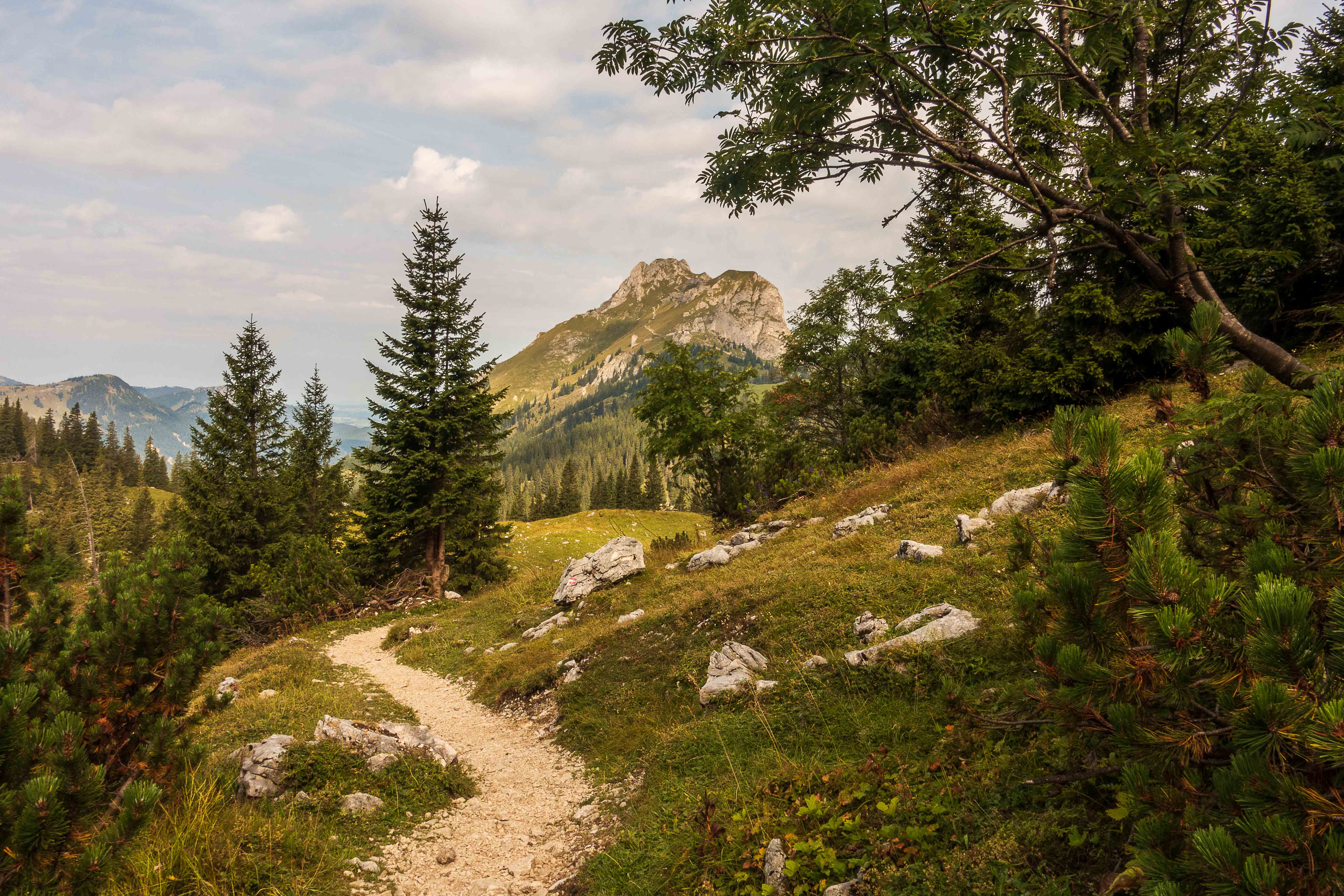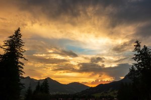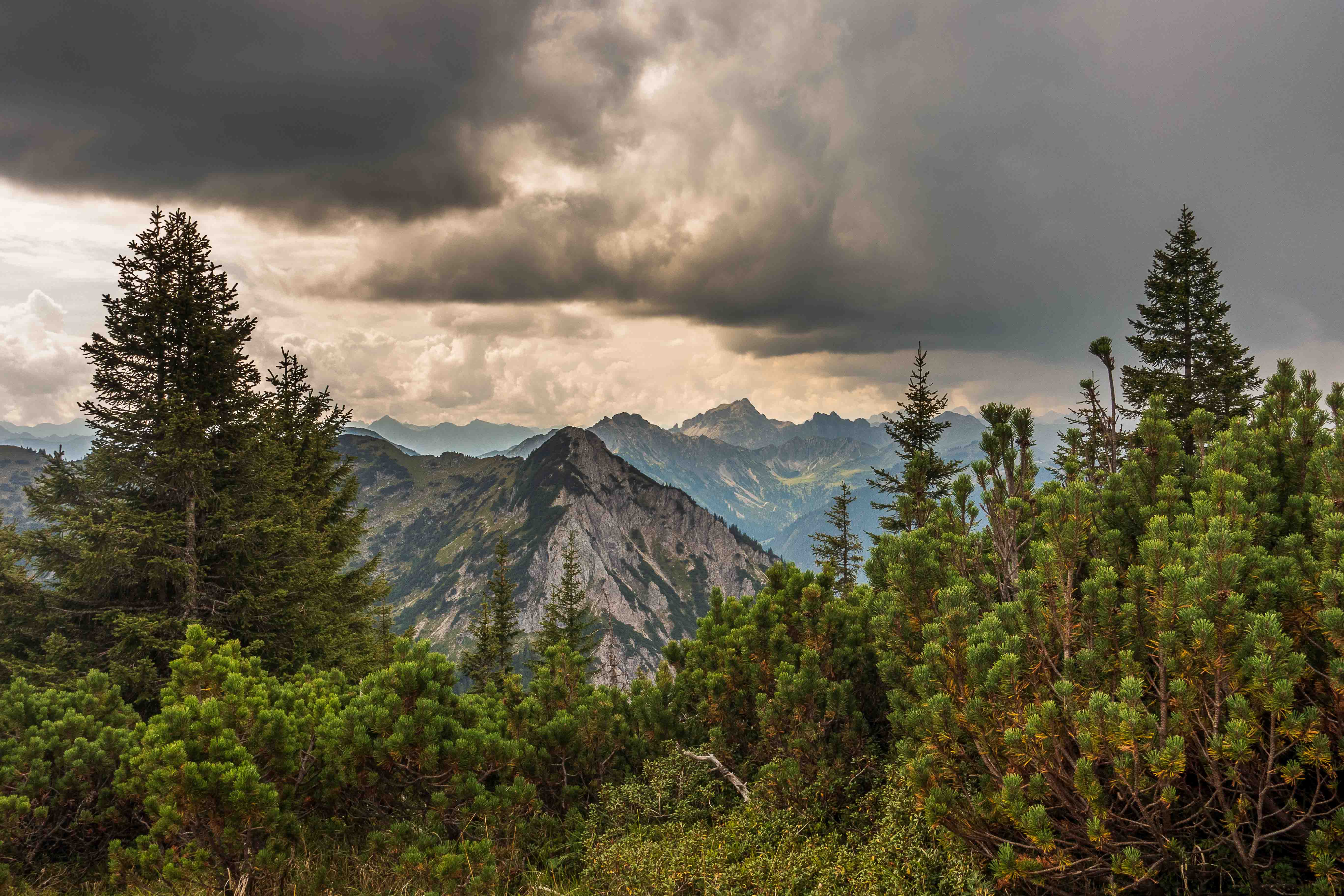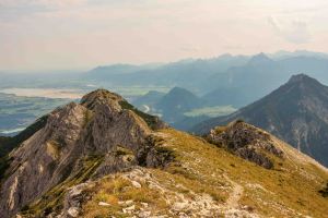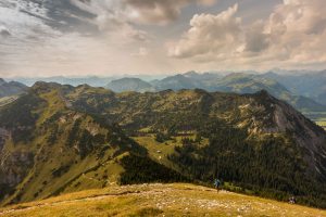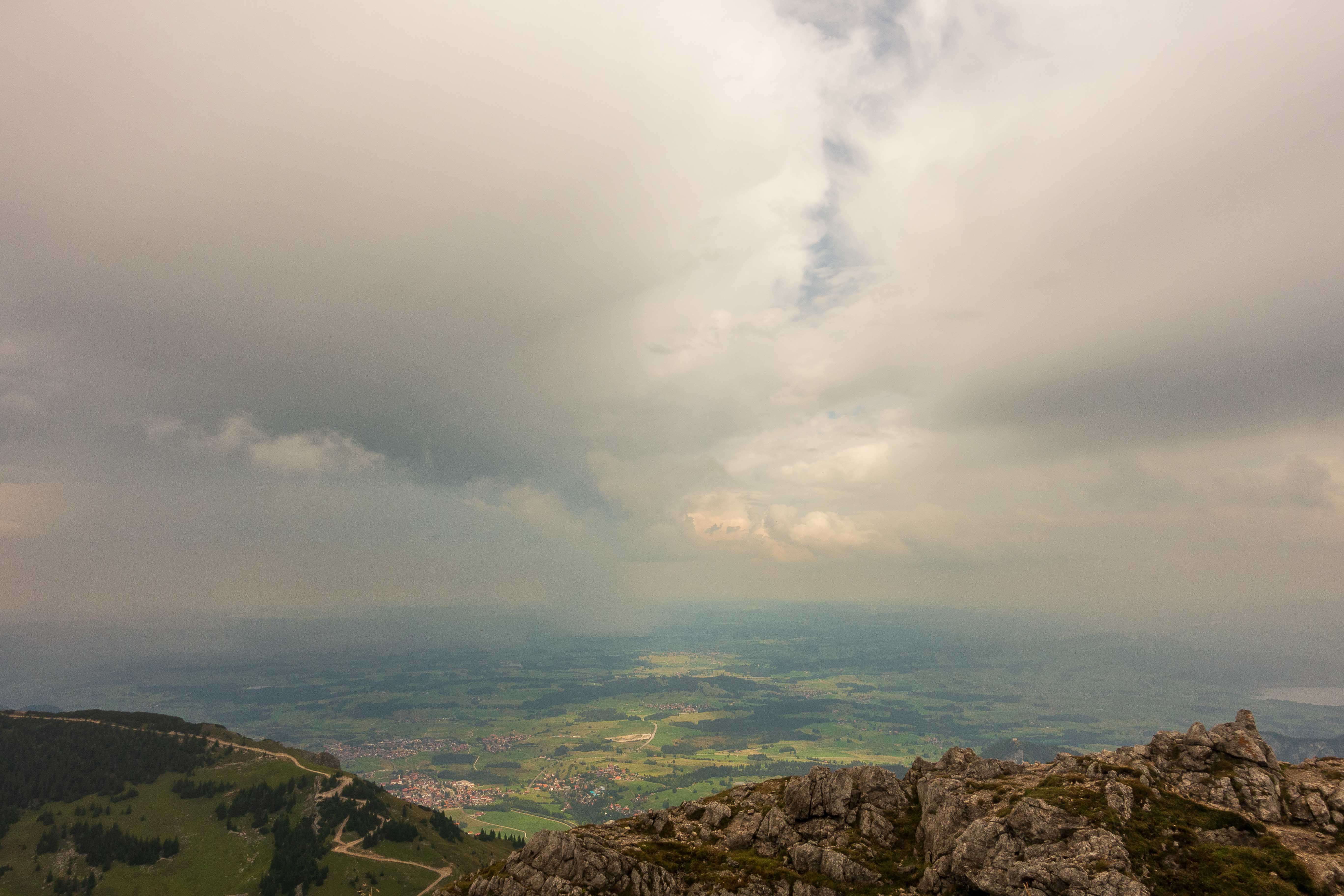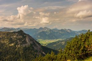 Für unseren letzten gemeinsamen Tag im TANNHEIMER TAL waren schon für den Vormittag Regenschauer und Gewitter vorhergesagt. Also verzichten wir auf einen Flug und schnüren die Wanderschuhe für eine Tagestour. Wir ersparen uns den trostlosen Aufstieg über die breite Schipiste hinauf zum FÜSSENER JÖCHL und gönnen uns die bequeme Seilbahn. Mit leichtem Rucksack fliegen wir förmlich über die Steige. Der GRÄNER HÖHENWEG führt uns durch das liebliche SEBENTAL. Vor der gleichnamigen Alpe frühstückt ein junge Familie, die kleinen Kinder springen in Windeln um die Holzhütte. Über den TANNHEIMER HÖHENWEG erreichen wir das 2001 m hohe BRENTENJOCH. Der Blick in alle Himmelsrichtungen wird am Horizont durch die ersten Regenschauer begrenzt, schwarze regenschwere Wolken bilden sich in allen Himmelsrichtungen. Geschwind steigen wir durch die Latschen, immer entlang dem Grat mit Tiefblick ins VILSTAL, zur BAD KISSINGER HÜTTE ab. Kaum steht die dampfende Speckknödelsuppe vor uns, schüttet es draußen schon wie aus Kübeln. Doch die Natur wird nur kurze Zeit gegossen. Die Wege und auch der letzte steile Anstieg über gut gesicherte Felsen hinauf zum markanten AGGENSTEIN sind gut zu machen. Da es über den Bergen erneut lang andauernd donnert, verlassen wir den ausgesetzten Gipfel. Und wieder holt uns ein Regenschauer ein. So muss ich leider in der einladenden Hütte noch einen Käsekuchen zu einem Haferl Kaffee essen. Auf dem Rückweg zur Talstation regnet es immer ein wenig, doch die hoch aufragenden Tannen halten die meisten Tropfen von uns ab. Christian verabschiedet sich nach fünf wunderbaren Tagen, ich hole meine Tochter am Bahnhof in Füssen ab.