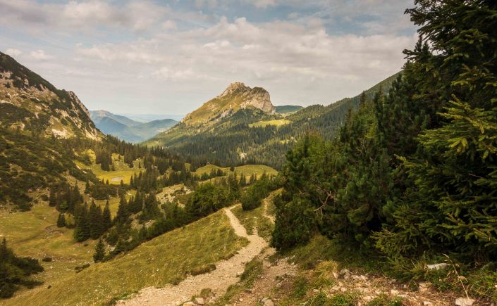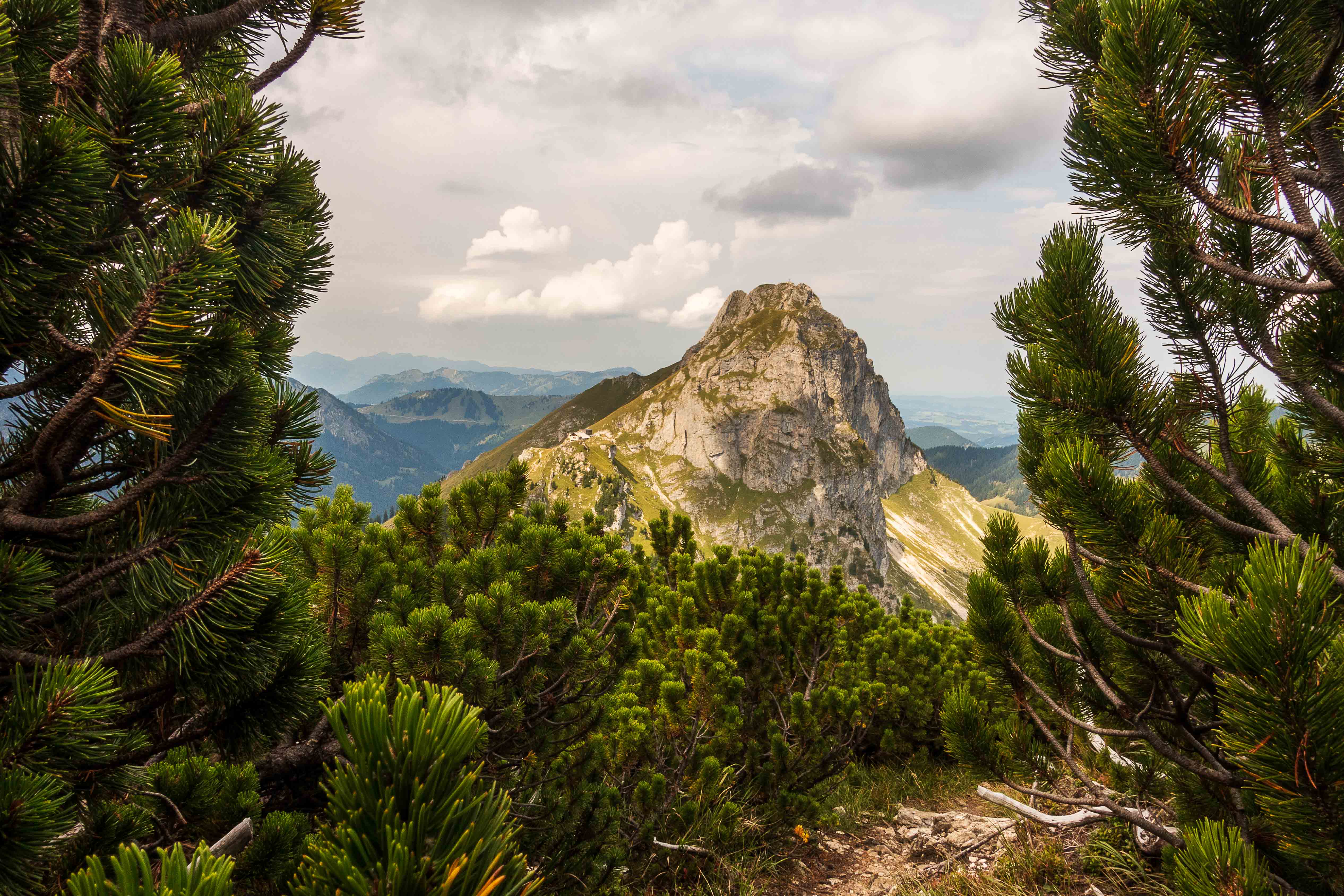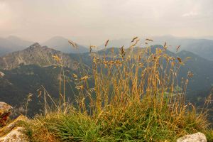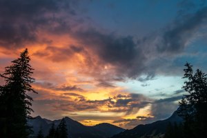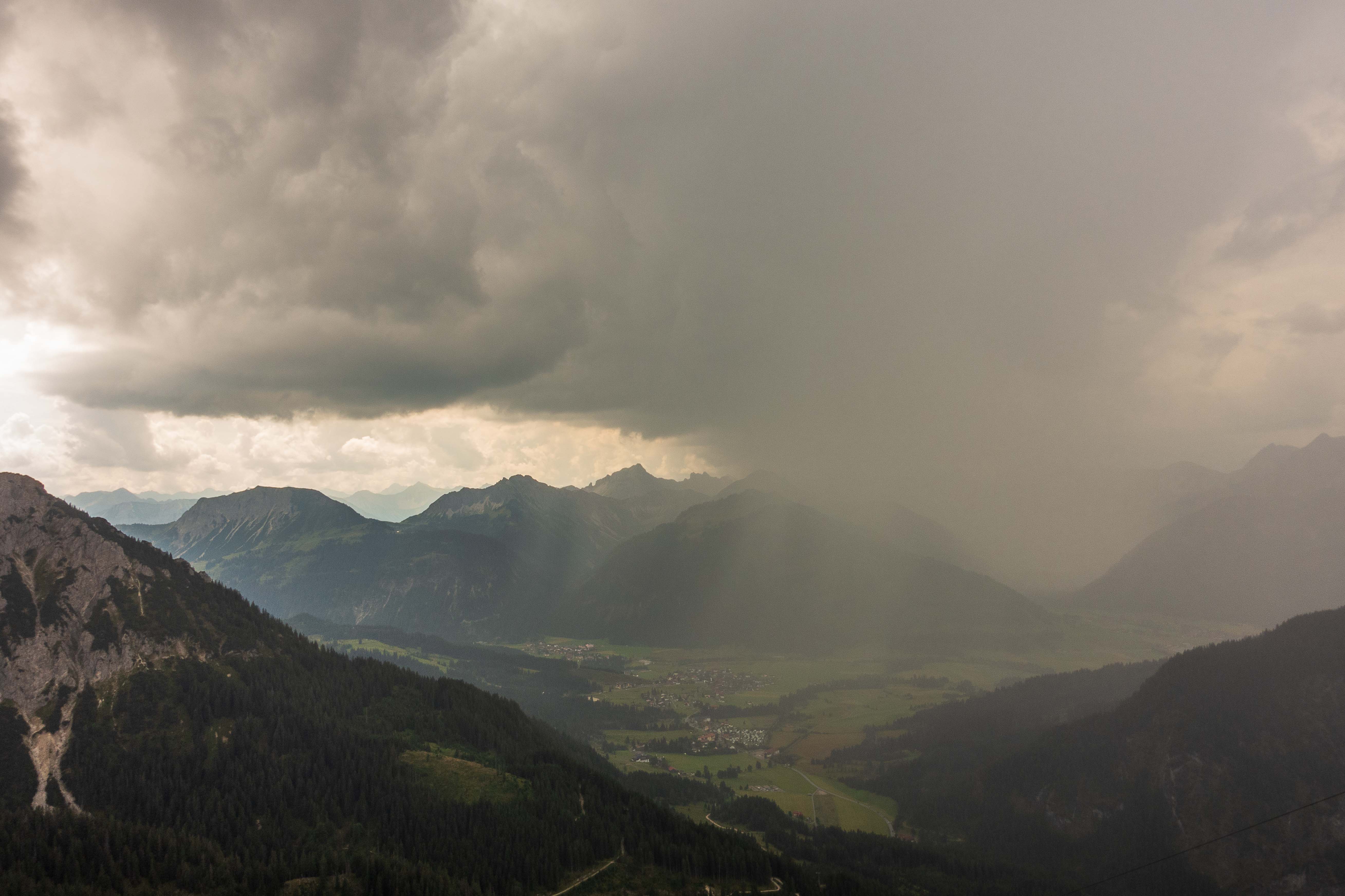 Für unseren letzten gemeinsamen Tag im TANNHEIMER TAL waren schon für den Vormittag Regenschauer und Gewitter vorhergesagt. Also verzichten wir auf einen Flug und schnüren die Wanderschuhe für eine Tagestour. Wir ersparen uns den trostlosen Aufstieg über die breite Schipiste hinauf zum FÜSSENER JÖCHL und gönnen uns die bequeme Seilbahn. Mit leichtem Rucksack fliegen wir förmlich über die Steige. Der GRÄNER HÖHENWEG führt uns durch das liebliche SEBENTAL. Vor der gleichnamigen Alpe frühstückt ein junge Familie, die kleinen Kinder springen in Windeln um die Holzhütte. Über den TANNHEIMER HÖHENWEG erreichen wir das 2001 m hohe BRENTENJOCH. Der Blick in alle Himmelsrichtungen wird am Horizont durch die ersten Regenschauer begrenzt, schwarze regenschwere Wolken bilden sich in allen Himmelsrichtungen. Geschwind steigen wir durch die Latschen, immer entlang dem Grat mit Tiefblick ins VILSTAL, zur BAD KISSINGER HÜTTE ab. Kaum steht die dampfende Speckknödelsuppe vor uns, schüttet es draußen schon wie aus Kübeln. Doch die Natur wird nur kurze Zeit gegossen. Die Wege und auch der letzte steile Anstieg über gut gesicherte Felsen hinauf zum markanten AGGENSTEIN sind gut zu machen. Da es über den Bergen erneut lang andauernd donnert, verlassen wir den ausgesetzten Gipfel. Und wieder holt uns ein Regenschauer ein. So muss ich leider in der einladenden Hütte noch einen Käsekuchen zu einem Haferl Kaffee essen. Auf dem Rückweg zur Talstation regnet es immer ein wenig, doch die hoch aufragenden Tannen halten die meisten Tropfen von uns ab. Christian verabschiedet sich nach fünf wunderbaren Tagen, ich hole meine Tochter am Bahnhof in Füssen ab.