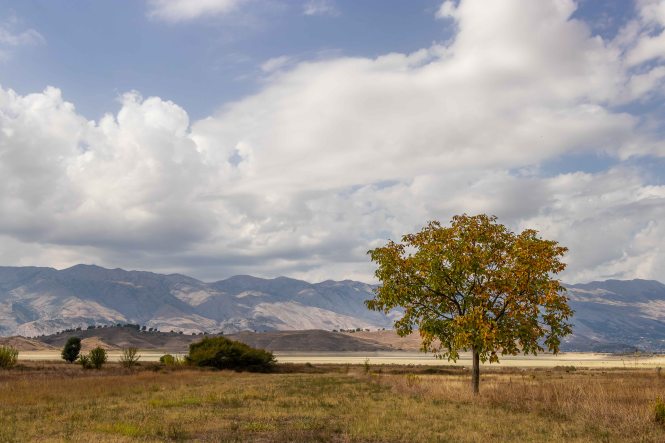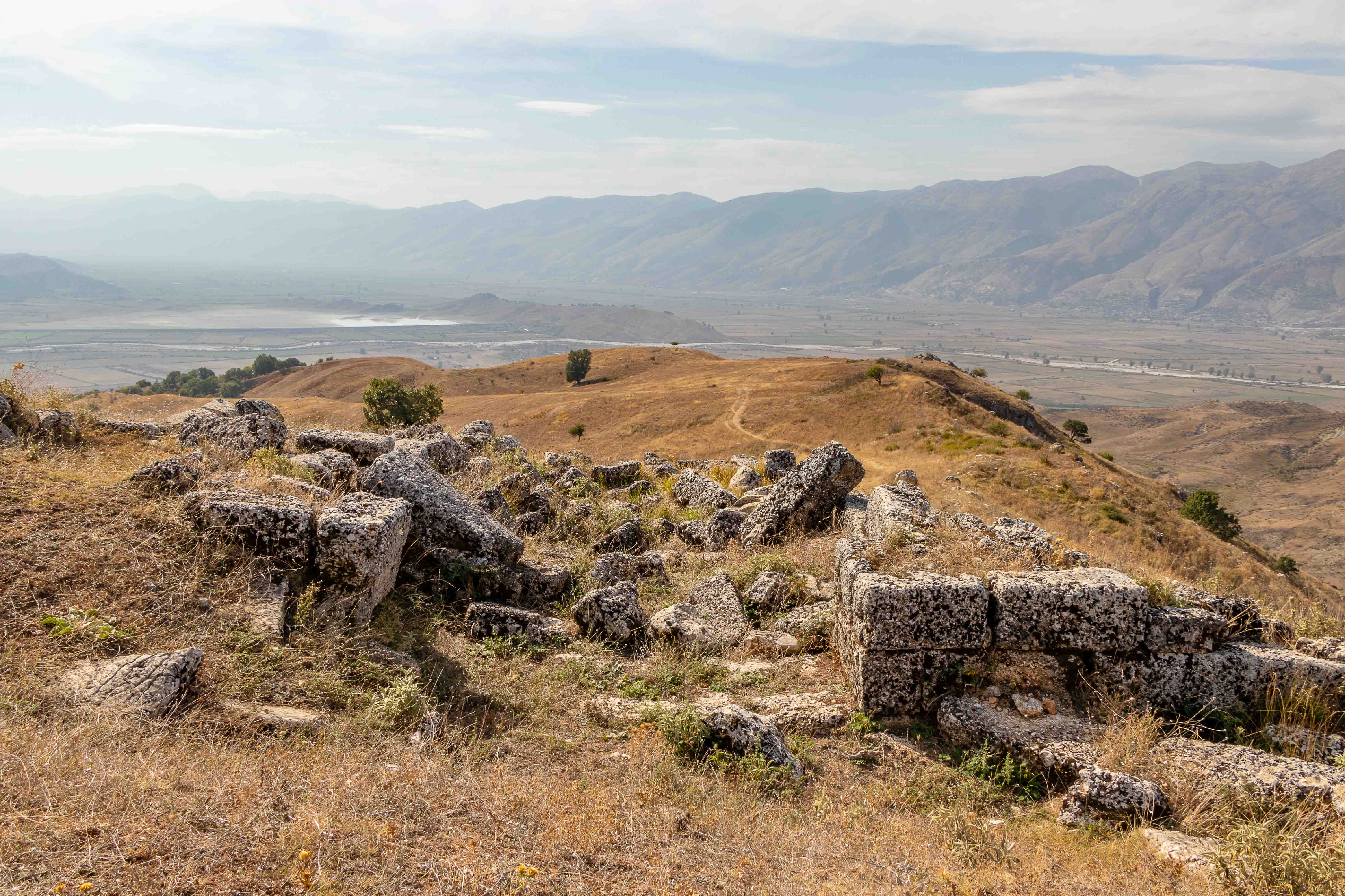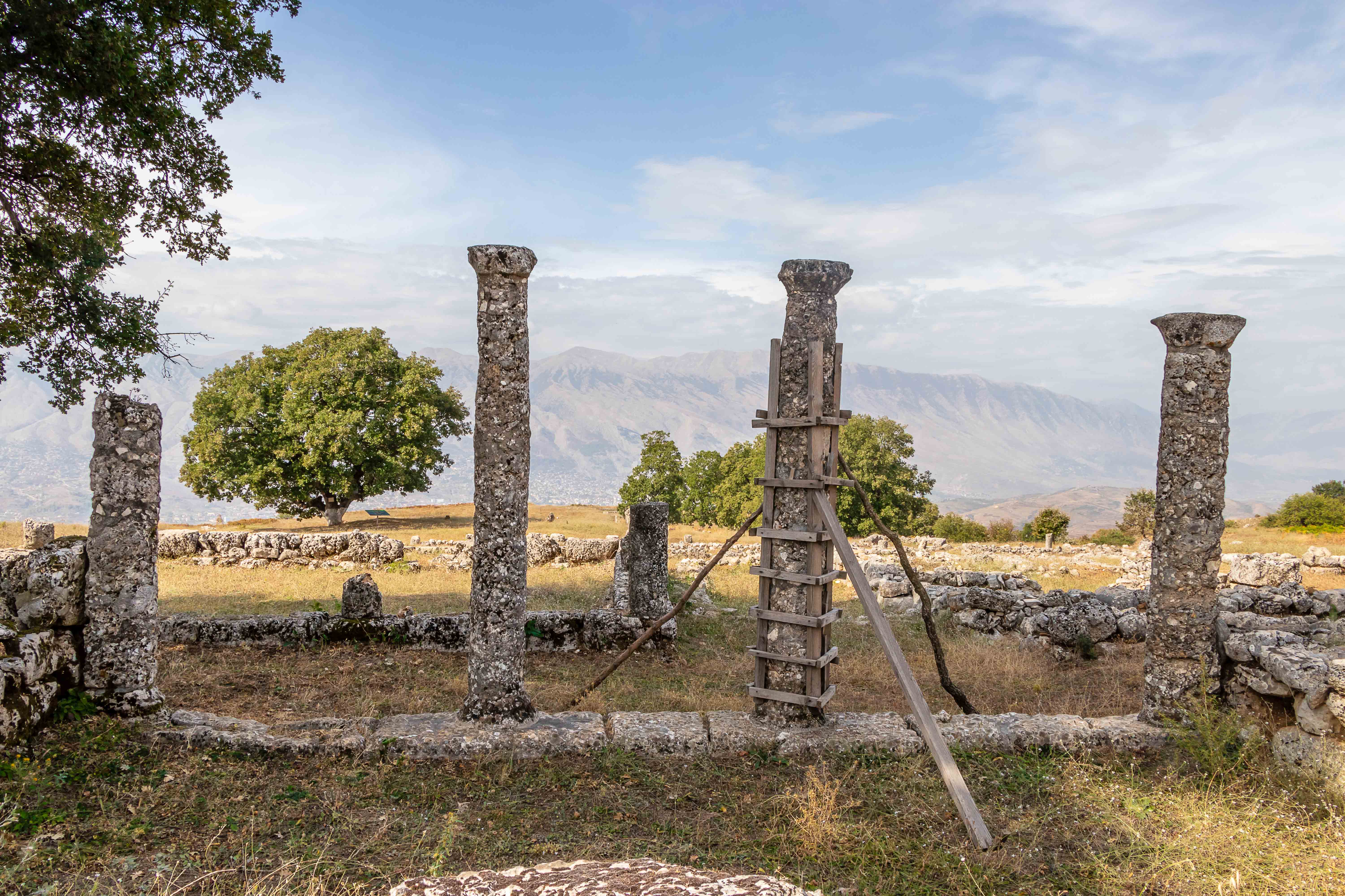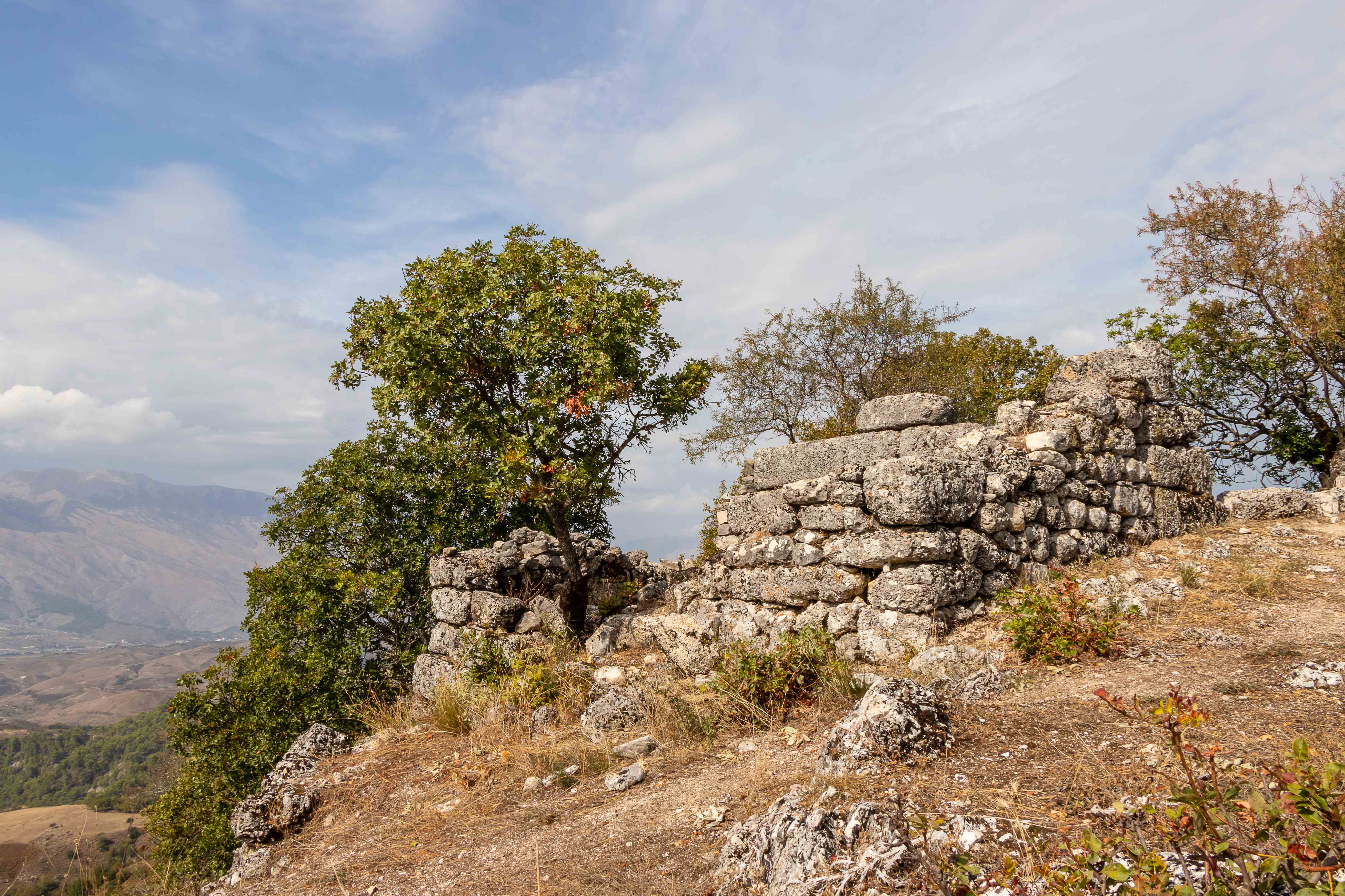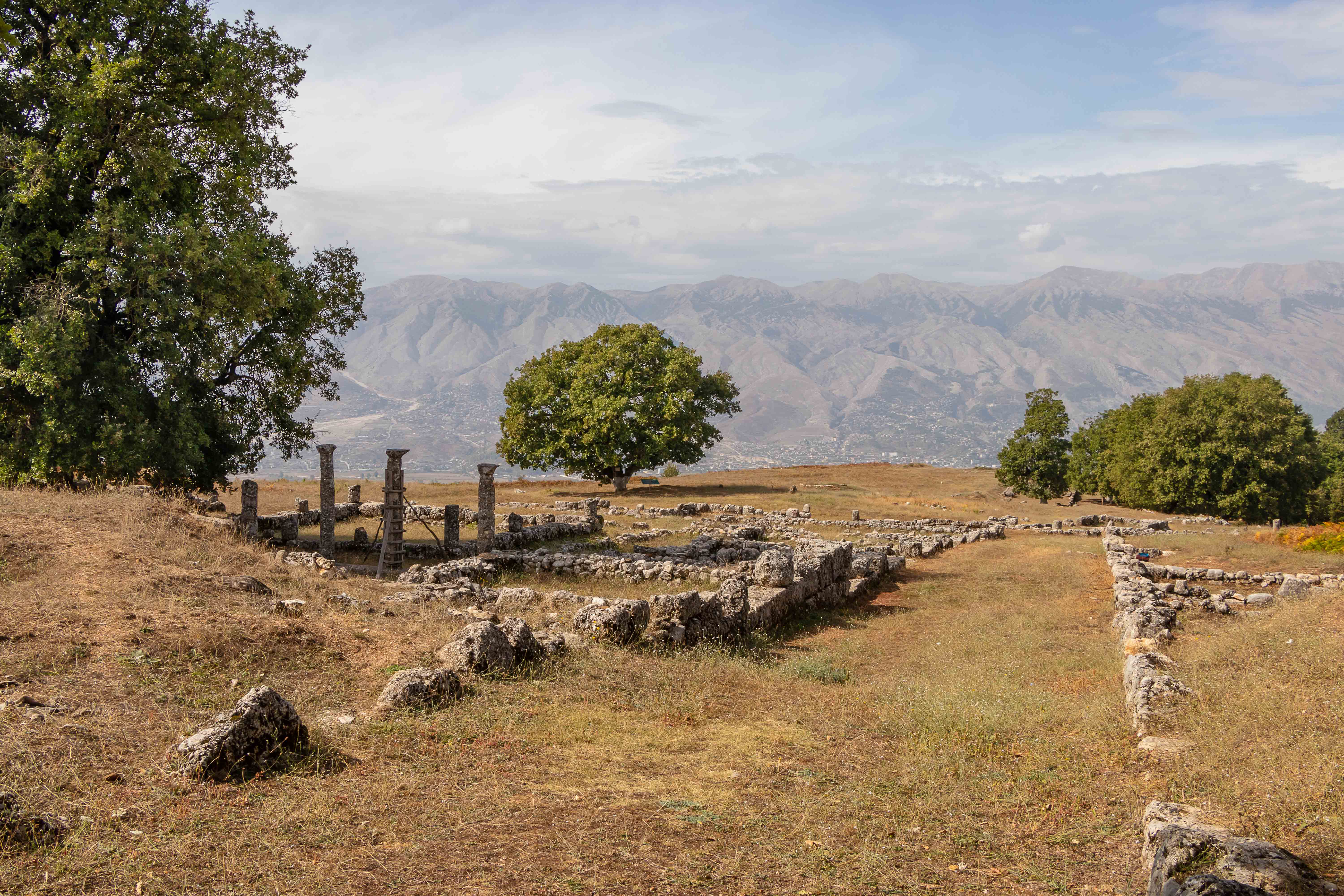 Anderntags erklimmen wir auf enger aber guter Straße den Hang auf der Gegenseite von GJIROKASTRA, um zu den Ruinen von ANTIGONEA zu gelangen. Der Hilfsaufseher spurtet schon zum Kassenhäuschen, um uns pünktlich um 9 Uhr einzulassen. Der Hauptaufseher kassiert 200 Lek und rückt auf Nachfrage einen ausführlichen Übersichtsplan des Geländes heraus. Der Molosserkönig Pyrrus gründete 295 v. Chr. die Stadt auf einem Hochplateau über dem DRINOS-TAL und benannte sie nach seiner Frau. Das riesige Gelände mit den Fragmenten der vier Kilometer langen Stadtmauer lässt die einstige Bedeutung der Ansiedlung erahnen. Doch als die Römer den makedonischen König Phillipp V. besiegten, nahmen sie auch an dessen langjährigen Bündnispartnern Rache, verwüsteten 167 v. Chr. neben ANTIGONEA auch weitere siebzig illyrische Städte und versklavten die Einwohner. So ist bis auf ein paar Mauer- und Säulenreste von der einst prächtigen Stadt heute nicht mehr viel zu sehen. Da ist es gut, dass die mächtigen, alleine stehenden Eichen dem alten Ort eine gewisse Würde und verwunschene Ausstrahlung verleihen.