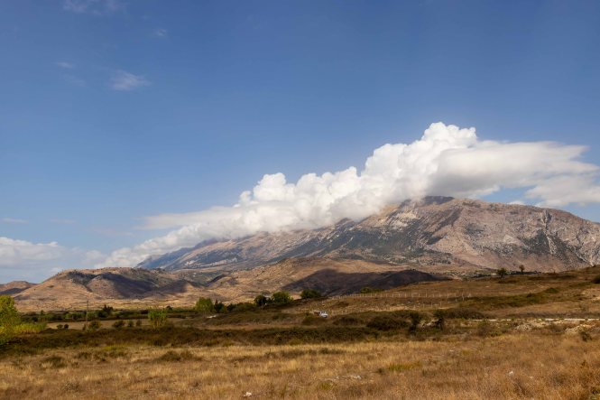 Schnell sind wir an der Grenze und verlassen für einige Zeit Griechenland. Der albanische Zöllner ist freundlich, redet mit uns und ist stolz auf sein Land. (Er hat bestimmt noch nicht die europäische Zöllnerschule besucht.) Die Landschaft im Tal des DRINOS zeigt sich ganz verändert: Das Tal ist breit, die hoch aufragenden Berge der beiden Gebirgsketten sind karg und fast ohne Vegetation, an den Hängen kleben Dörfer.
