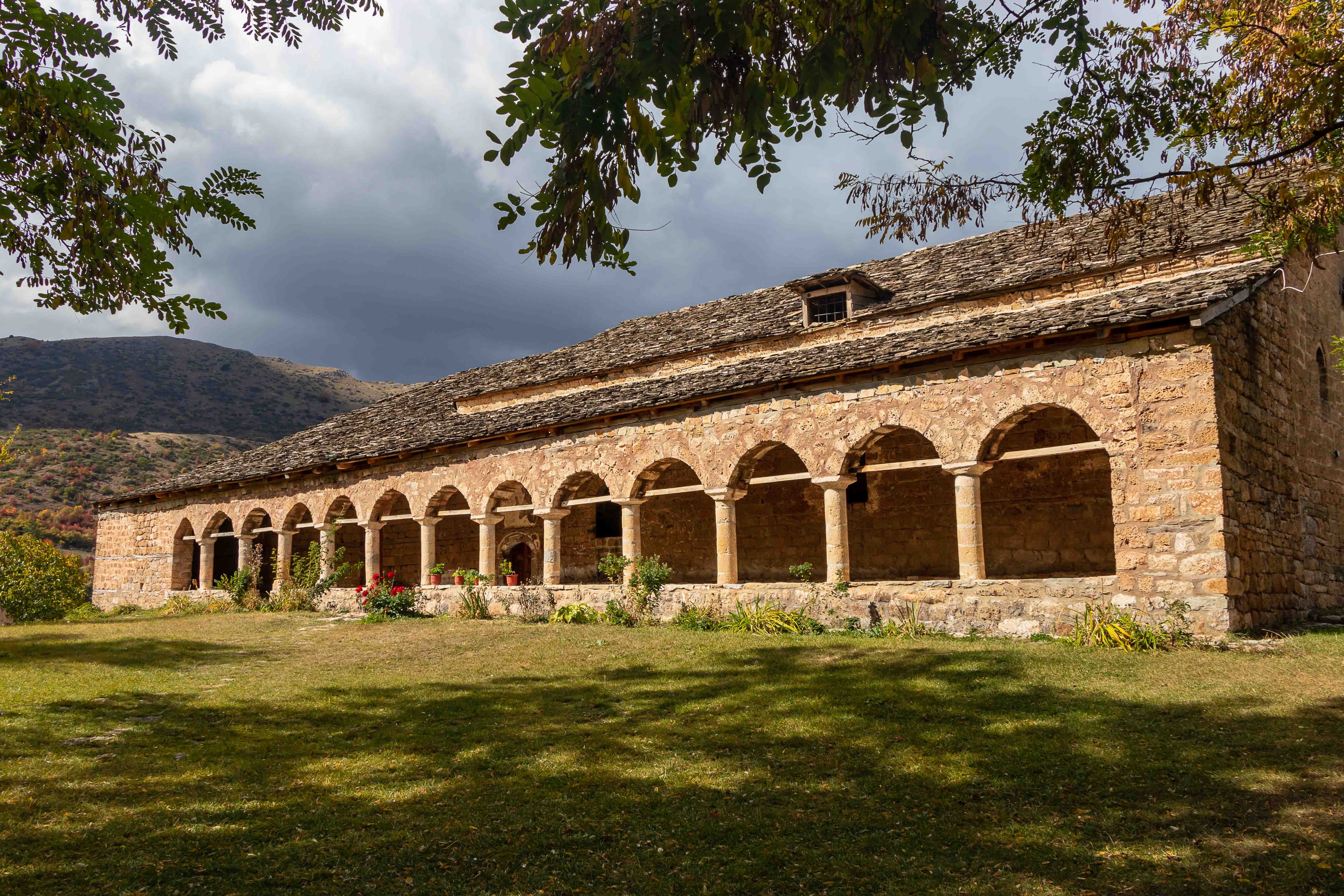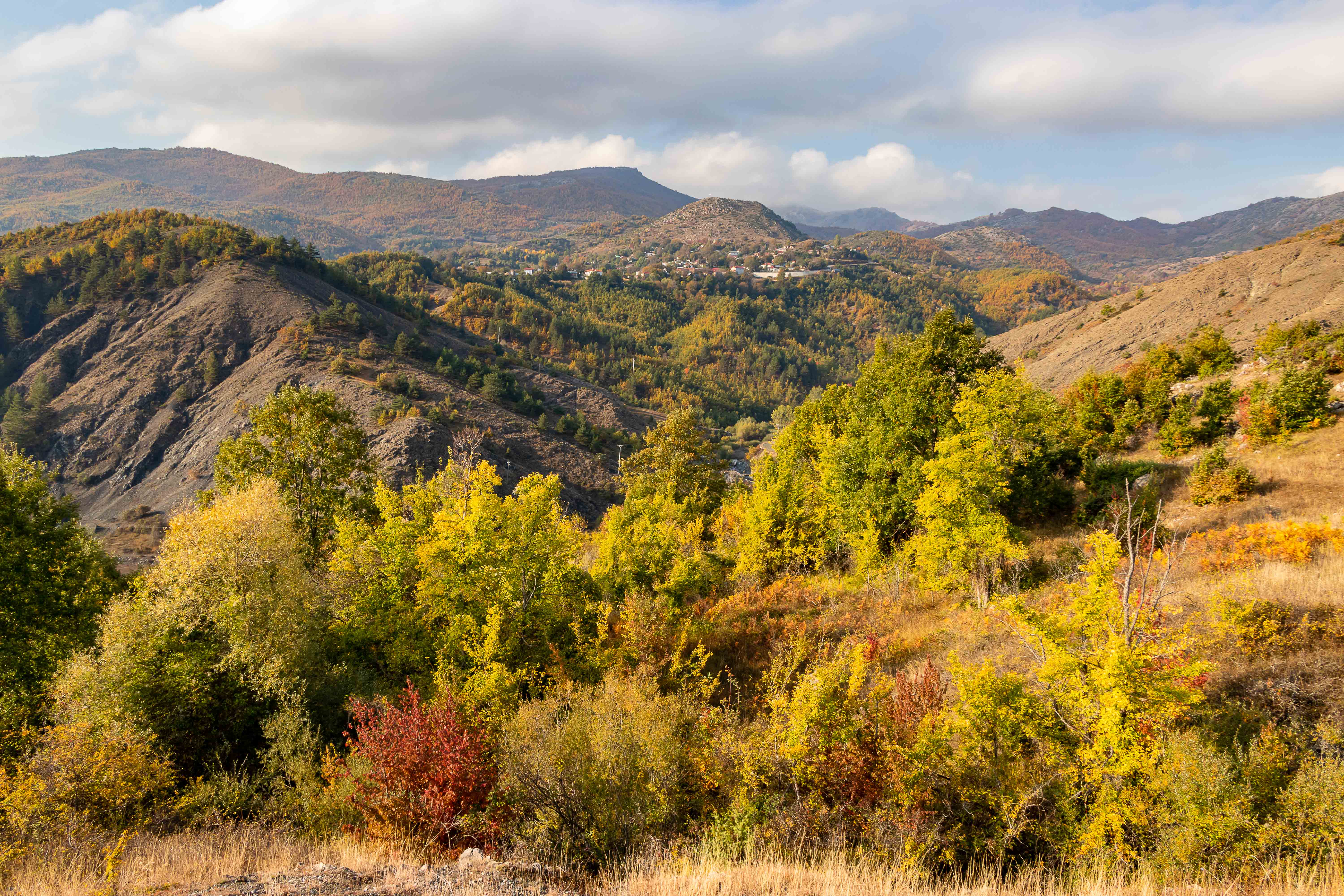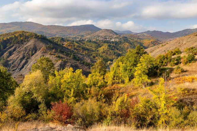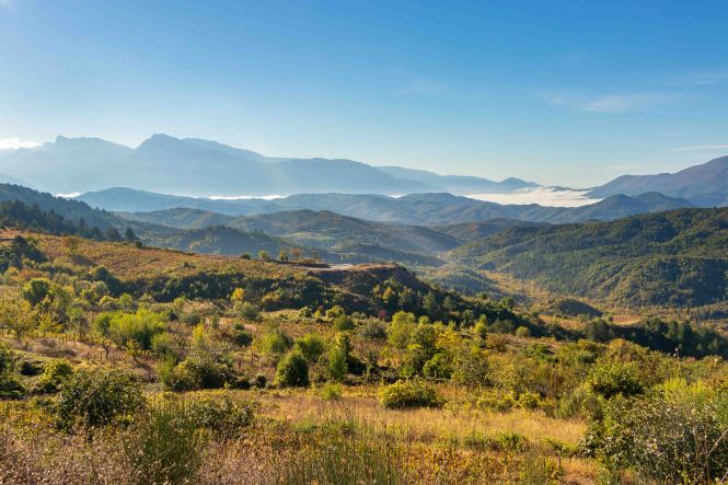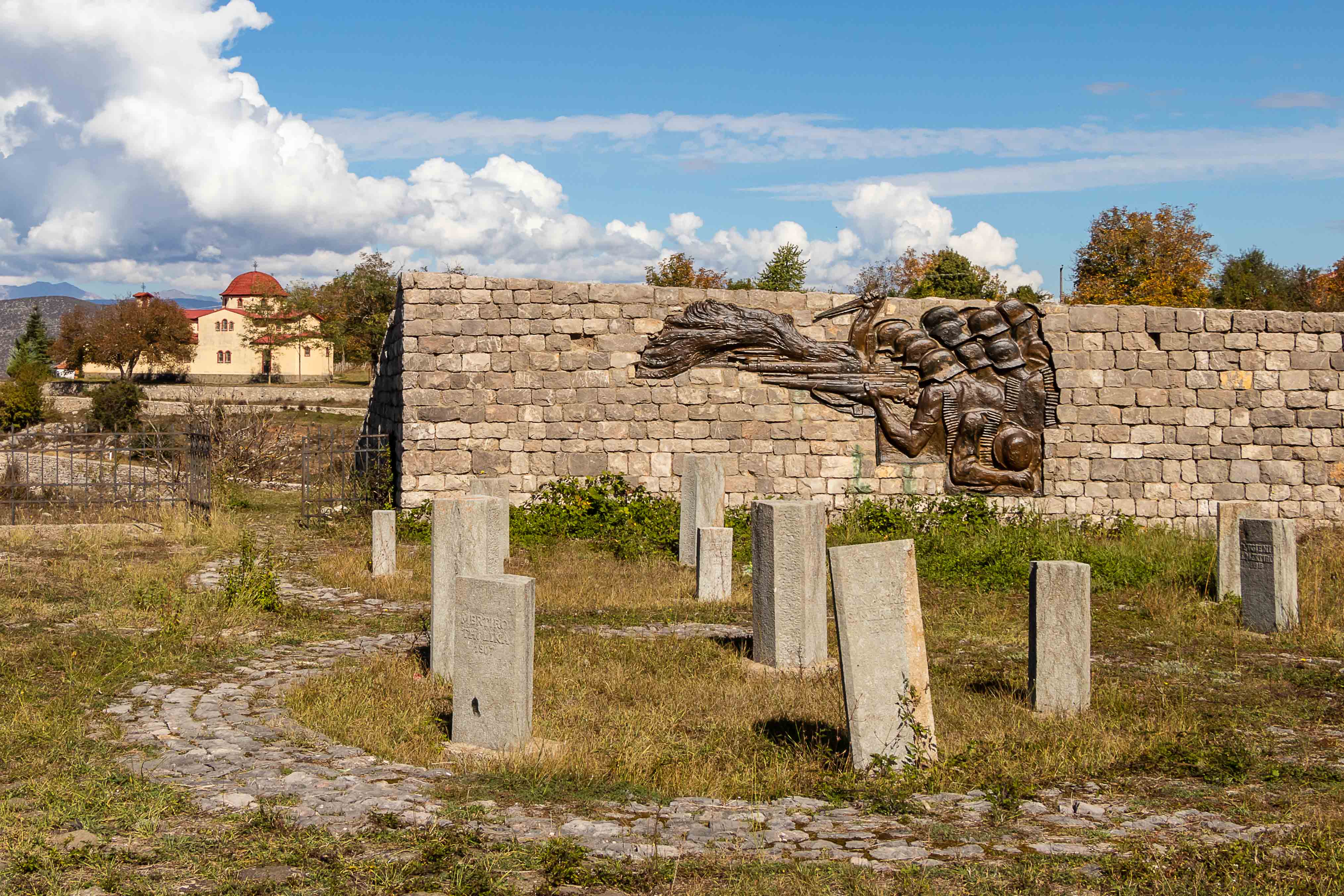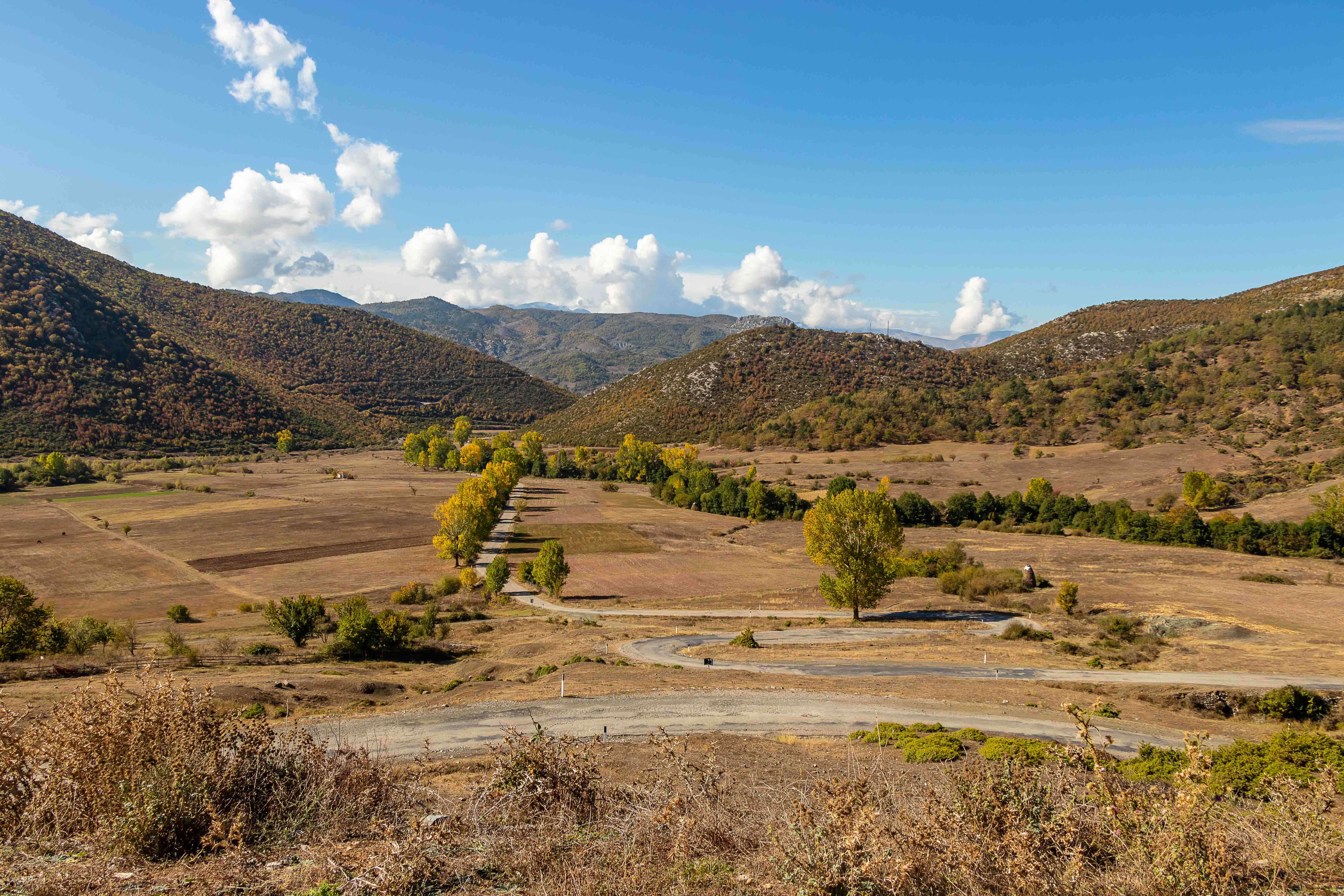 Wir verlassen das Tal der VJOSA und wenden uns nach Norden. Die Straße wird schmaler und die Schlaglöcher mehren sich. LESKOVIC, schon auf 900 m gelegen, ist mit 4500 Einwohner die letzte größere Ortschaft, dann wird es einsam. Die schroffen Kalkberge der MALËSIA E NEMËRÇKËS tauchen hinter den Hügeln auf und begleiten uns noch ein Stück. Waldreiche Täler wechseln mit felsigen Gebirgsschluchten, weiten Ebenen und lichten Kiefernwäldern. Am Straßenrand leuchten die Pappeln im herbstlichen Gelb. In BOROVO konfrontiert uns ein Denkmal mit der deutschen Geschichte: In dem abgeschiedenen Dorf haben Gebirgsjäger 1943 in einer furchtbaren Vergeltungsaktion 116 ältere Menschen und auch Kinder hingerichtet.