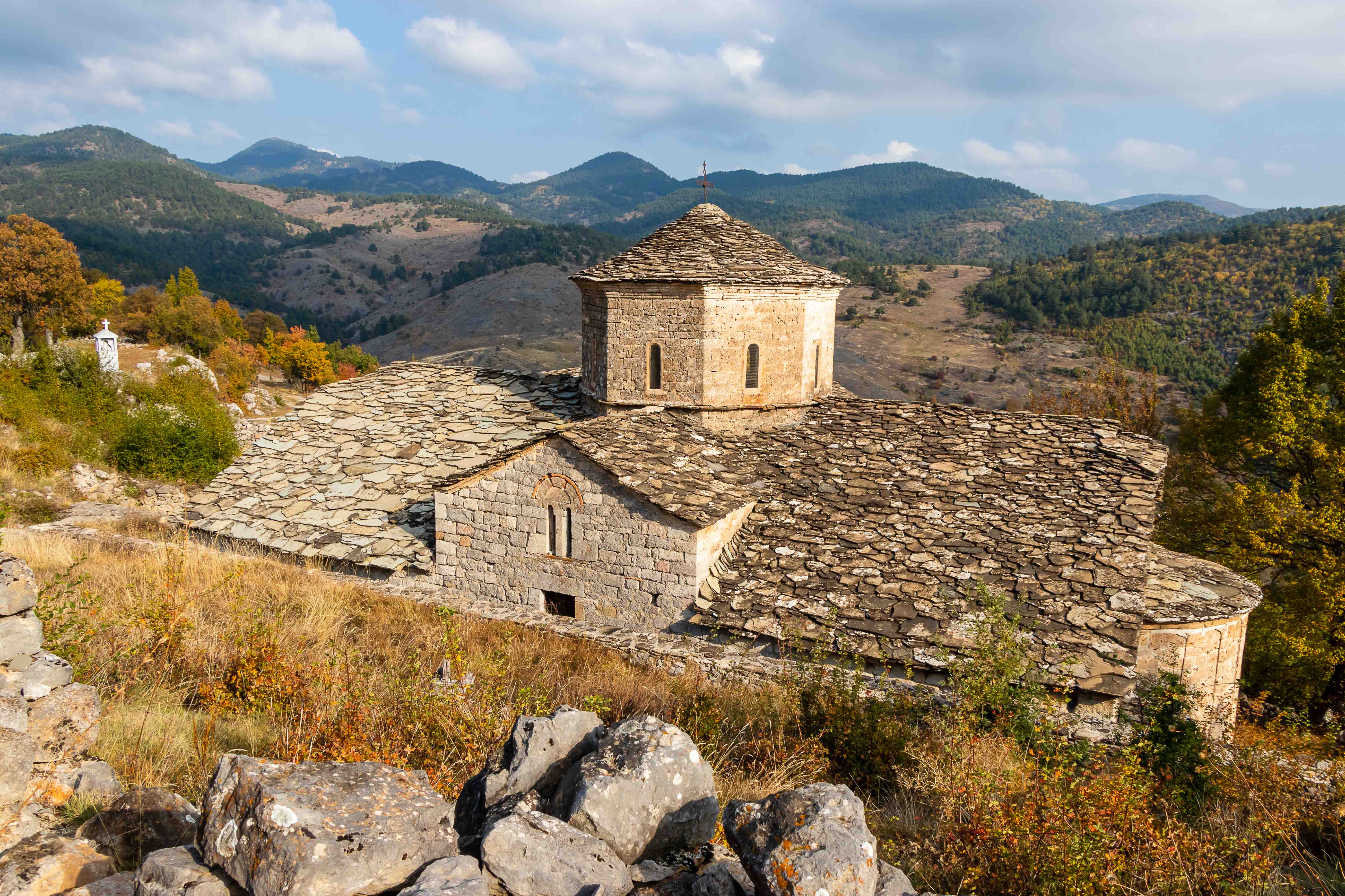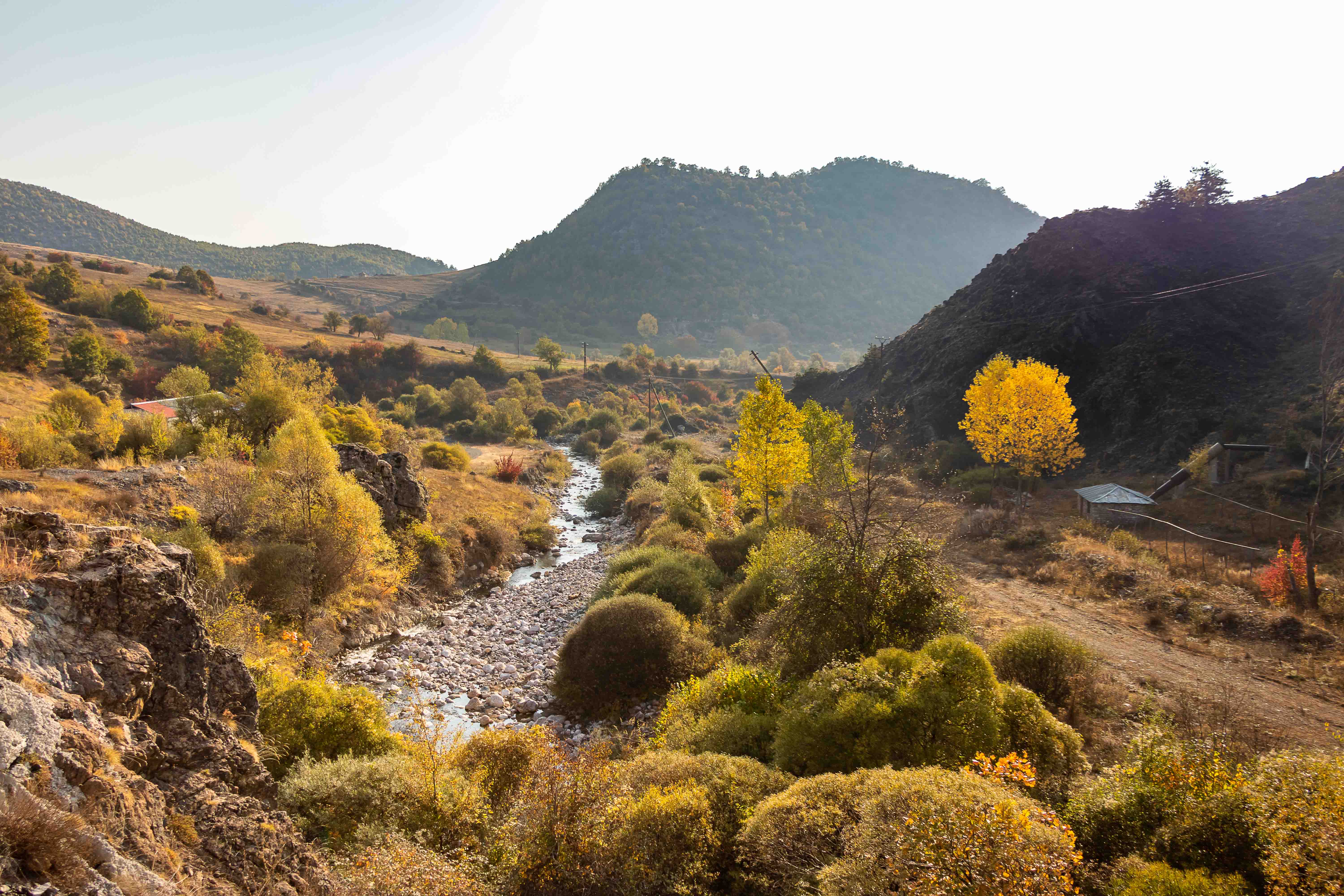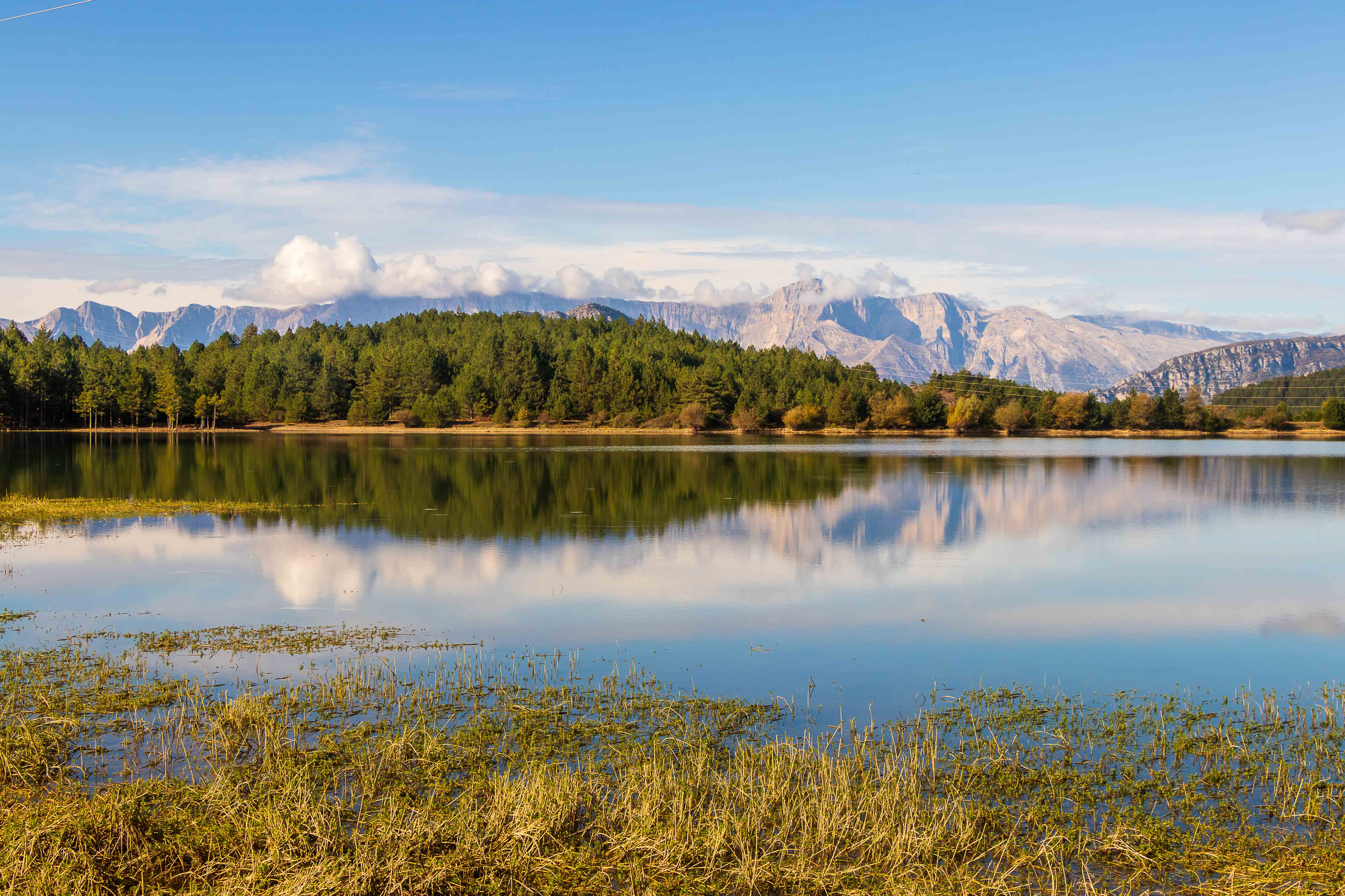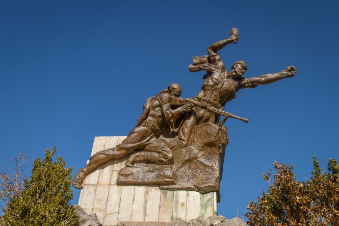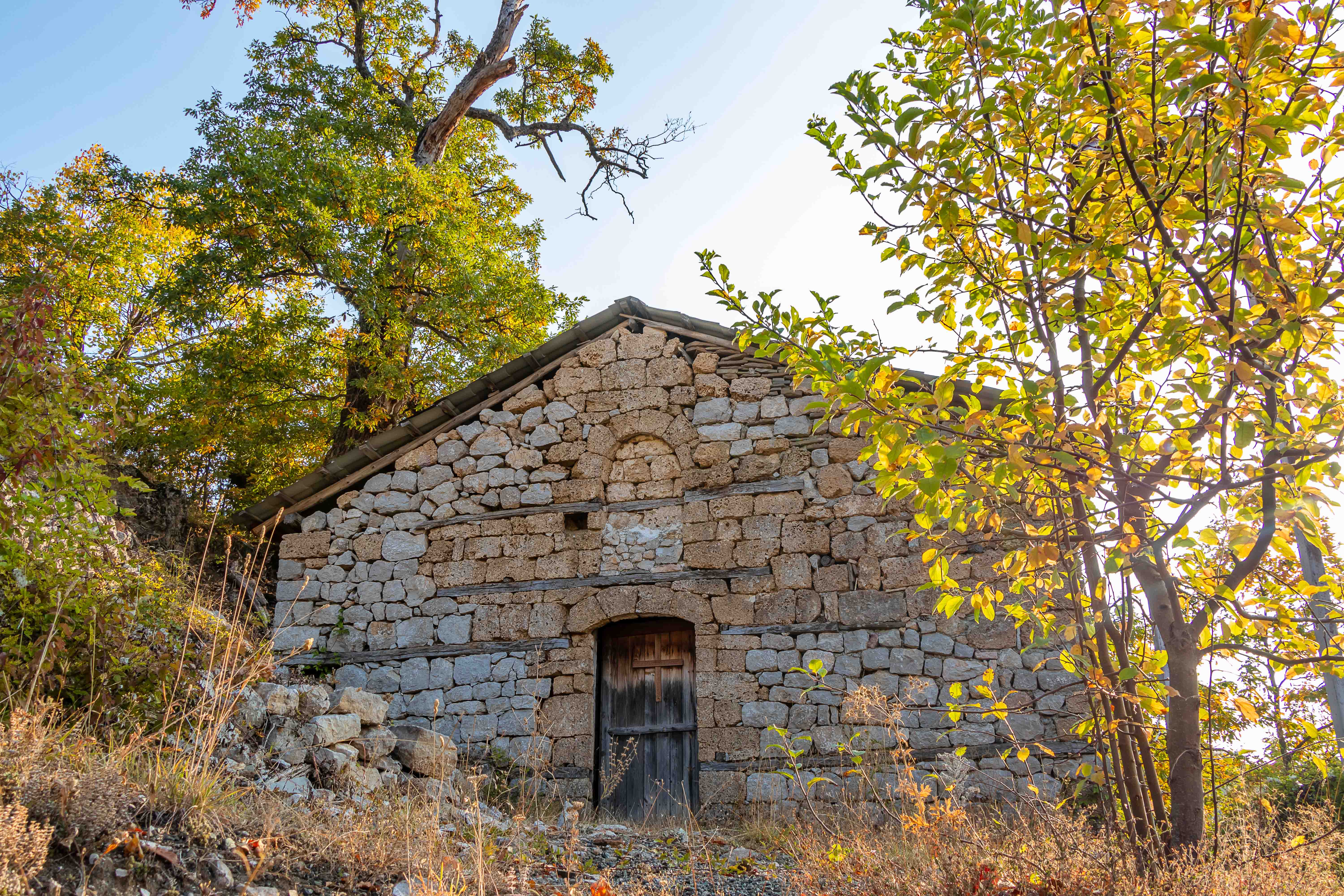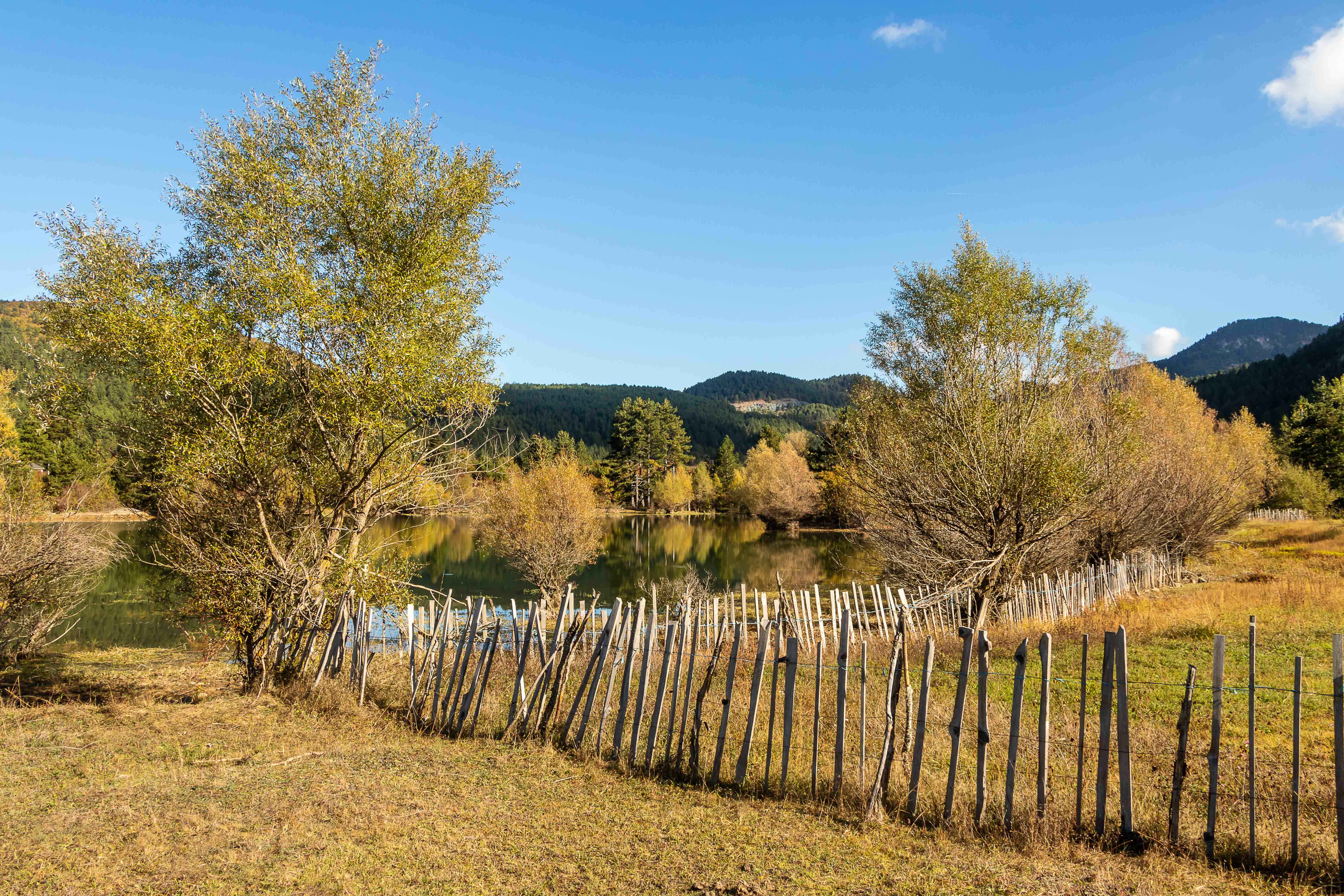 Wir verlassen das Tal der VJOSA und wenden uns nach Norden. Die Straße wird schmaler und die Schlaglöcher mehren sich. LESKOVIC, schon auf 900 m gelegen, ist mit 4500 Einwohner die letzte größere Ortschaft, dann wird es einsam. Die schroffen Kalkberge der MALËSIA E NEMËRÇKËS tauchen hinter den Hügeln auf und begleiten uns noch ein Stück. Waldreiche Täler wechseln mit felsigen Gebirgsschluchten, weiten Ebenen und lichten Kiefernwäldern. Am Straßenrand leuchten die Pappeln im herbstlichen Gelb. In BOROVO konfrontiert uns ein Denkmal mit der deutschen Geschichte: In dem abgeschiedenen Dorf haben Gebirgsjäger 1943 in einer furchtbaren Vergeltungsaktion 116 ältere Menschen und auch Kinder hingerichtet.