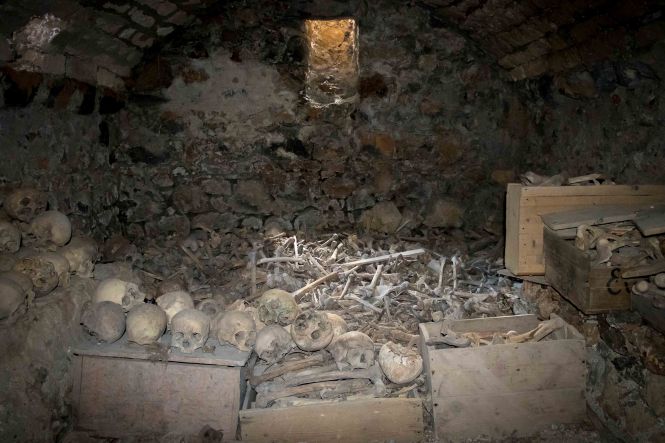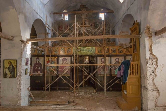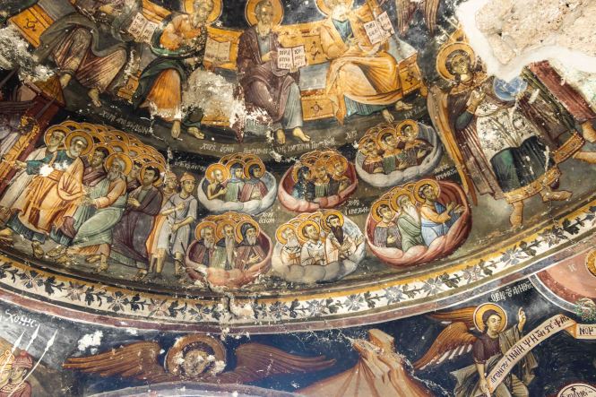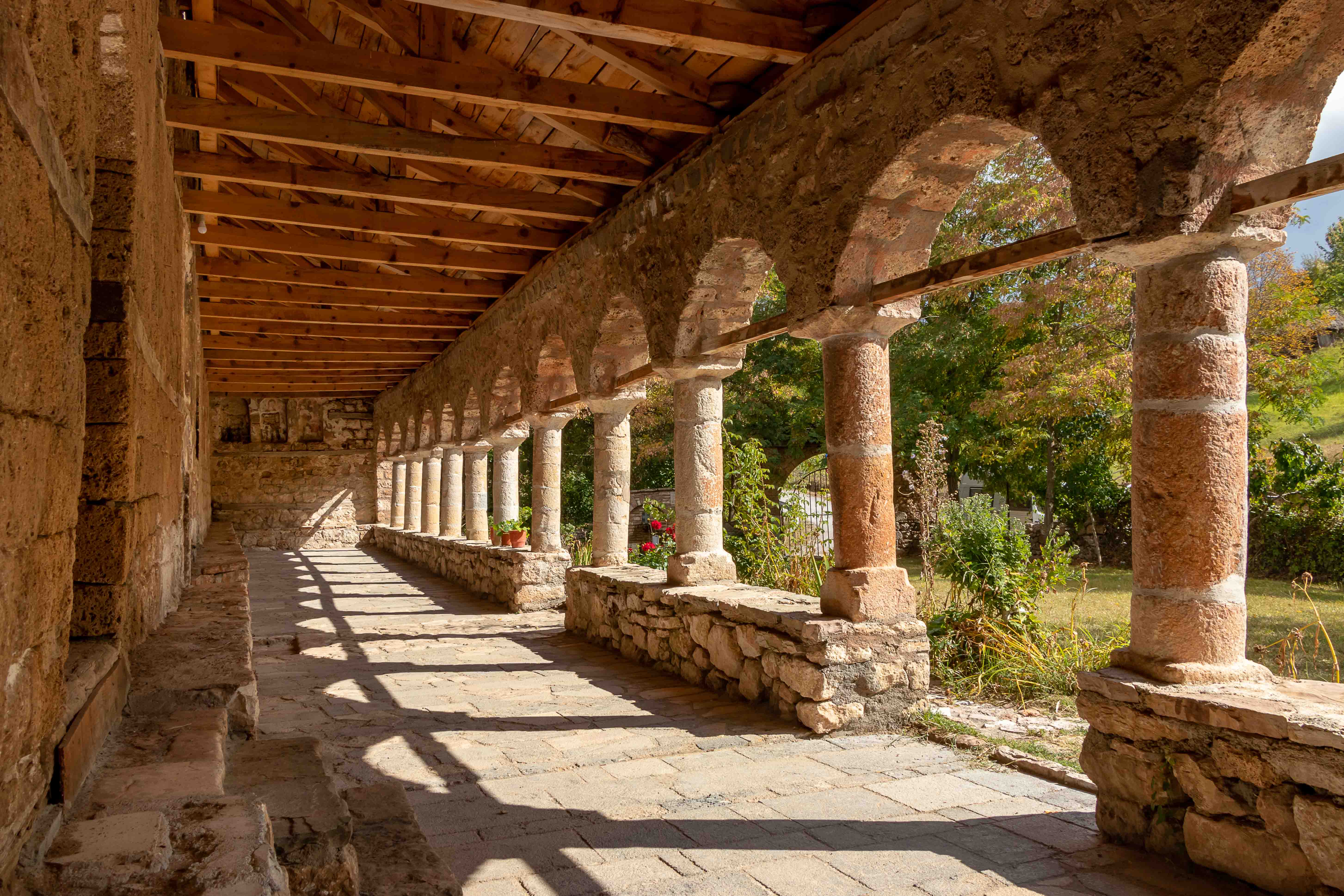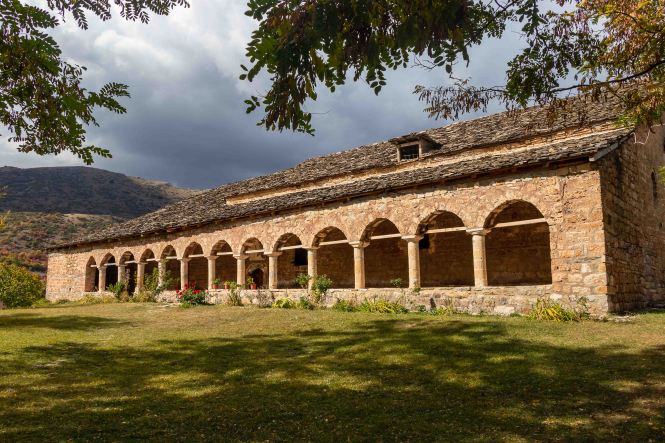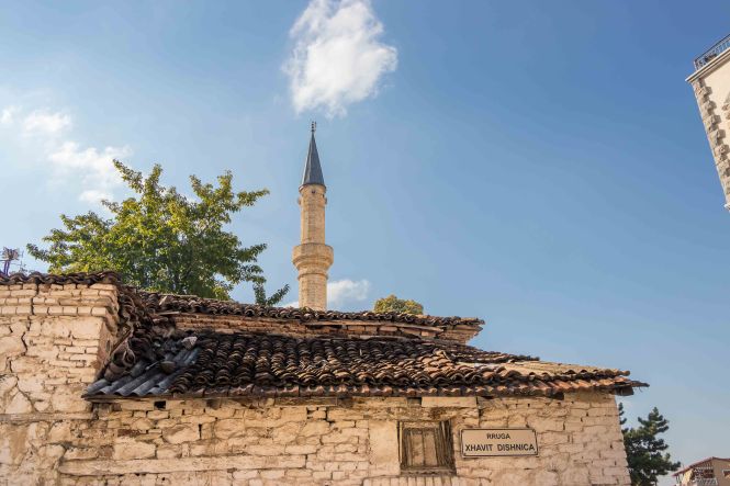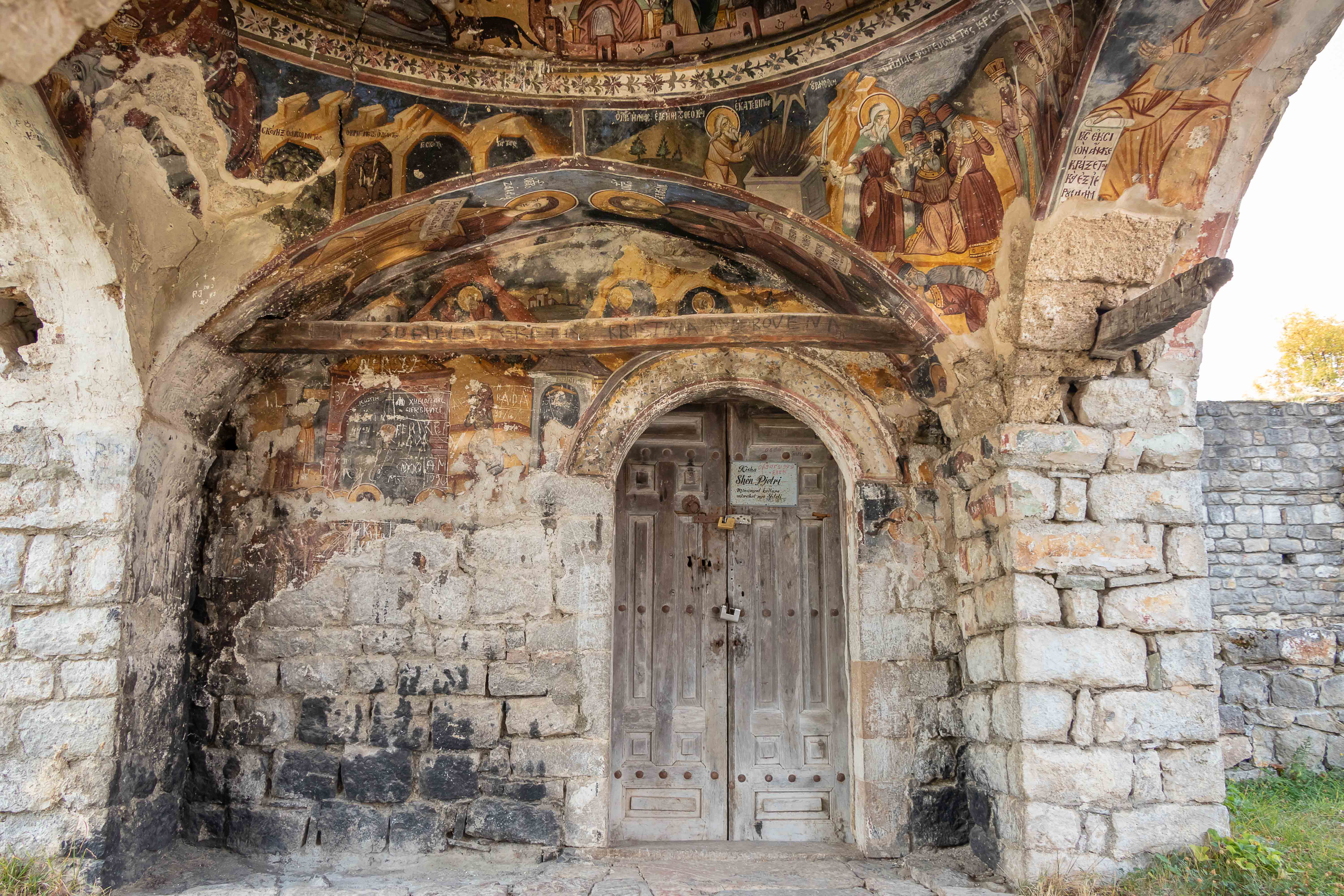 Dann wagen wir uns in die Berge und erwarten viele Kilometer Piste. Doch wir werden überrascht: war die „Hauptstraße“ in schlechtem Zustand, so wird die „Nebenstrecke“ gerade wunderbar ausgebaut. Wir wollen nach VITHKUQ und VOSKOPOJA. Diese heute unscheinbaren Dörfer sind uralt, hatten im 18. Jh. 15 000 bzw. 30 000 Einwohner, waren die größten und bedeutendsten Handelsstädte des Balkens und lagen auf dem Karawanenweg zwischen Venedig und Istanbul. 1720 wurde die erste Druckerei des Balkan gegründet. Auch stand hier mit der „Akademia“ die einzige universitäre christliche Bildungseinrichtung im ganzen Türkenreich. 1789 war es mit dem Reichtum und der Macht vorbei, Osmanen zerstörten die Städte, die Einwohner flüchteten. Was von der einstigen Pracht blieb, sind unzählige Kirchen, manche nur Ruinen und arg heruntergekommen und in kommunistischen Zeit als Lagerraum genutzt, andere wiederum sind gut erhalten und restauriert. Und in einer wartet in der Gruft eines unscheinbaren Nebengebäudes eine kuriose Überraschungen.
