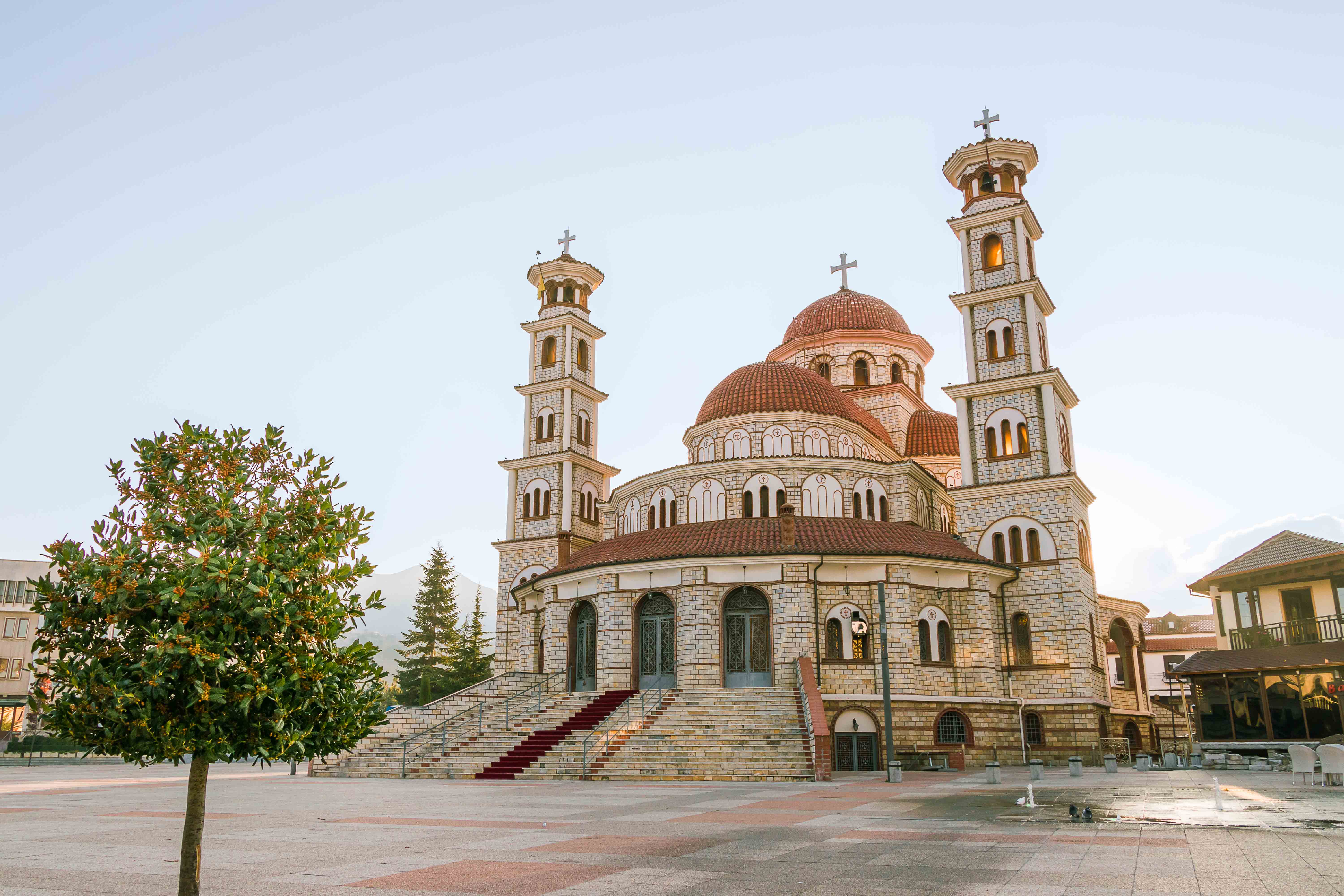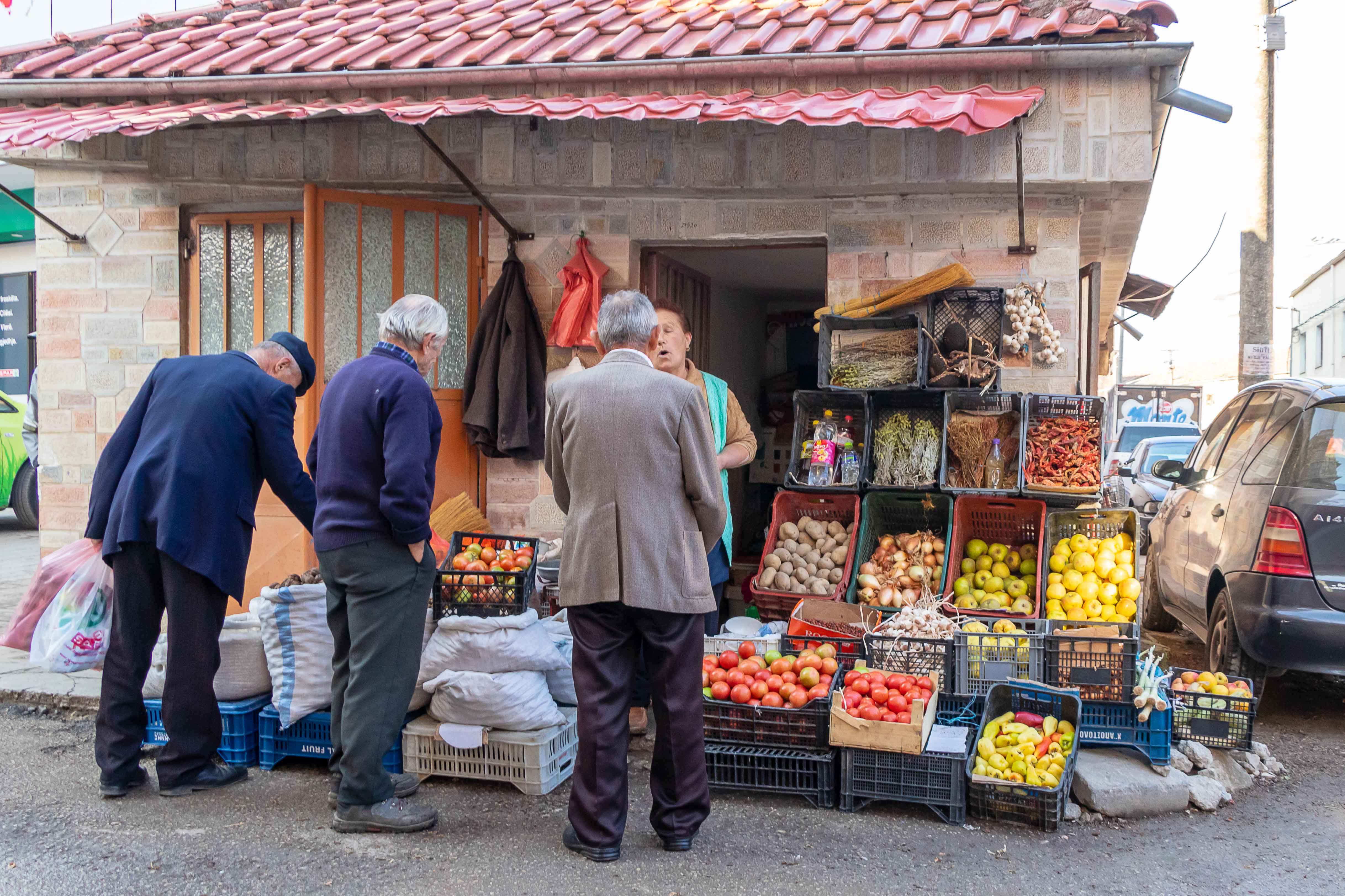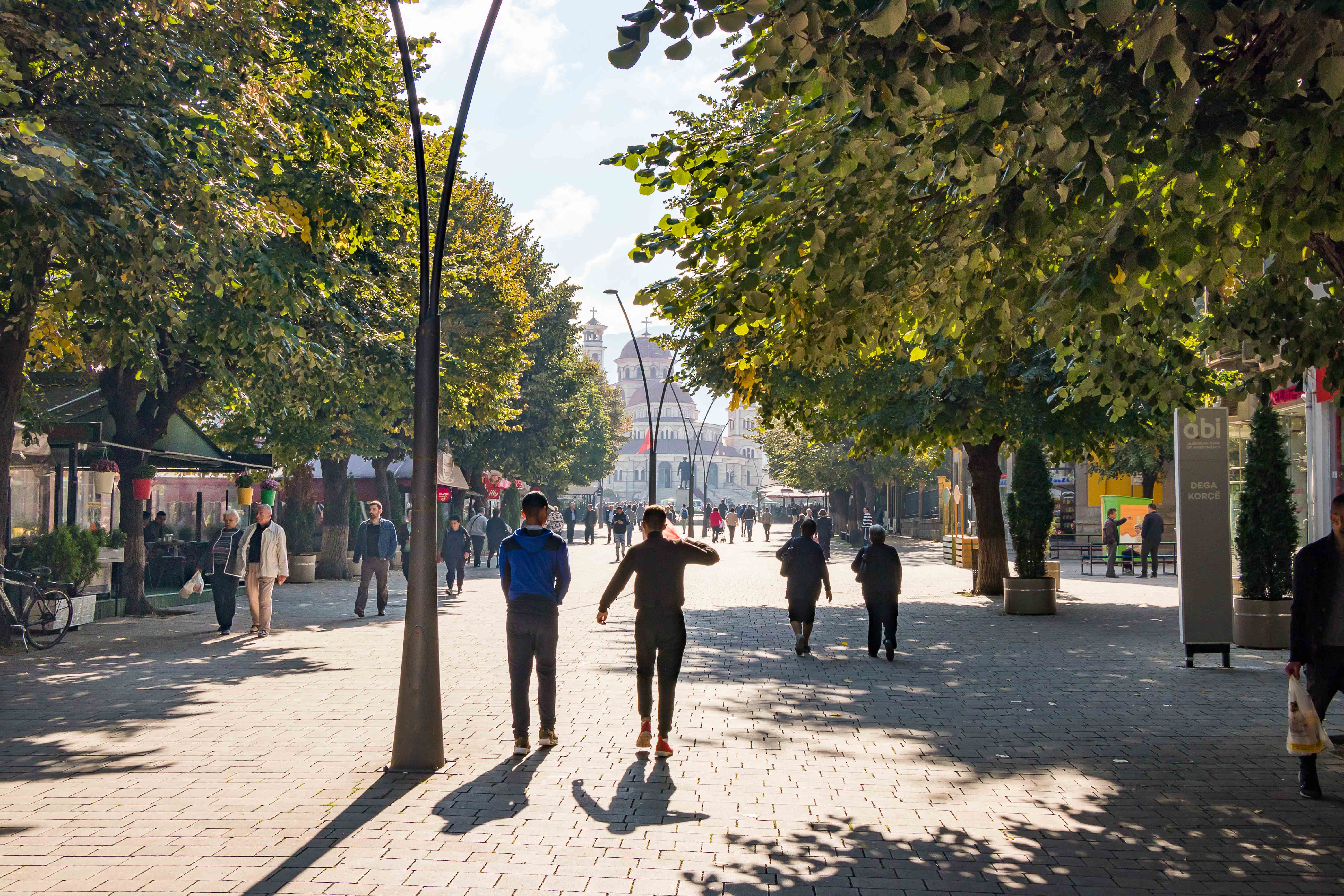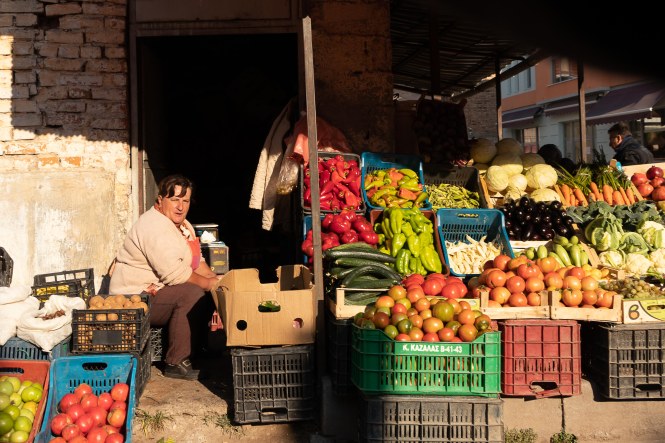 Ein netter und freundlicher Bauleiter, den Peter auf einer Wanderung bei einer Kirche getroffen hatte, schwärmte von seiner Heimatstadt: KORÇA ist die schönste Stadt im Land und die Mutter Albaniens. Also machen wir uns auf den Weg. Zu unserer Beruhigung finden wir nach einigem Suchen einen bewachten Parkplatz und starten unseren Rundgang. Wir sind ganz gespannt und dann freudig überrascht, die Stadt gefällt uns ausgesprochen gut, sie ist lebendig und attraktiv. Rund um den alten Basar haben Händler in den Gassen ihre Stände aufgebaut und bieten neben Obst und Gemüse, Käse und Raki in Plastikflaschen, Fleisch und Fisch allerlei Dinge für den Haushalt an. So gefällt uns das. In den Parks sitzen die Männer und spielen leidenschaftlich Domino, in der Fußgängerzone flanieren Jung uns Alt, die Cafés sind bei dem herrlichen Wetter gut besucht und aus manchen unscheinbaren Lokalen riecht es verführerisch.