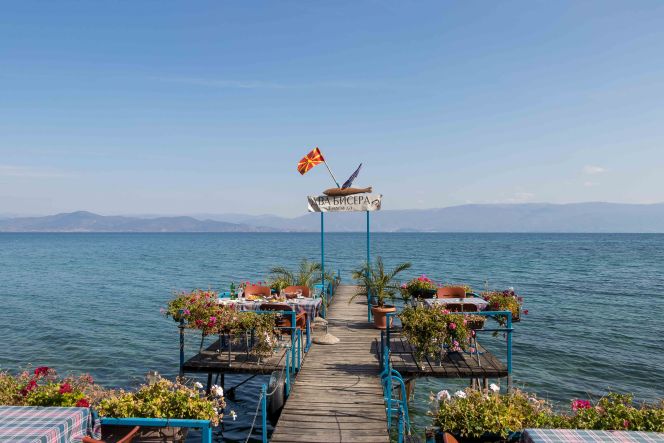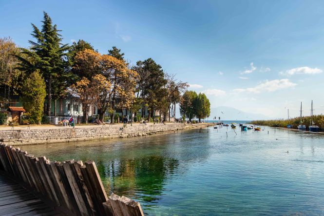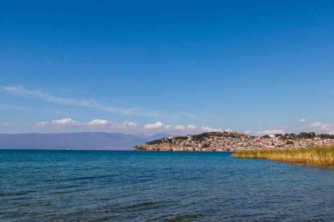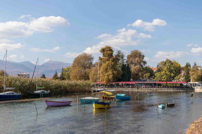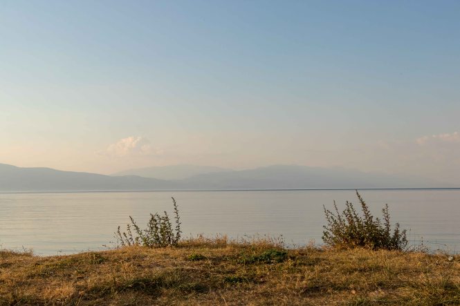 Gleich hinter den Bergen liegt der OHRID-SEE, einzigartig in der Welt und UNESCO-Weltnaturerbe. Er ist über 1 Million Jahre alt, hat das klarste Wasser aller Seen in Europa (an manchen Stellen) und es leben Fische in ihm, die es nur hier gibt (und zudem noch gut schmecken). Da wir das albanische Ufer nicht so einladend finden, fahren wir nach MAZEDONIEN weiter. Die erste Station am See ist die kleine Ortschaft STRUGA. In den Straßen ist viel los, die Menschen nutzen das warme Wetter, flanieren an der Uferpromenade und füllen die Cafés und Lokale. Auch wir setzen uns an einen Tisch am Strand und essen eine der leckeren Forellen aus dem See (was wir in den nächsten Tagen noch ein paar Mal wiederholen). Ein paar Kilometer weiter finden wir einen einsamen Platz direkt am glasklaren und jetzt recht frischen Wasser. Nach ein paar ruhigen Tagen setzen wir die Umrundung des Sees fort. Die Stadt OHRID, die sich für die vielen Touristen aus mittlerweile aller Welt etwas zu fein herausgeputzt hat, lassen wie links liegen und finden an der Grenze zu Albanien eine weite und einsame Wiese wieder direkt am Ufer. Der riesige Campingplatz ist geschlossen und die Gleitschirmflieger, hier ist das beliebteste mazedonische Fluggebiet, haben leider wieder nicht den richtigen Wind.