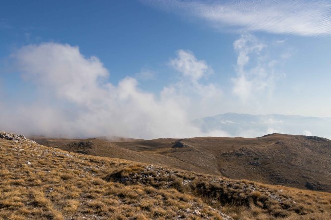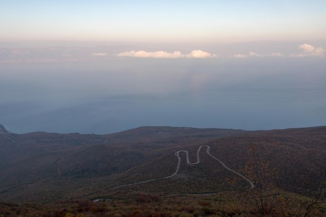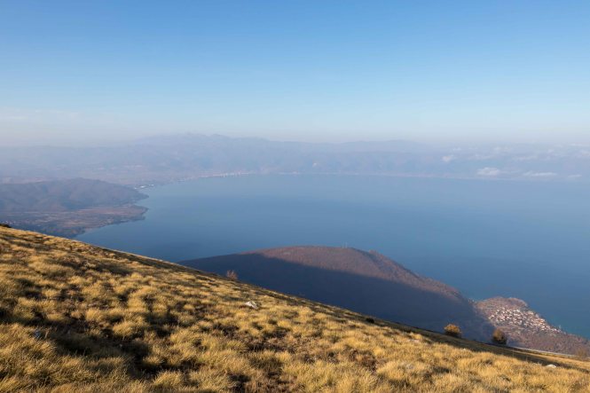 Am frühen Morgen ziehen wir weiter. Die breite Straße bringt uns über viele Serpentinen gemächlich steigend zum Startplatz der Gleitschirmflieger auf fast 1600 m. Die Wolken ziehen schnell über den Pass und vergehen im Abstieg. Peter spaziert über die goldgelben Wiesenhänge zu einem Aussichtsberg, der wohl über 2000 m hoch ist. Von hier oben bietet sich eine Rundumsicht über die Seen und die mächtigen umliegenden Berge. Die Ufer des OHRIDSEES verschwimmen im blauen Dunst, das Wasser des PRESPASEES leuchtet silbern zwischen den aufziehenden Wolken.