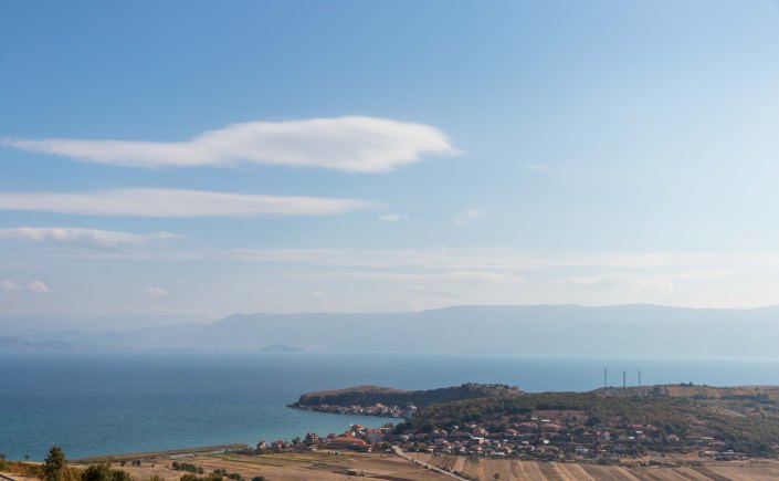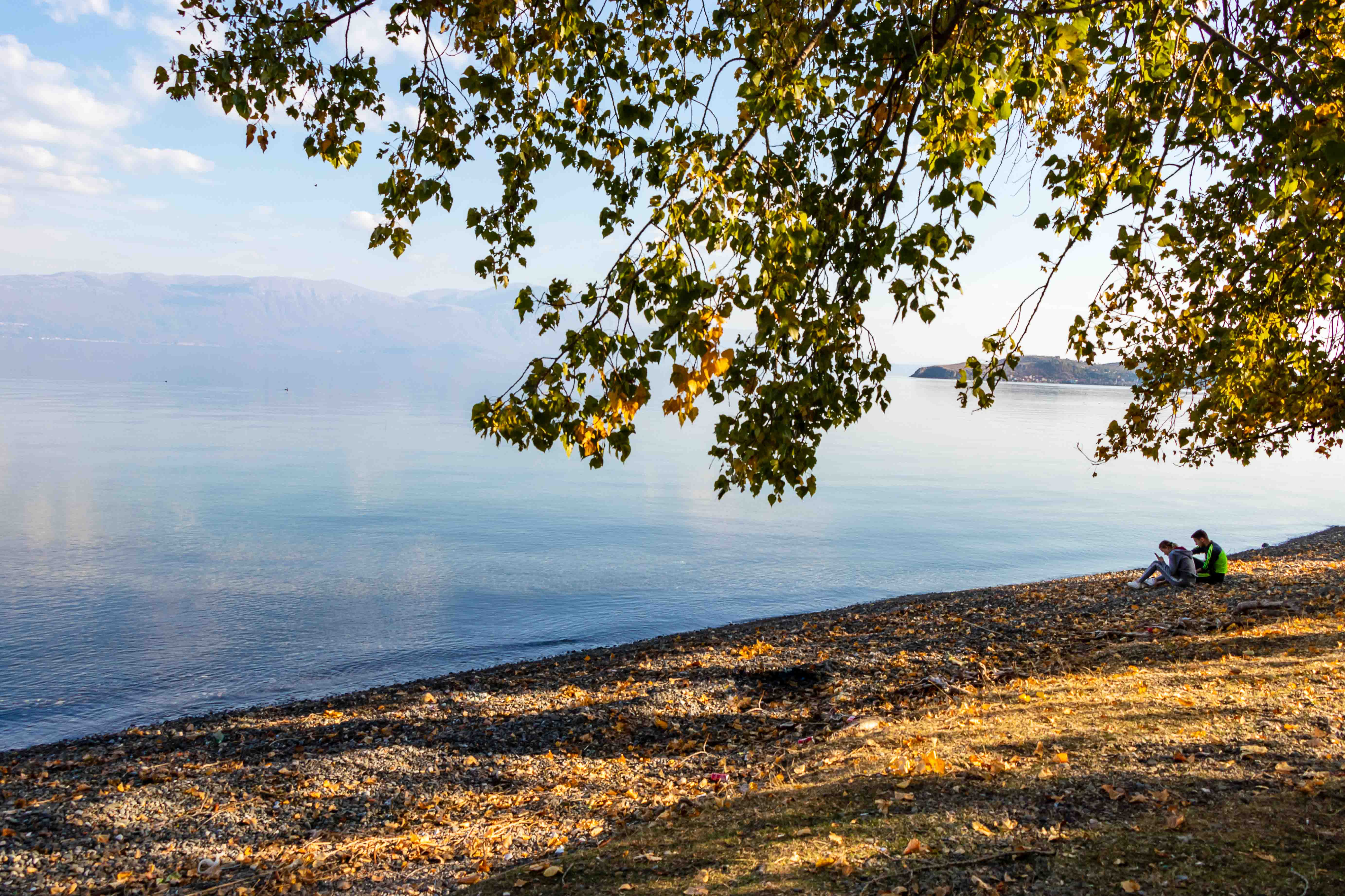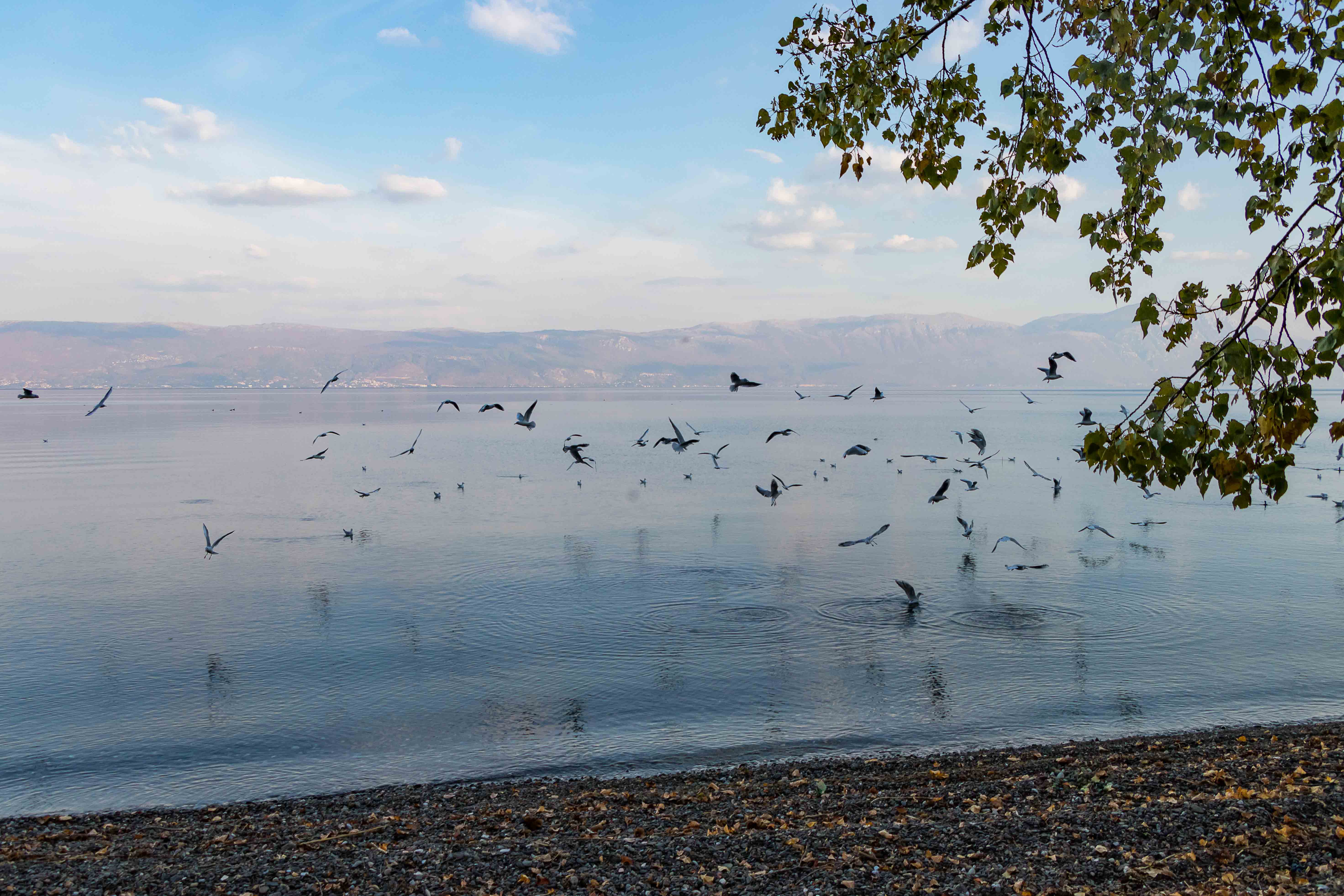 Gleich hinter den Bergen liegt der OHRID-SEE, einzigartig in der Welt und UNESCO-Weltnaturerbe. Er ist über 1 Million Jahre alt, hat das klarste Wasser aller Seen in Europa (an manchen Stellen) und es leben Fische in ihm, die es nur hier gibt (und zudem noch gut schmecken). Da wir das albanische Ufer nicht so einladend finden, fahren wir nach MAZEDONIEN weiter. Die erste Station am See ist die kleine Ortschaft STRUGA. In den Straßen ist viel los, die Menschen nutzen das warme Wetter, flanieren an der Uferpromenade und füllen die Cafés und Lokale. Auch wir setzen uns an einen Tisch am Strand und essen eine der leckeren Forellen aus dem See (was wir in den nächsten Tagen noch ein paar Mal wiederholen). Ein paar Kilometer weiter finden wir einen einsamen Platz direkt am glasklaren und jetzt recht frischen Wasser. Nach ein paar ruhigen Tagen setzen wir die Umrundung des Sees fort. Die Stadt OHRID, die sich für die vielen Touristen aus mittlerweile aller Welt etwas zu fein herausgeputzt hat, lassen wie links liegen und finden an der Grenze zu Albanien eine weite und einsame Wiese wieder direkt am Ufer. Der riesige Campingplatz ist geschlossen und die Gleitschirmflieger, hier ist das beliebteste mazedonische Fluggebiet, haben leider wieder nicht den richtigen Wind.