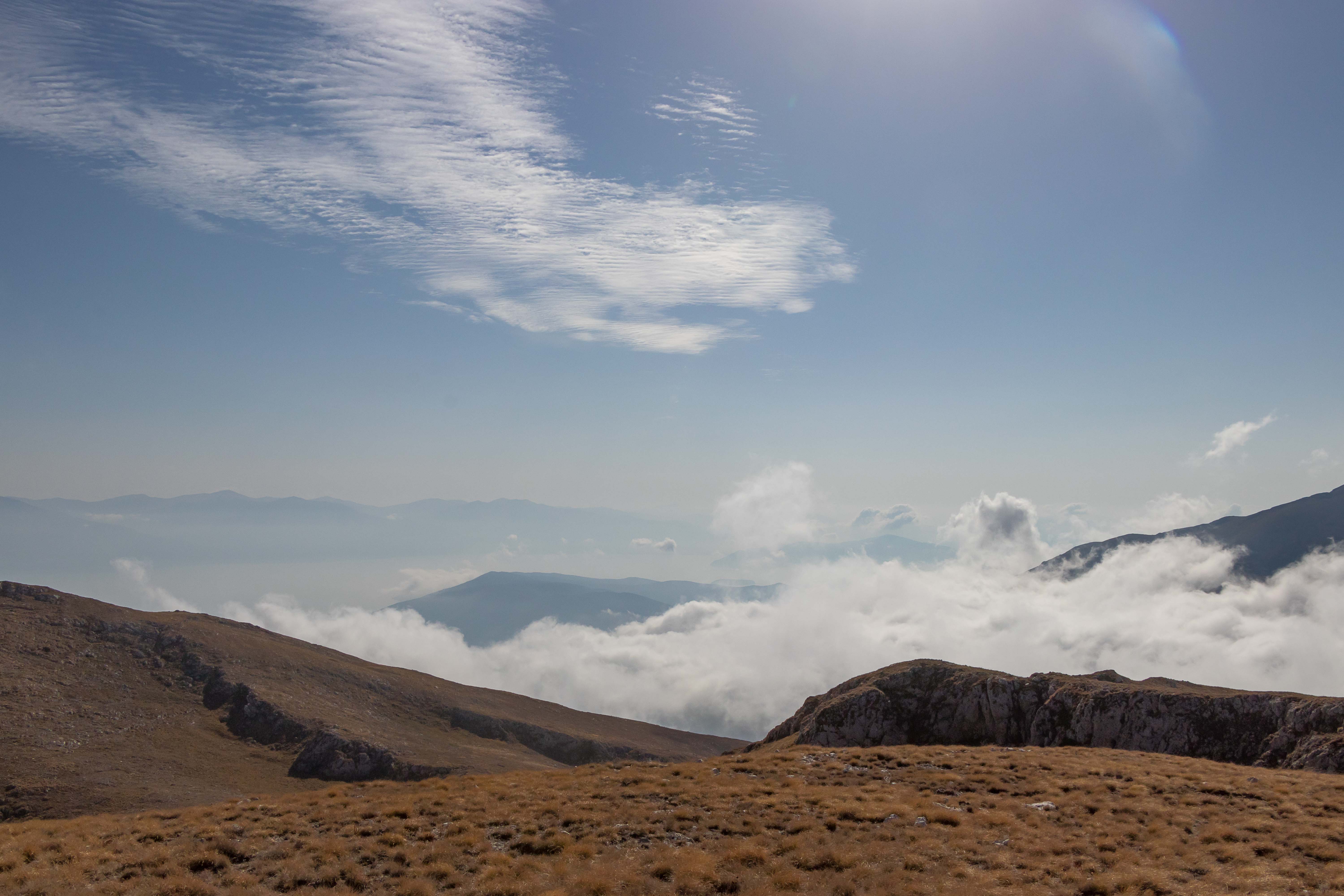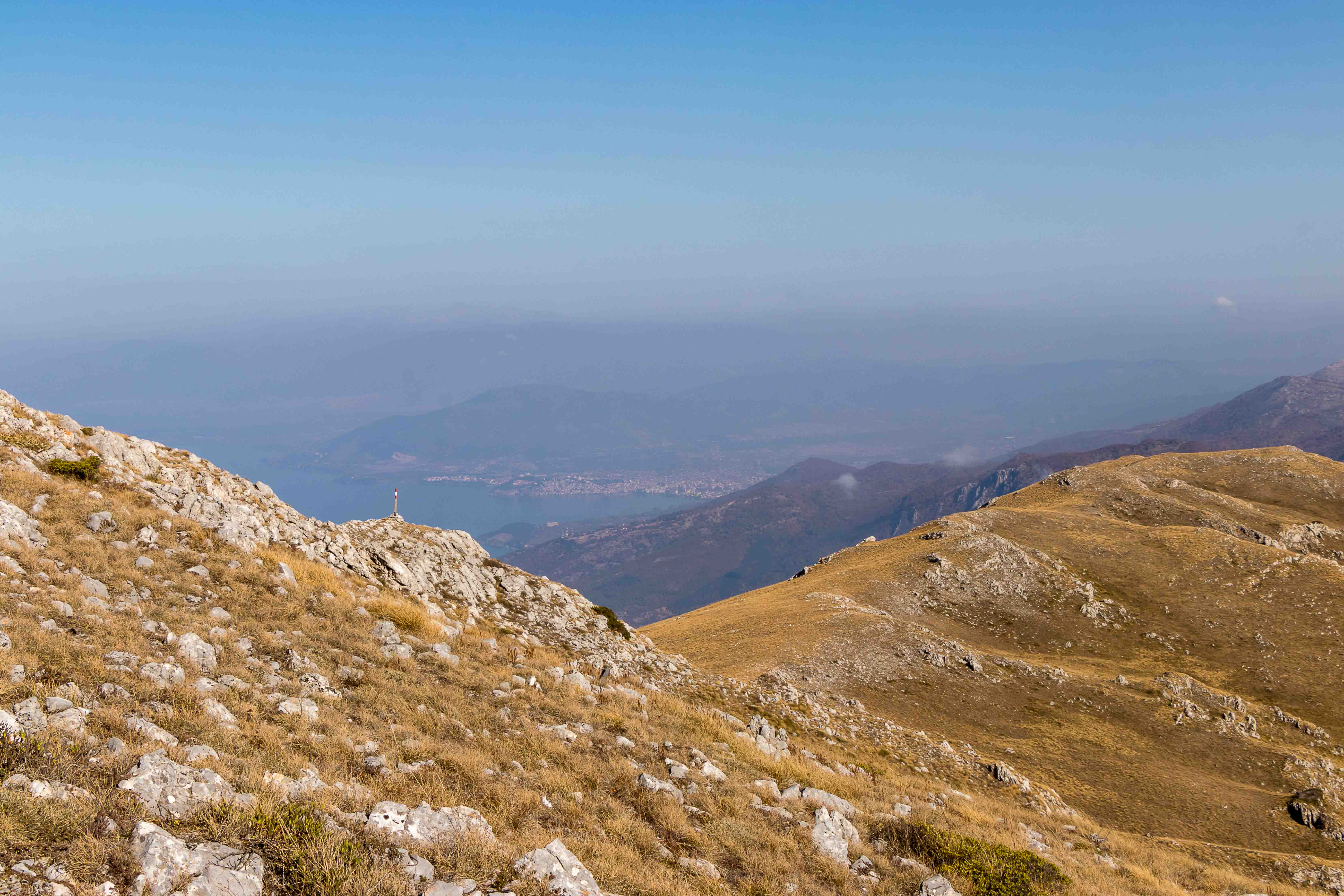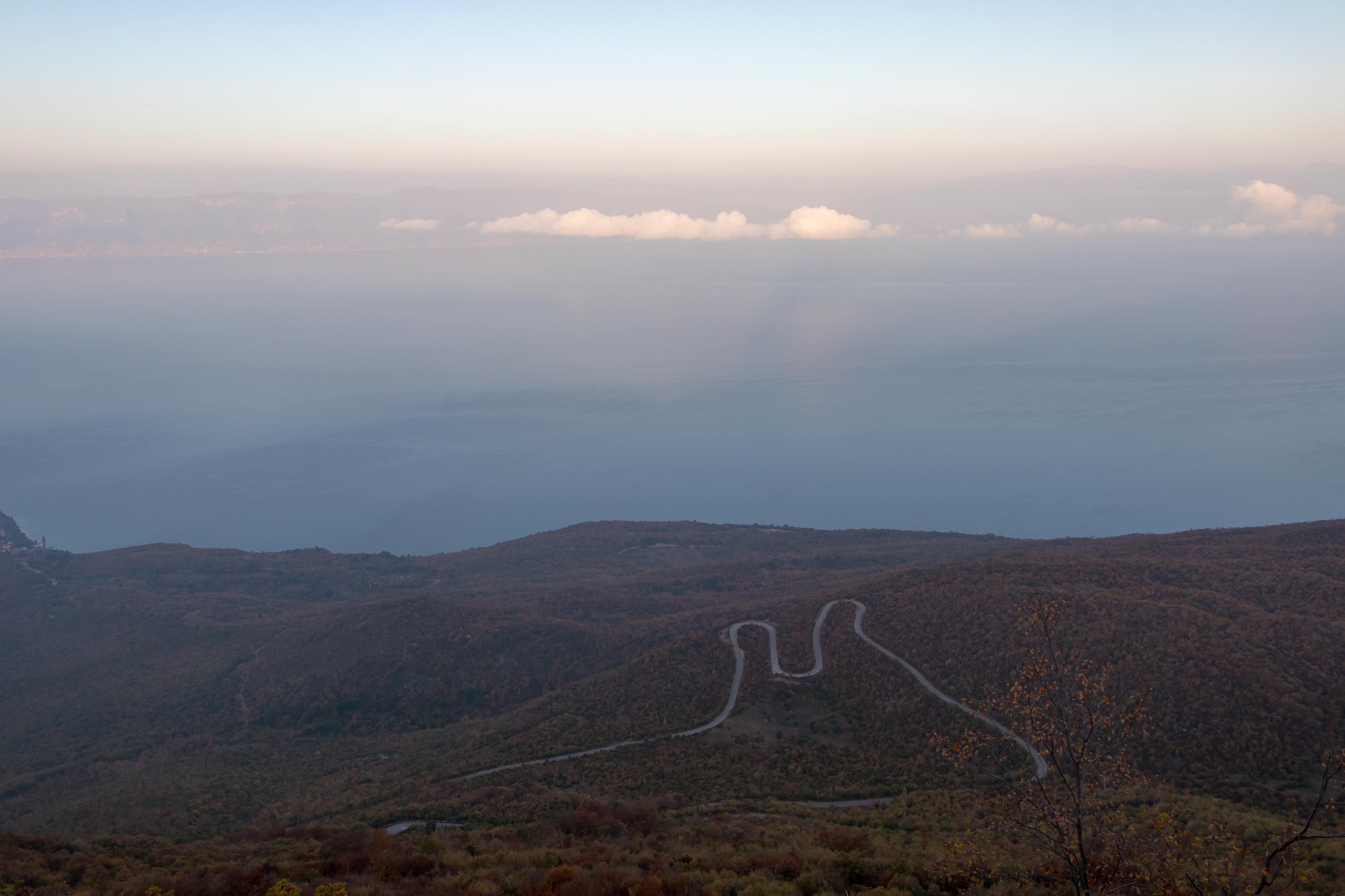 Am frühen Morgen ziehen wir weiter. Die breite Straße bringt uns über viele Serpentinen gemächlich steigend zum Startplatz der Gleitschirmflieger auf fast 1600 m. Die Wolken ziehen schnell über den Pass und vergehen im Abstieg. Peter spaziert über die goldgelben Wiesenhänge zu einem Aussichtsberg, der wohl über 2000 m hoch ist. Von hier oben bietet sich eine Rundumsicht über die Seen und die mächtigen umliegenden Berge. Die Ufer des OHRIDSEES verschwimmen im blauen Dunst, das Wasser des PRESPASEES leuchtet silbern zwischen den aufziehenden Wolken.